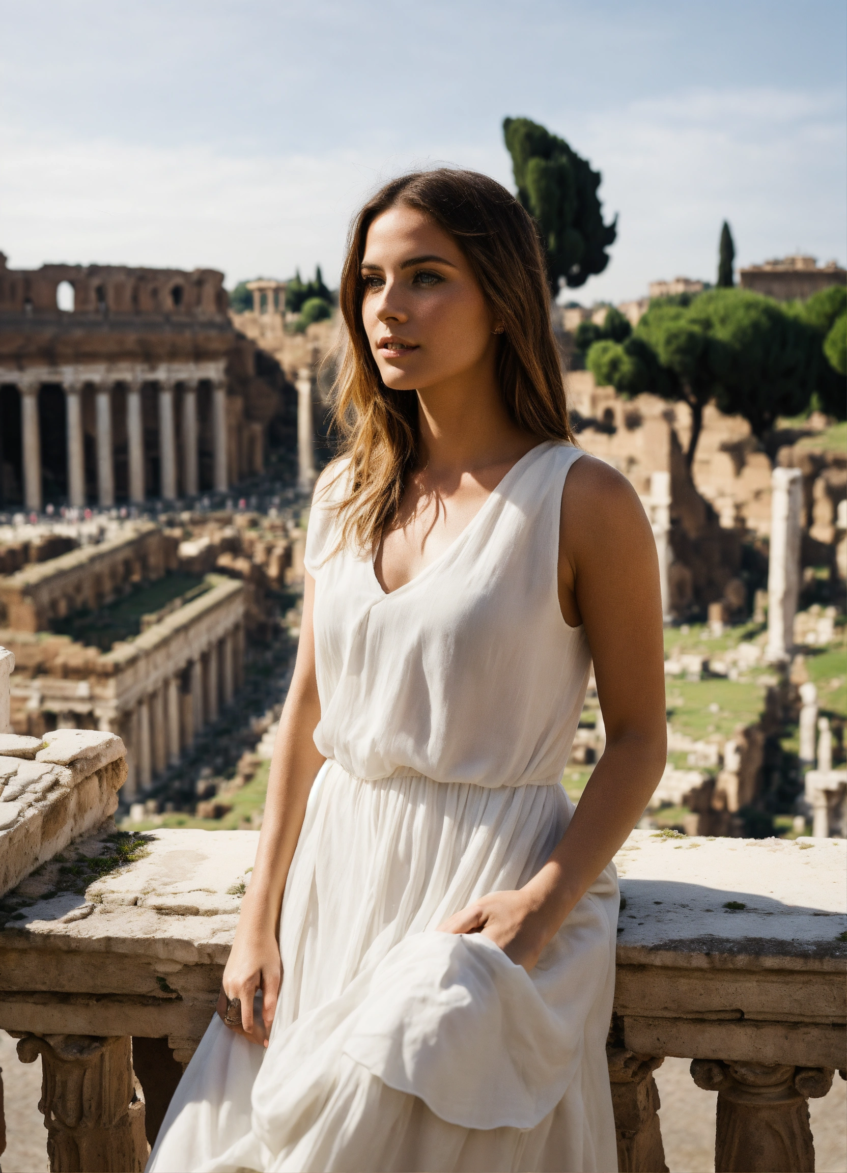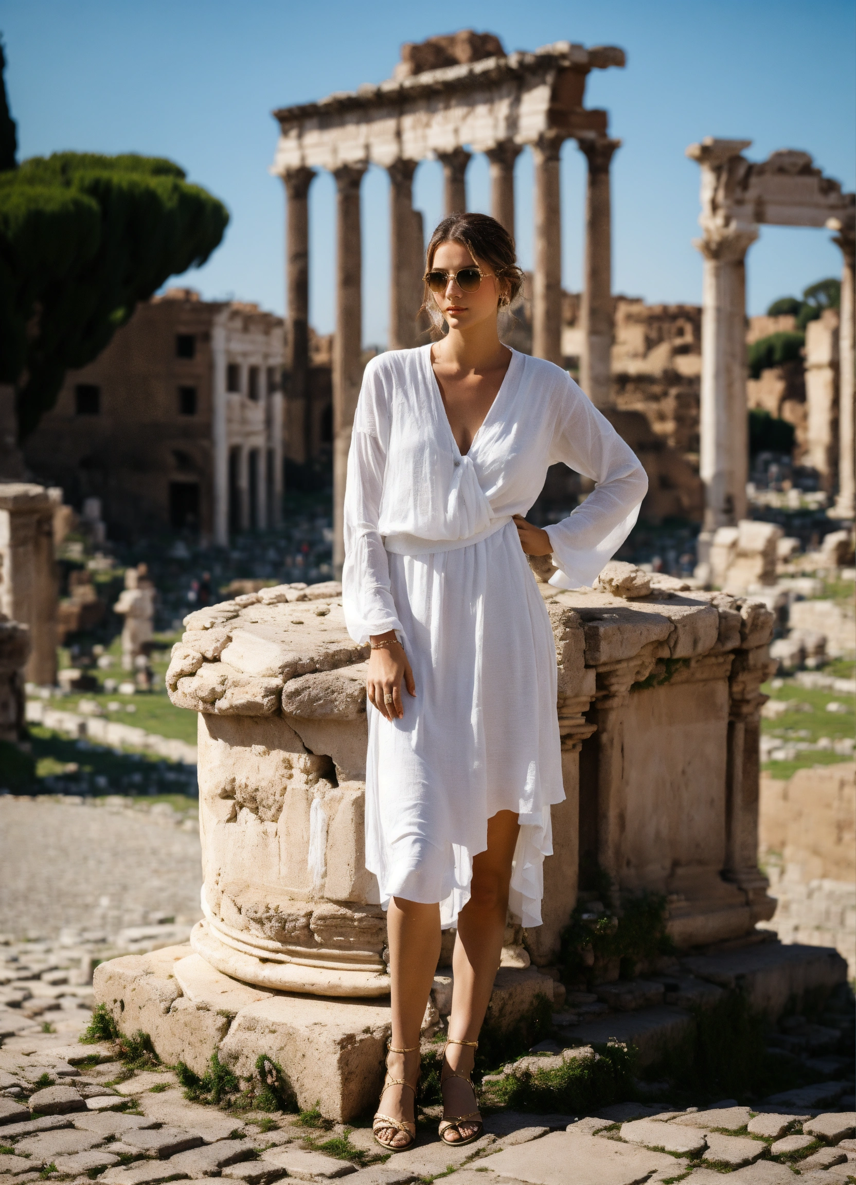 Photo of forum romanum of rome at day with a female model looking into the the camera; all in white color, white coloured