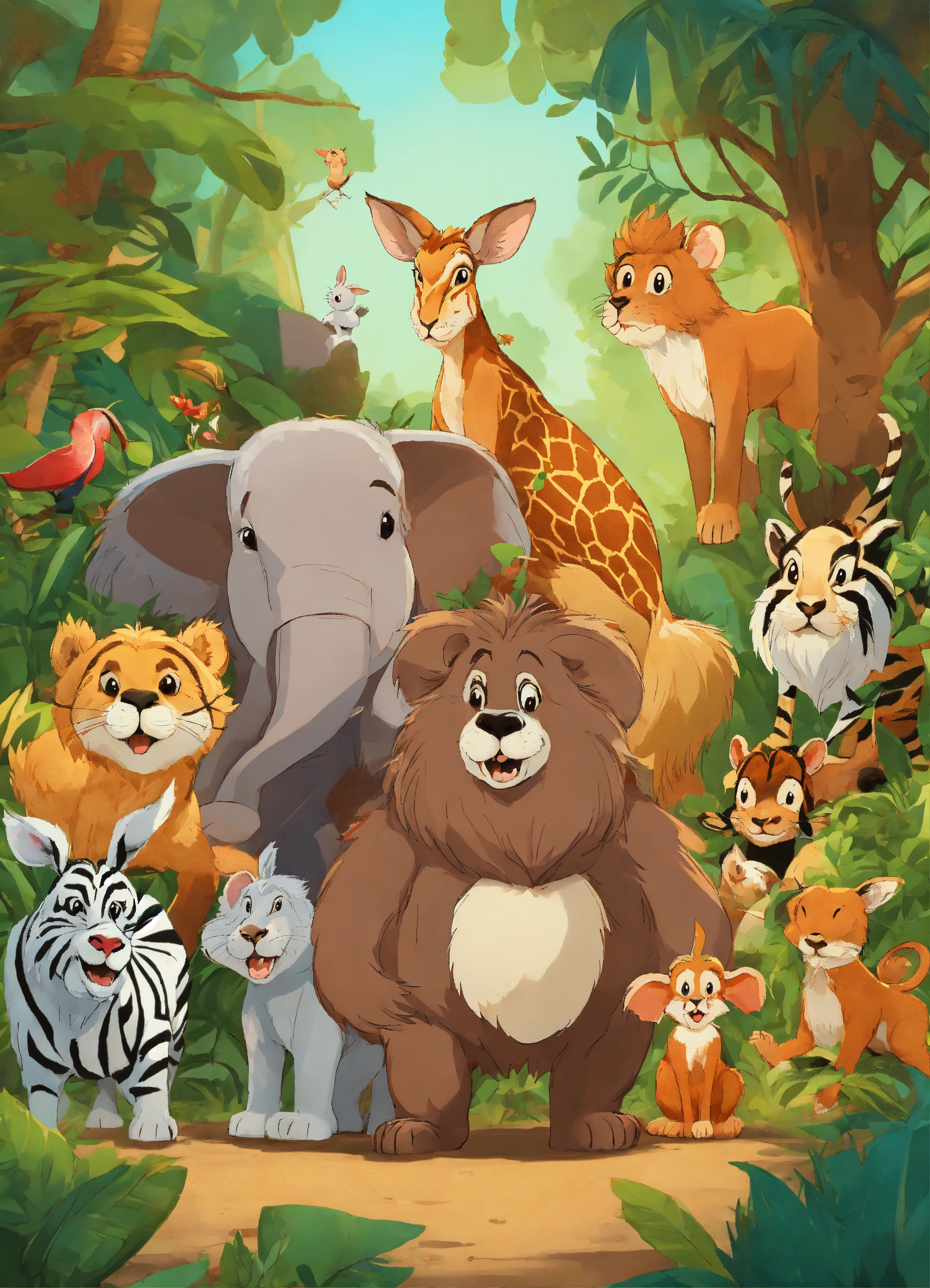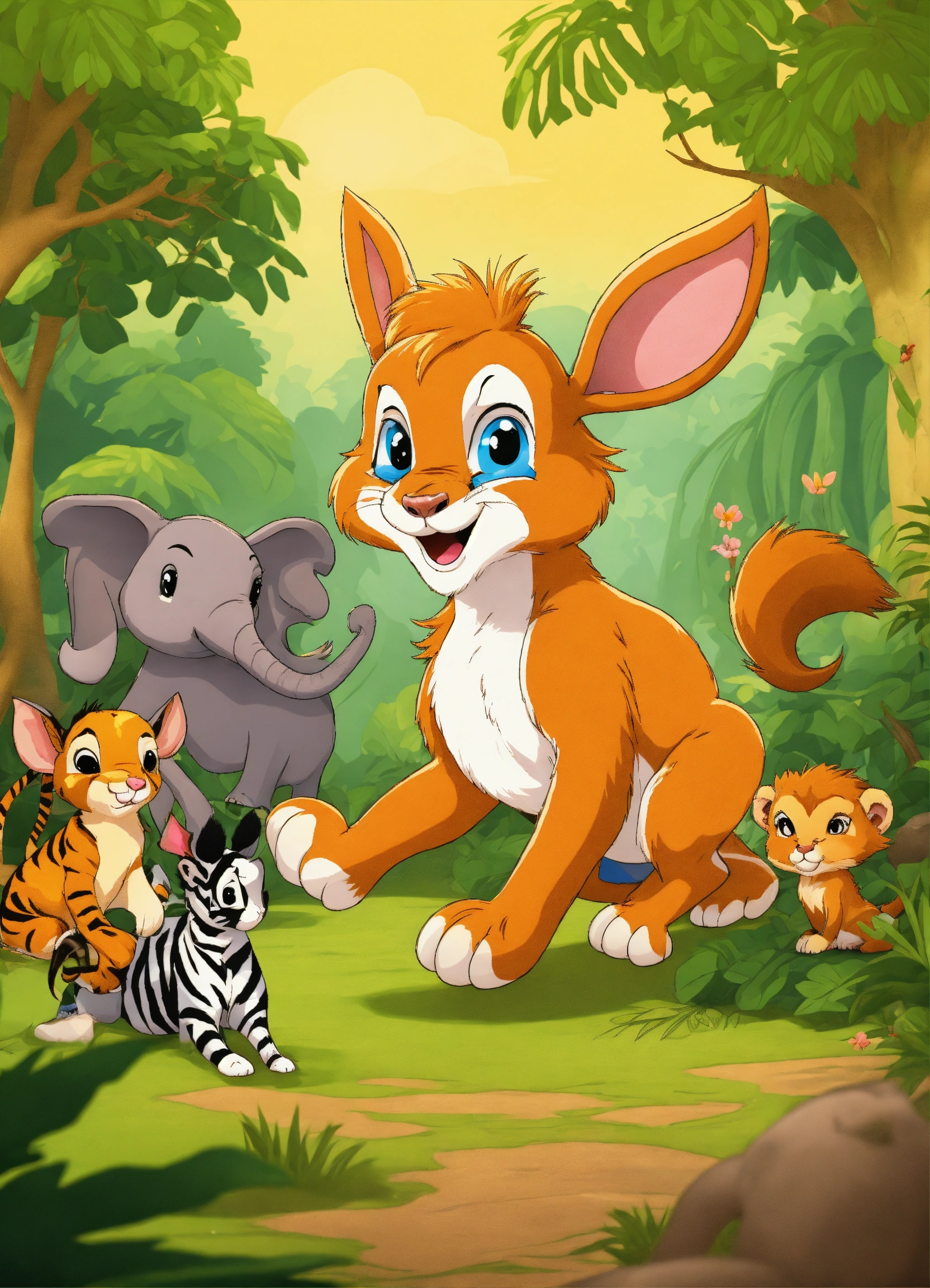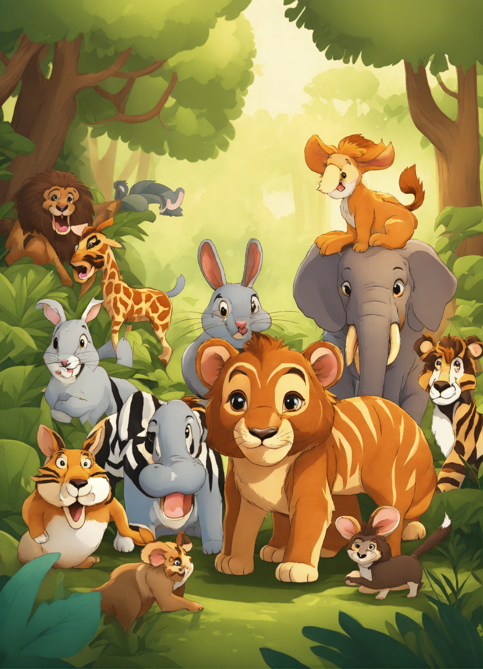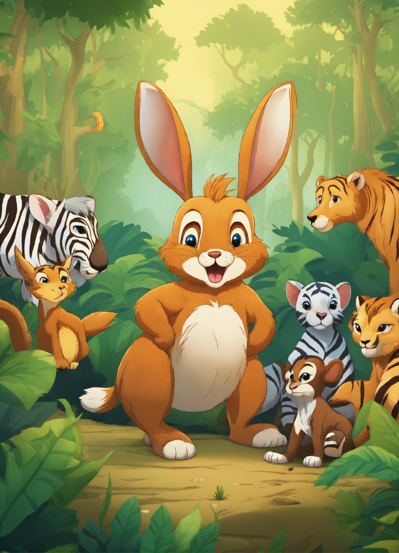 Cartoon rabbit is showing its presence in front of other jungle animals elephant wolf deer lion monkeys zebra bear for being faster