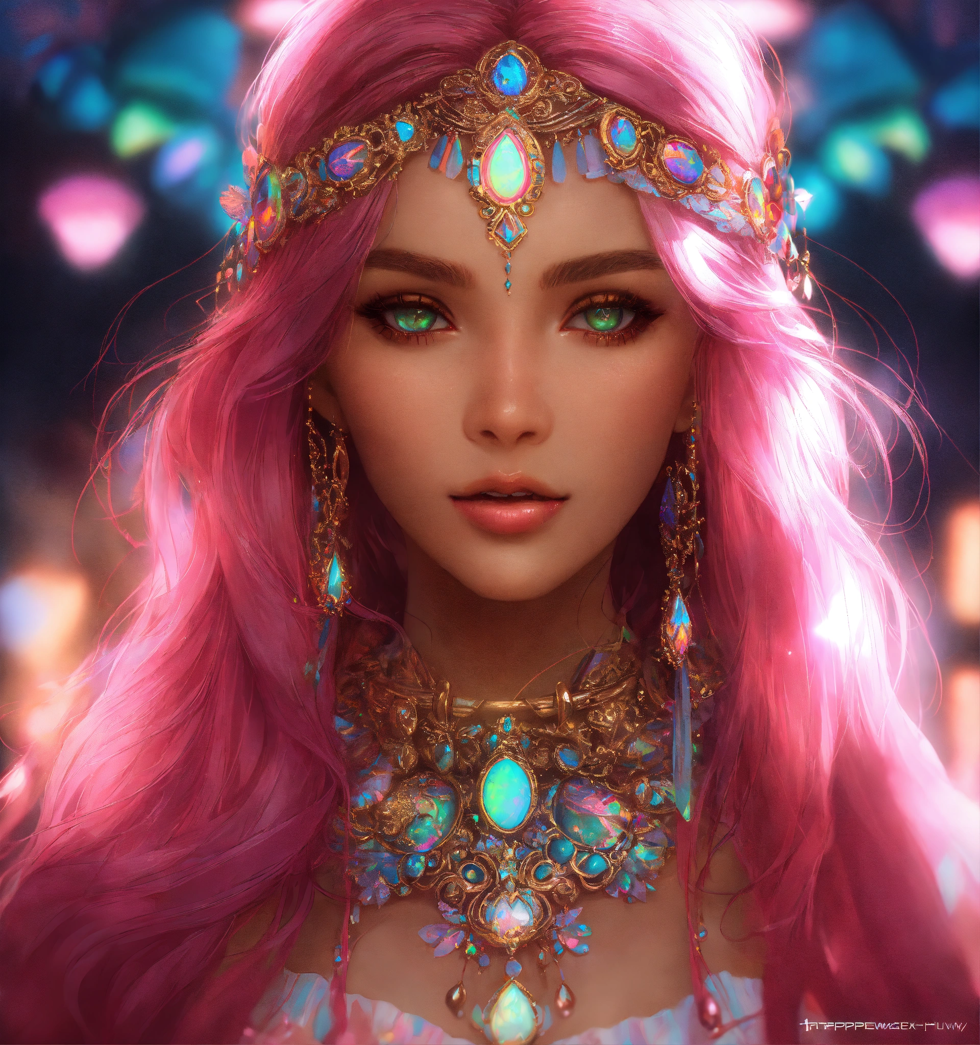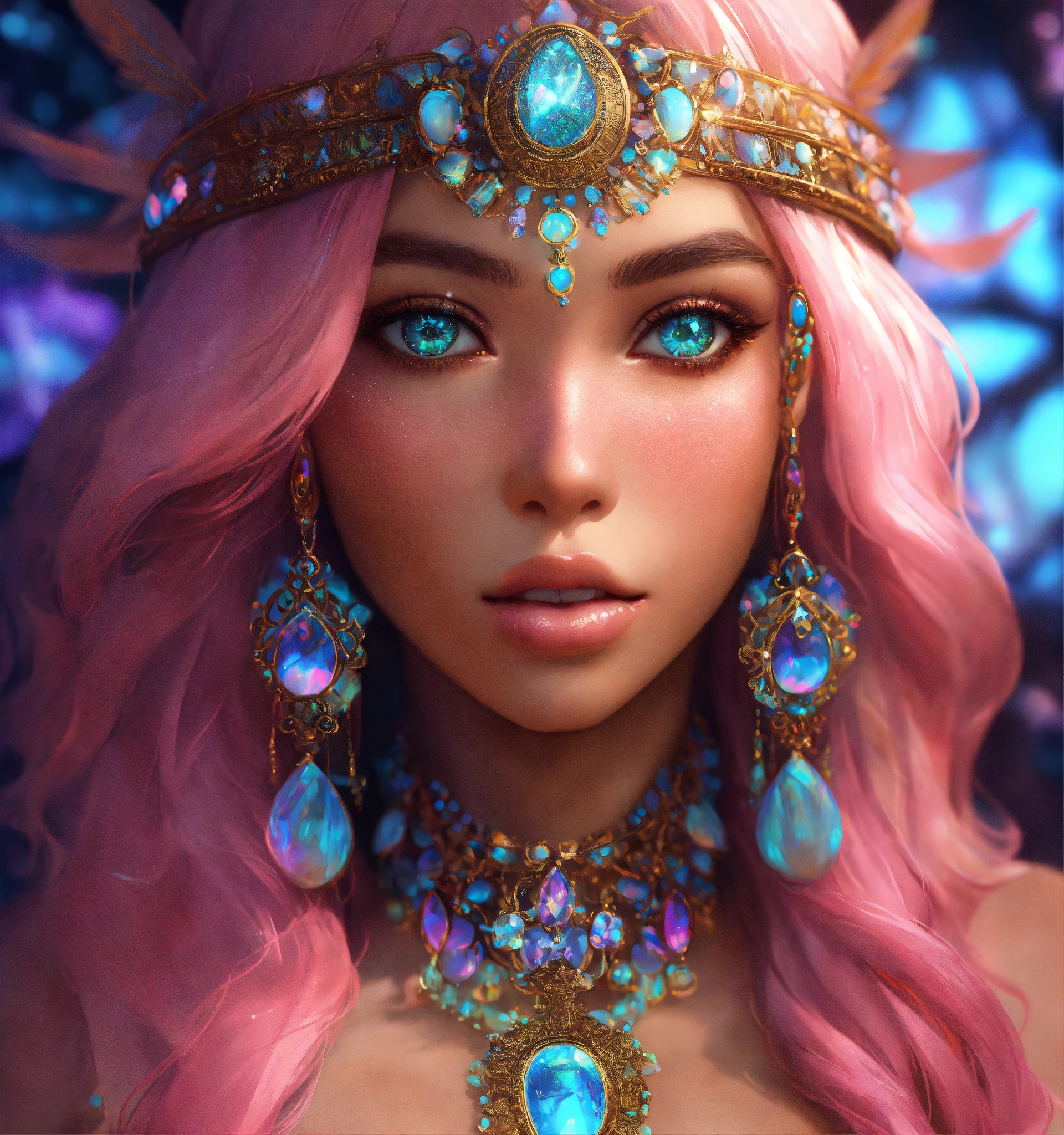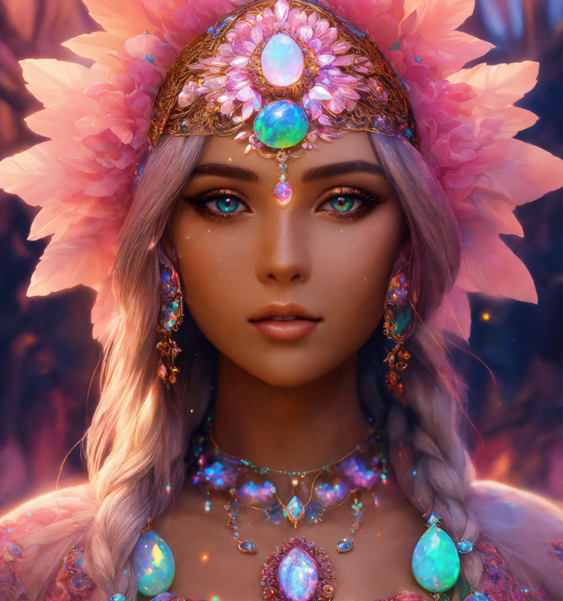 Cute, pretty, adorable, radiant, beautiful eyes, white teeth, extra fluttery long lashes, native american, bronzed skin, pink lips, luminous, luminescent, glowing eyes, fantasy, beautiful glowing skin, pop surrealism, ornate detailed fractal skin, stunning scene, masterpiece, glossy skin, cinematic, zbrush, wet, dynamic pose, ultra detailed, photorealistic, colourful, inspired by beeple, opalescent, opal jewels, glowing sparkle, opal, decadent jewells, intricate fashion, transcendant, vaporwave aesthetic, colourful, smooth, sharp focus, art by artgerm, long hair, glowing shining, flowing hair.