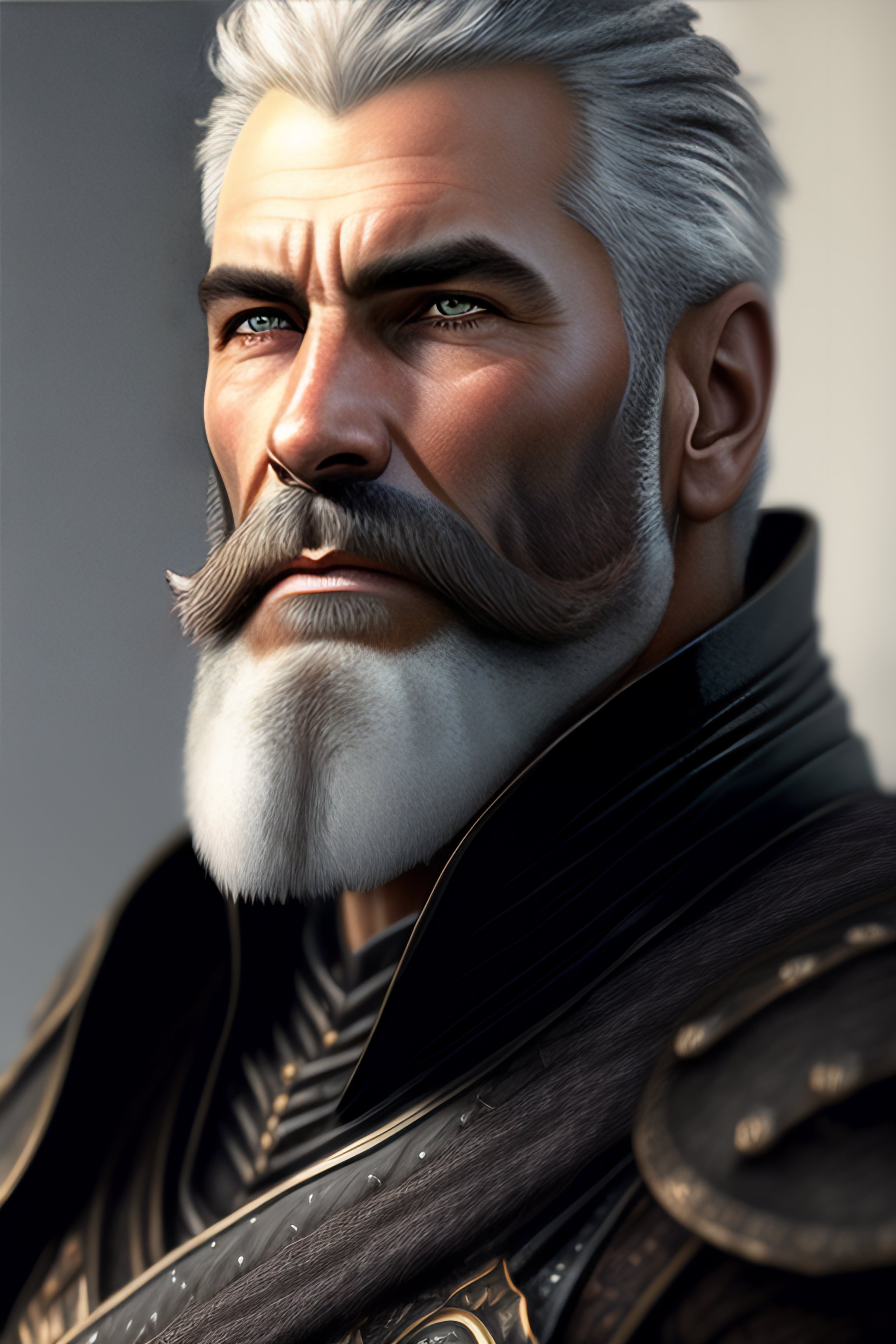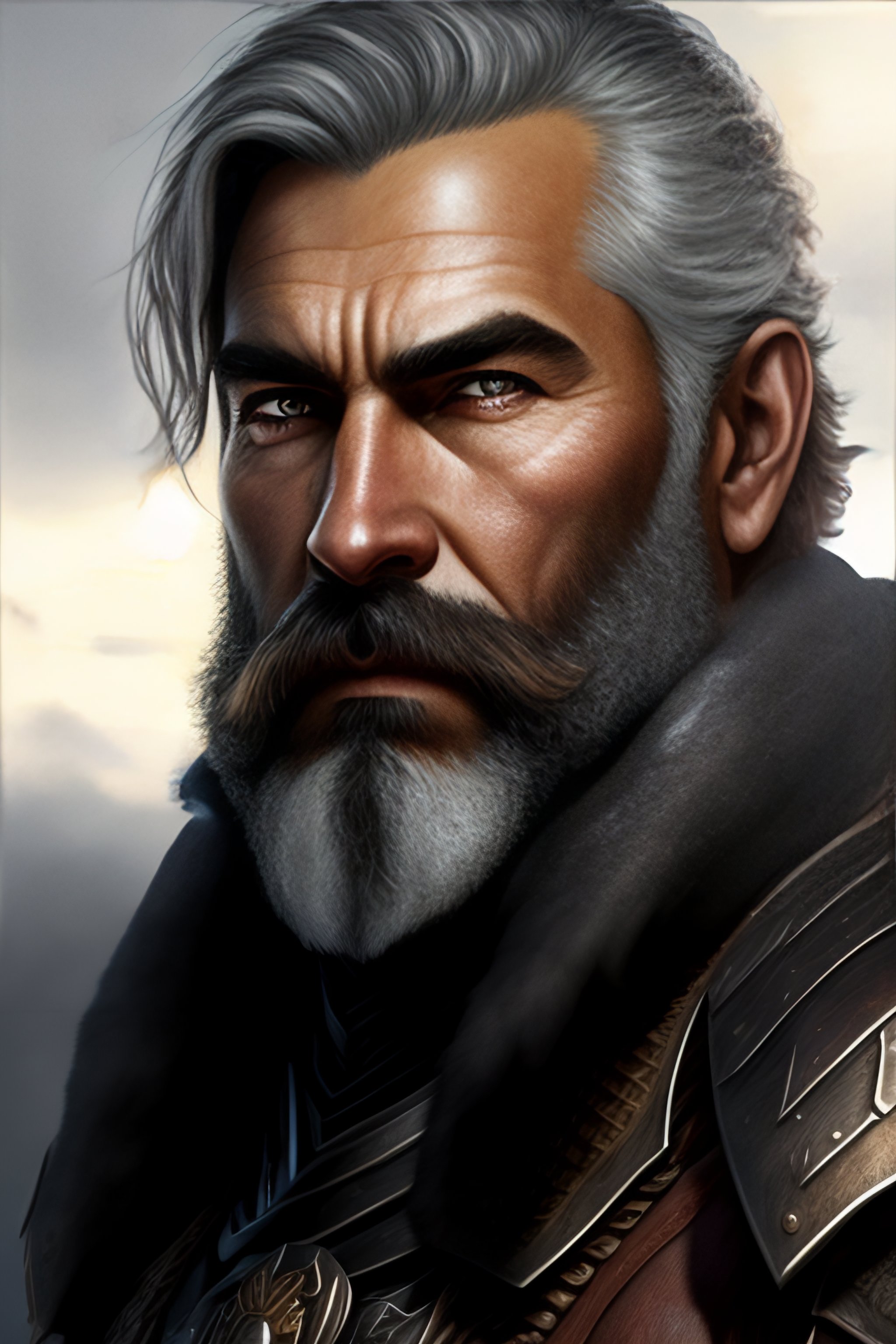 A grizzled, weathered man with short cropped hair, dark with a hint of grey speckled throughout, a beard to match. weathered face, dark eyes that seem to have a perpetual squint, leather armor, hyper realistic face, squinting eyes, intricate, medium shot, hyper detailed, pencil drawing