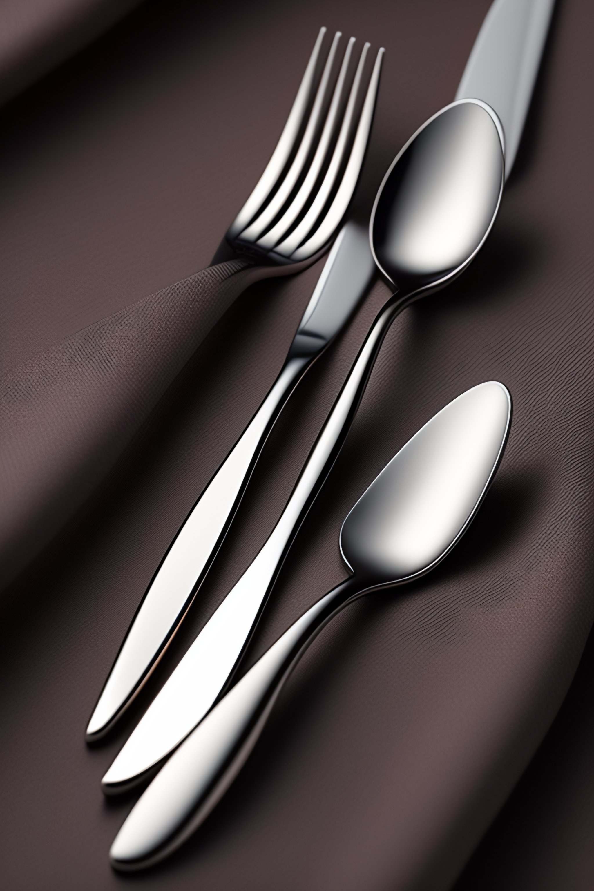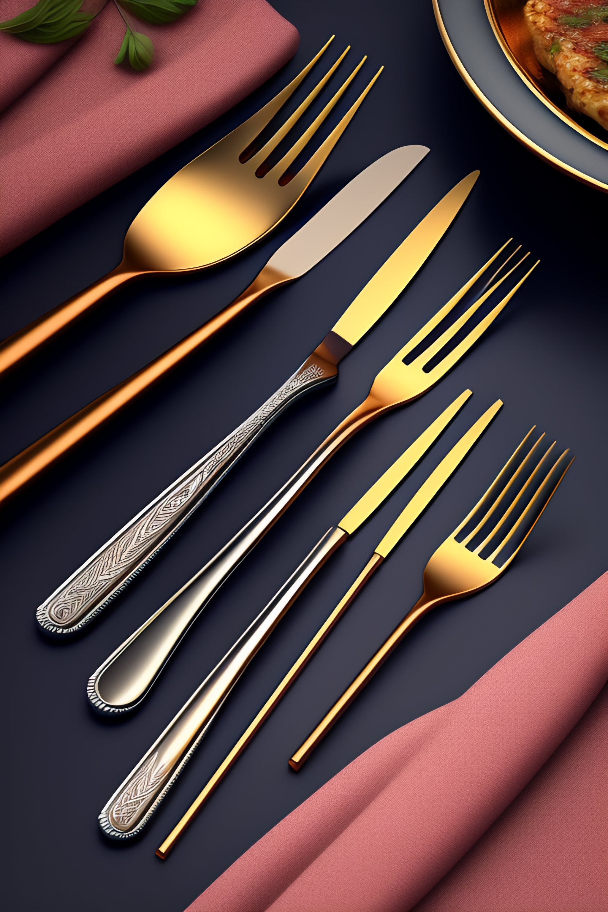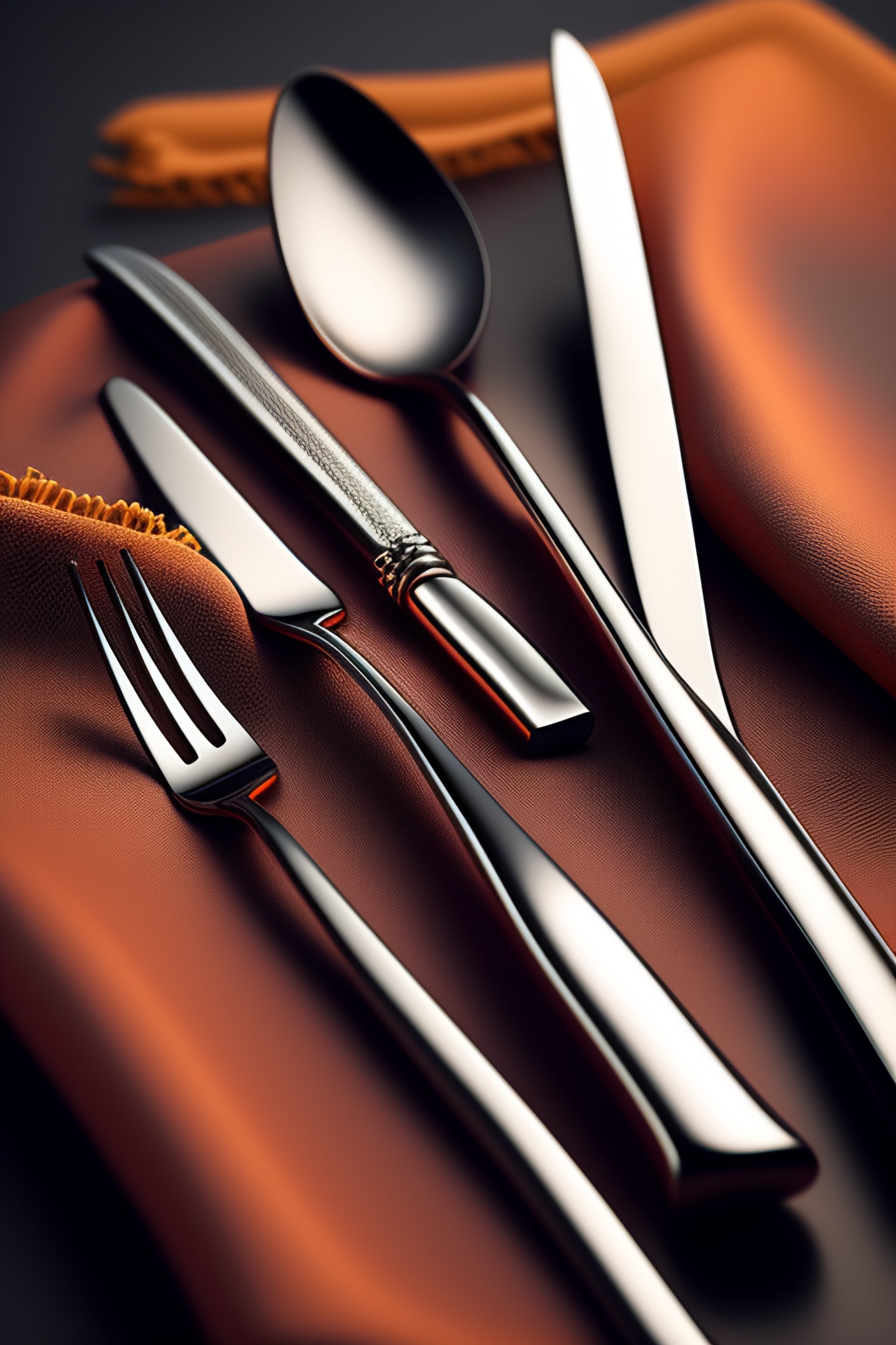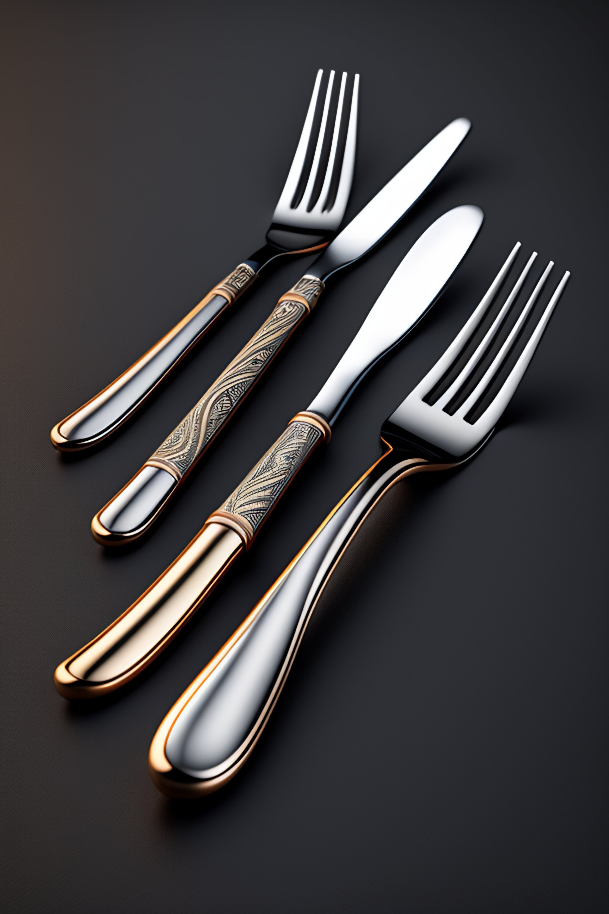 Realistic 3d render of ultra modern stainless steel cutlery with intricate tribal markings