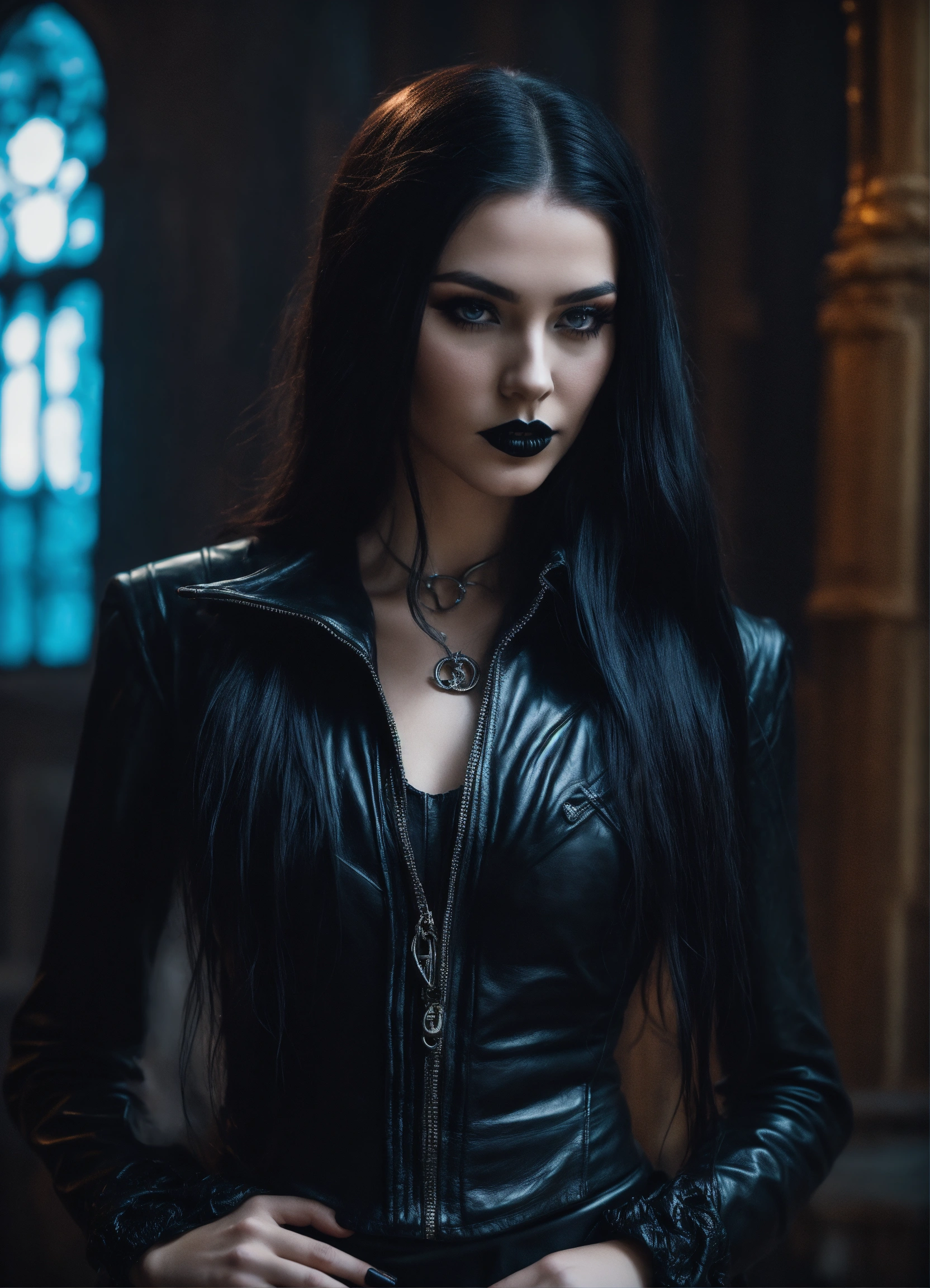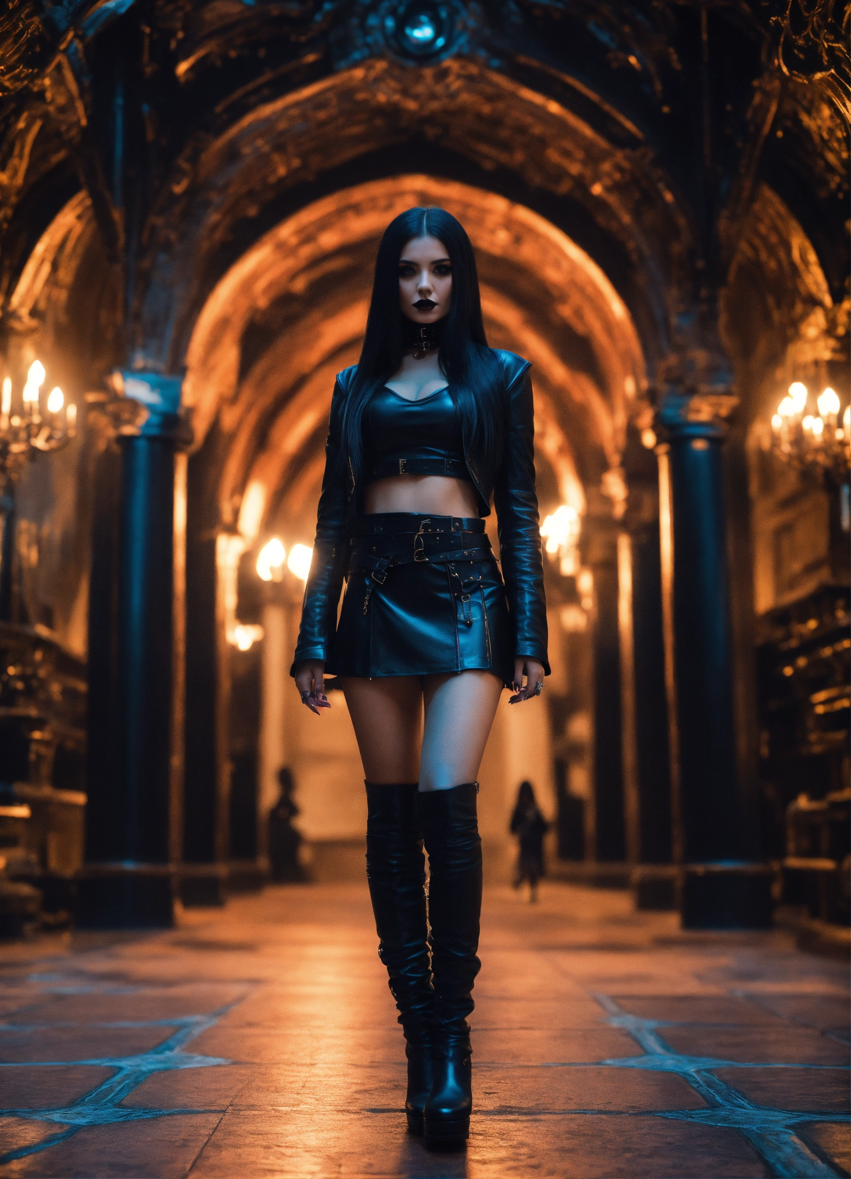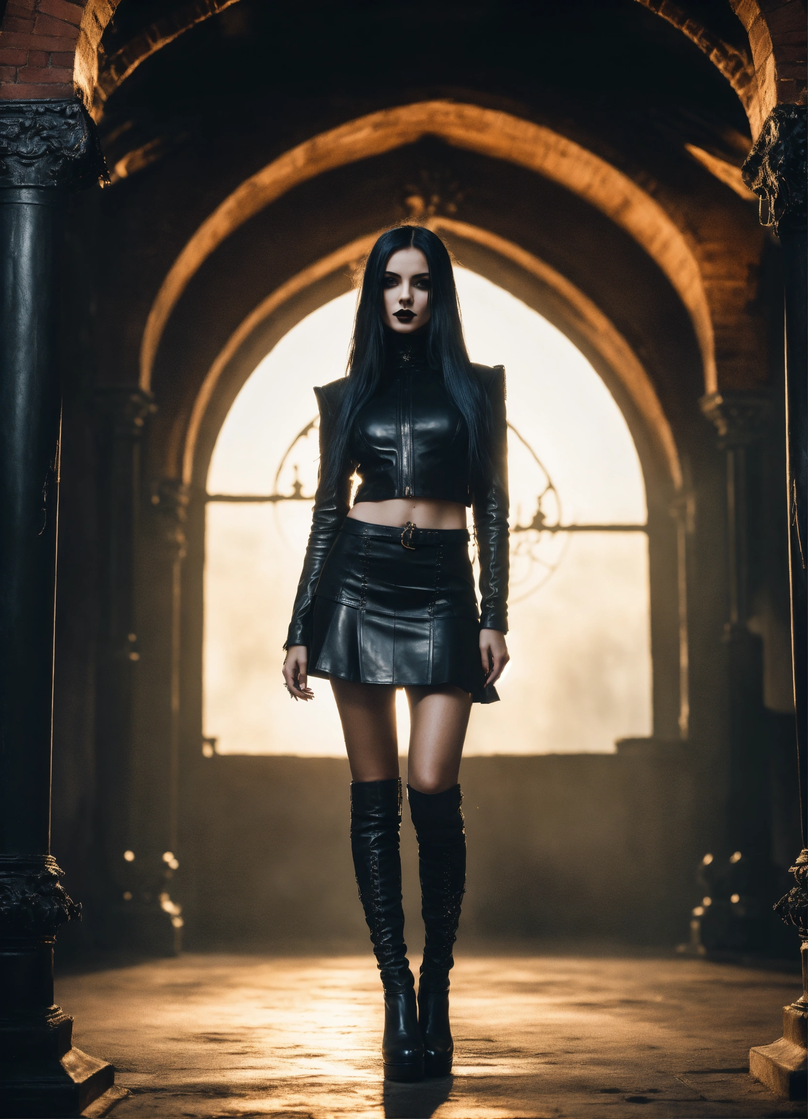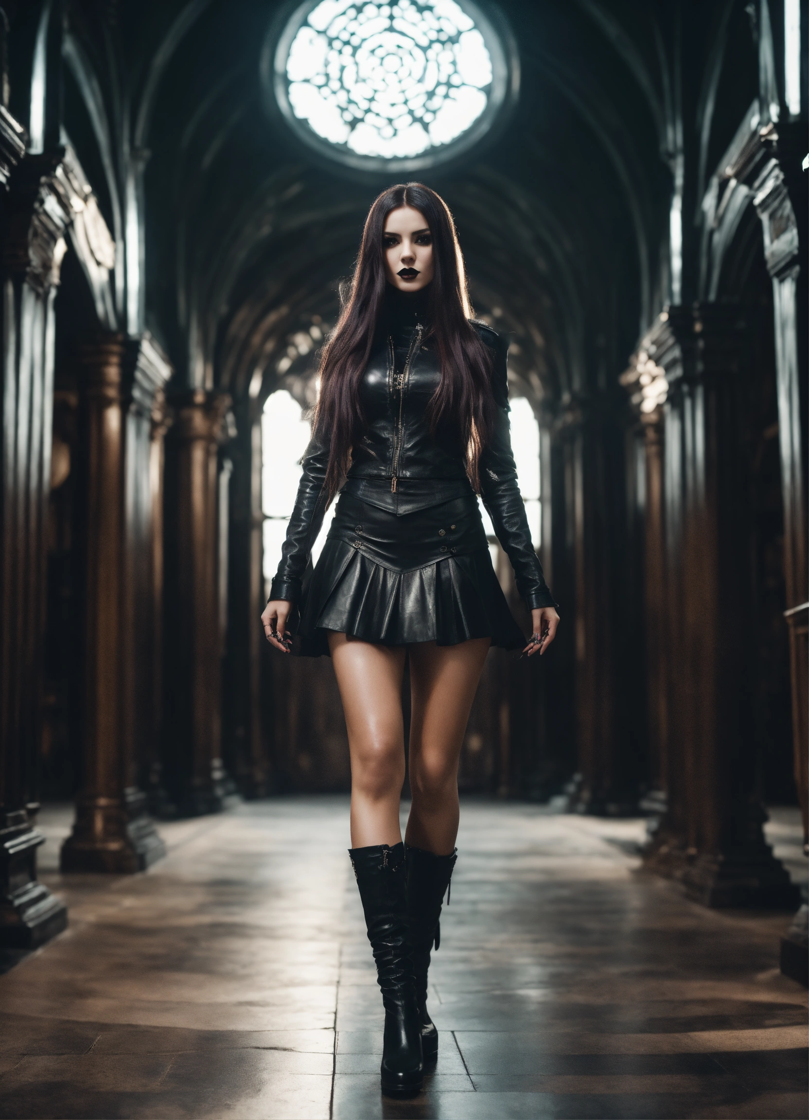 Beautiful extremely goth model young girl wearing black leather, short leather skirt, hypnotizing, long hair. dark sorceress who rules the universe all realms & all dimensions, full body, 8k, cinematic light, super sharp