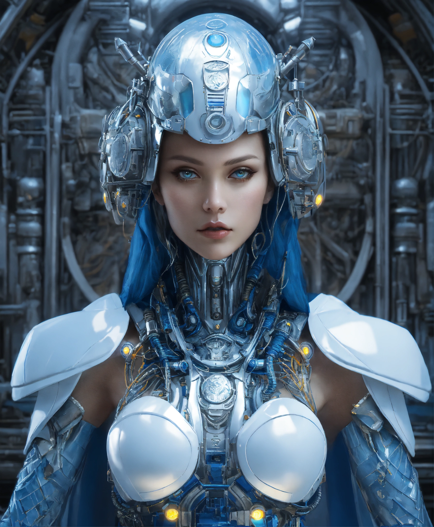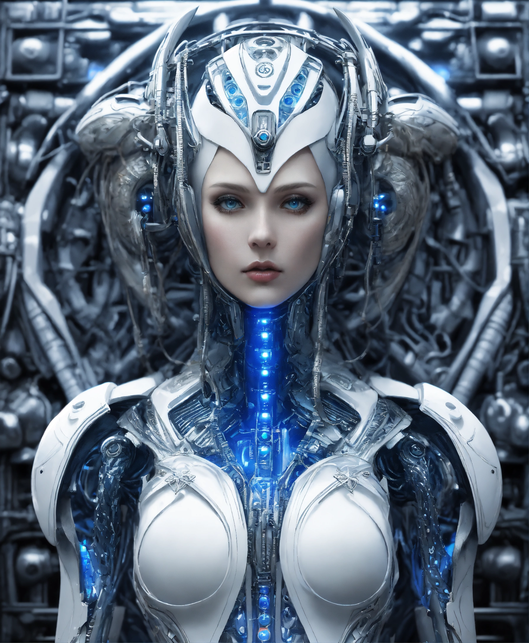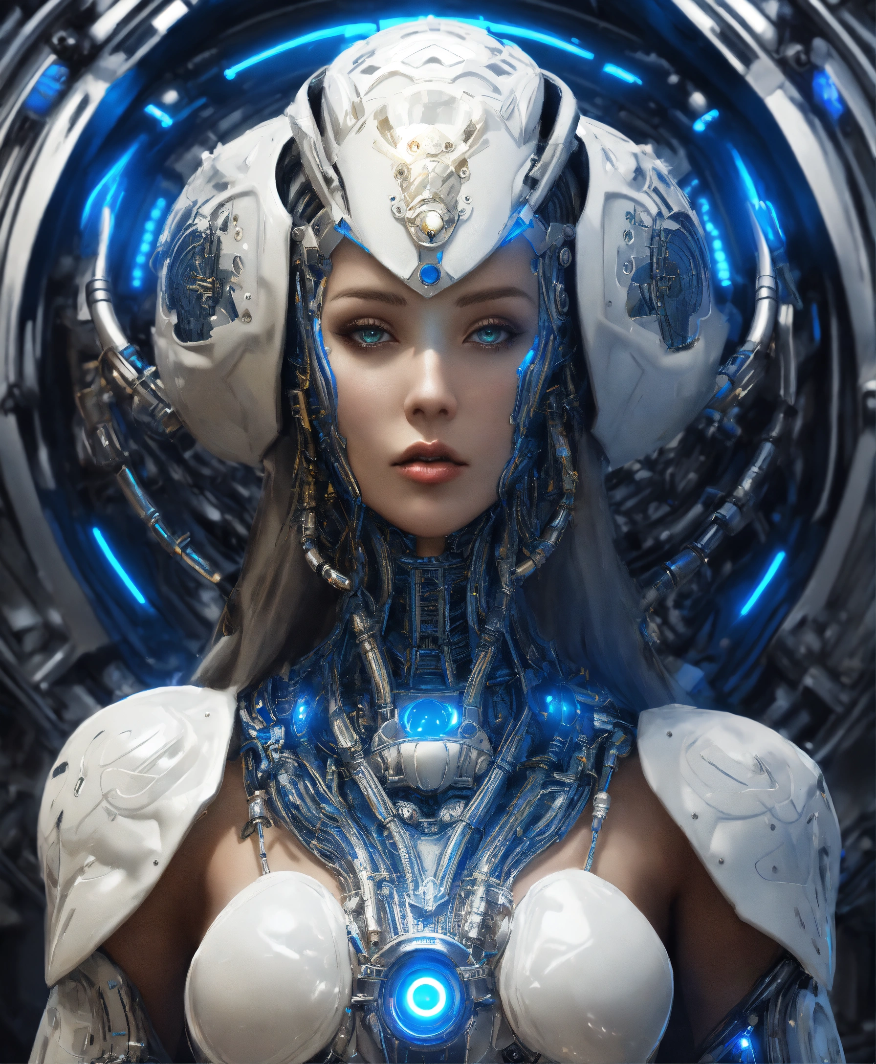 Upper body alien robot goddess of storms in white celtic robes by android jones alex gray m, c, escher h, r, giger android jones alex gray mark cooper beauty alien cyborg machine with helmet with lights, in blue robes and metal machine deity alex gray android jones hr giger artgerm artstation award winning photorealistic detailed hyper vivid fantasy
