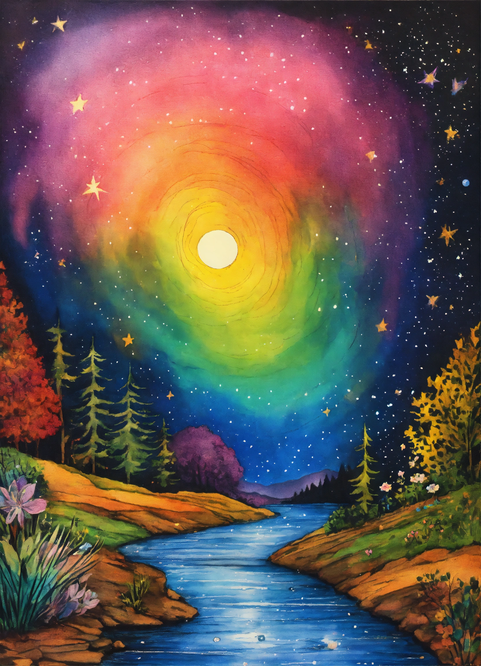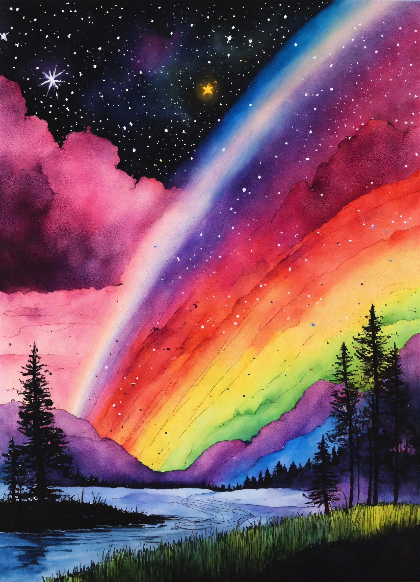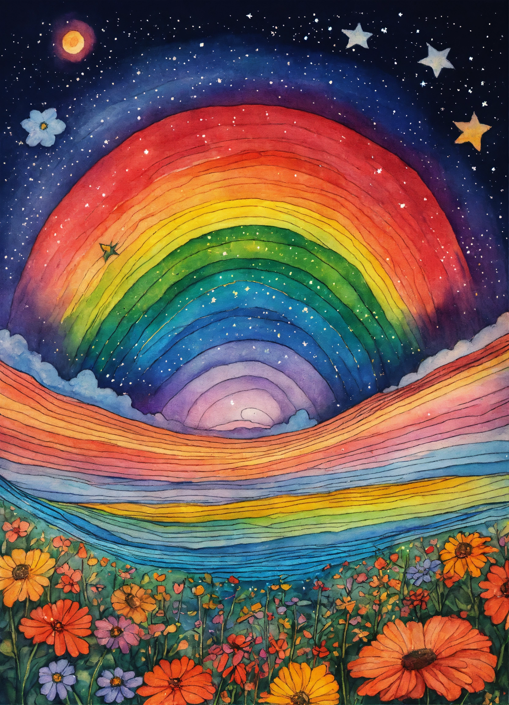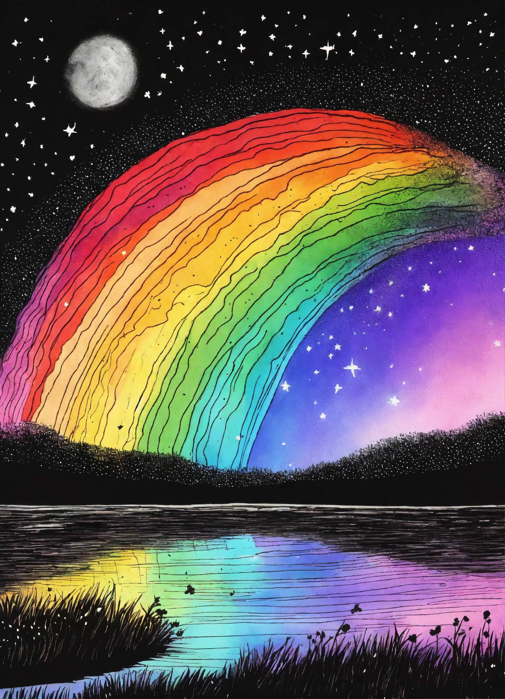 Ink drawing image of a rainbow out in the dark cosmos, mystical, magical, sending out stars containing feelings of deep love, spirit and soul, sending out love, kindness to all