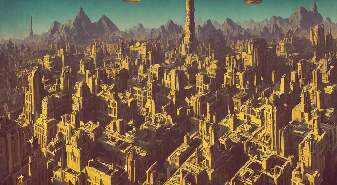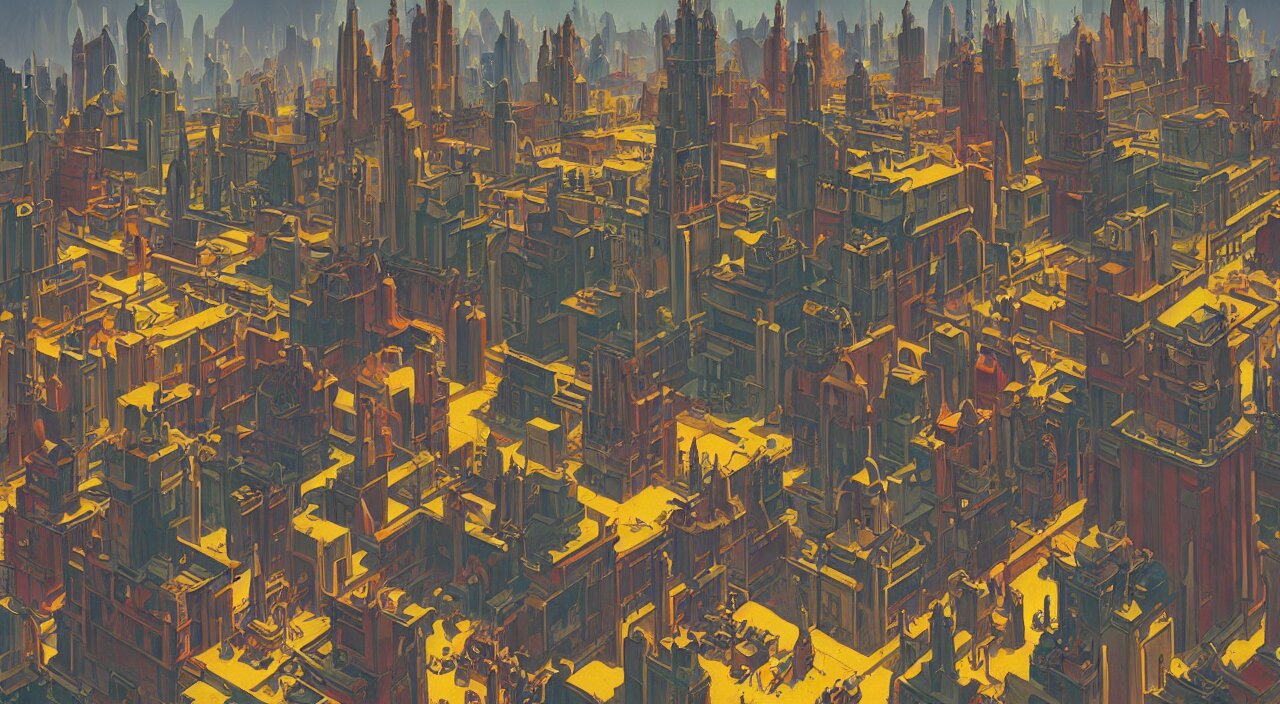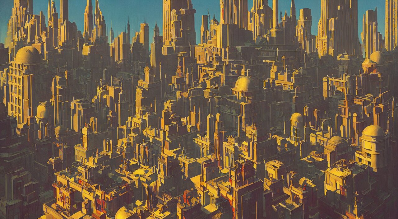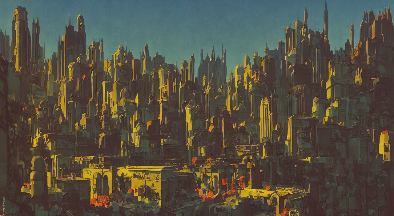 Art - deco dwarven city, very coherent high contrast!! painting by stalenhag spitzweg magritte syd mead norman rockwell edward hopper james gilleard, dark shadows, sunny day, triadic color scheme, hard lighting, masterpiece