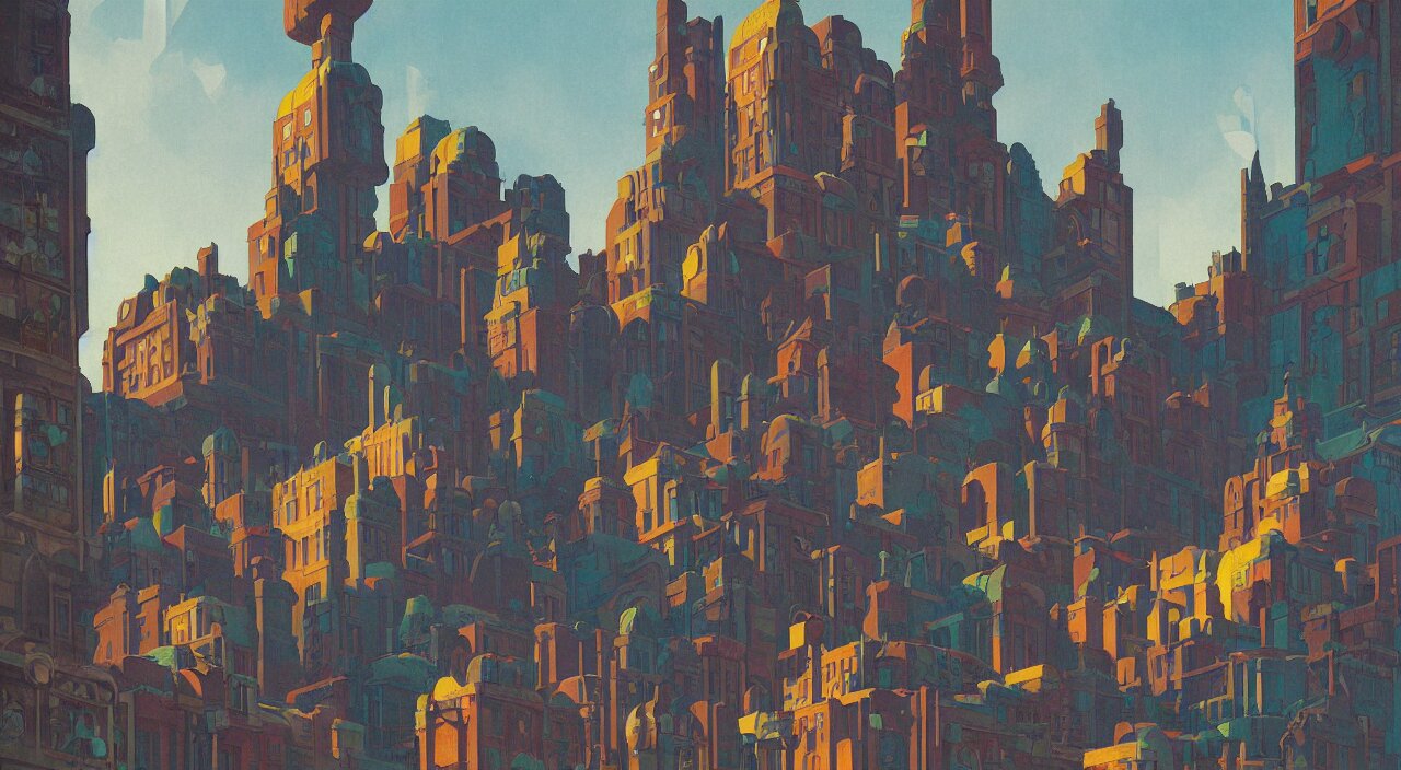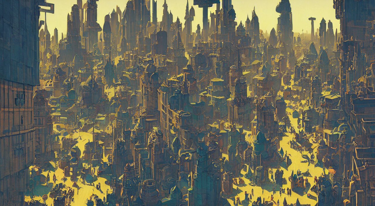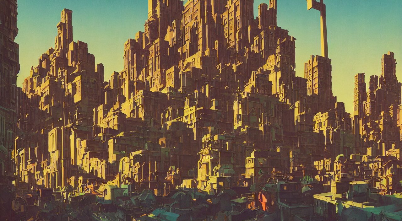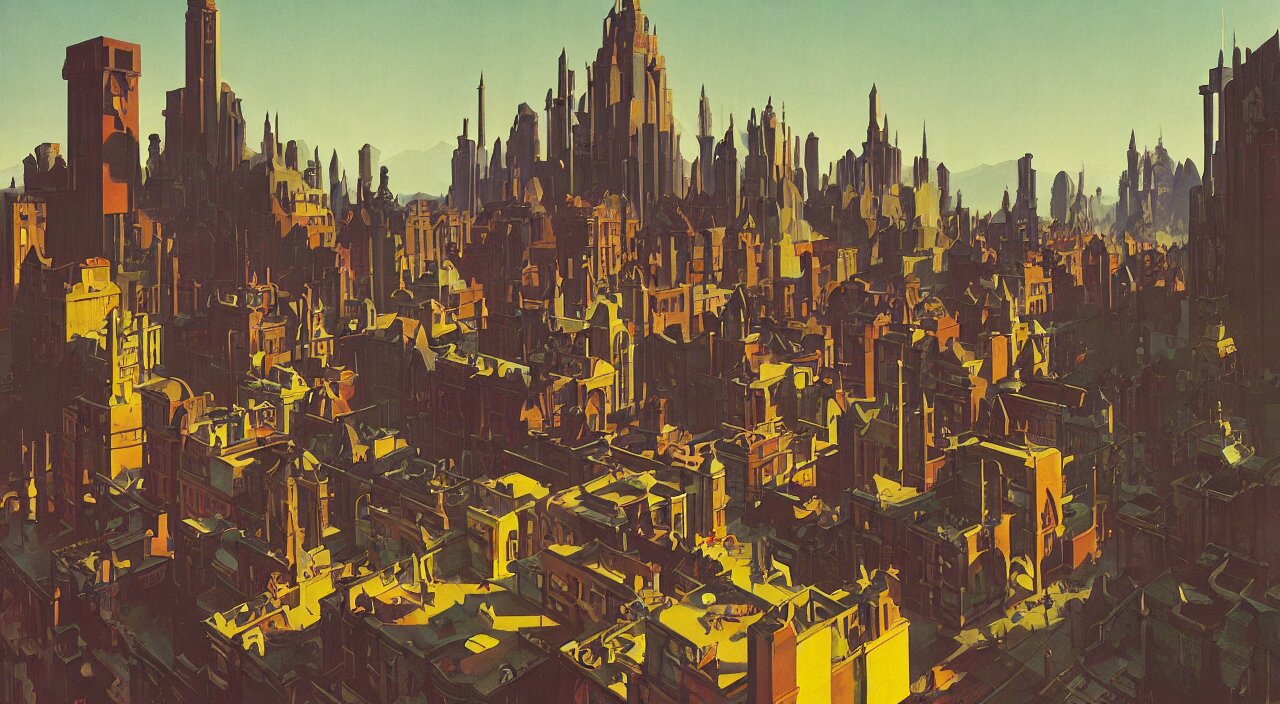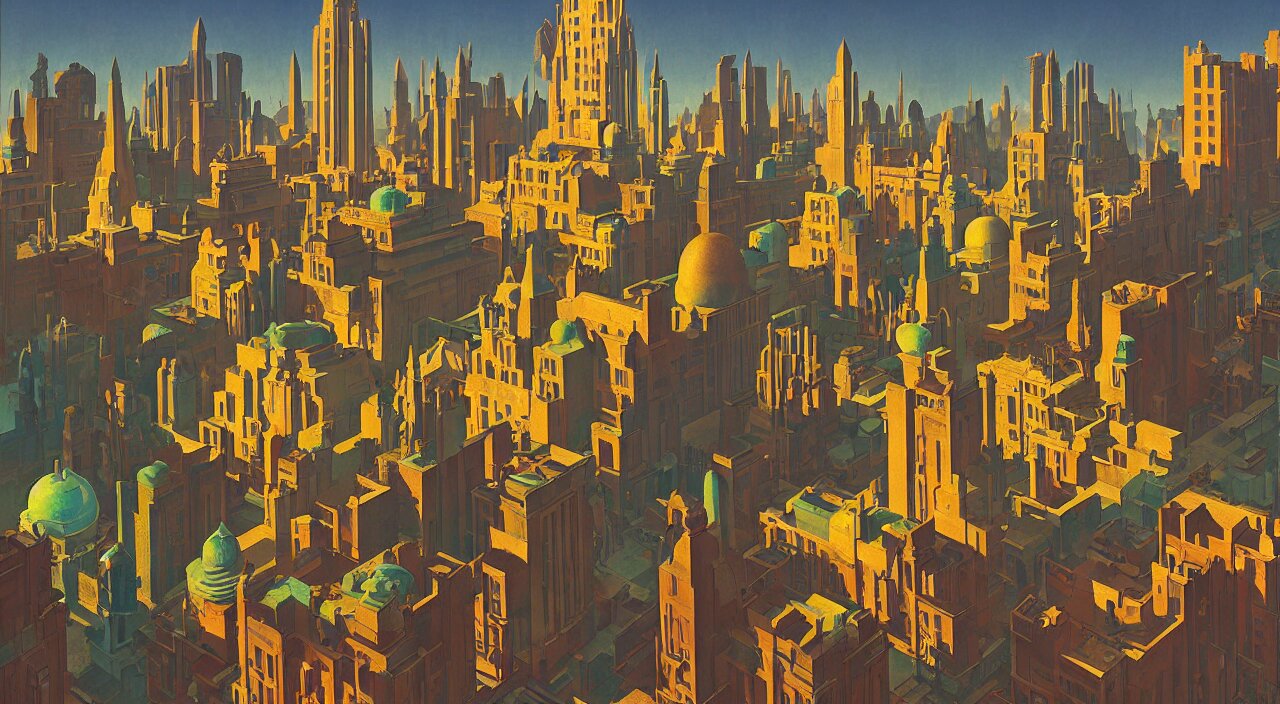 Art - deco dwarven city, very coherent high contrast!! painting by stalenhag spitzweg magritte syd mead norman rockwell edward hopper james gilleard, dark shadows, sunny day, triadic color scheme, hard lighting, masterpiece