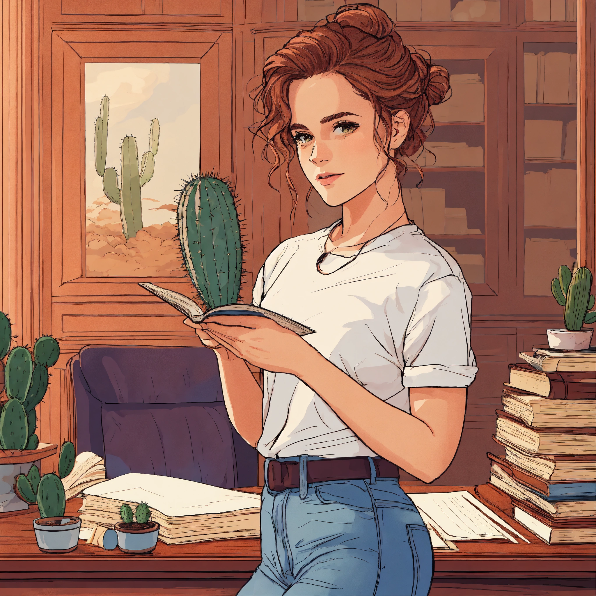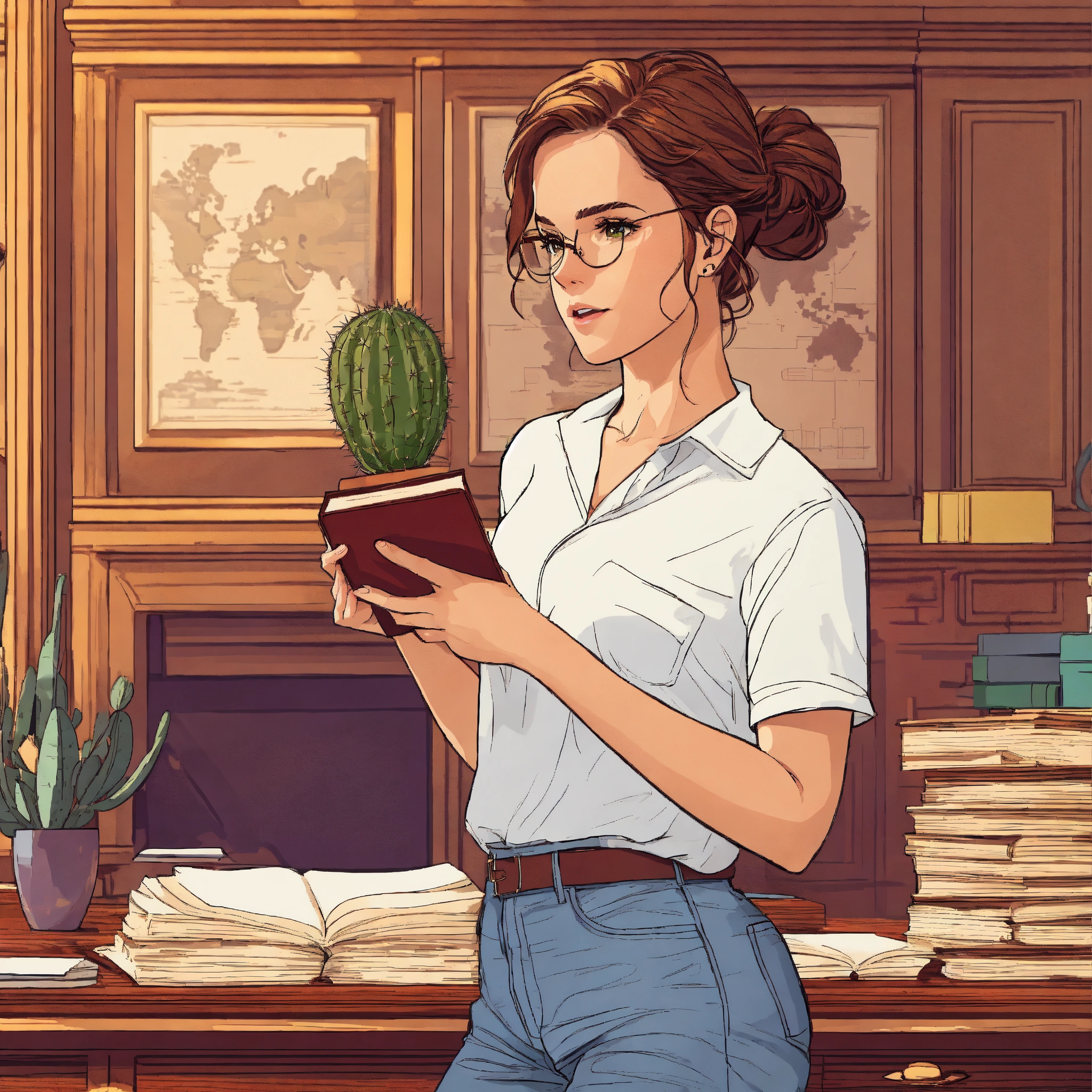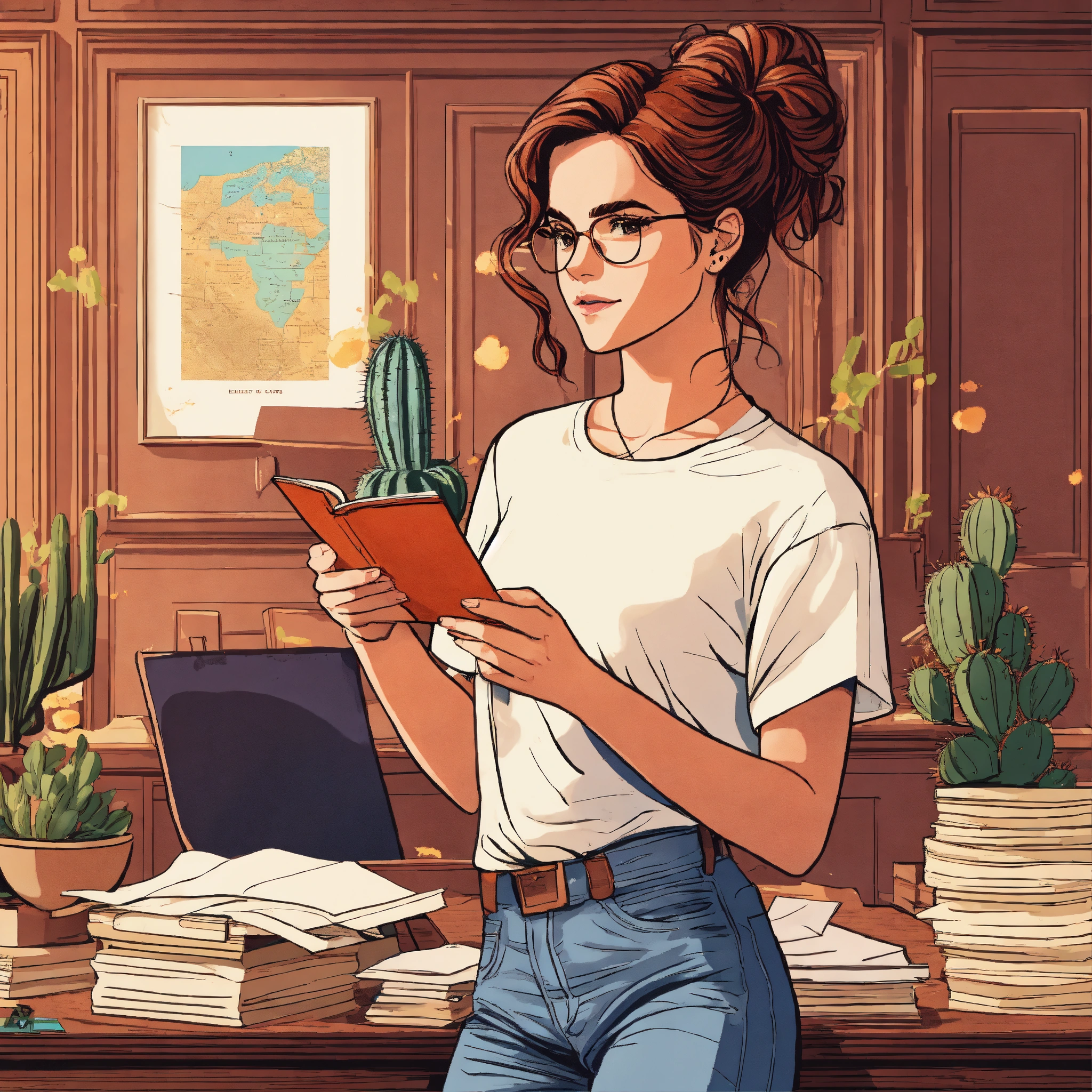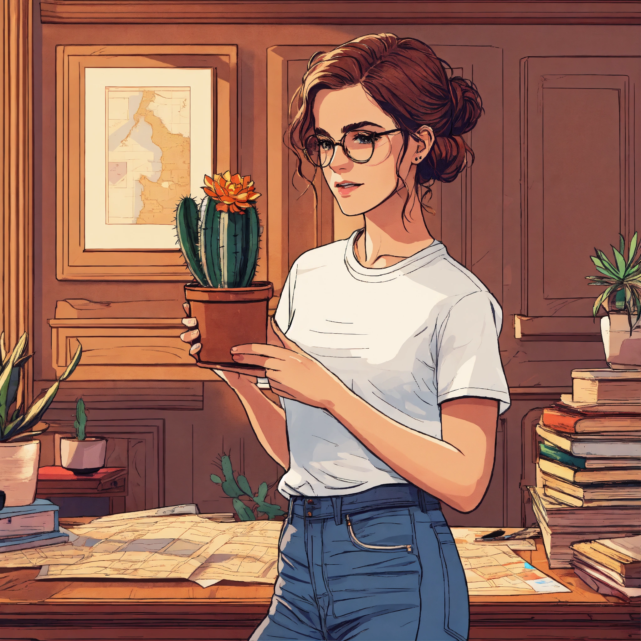 Emma watson as hermione granger with a curly updo holding a little cactus in white t-shirt and blue jeans inside a sophisticated mahogany luxury office with a picture frame and stacks of papers books and a map on the wooden desk, schematic line illustration, flat colors, flat design poster, not too complex, modern, 4k, epic composition, flat vector art illustration, vibrant colours, big shapes