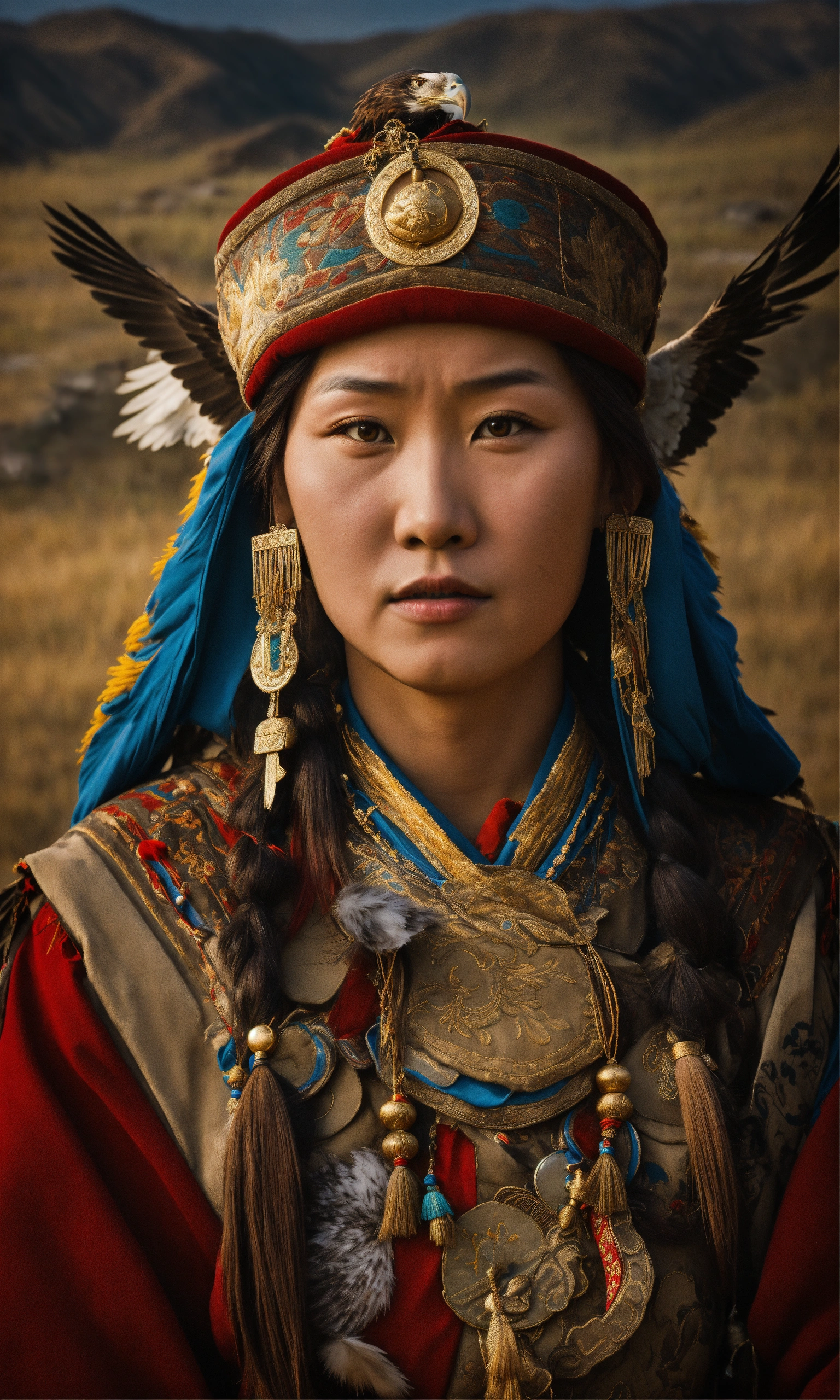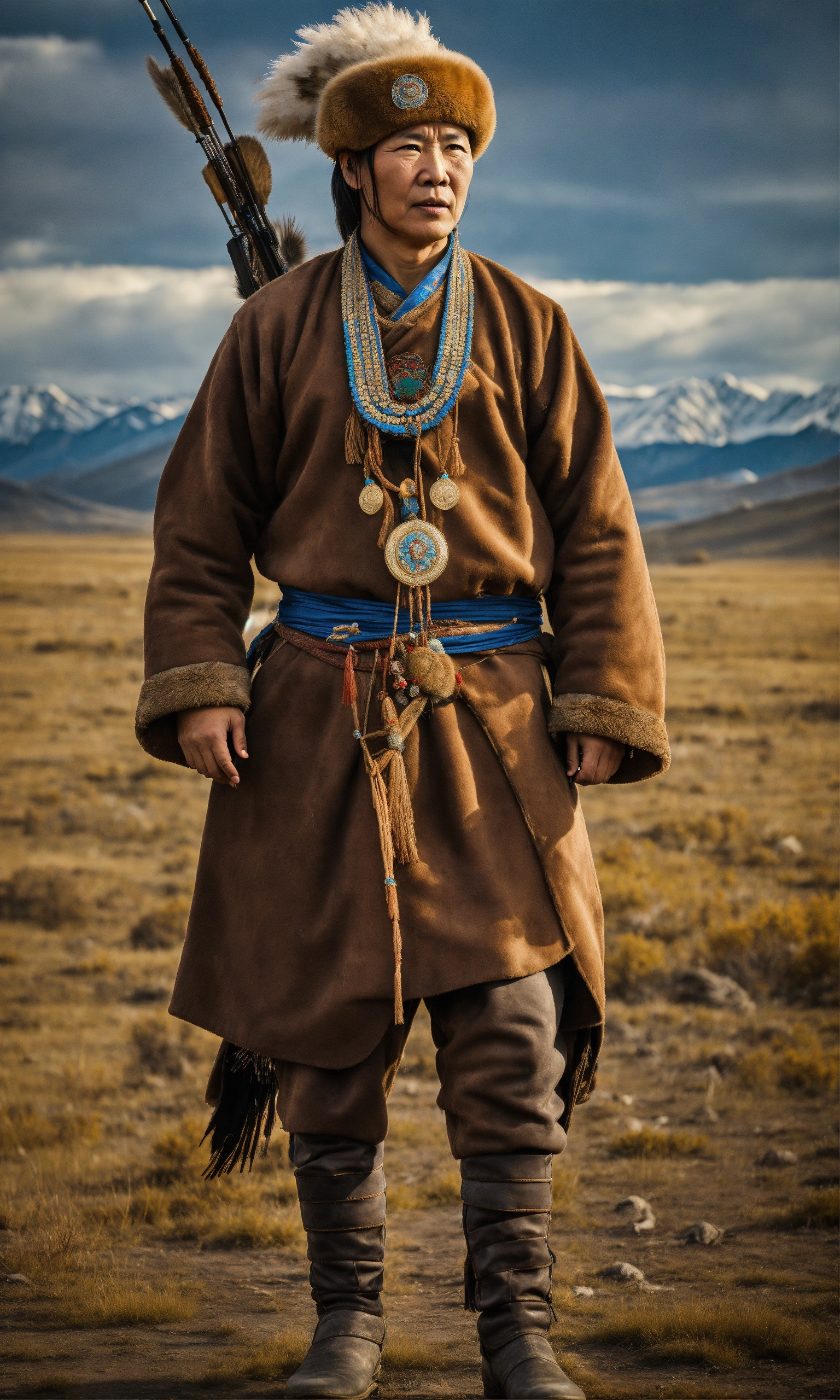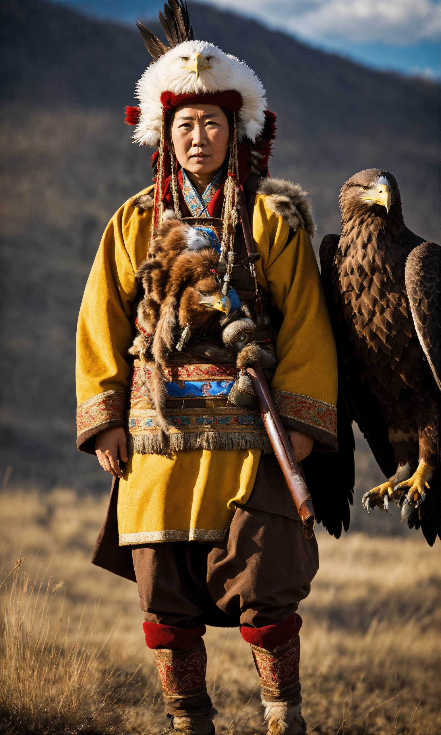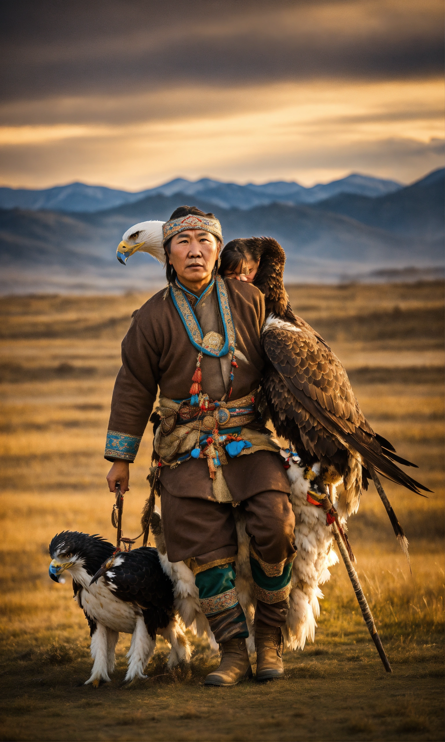 Ultra realistic 12k photo, variant adult and family in kazakh culture, tradition and family are very important in kazakh culture. in the north-west of mongolia, the kazakhs perpetuate the centuries-old tradition of eagle hunting and maintain a nomadic existence, a cinematic atmosphere.