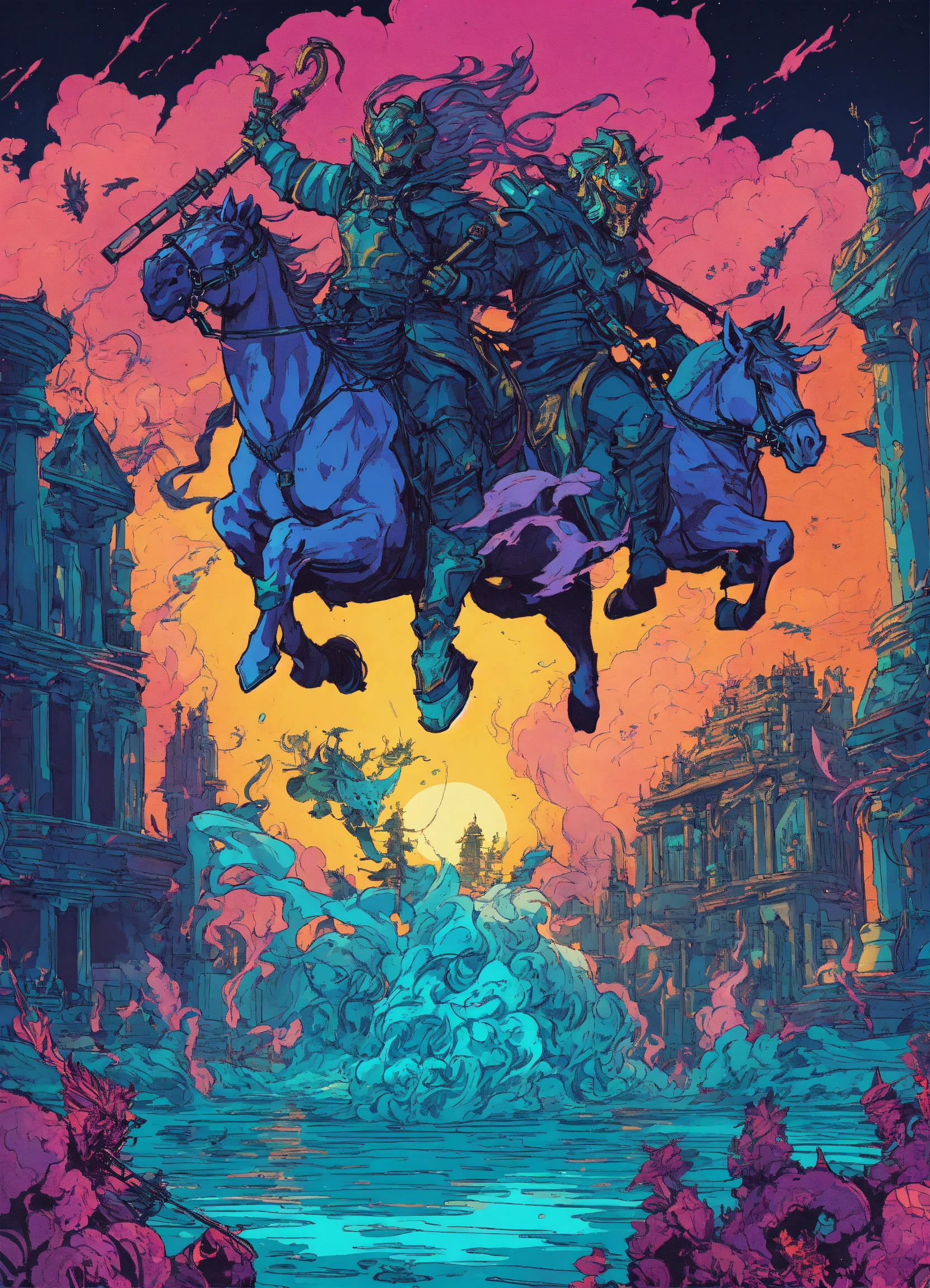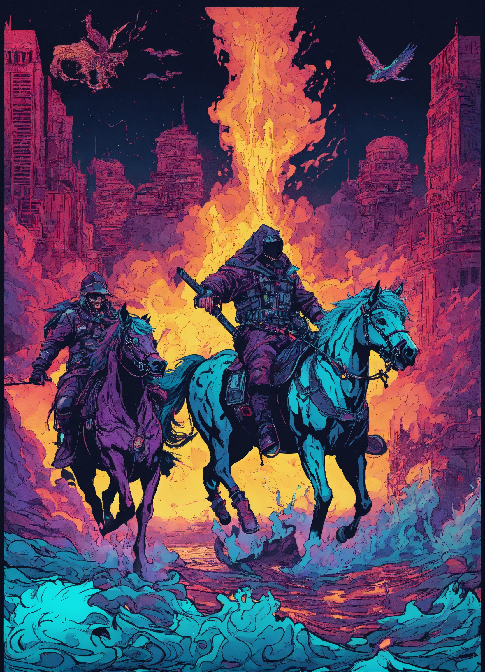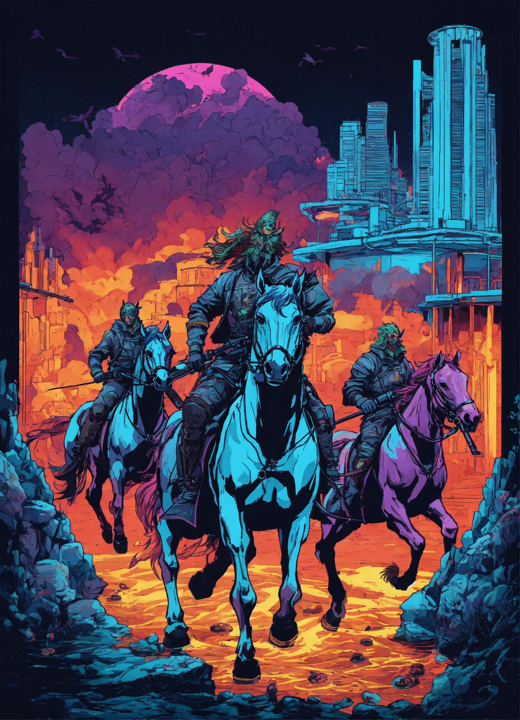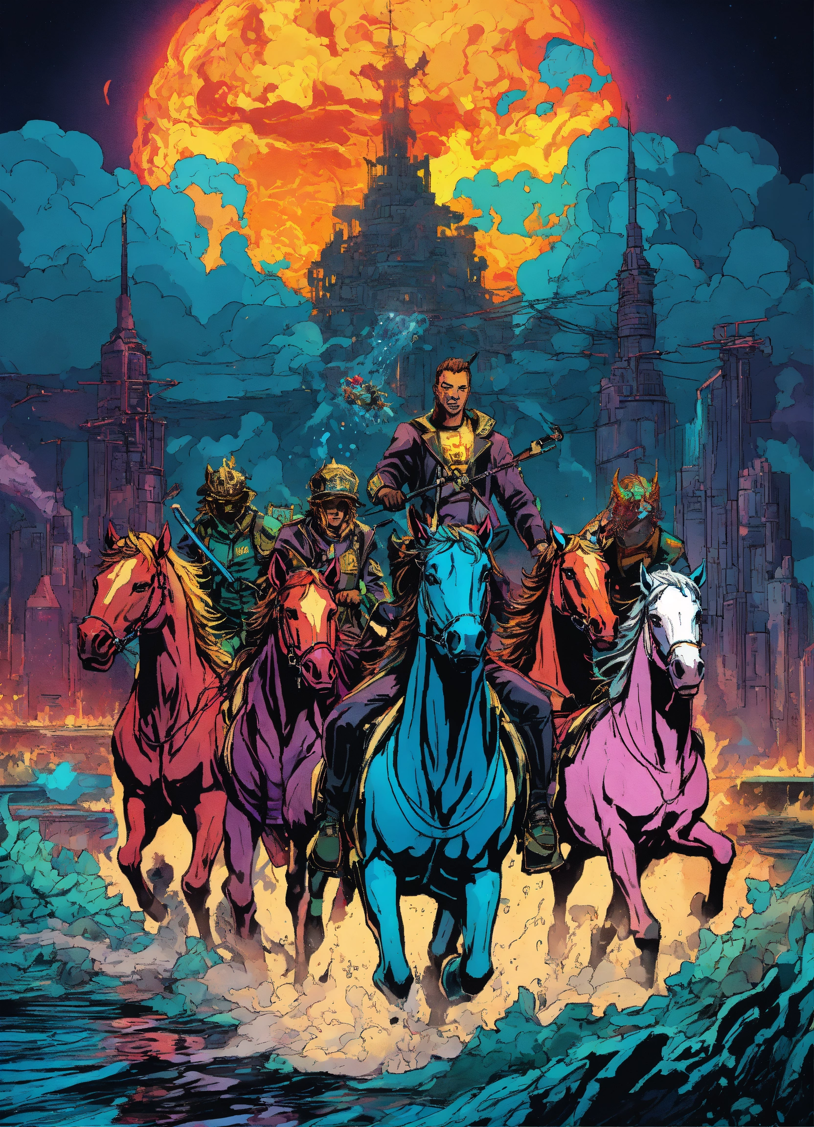 A the four horsemen of the apocalypse coming down from the sky underwater city with grillz, splash back jjjground, gritty, contour, neon color, 2d, vector, sticker, detailed