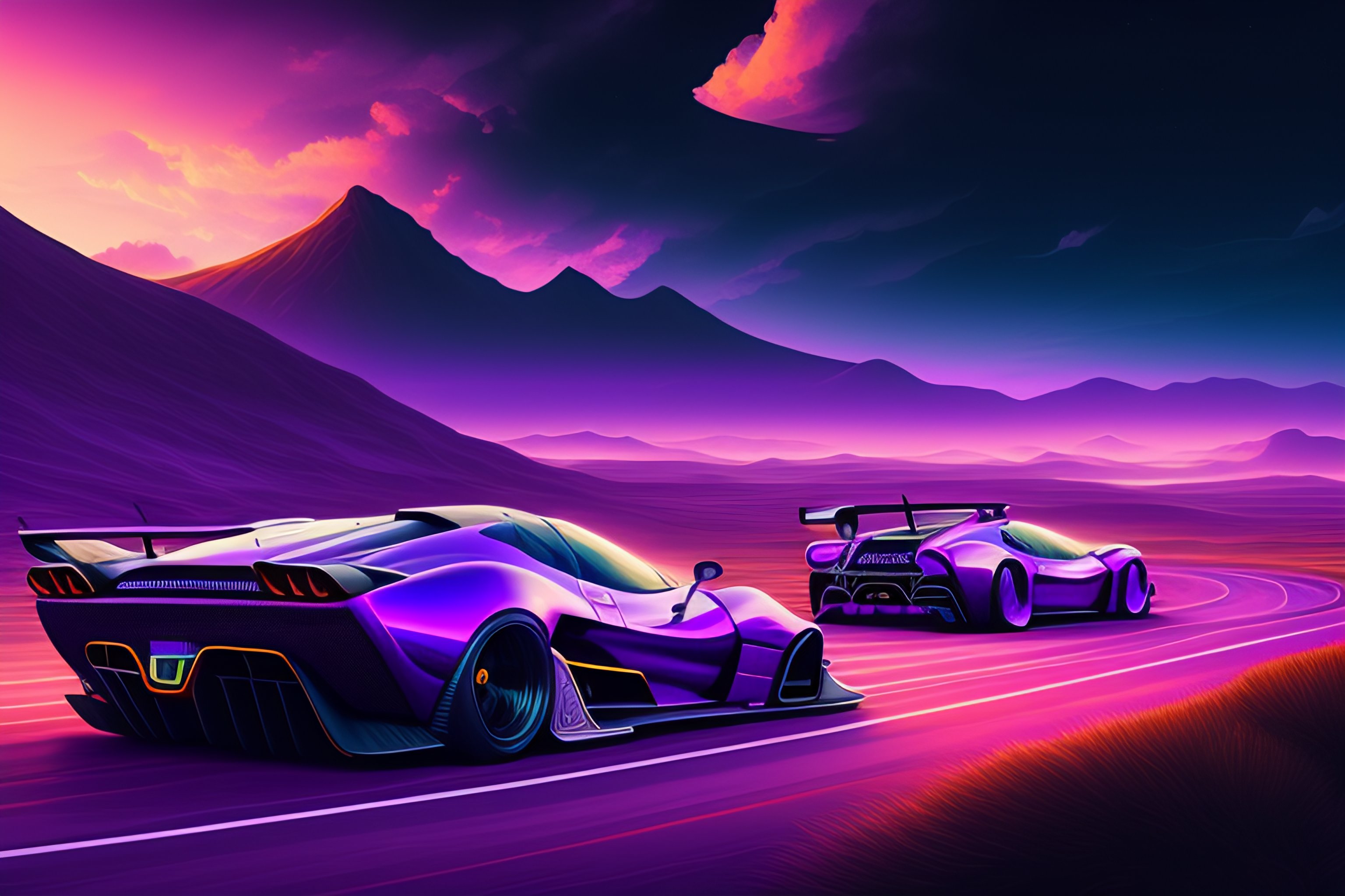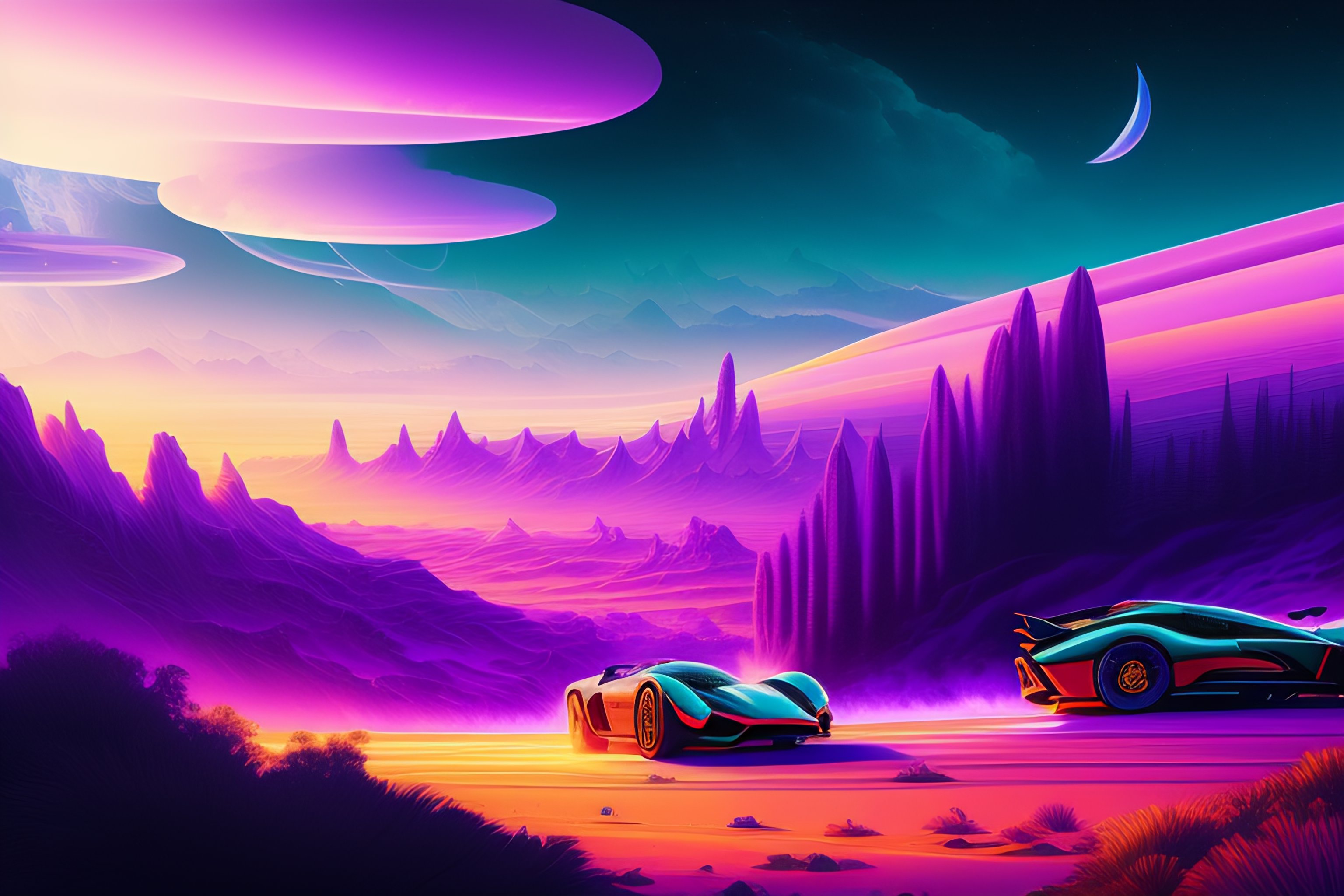 Illustration of super cars by dan mumford, alien landscape and vegetation, epic scene, a lot of swirling clouds, high exposure, highly detailed, fantastical, vibrant purple tinted colors, uhd