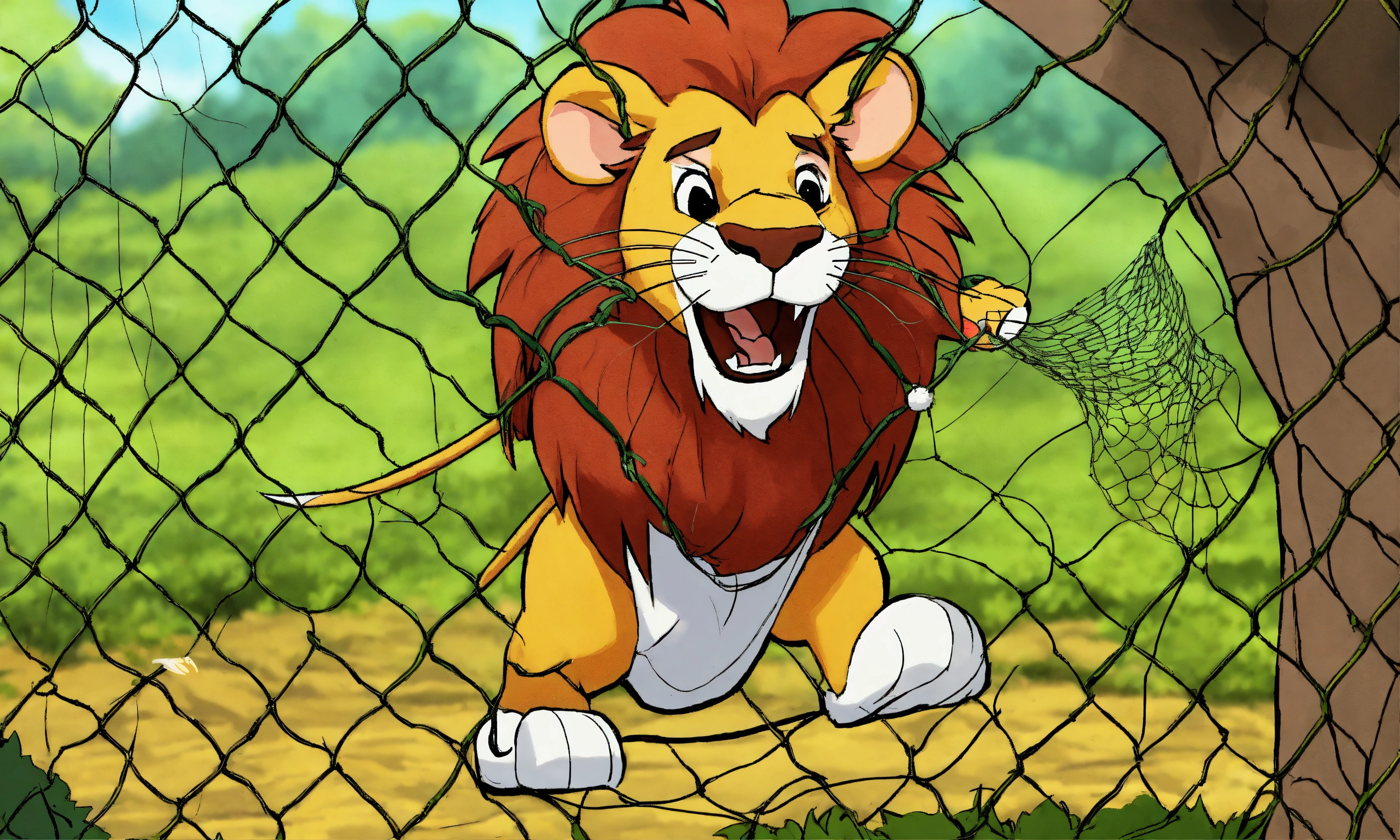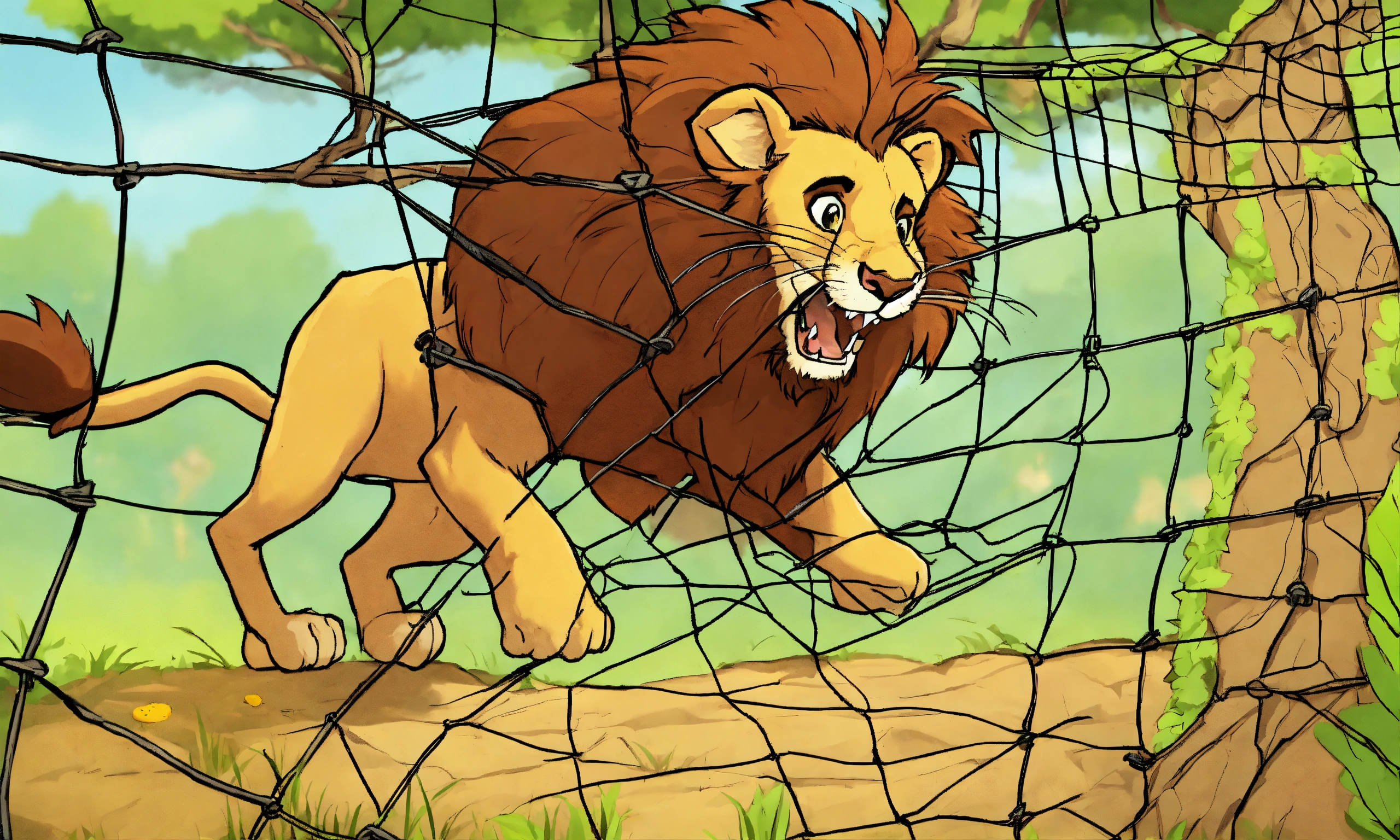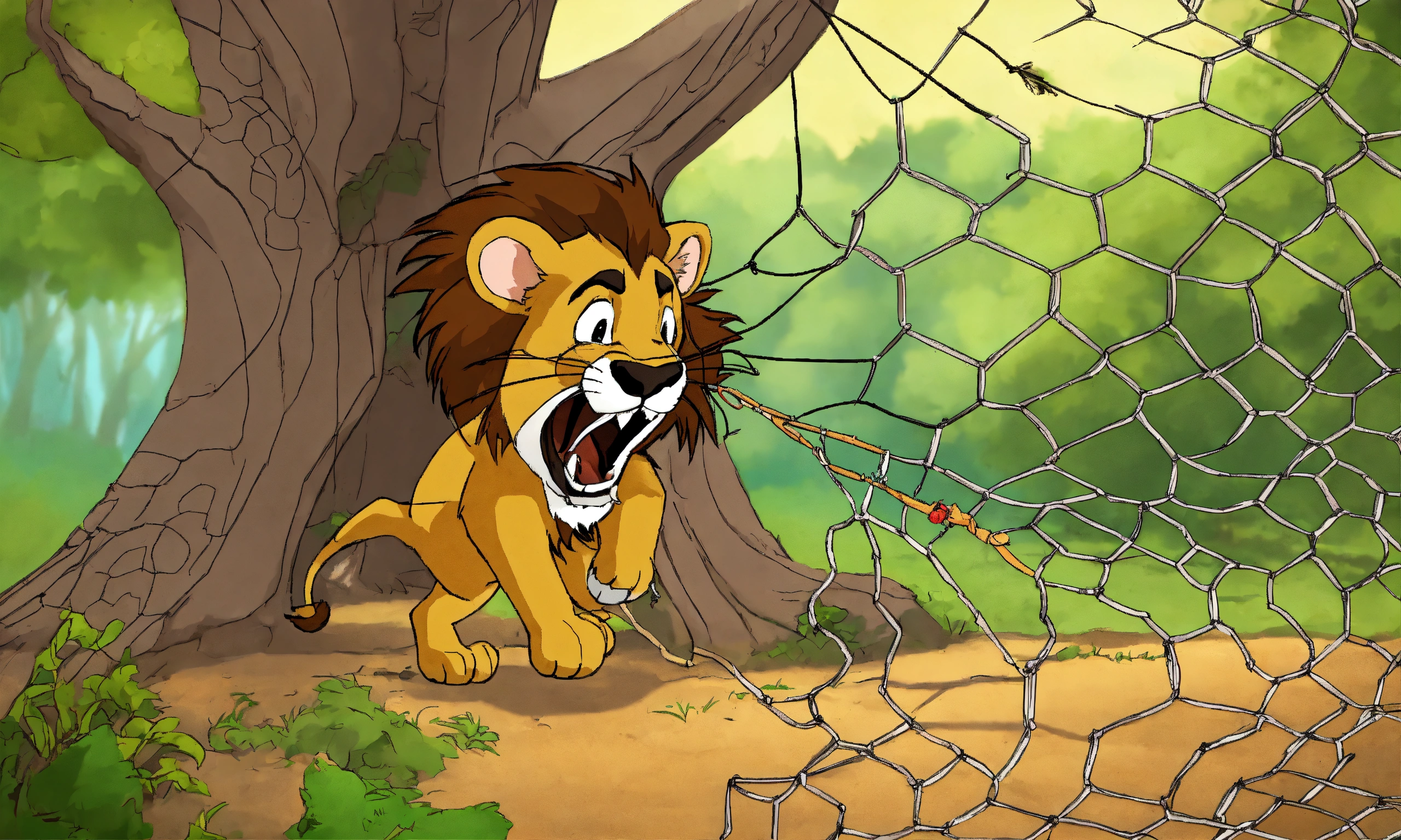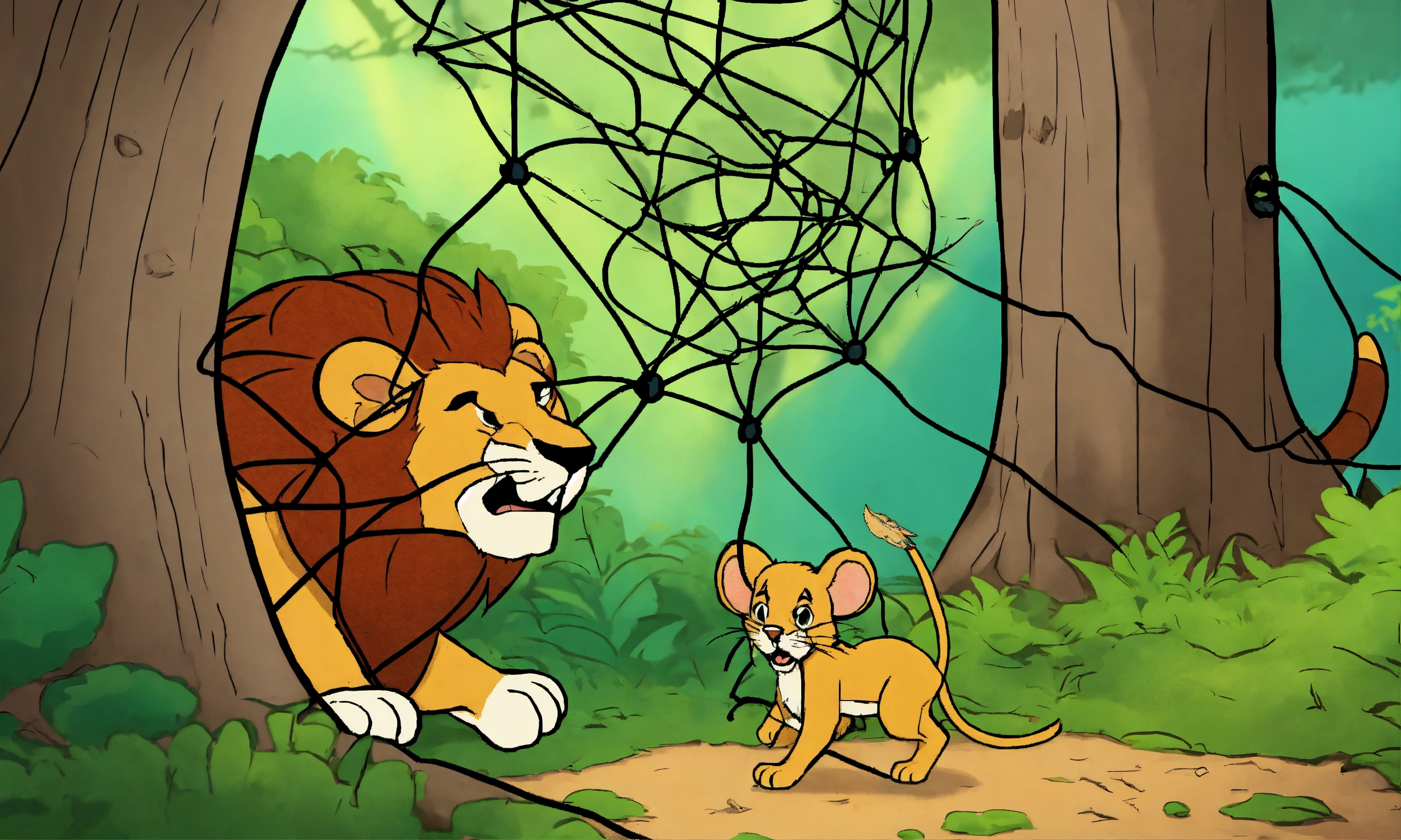 Cartoon lion trapped in net hooked to tree by hunter mouse cutting net with its teeth