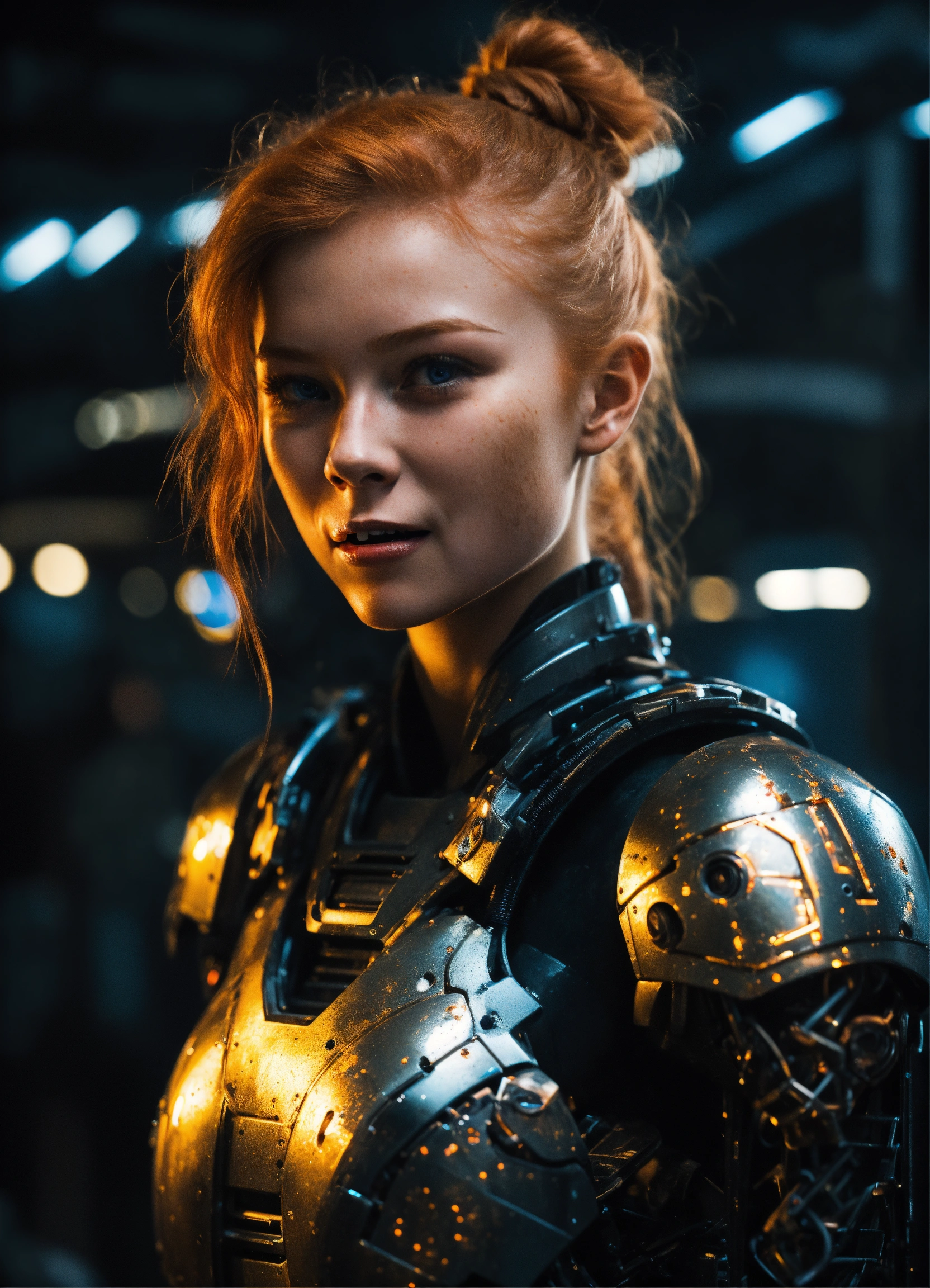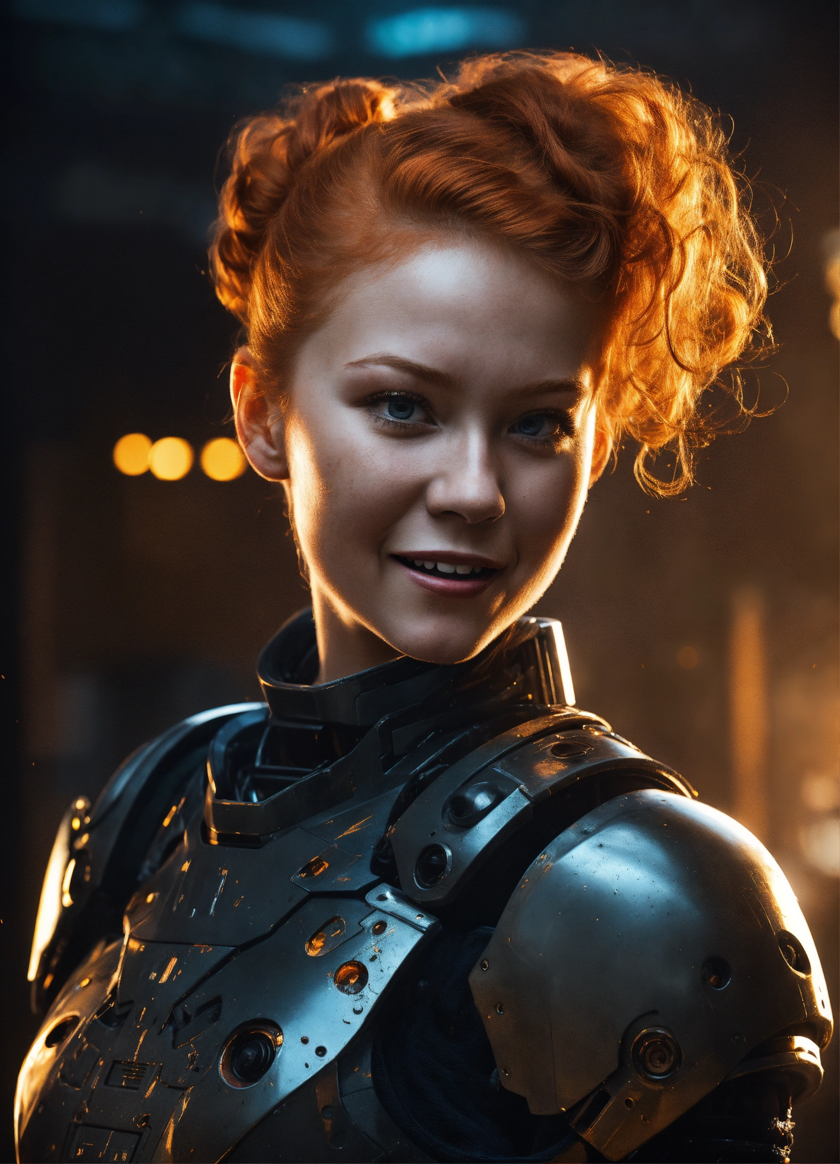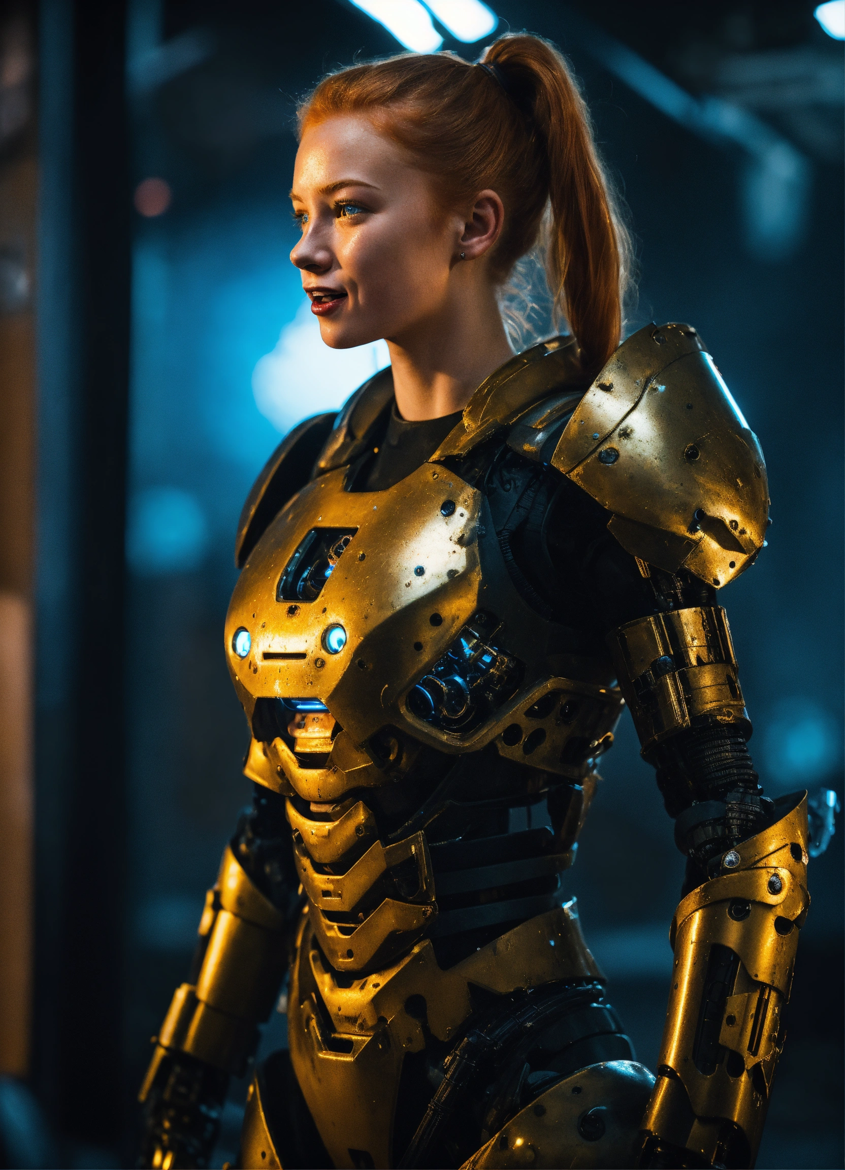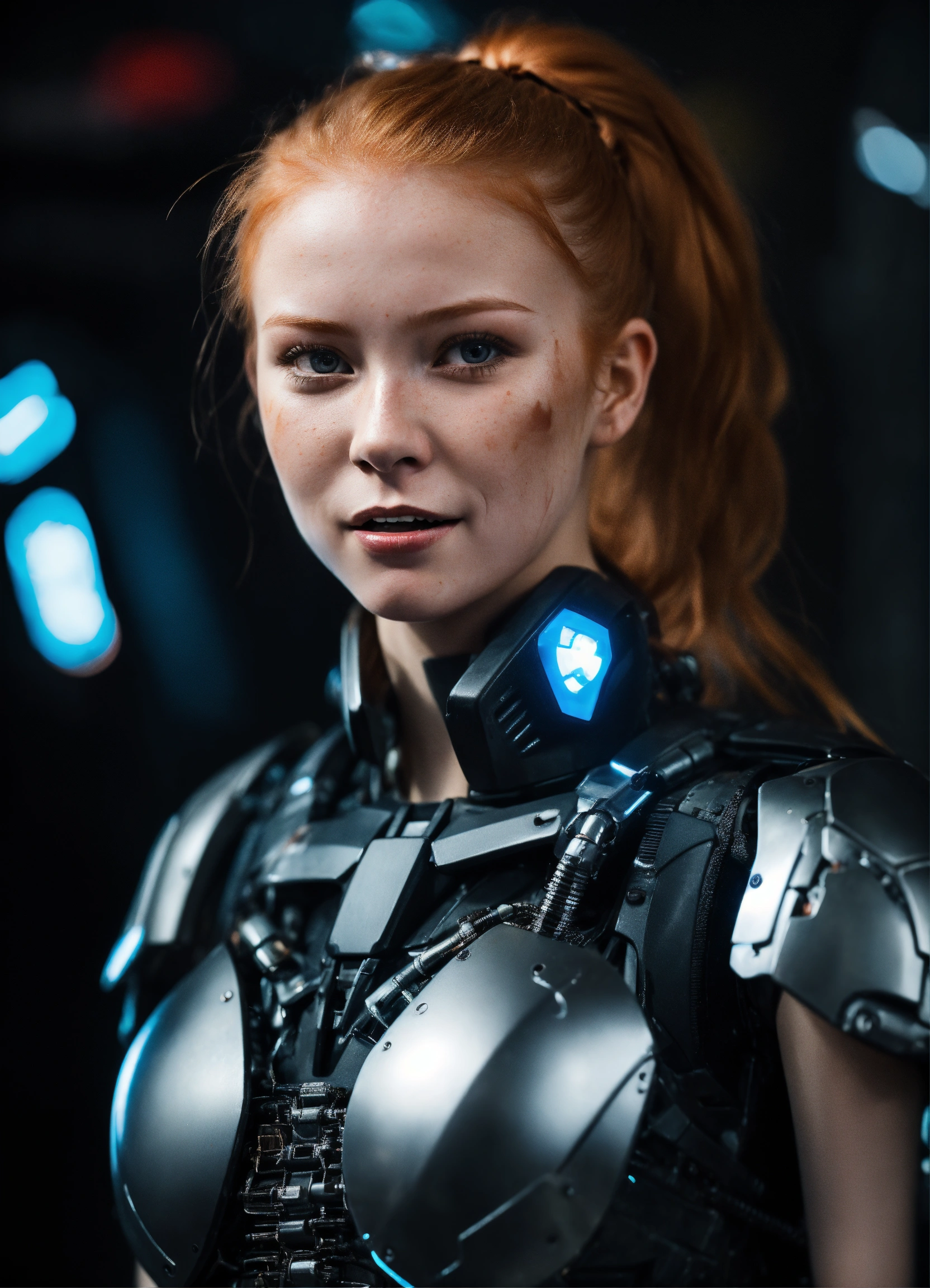 An ultra detailed photo of a 20-year-old ginger girl, with a high short ponytail, with cute traits, with a crazy creepy laugh, battle scars, insane expression, fit strong body, wearing a black robotic armor, with a black background, dramatic illumination, hyperdetailed, hyperrealistic, 8 k.