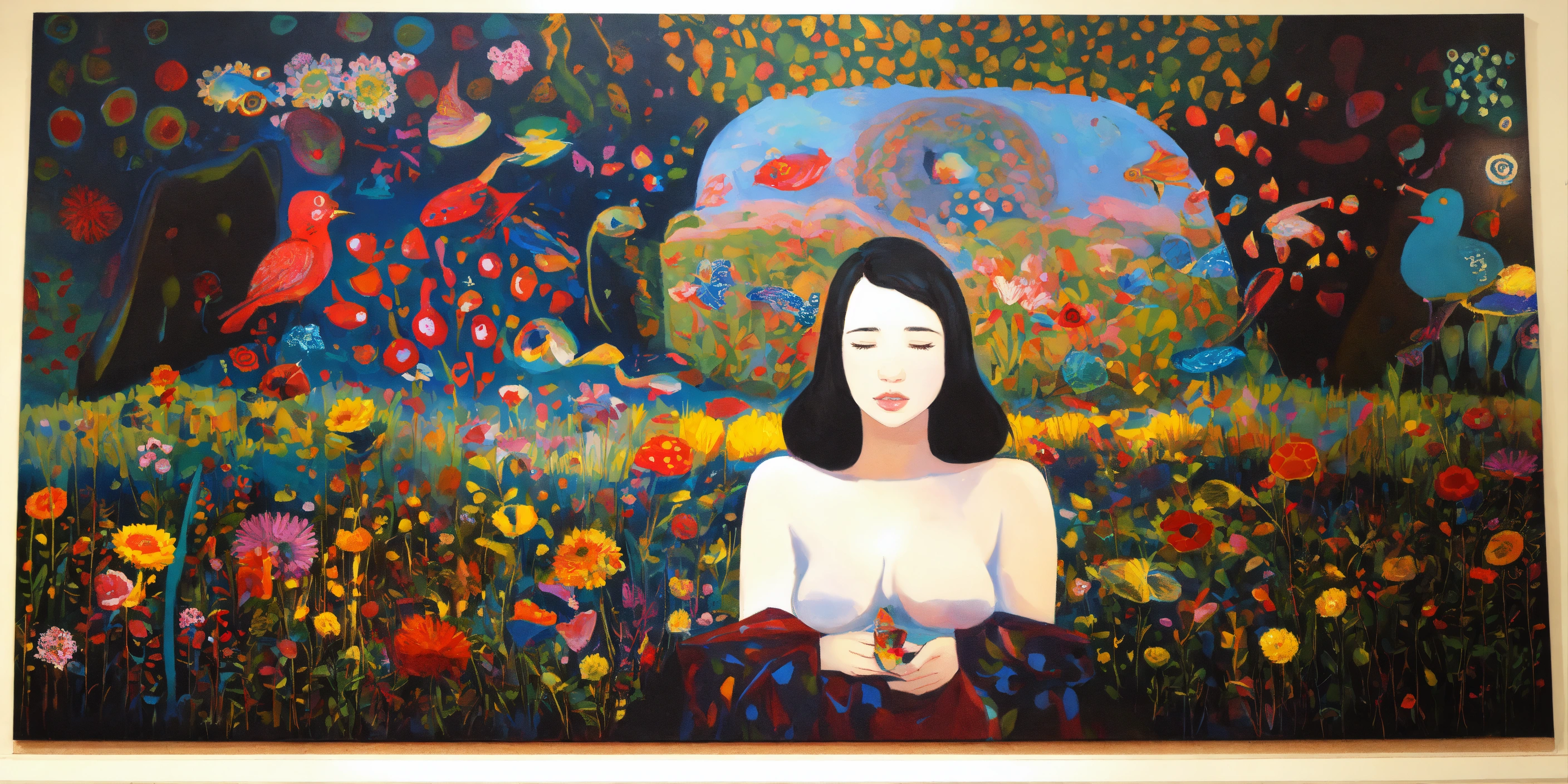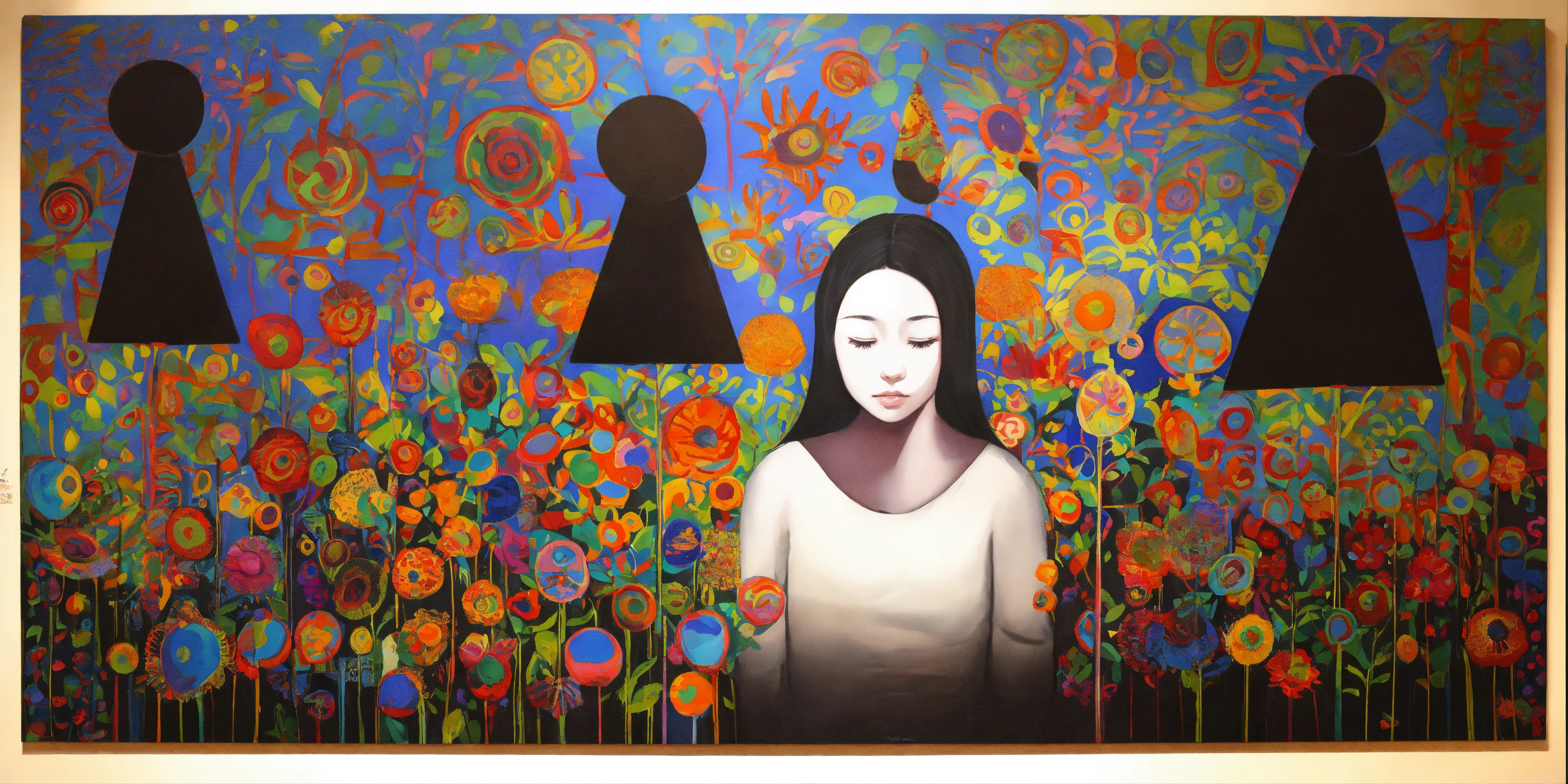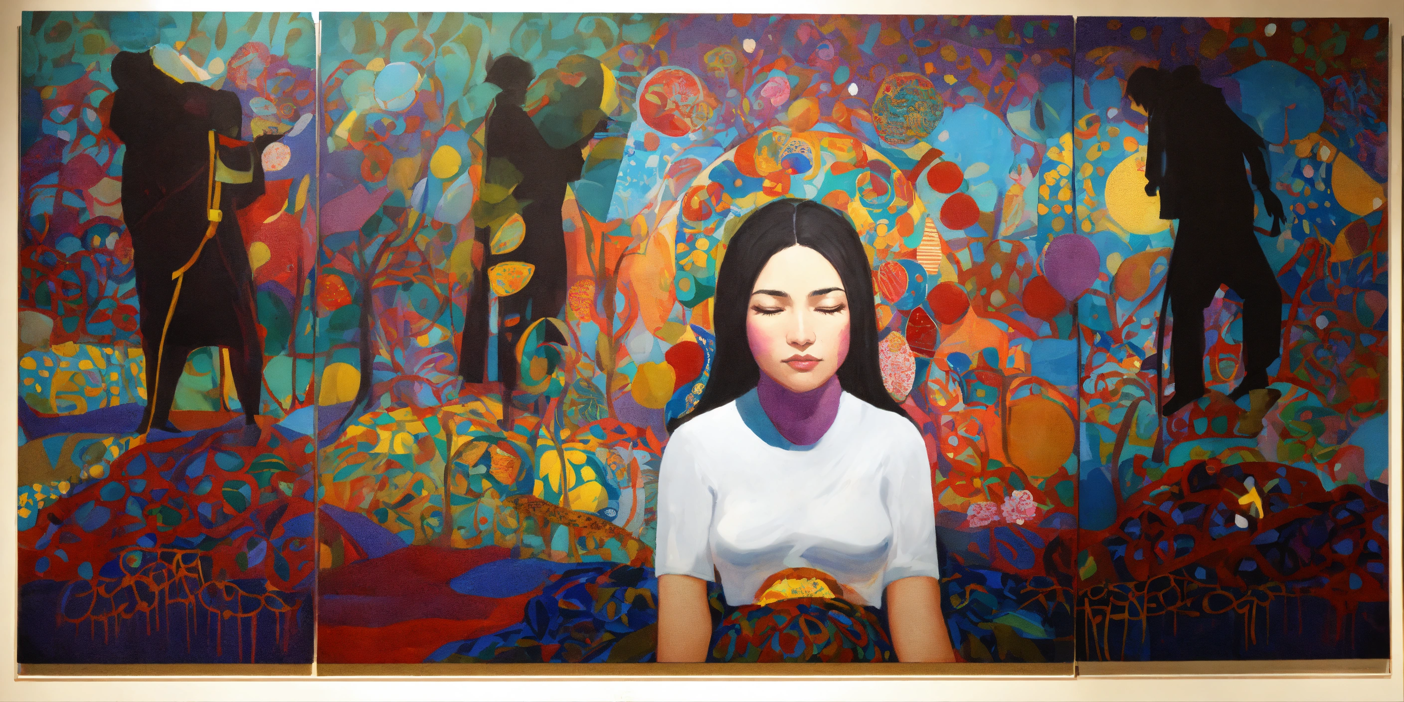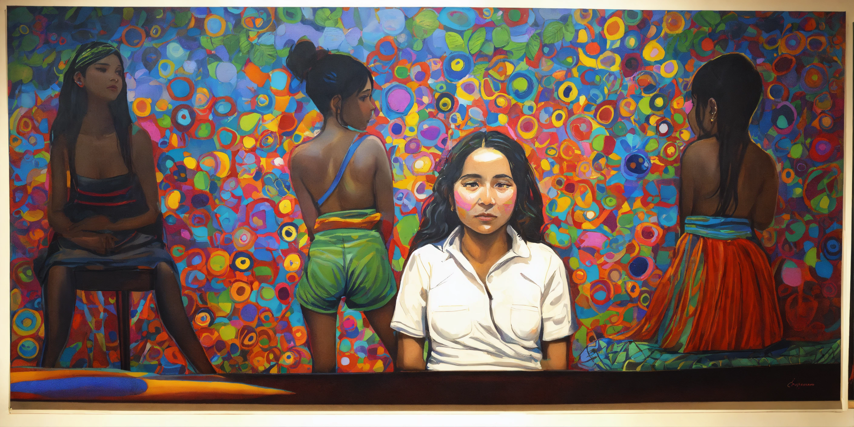 Pintura, de mujeres de distintas etnias o razas, todas estas mujeres comparten una tela o frazada colorida que las protege cubriendoles la espalda, no uses fottografías, quiero pintura, that showcases empathy osea the emotional involvement of a person in a reality outside of their own, usually in the feelings of another person, graffiti. abrazo entre dos mujeres, cariño, altruismo by belkis ayún and yayoi kusama style