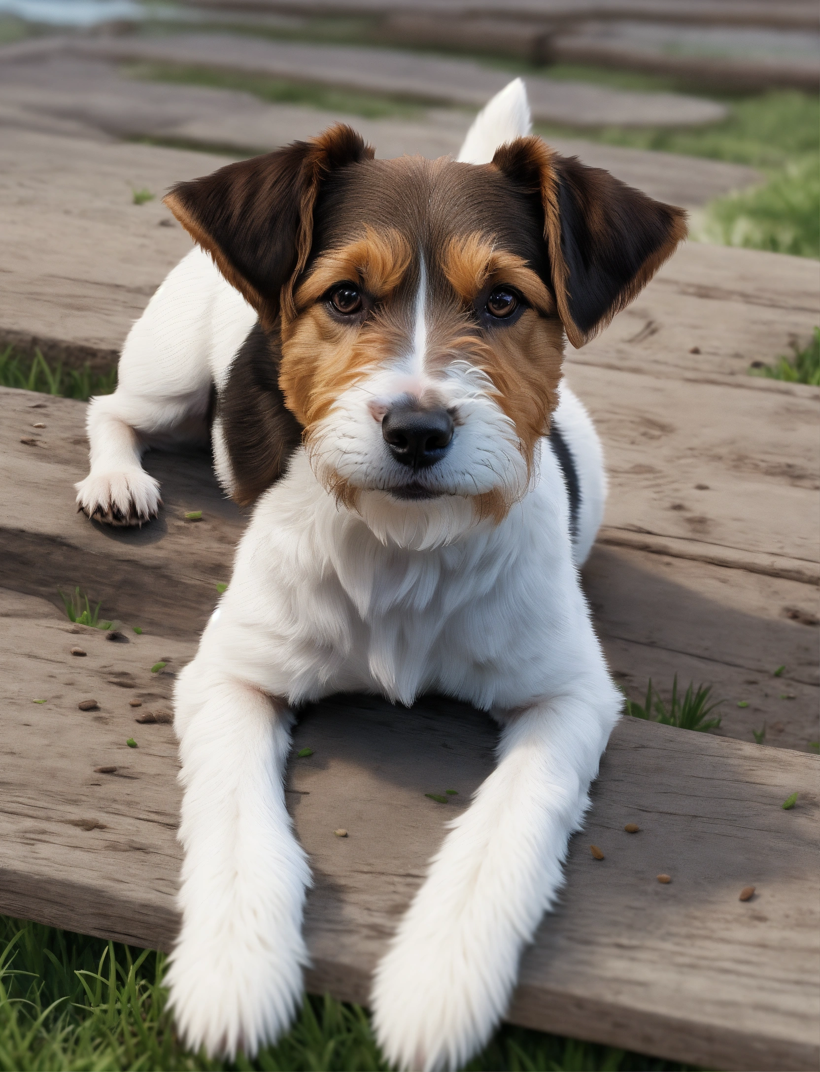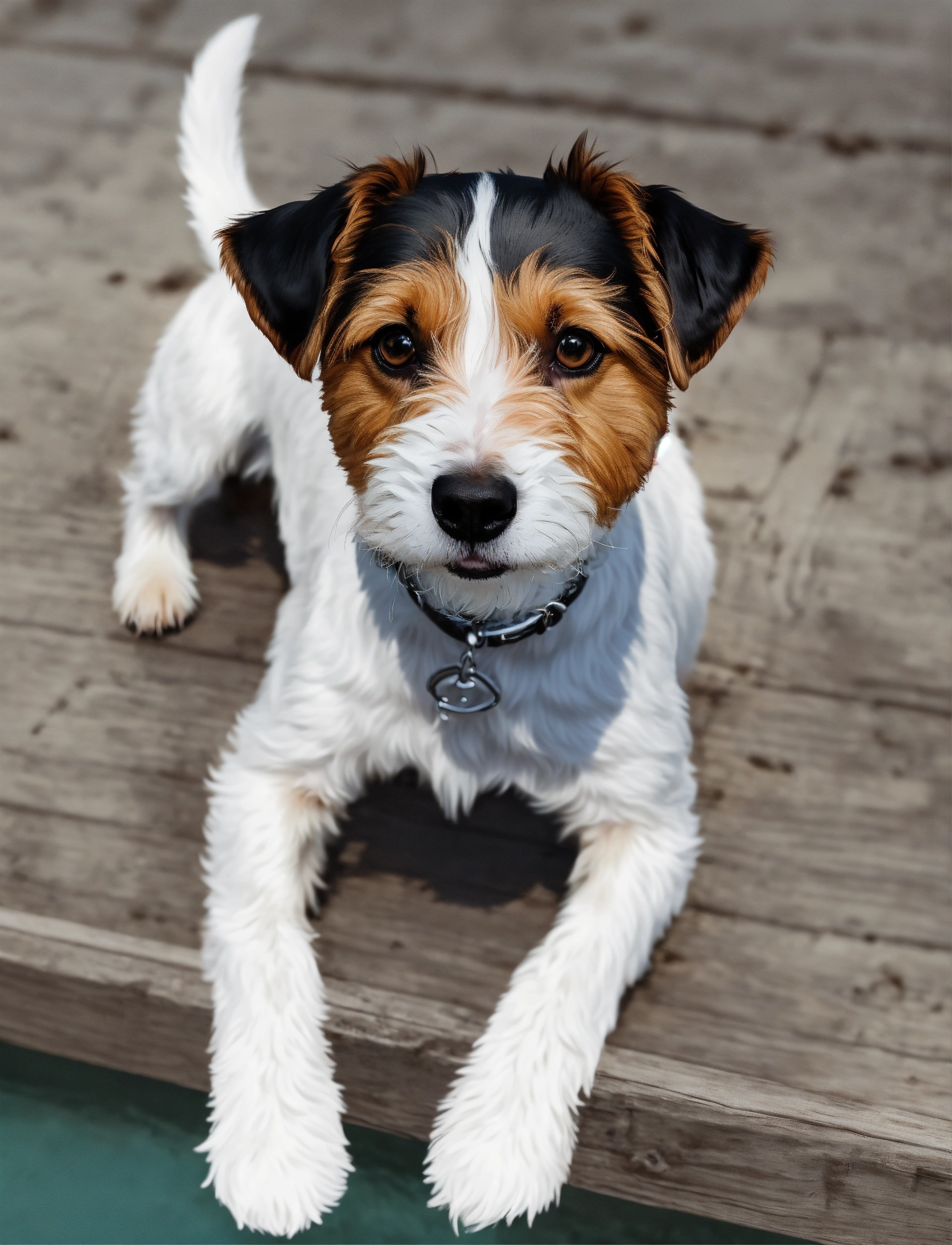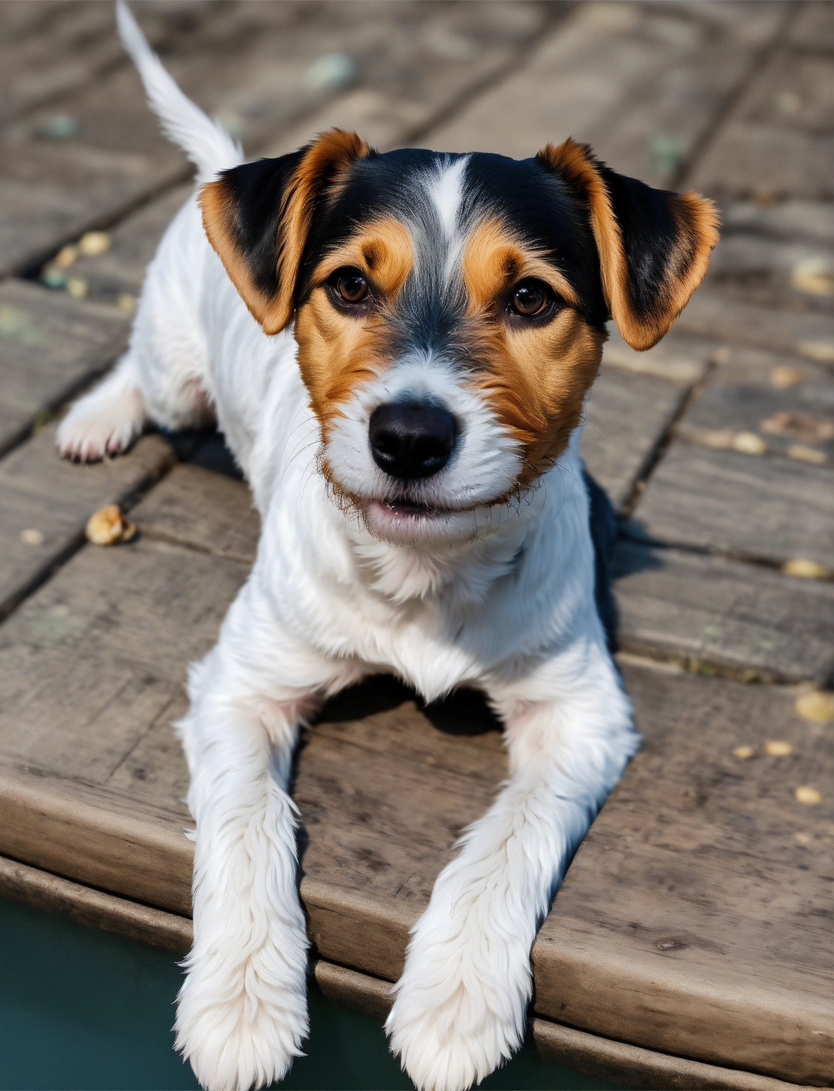 Craft a full body image in the distance with free white space, of a smiling happy looking short haired small parson russell terrier dog, capturing its adorable features and the main character's presence. use a pixar-style illustration to make the scene heartwarming., ultra hd, realistic, vivid colors, highly detailed, uhd drawing, pen and ink, perfect composition, beautiful detailed intricate insanely detailed octane render trending on artstation, 8k artistic photography, photorealistic concept art, soft natural volumetric cinematic perfect light. transparent background. cartoon. on wharf, sea in background. blurred edges