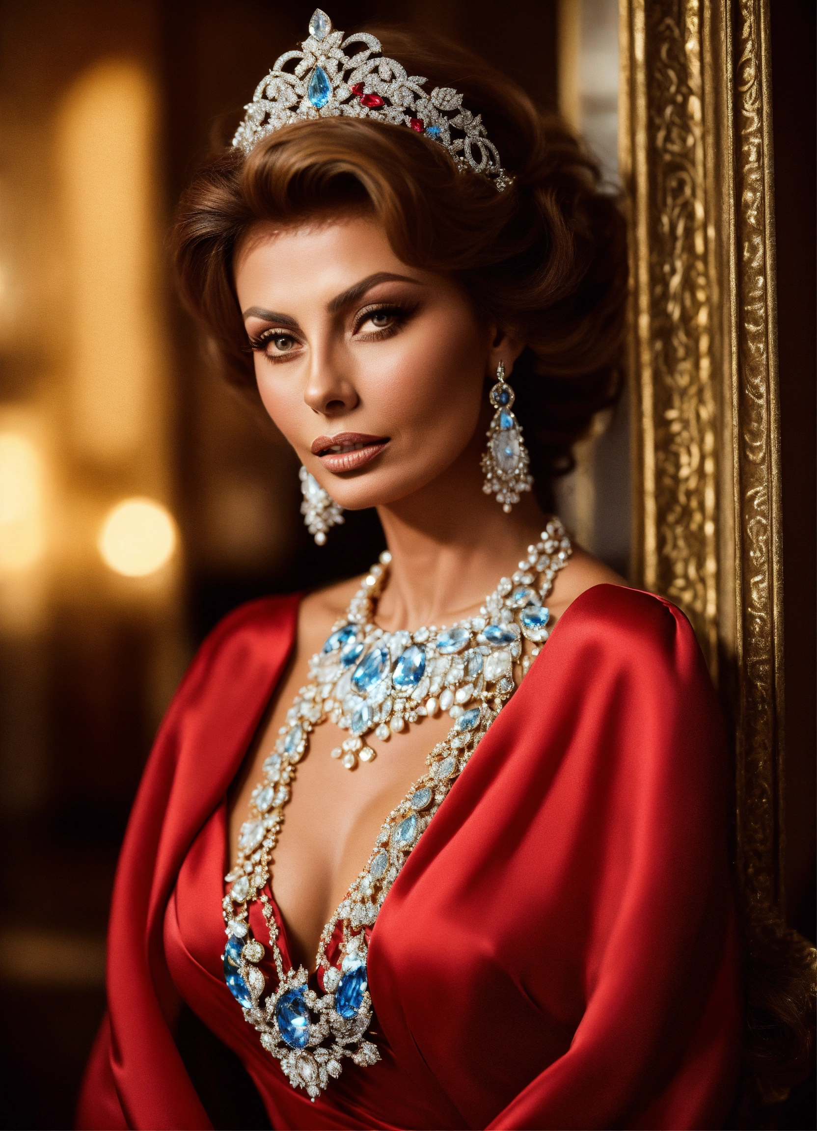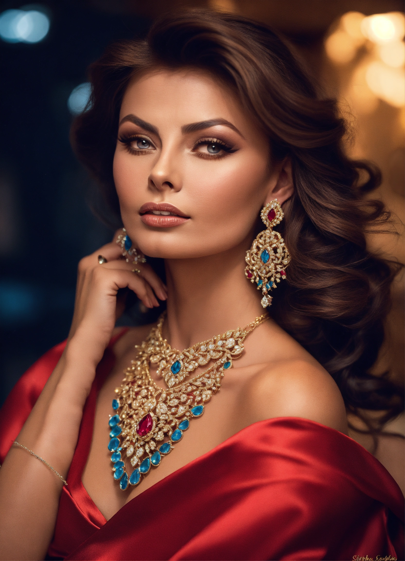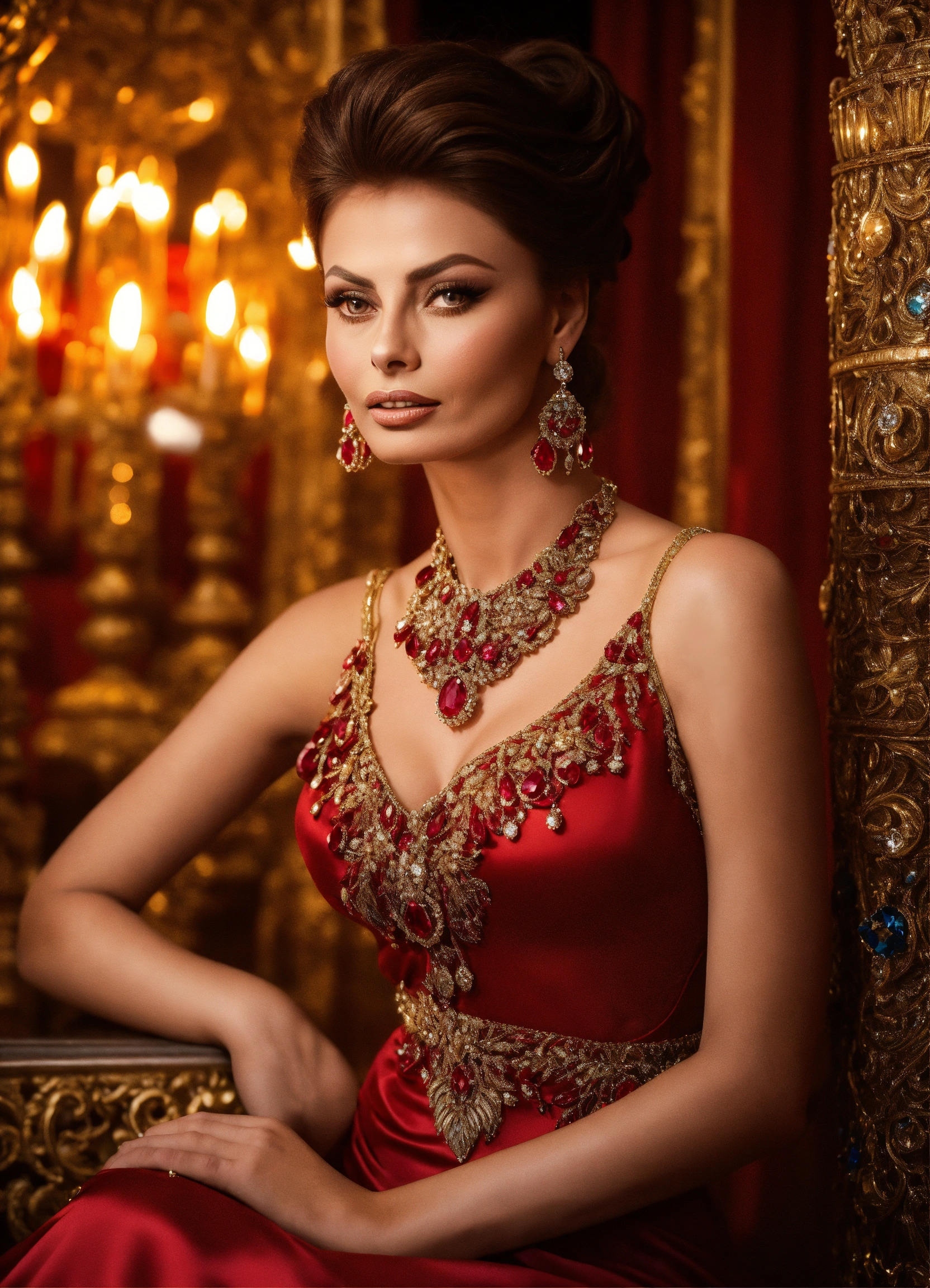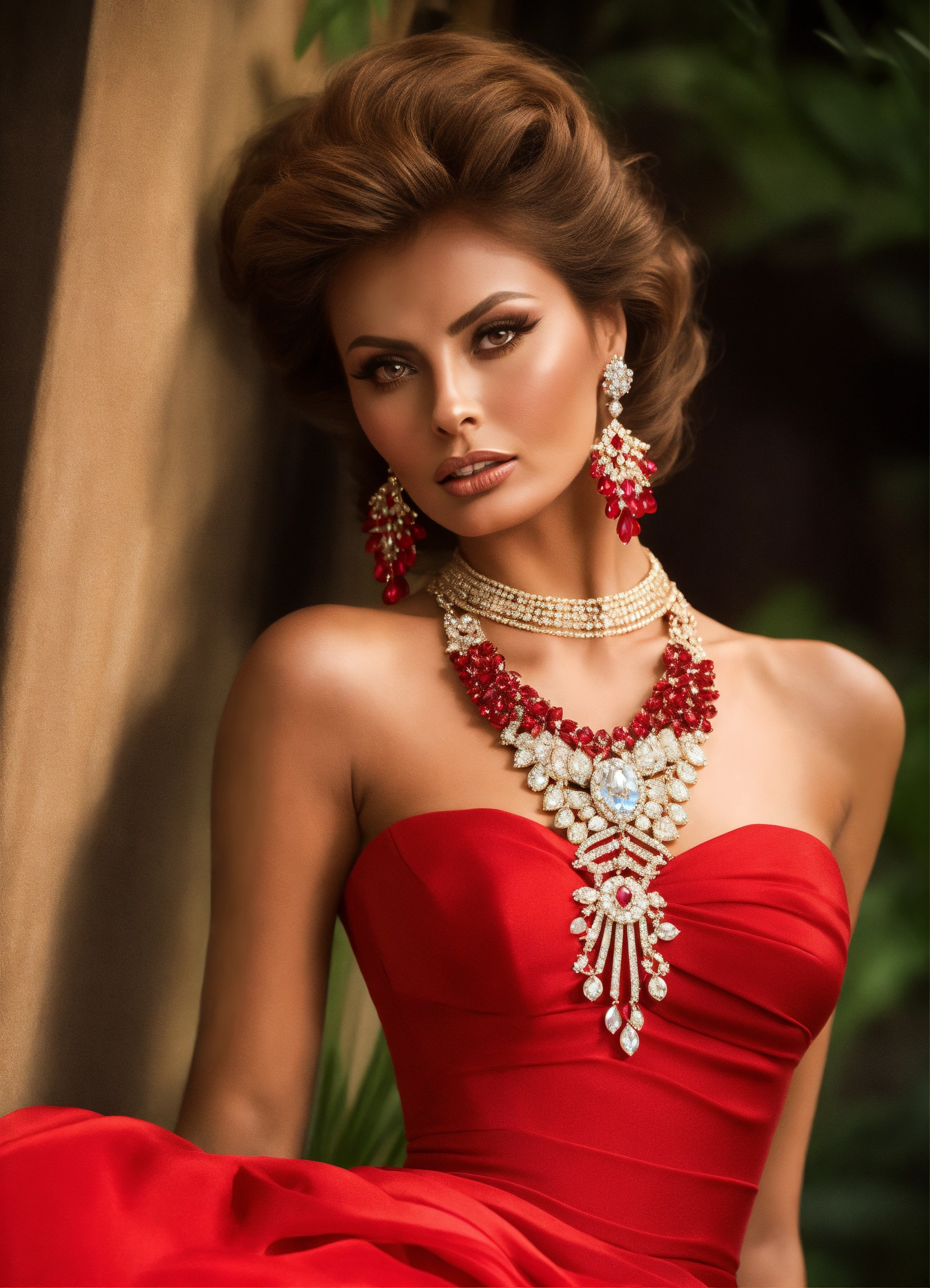 Full body fashion model, xl size, ruby and diamond necklace and earring, ladylike, ultra realistic, attractive eyes, sophia loren and cinderella face, chic necklace, luxurious diamond and ruby set, wind on hair style, high volume hair, prom dress, chic night dress, beautiful legs, cleopatra style, hour glass body, attractive mesmerizing eyes, high volume turso, soft skin, modeling pose, fiery red