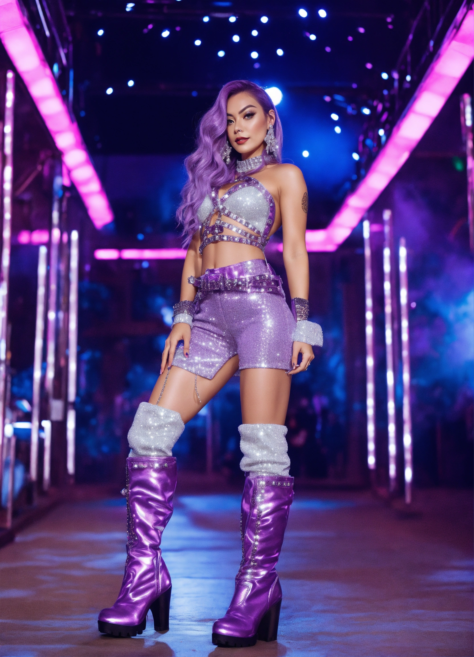 Jiu glamorous sparkly diamond studded lilac and silver alternative outfit with high boots