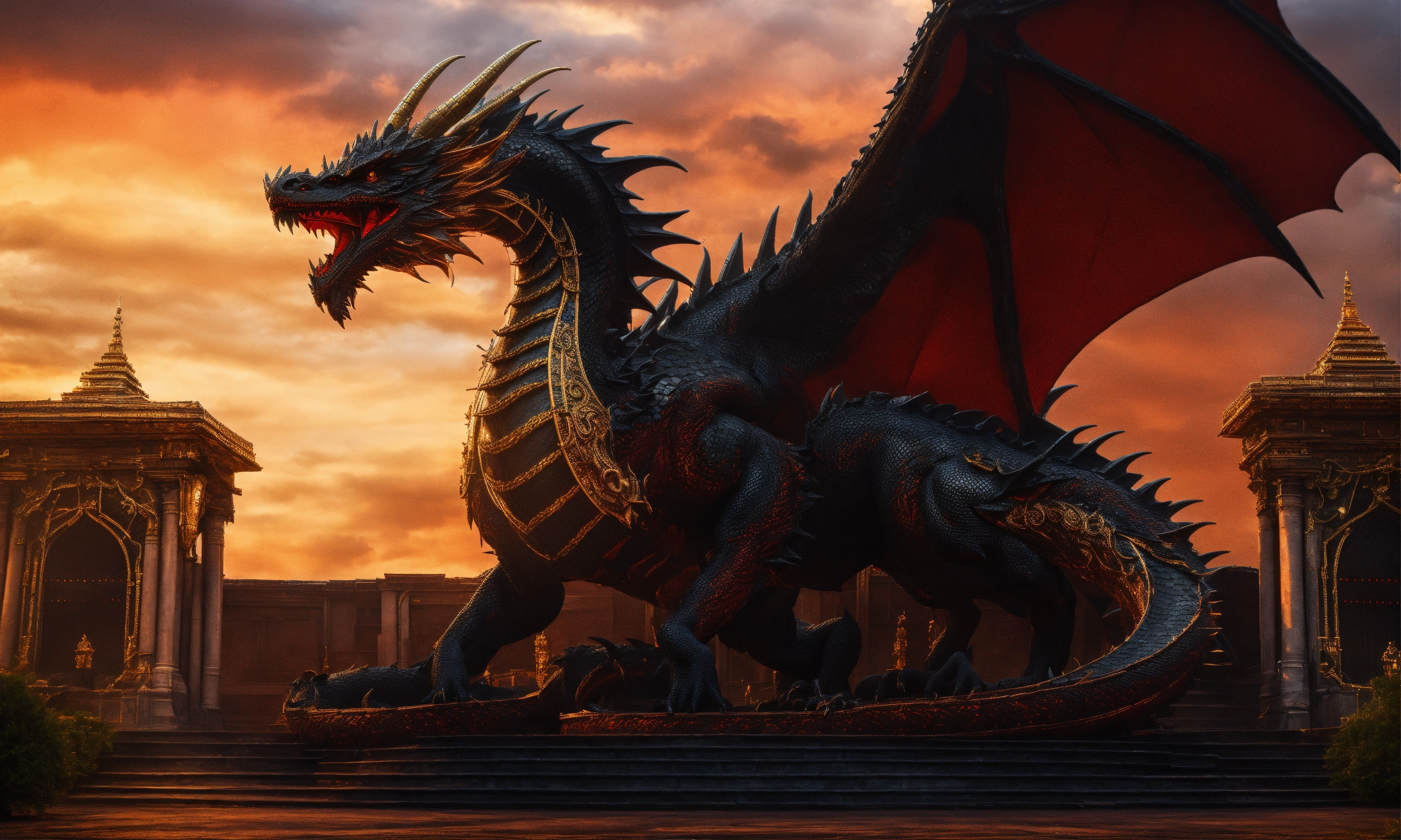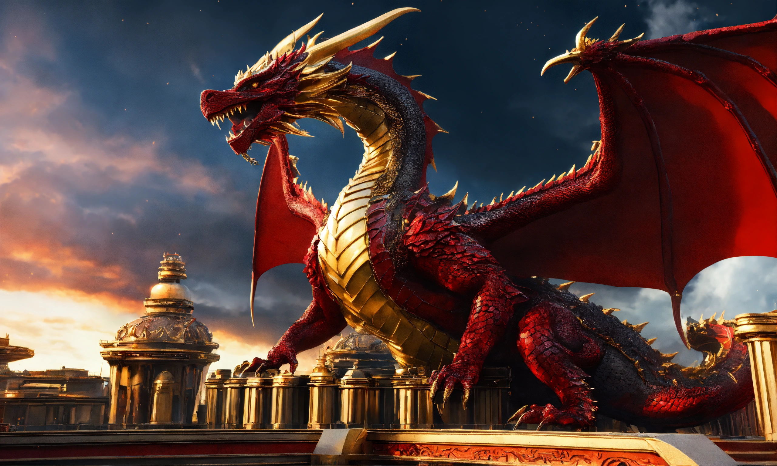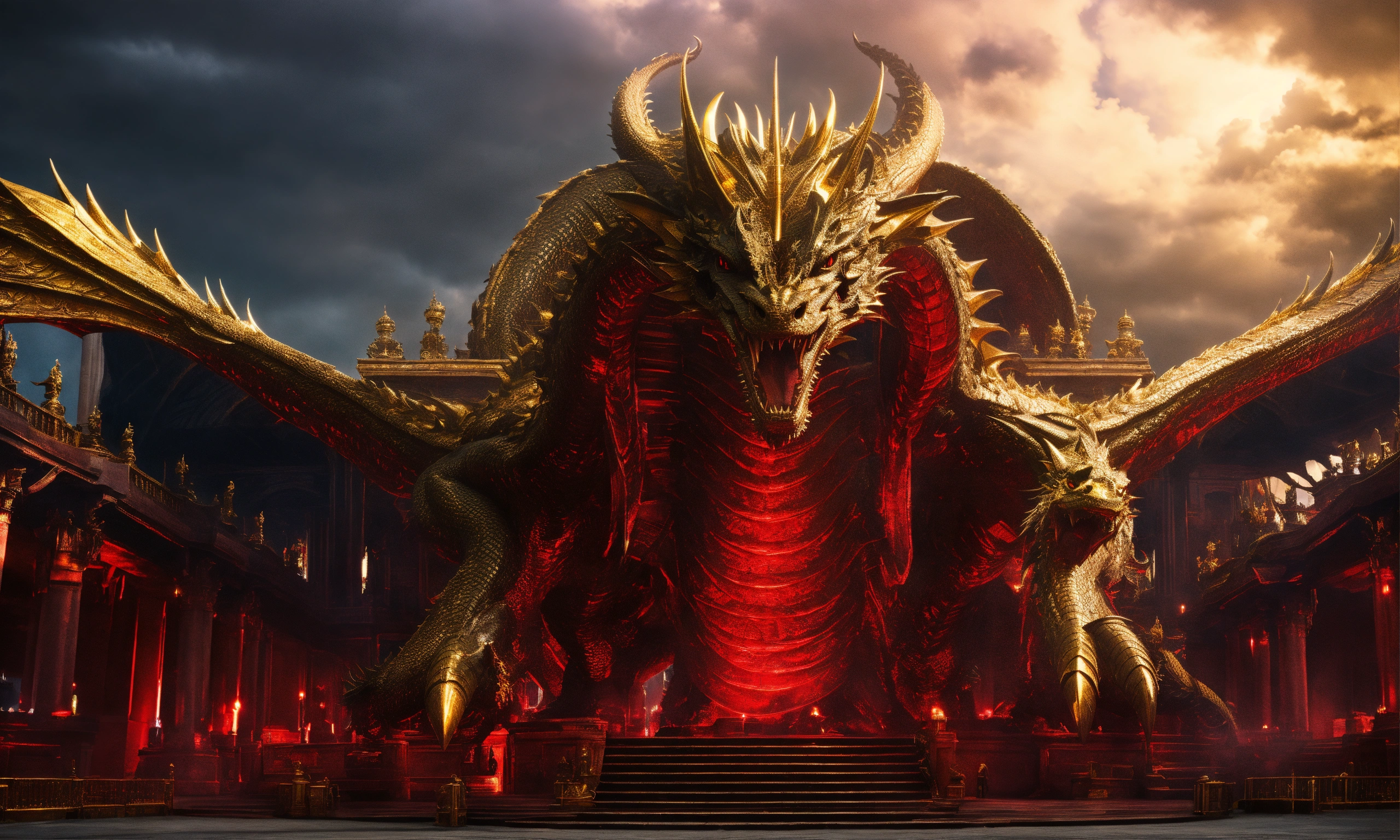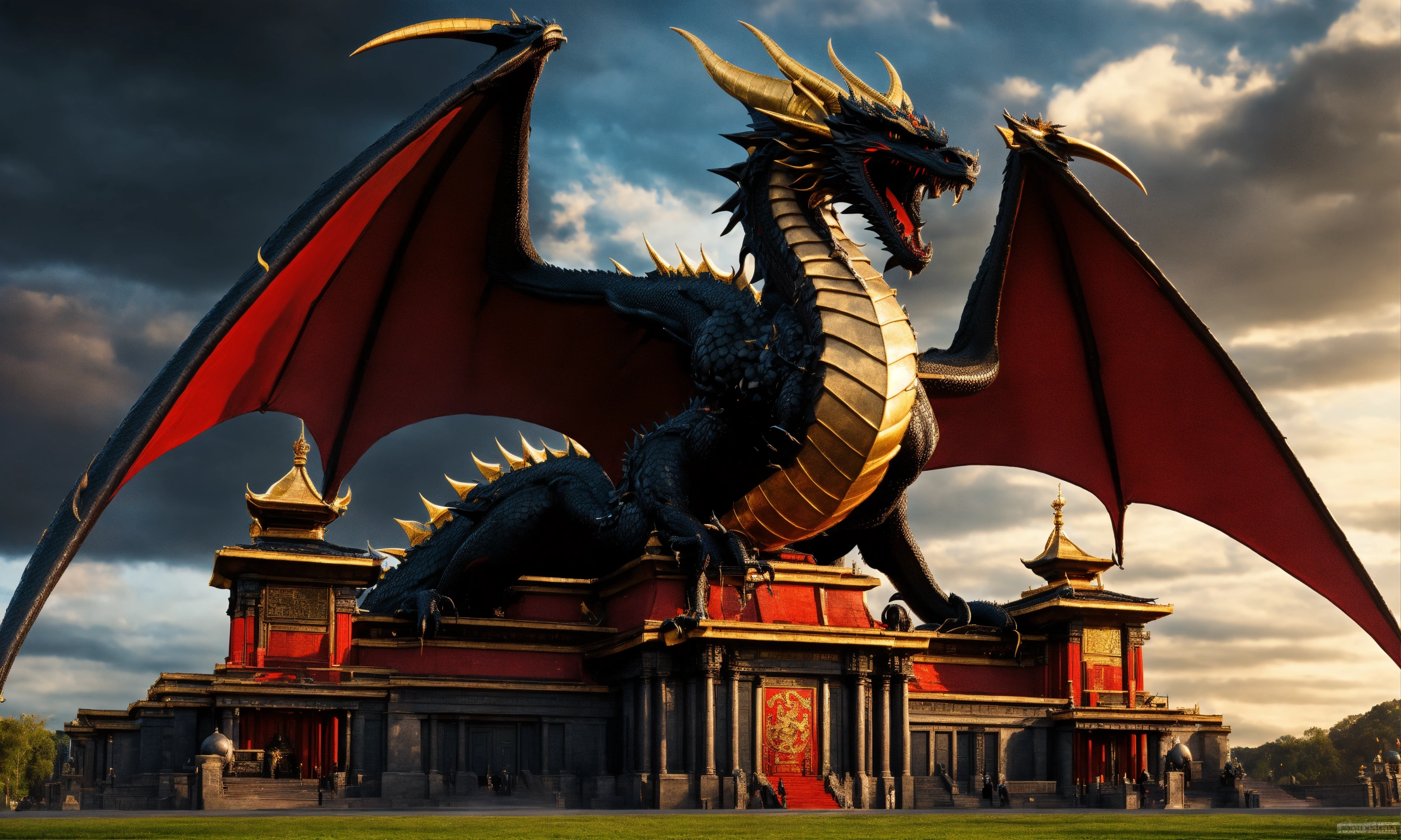 Massive highly detailed red and gold sci fi palace, large black dragon statue out front on the grounds, ultra detailed, realistic, hd, evil, dramatic sky