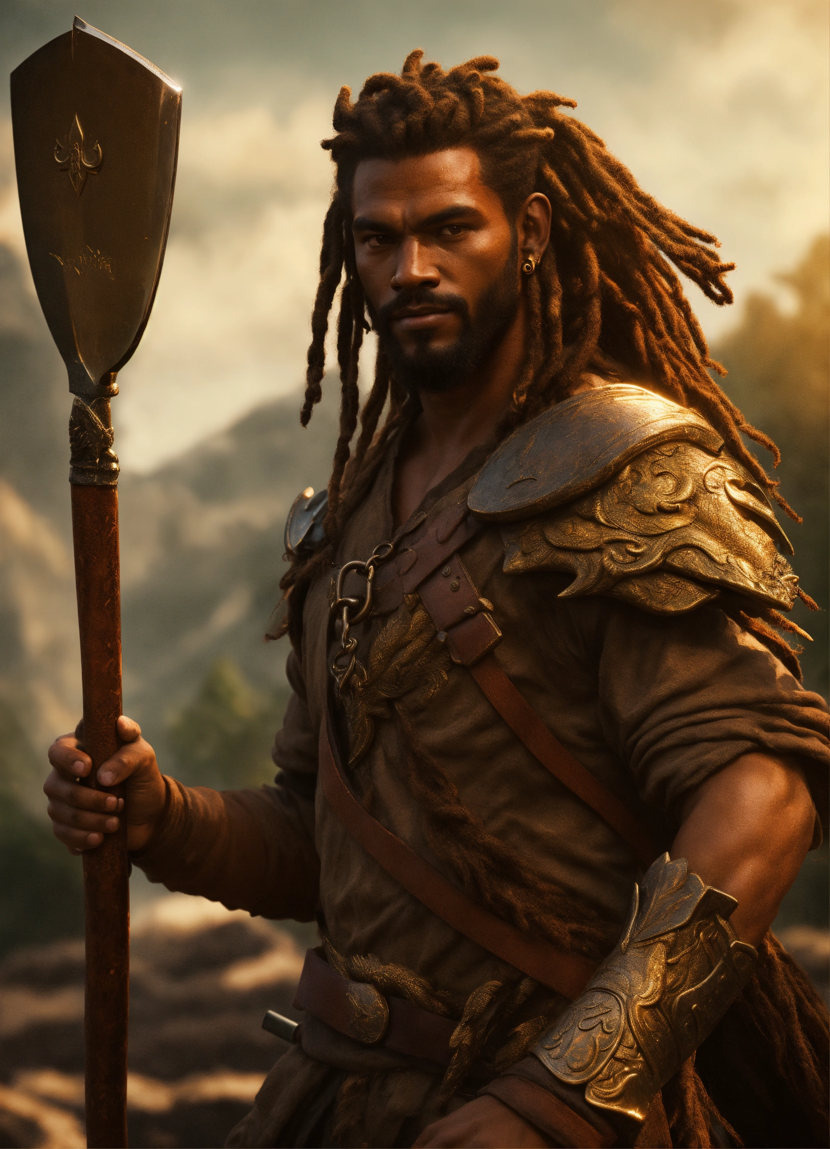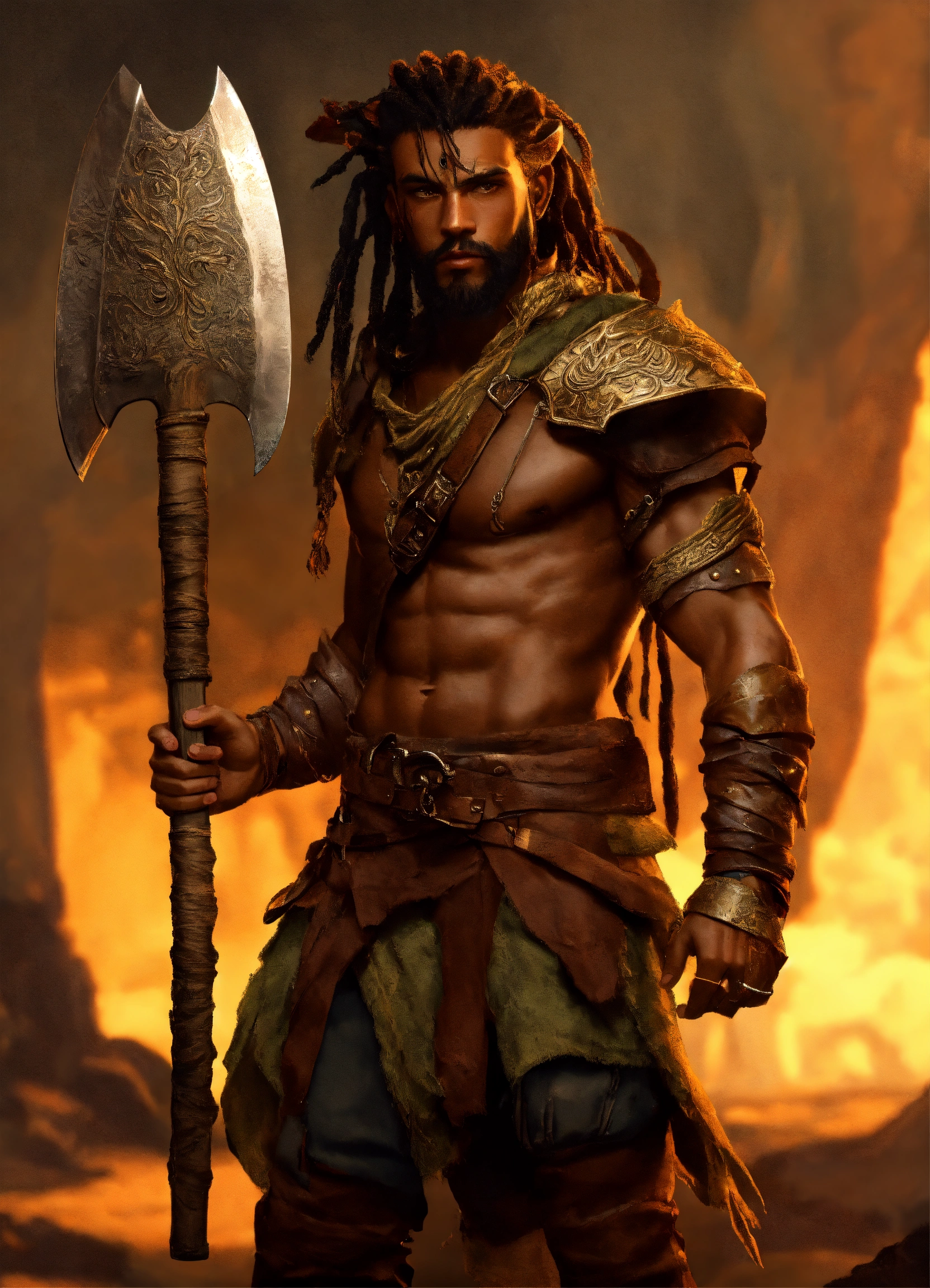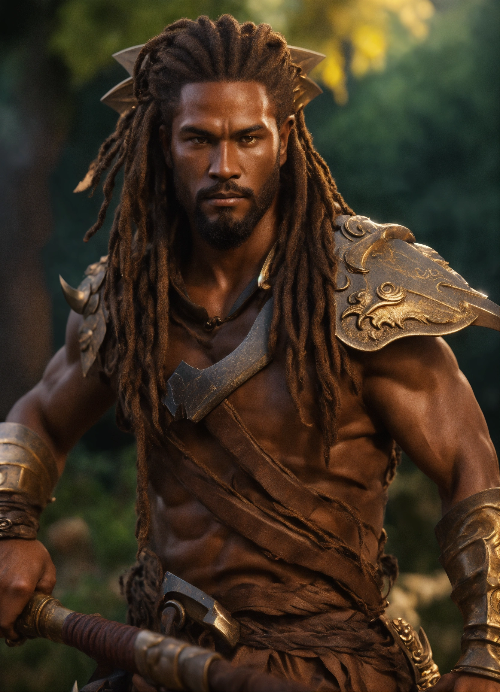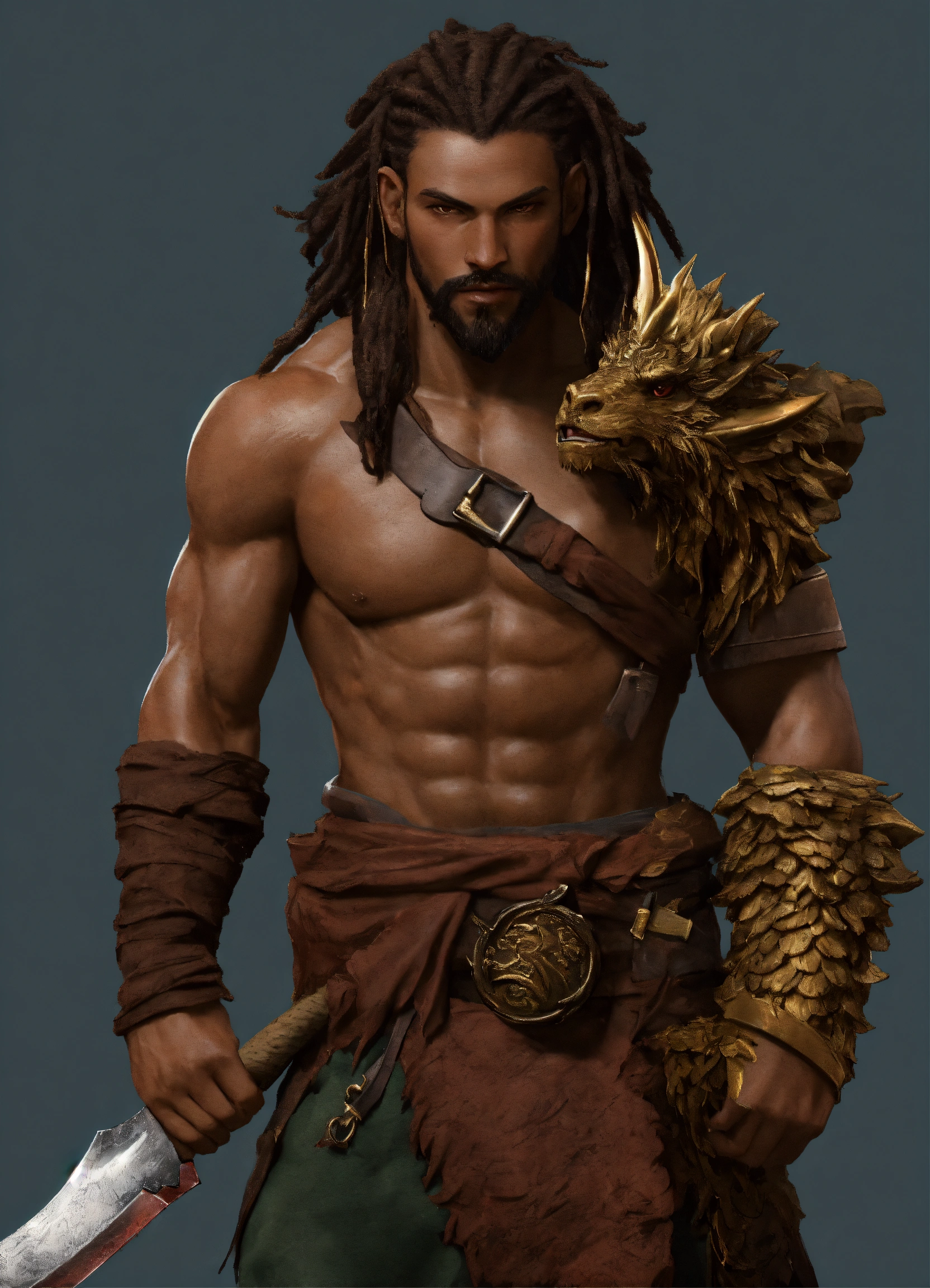 A half dragon half human man, he has brown dreadlocks, he is bronze in colour, he is carrying a cleaver the size of an axe, 4k realistic fantasy