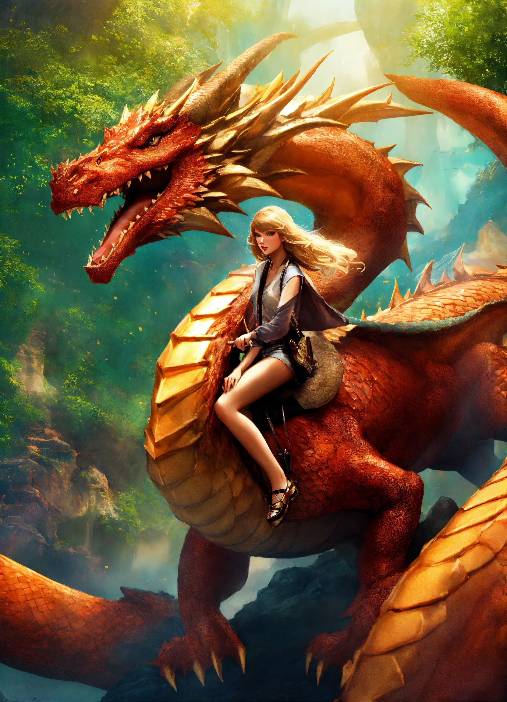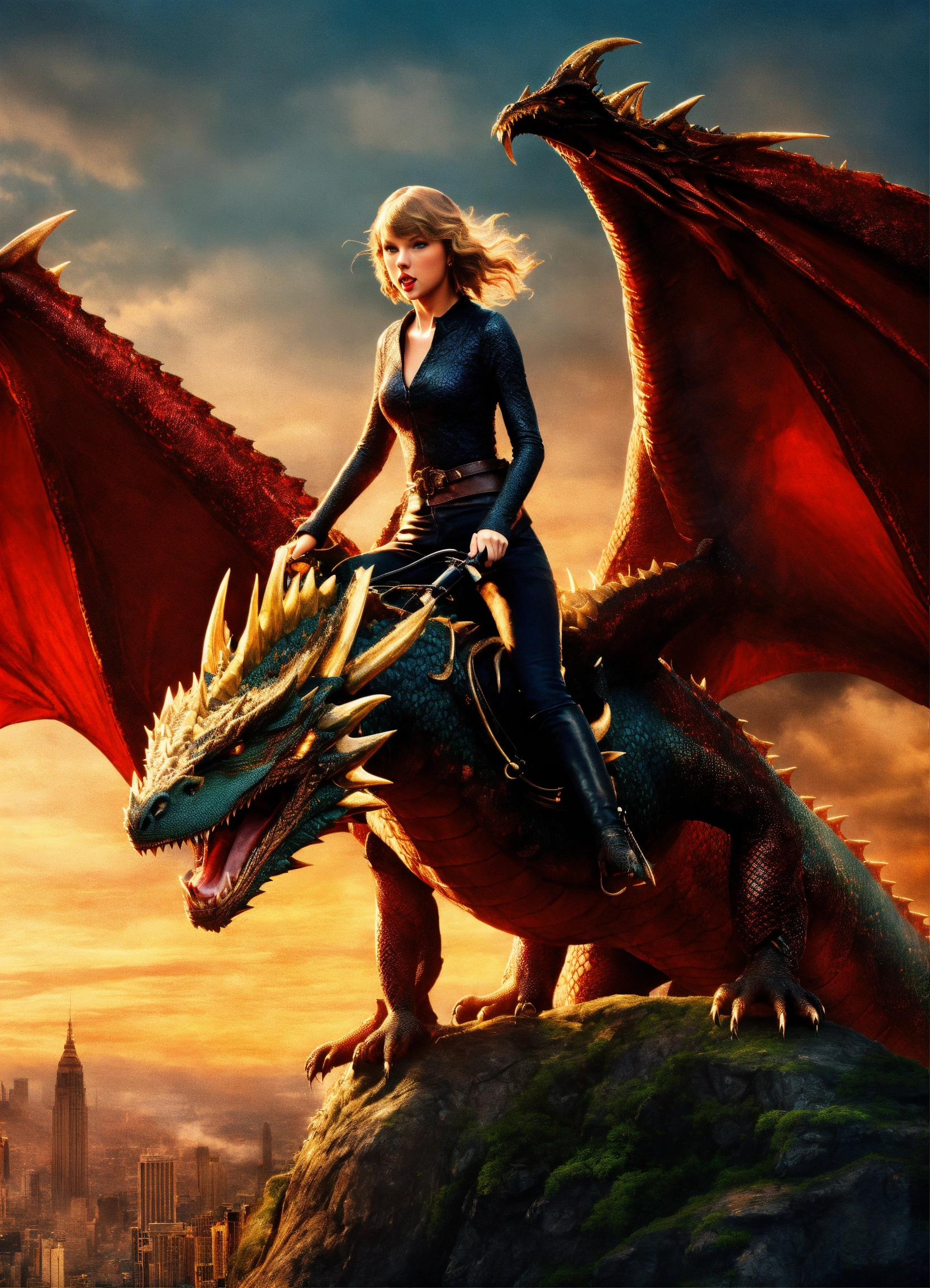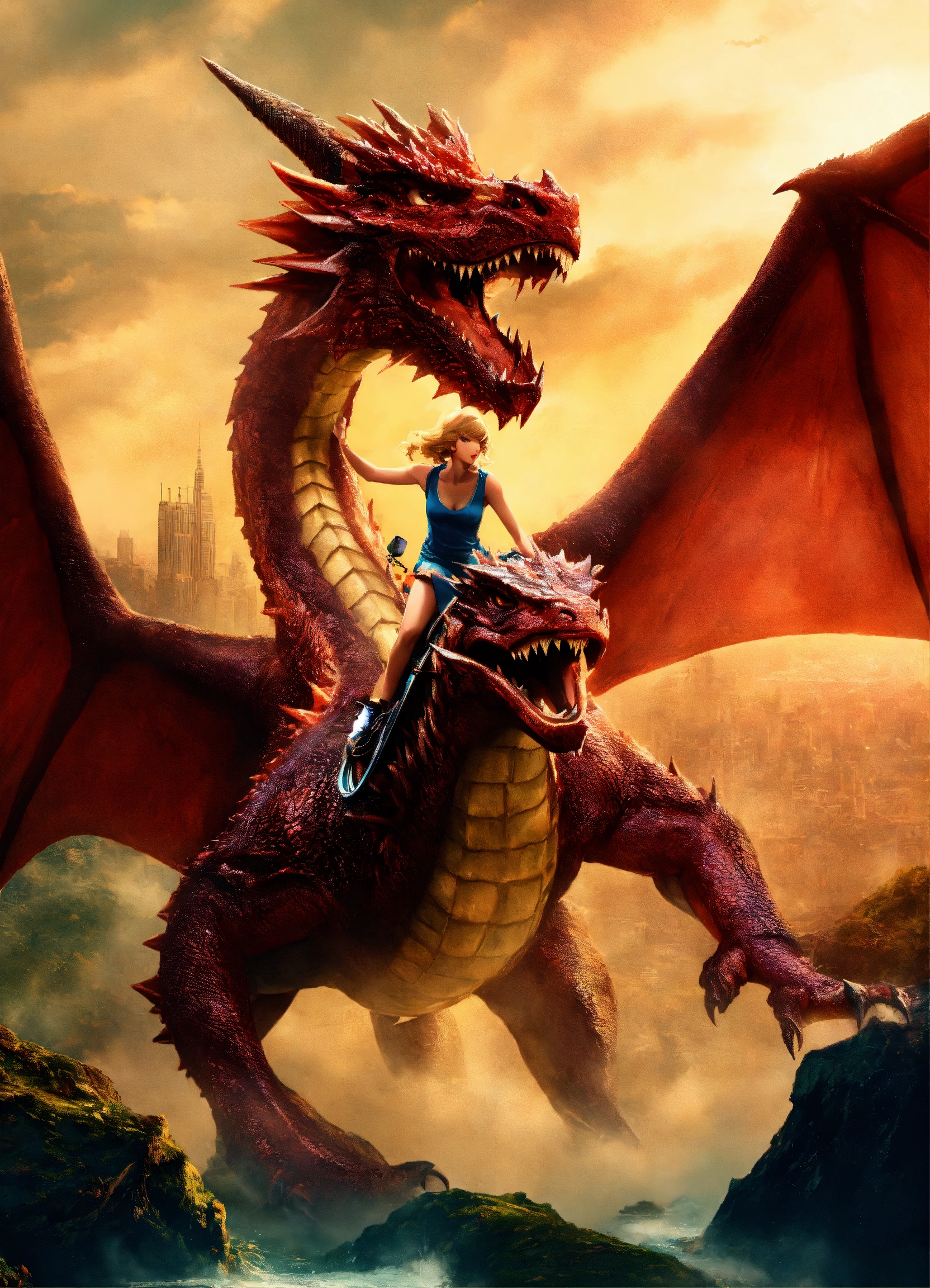 Taylor swift ridding a giant dragon