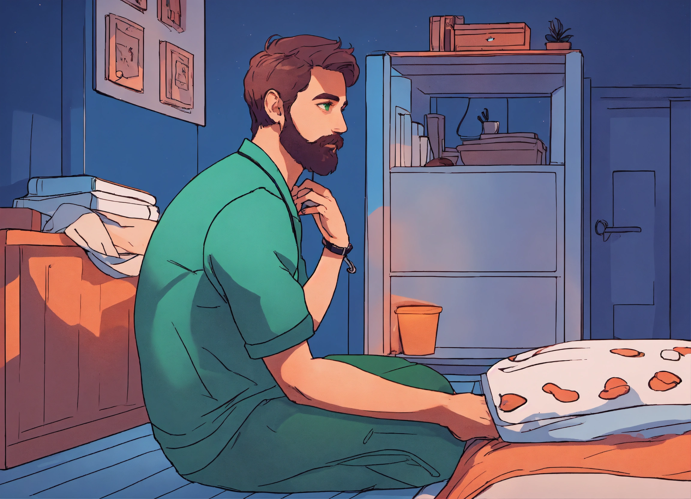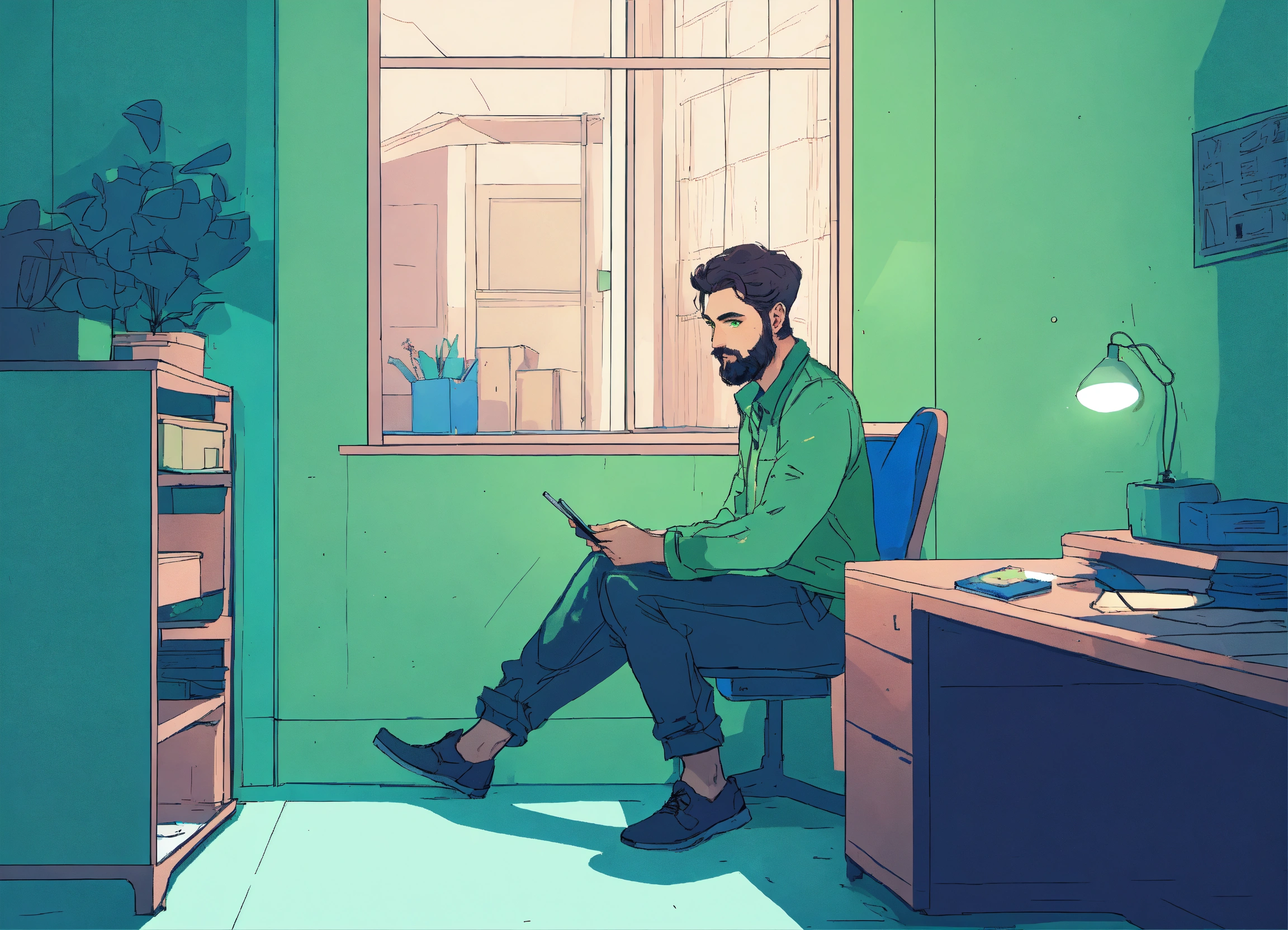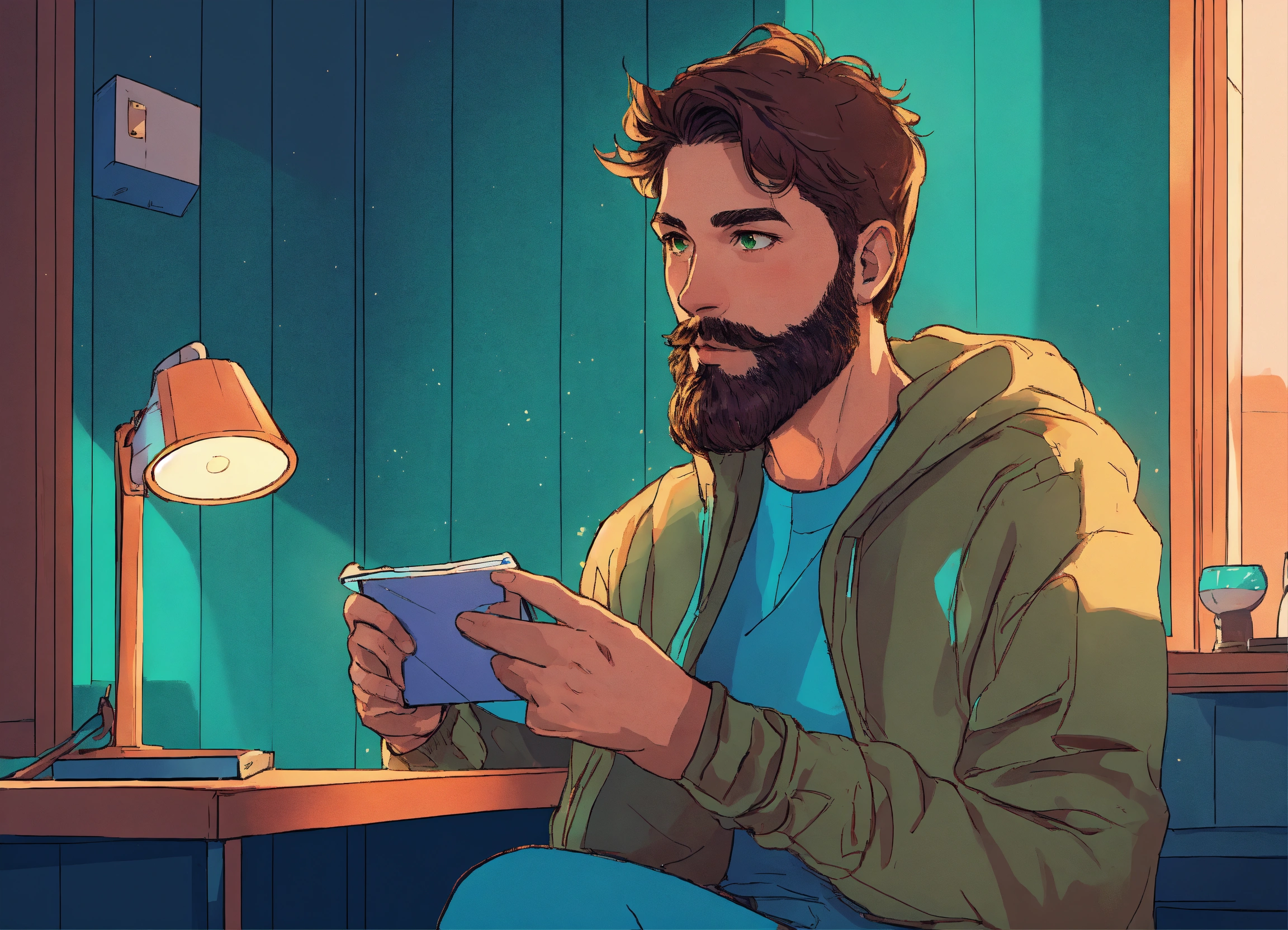 An illustration style where man with green eyes and sparse light thin facial hair is hiding box in a hand, show him sitting in his room with blue walls