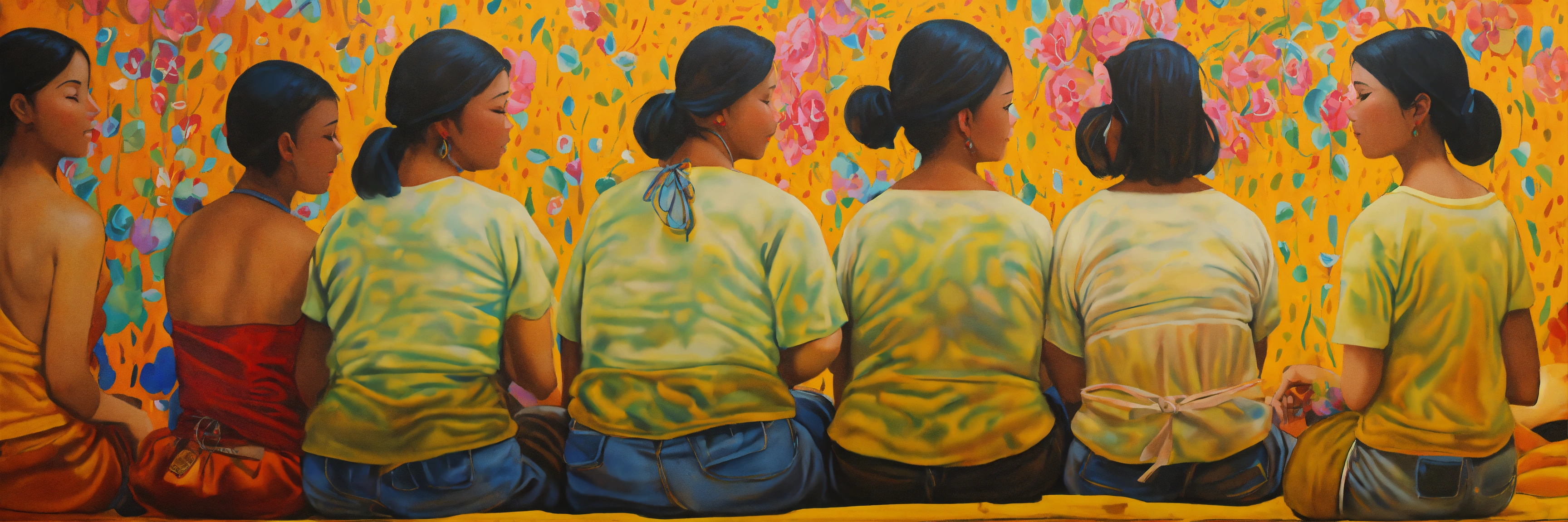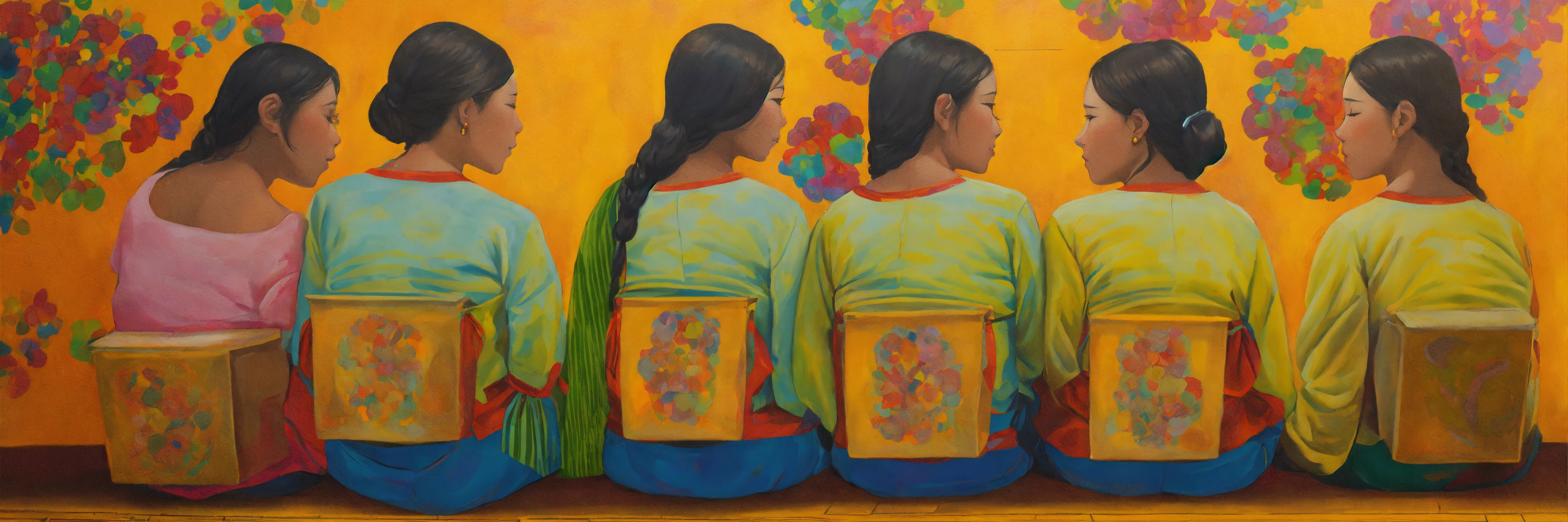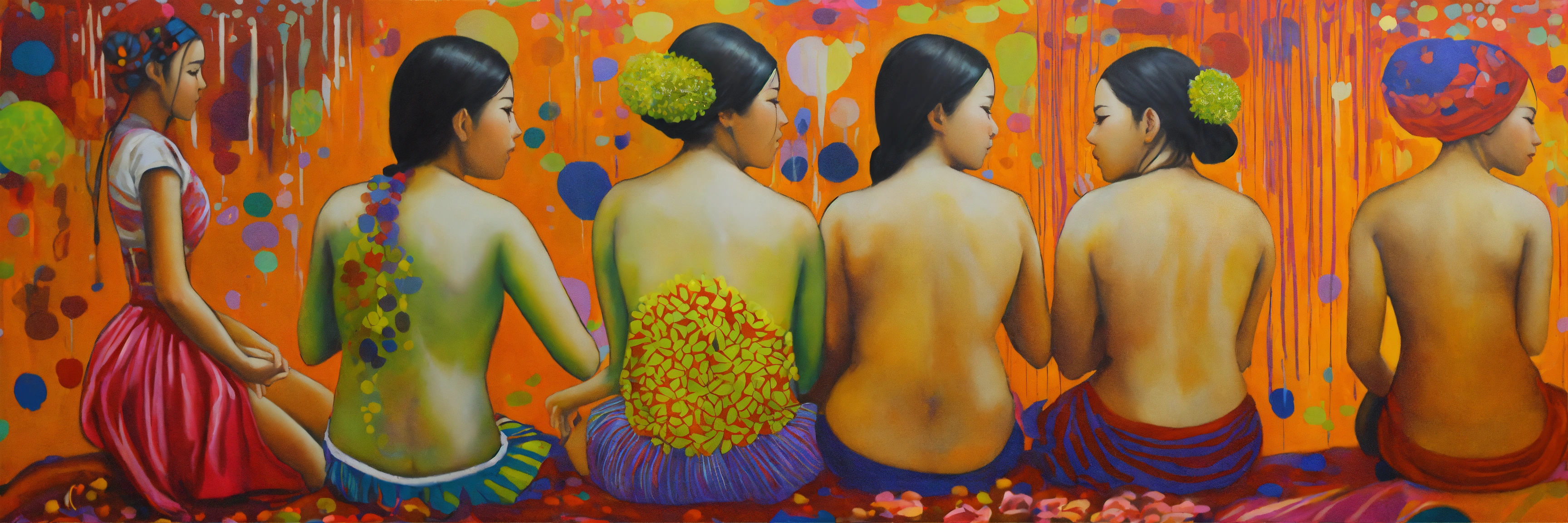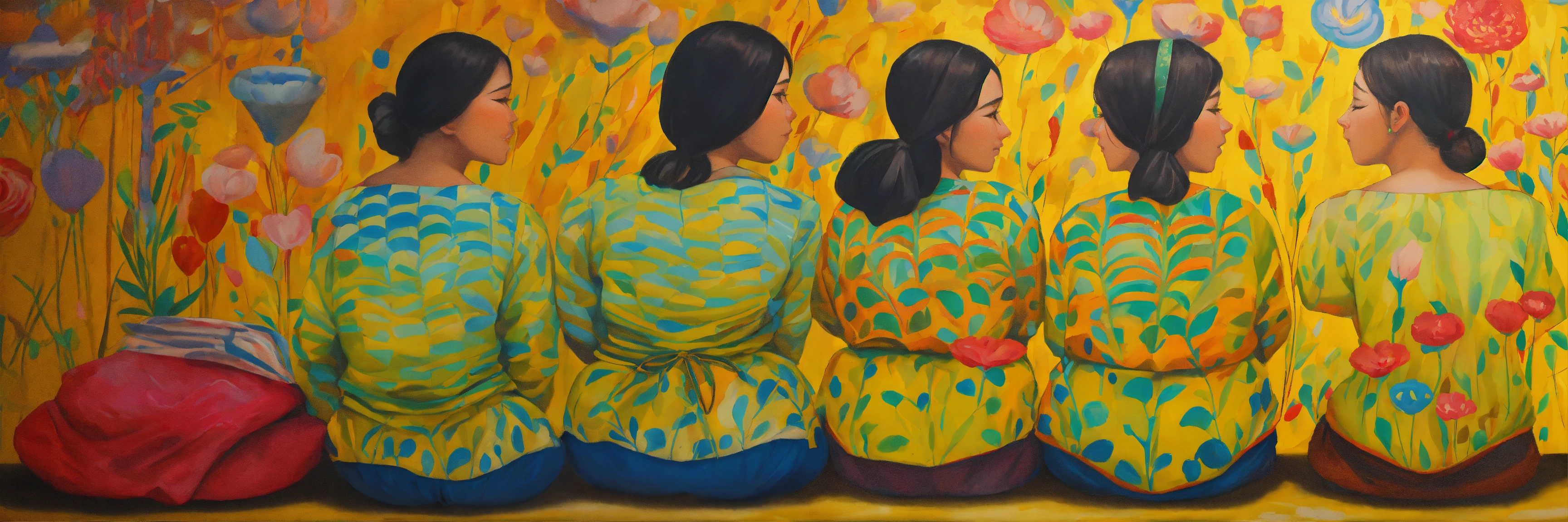 Pintura, de mujeres de distintas etnias o razas, todas estas mujeres comparten una tela o frazada colorida que las protege cubriendoles la espalda, no uses fottografías, quiero pintura, that showcases empathy osea the emotional involvement of a person in a reality outside of their own, usually in the feelings of another person, graffiti. abrazo entre dos mujeres, cariño, altruismo, ai weiwei style. by belkis ayún and yayoi kusama
