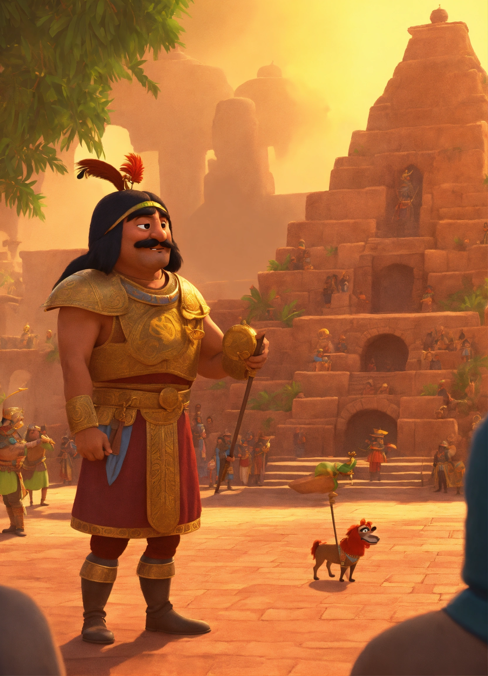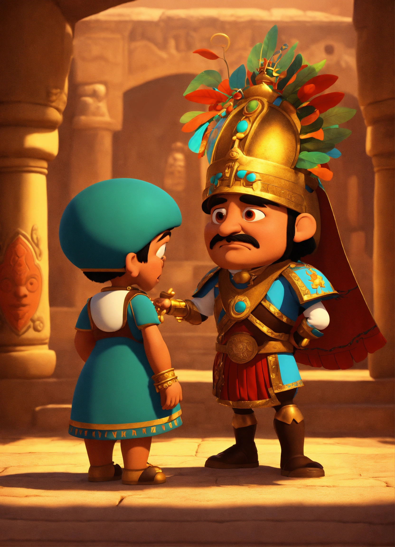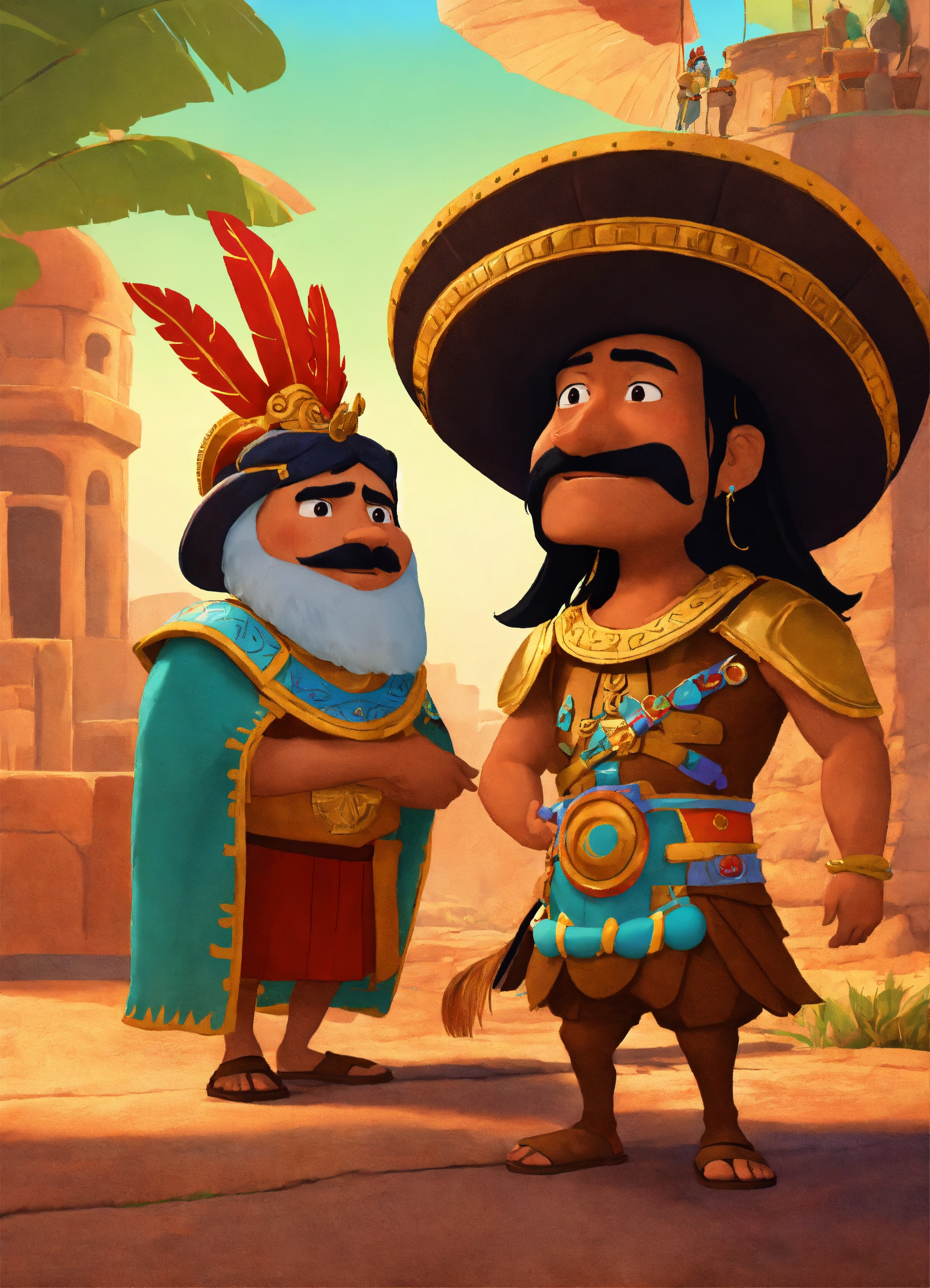 Pixar animation of a sanish conquistador meeting moctezuma the emperor of the aztecs, pixar style cartoon