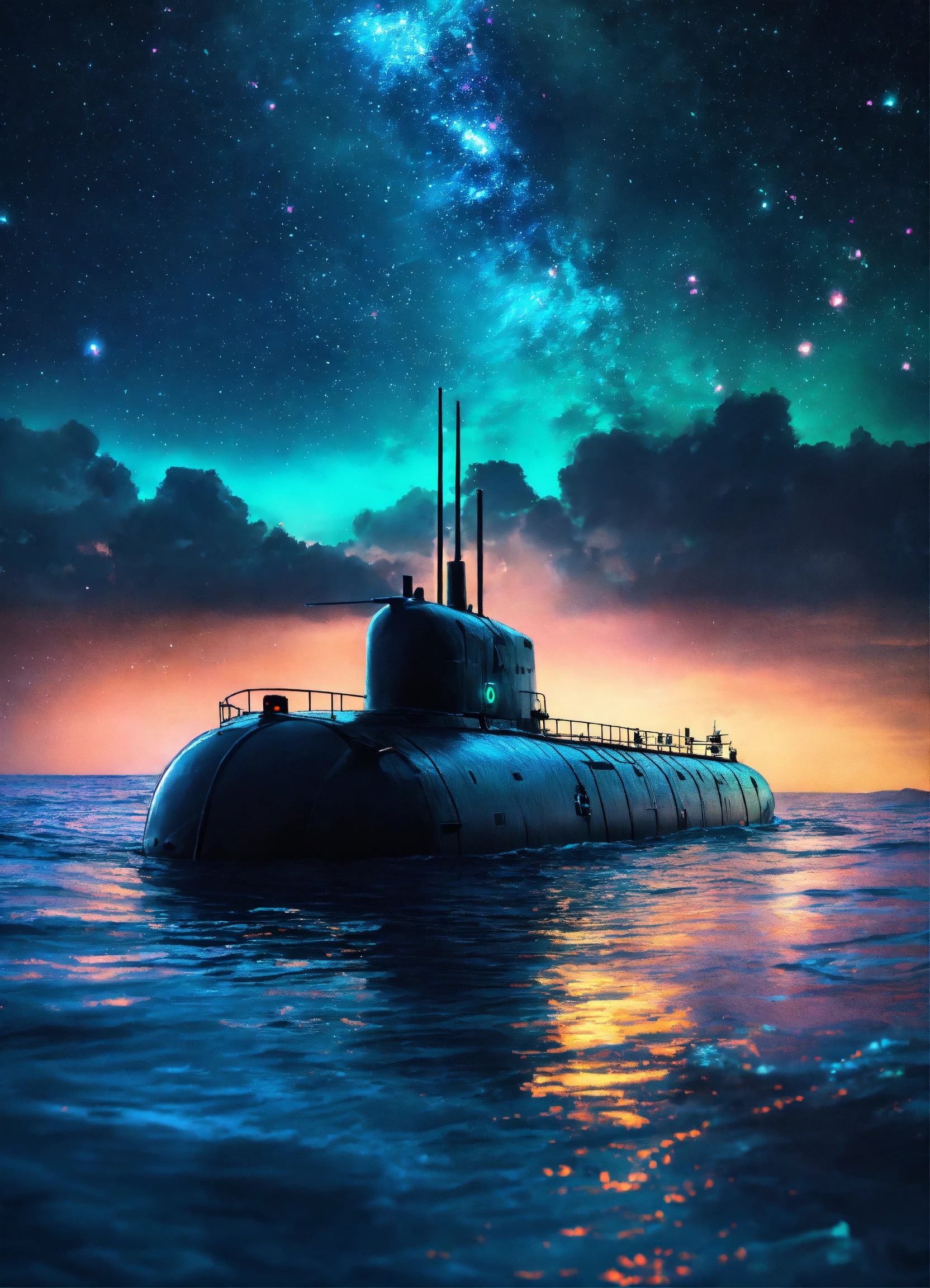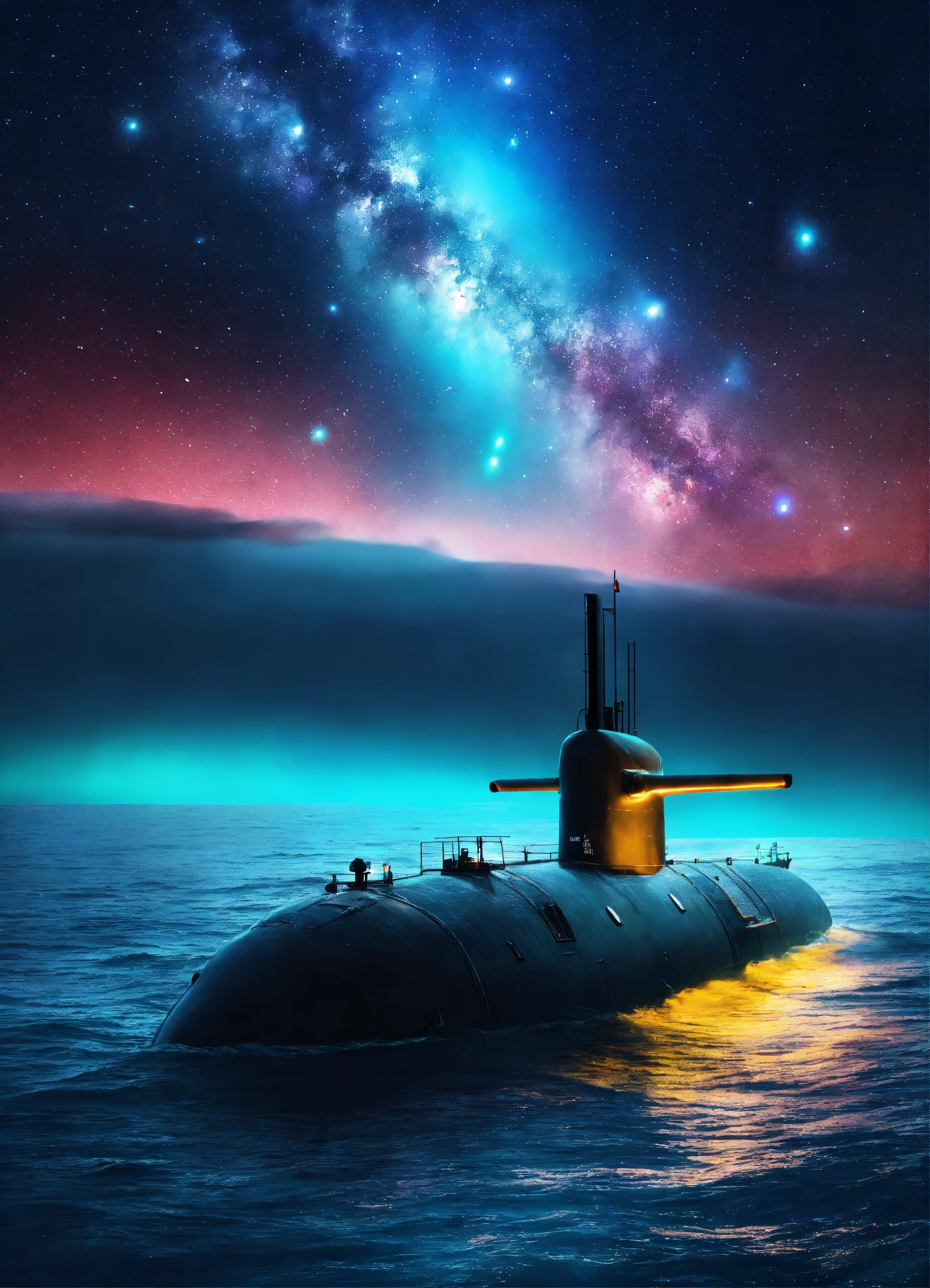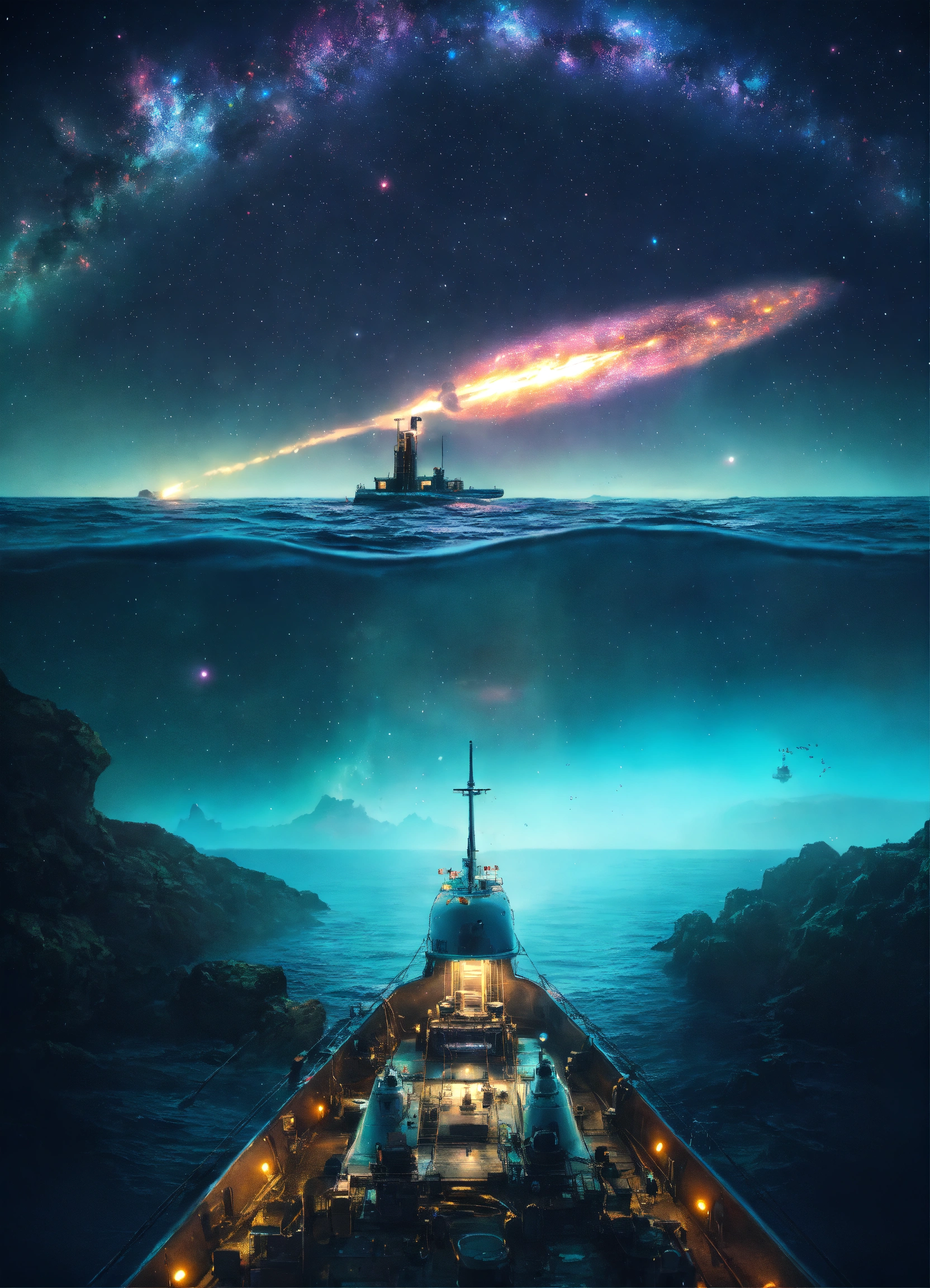(submarine sailing into a bioluminescence sea with a galaxy in the sky)