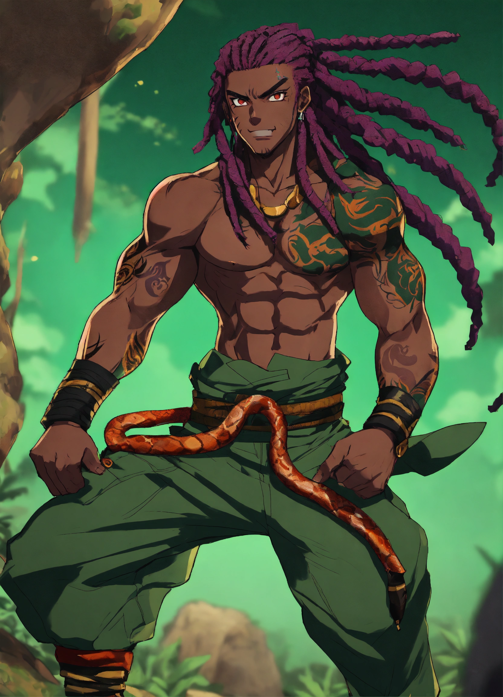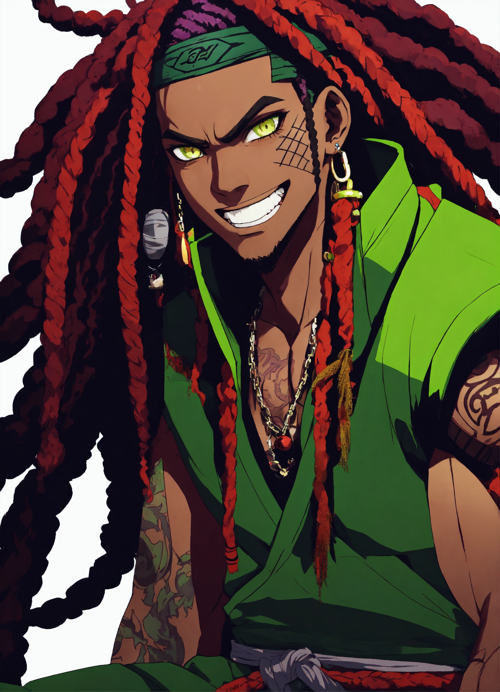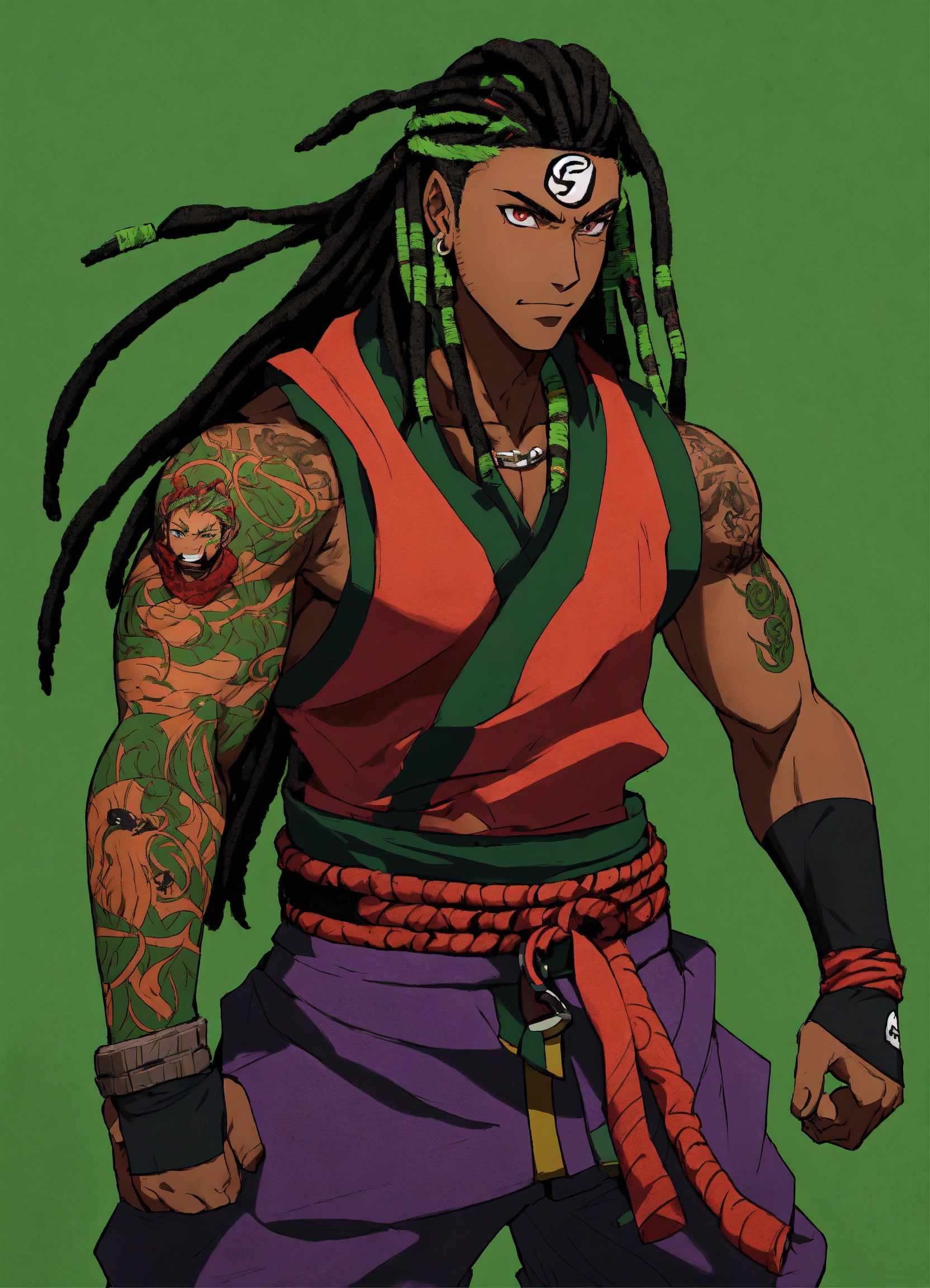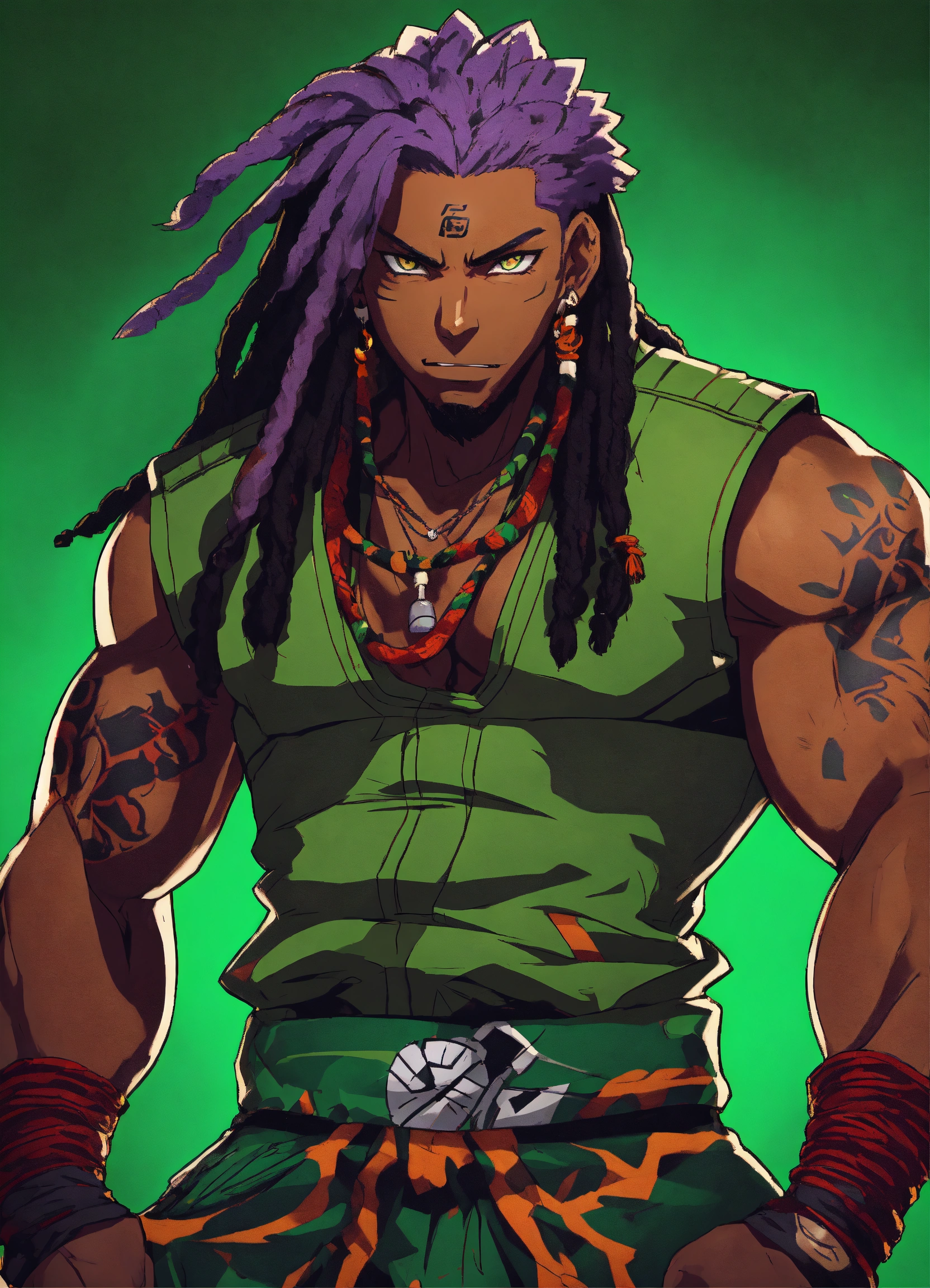African naruto anime styled character, muscular physique, long purple or green hair, which is styled in a wild dreads and untamed manner, red snake eyes, he wears a green and black martial arts uniform, anime style, male, has a mischievous grin on his face, has tribal tattoos, full body picture.