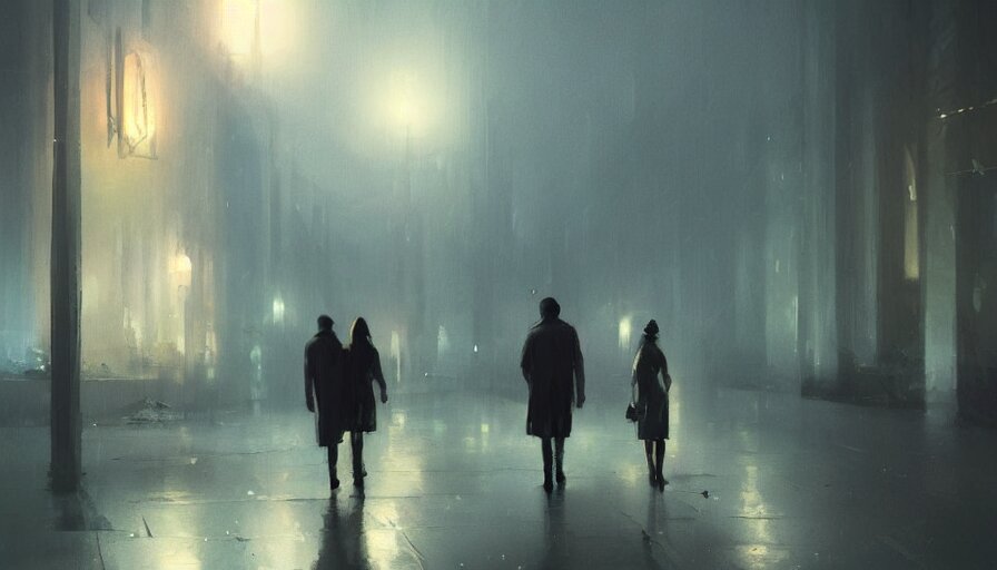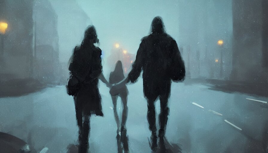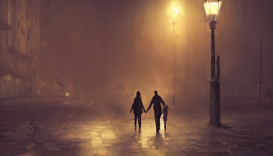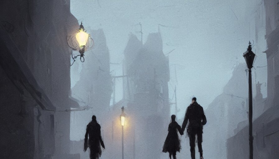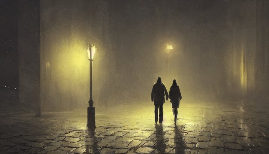 A couple strolling in a dimly lit dark night, digital painting, artstation, concept art, sergey kolesov, breathtaking, 8k resolution, extremely detailed, beautiful, establishing shot, artistic, hyperrealistic, octane render, cinematic lighting, dramatic lighting, masterpiece, light brazen, extremely detailed and beautiful face