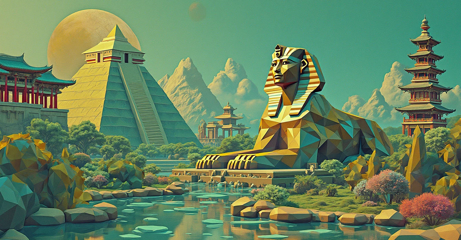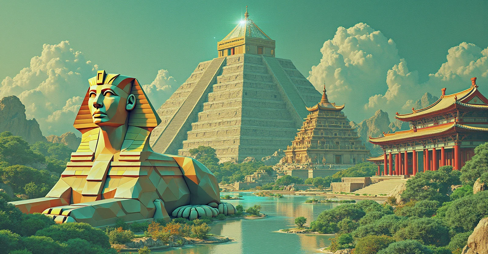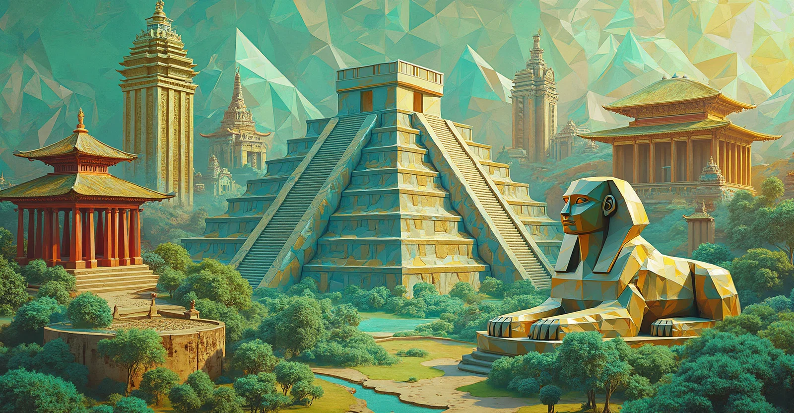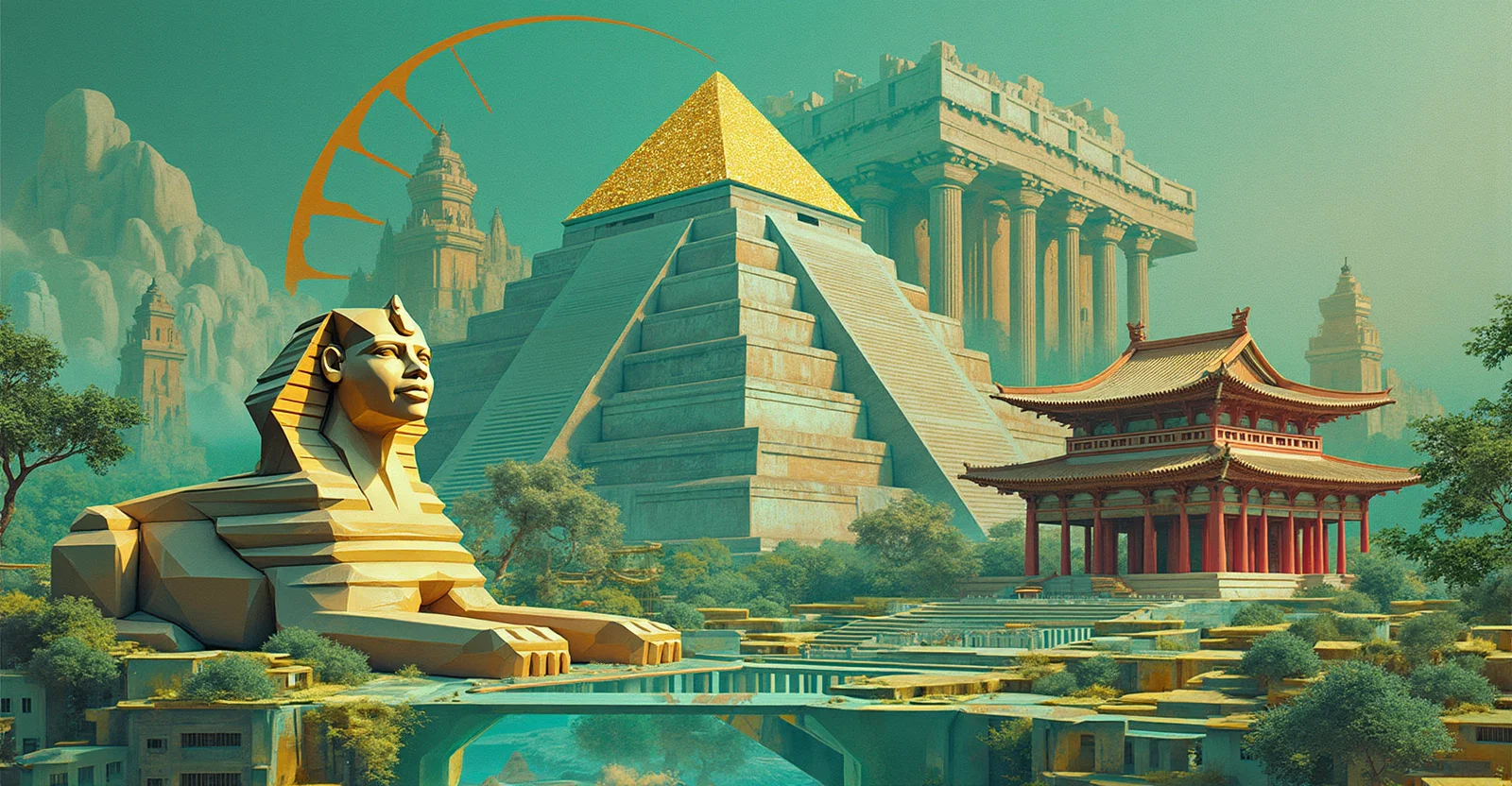A 3d collage with a mayan pyramid in the center, flanked by the egyptian sphinx and a chinese temple, in the background a hindu temple and the greek parthenon, in a landscape. built with geometric figures such as triangles, squares, rectangles, trapezoids and circles. all mixed together. use bright variations of the colors #076a77, #fe7f1f, #058ca2, #b4dae1. minimalist and futuristic style