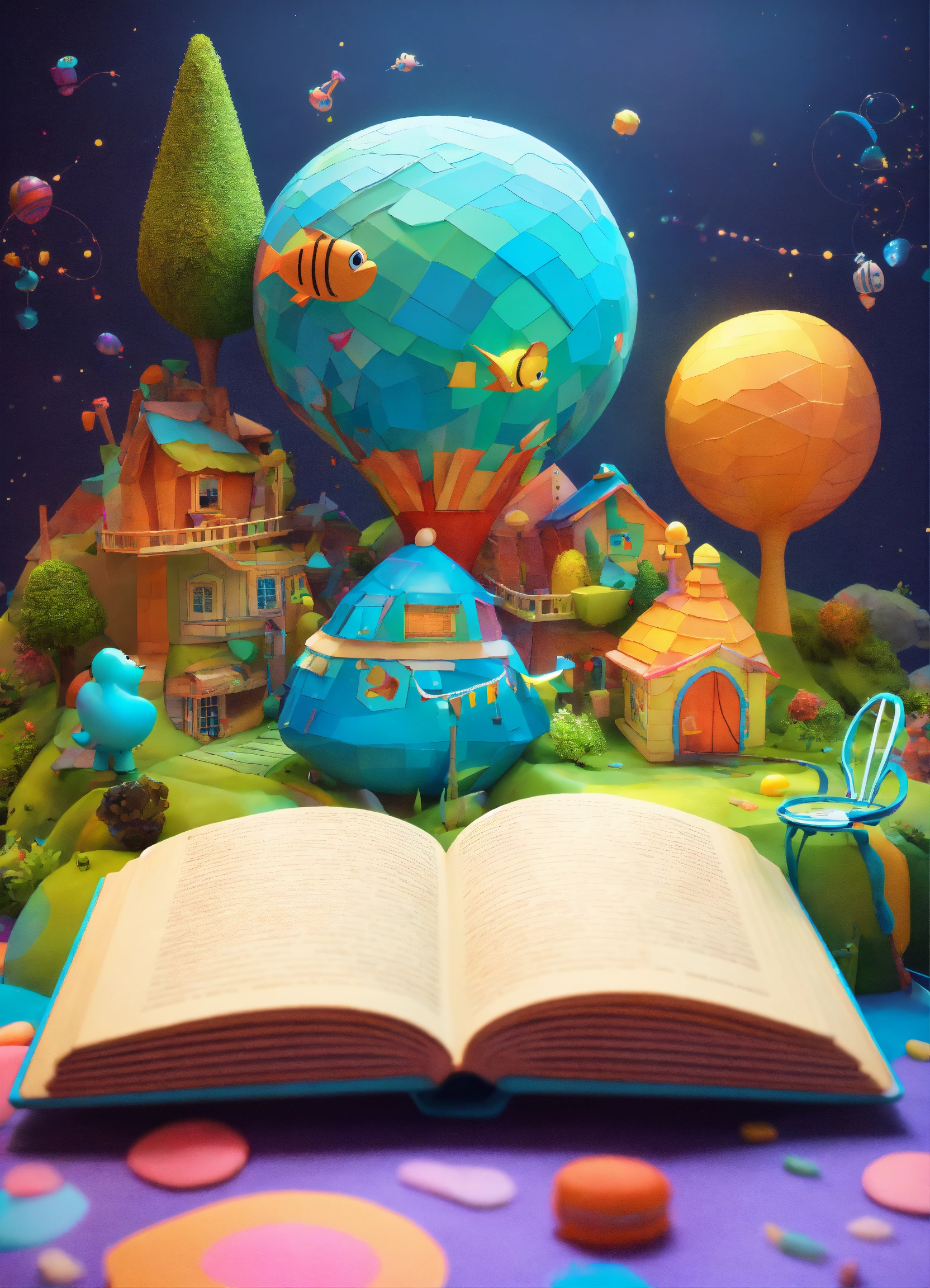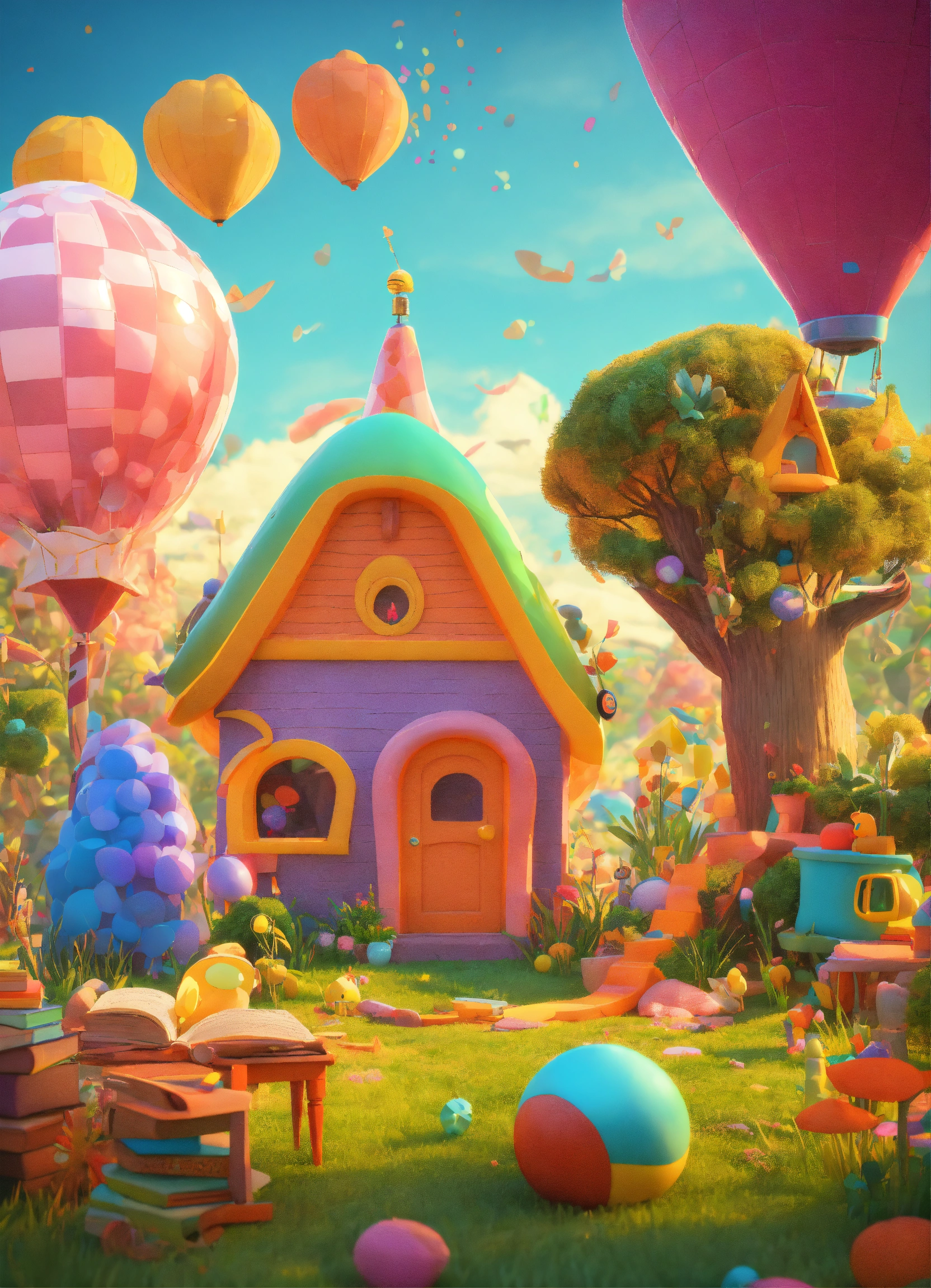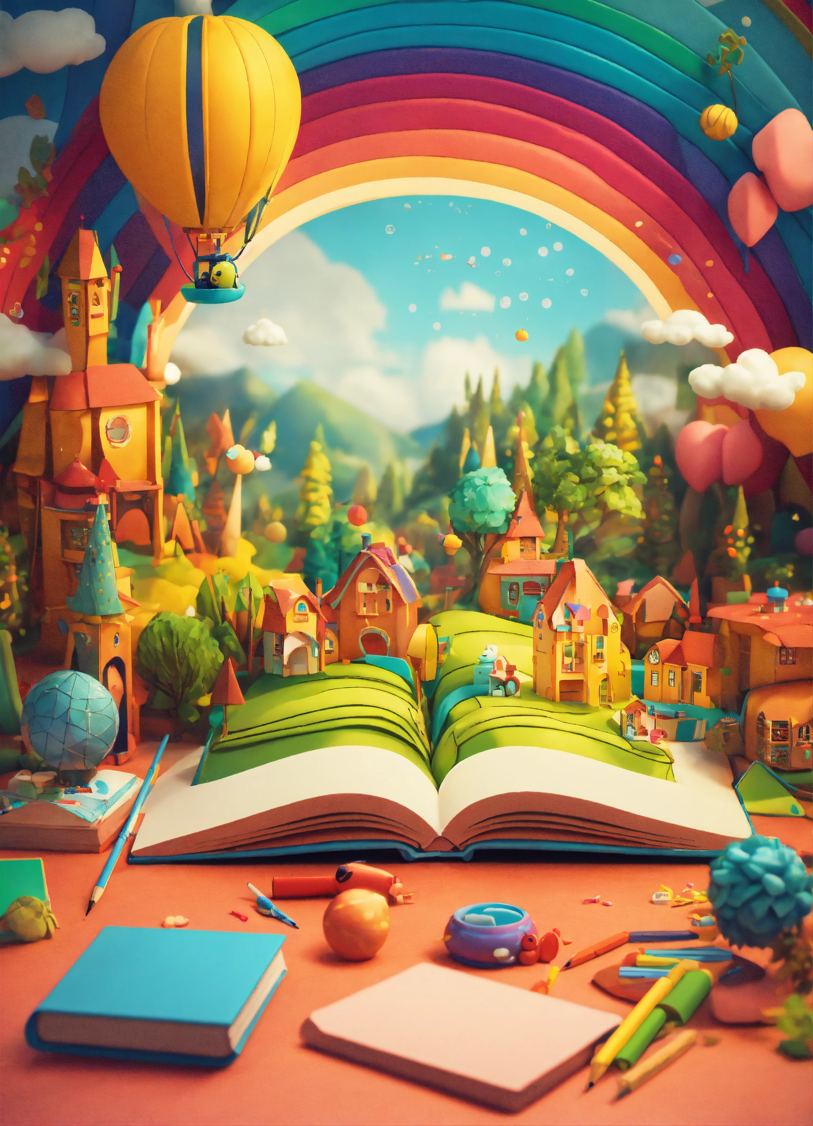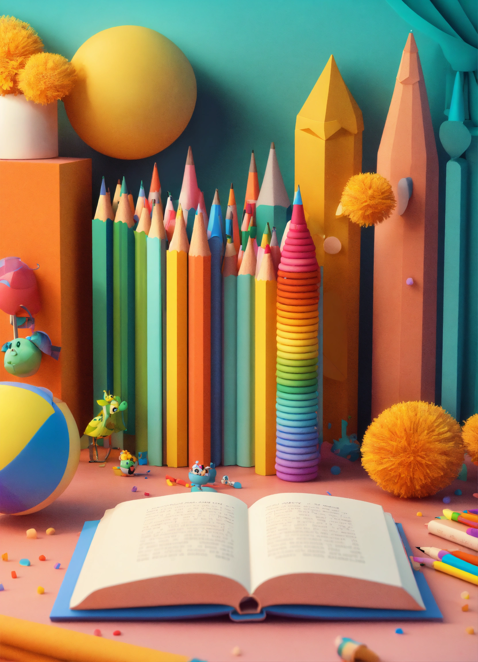 Land of whimsical pencil and book. happy colors, playful and funny childish style. 3d style. disney and pixar style.