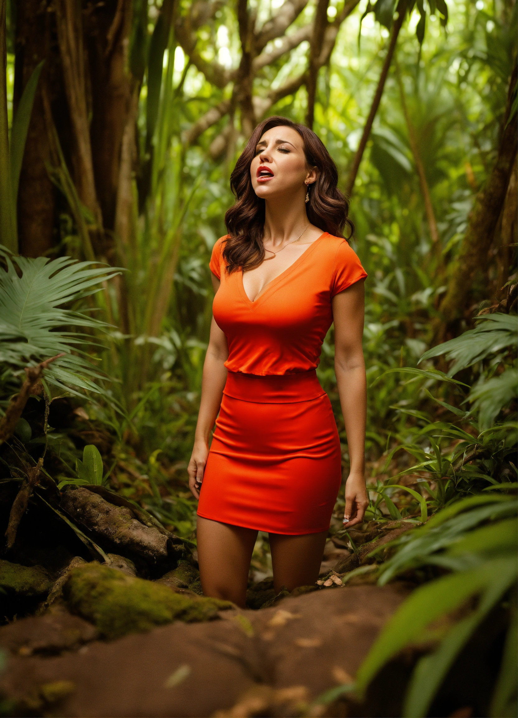 Full body 8k wide angle top down image of scared and shocked in pain lacey chabert wearing a tight mid sleeved orange low cut v-neck top, a red mini skirt, rolled sleeves, wedges, laying with her legs together and arms wide open on the tropical forest floor, arms on arm rests, top view picture, arms out wide, bright green eye iris color, mouth wide open in pain, stomach showing