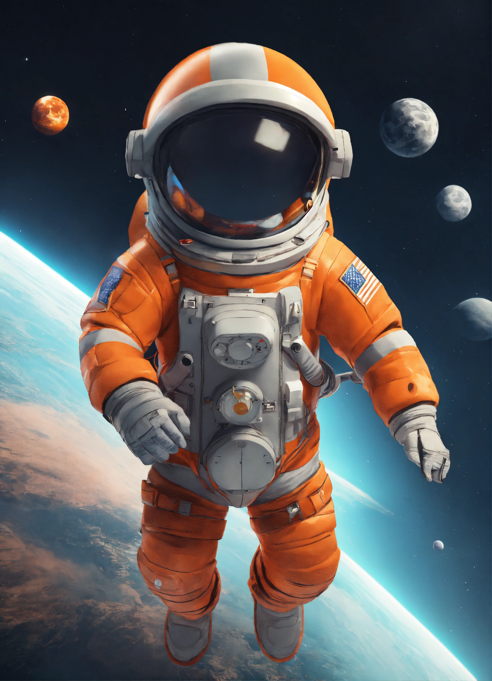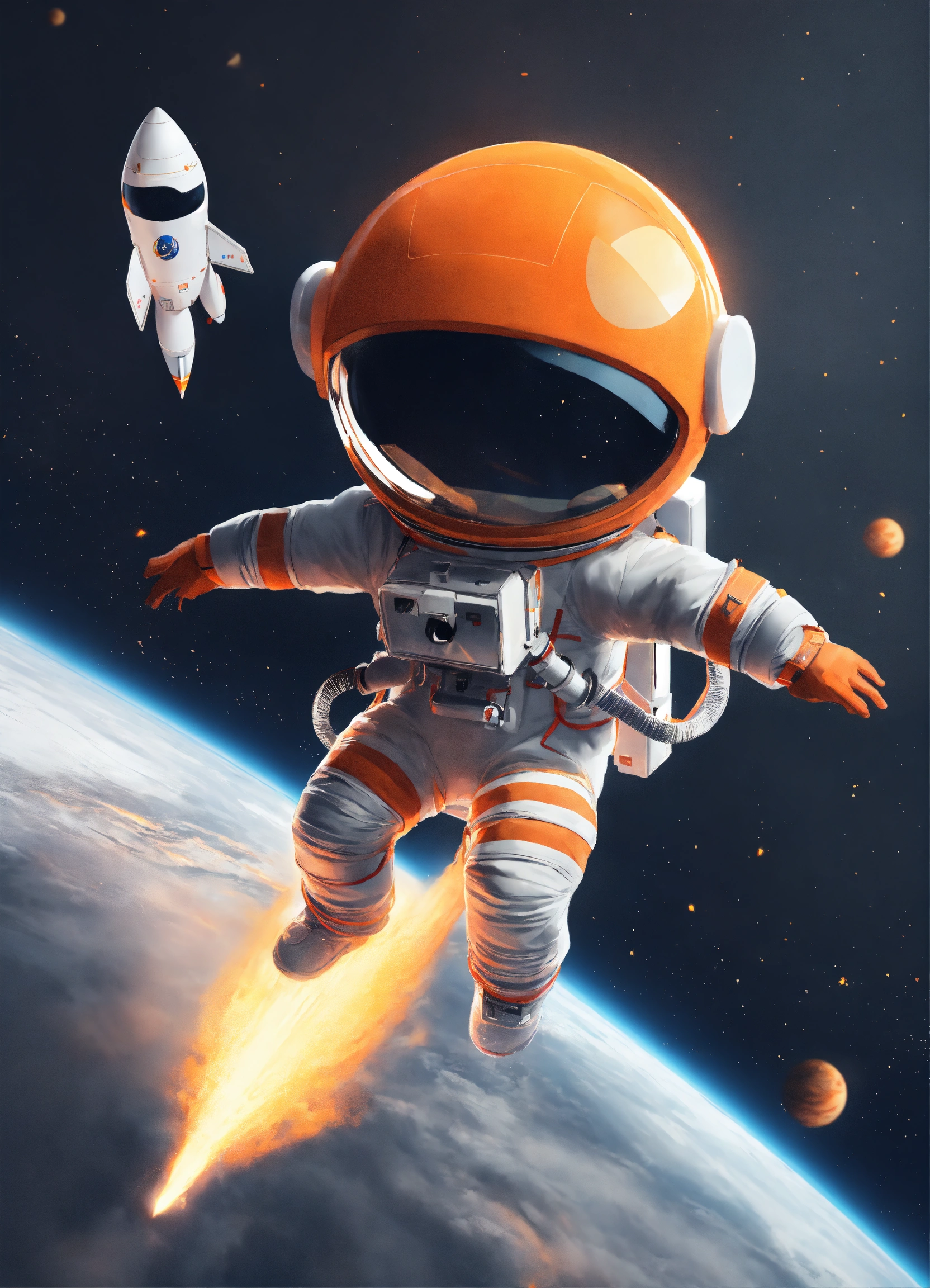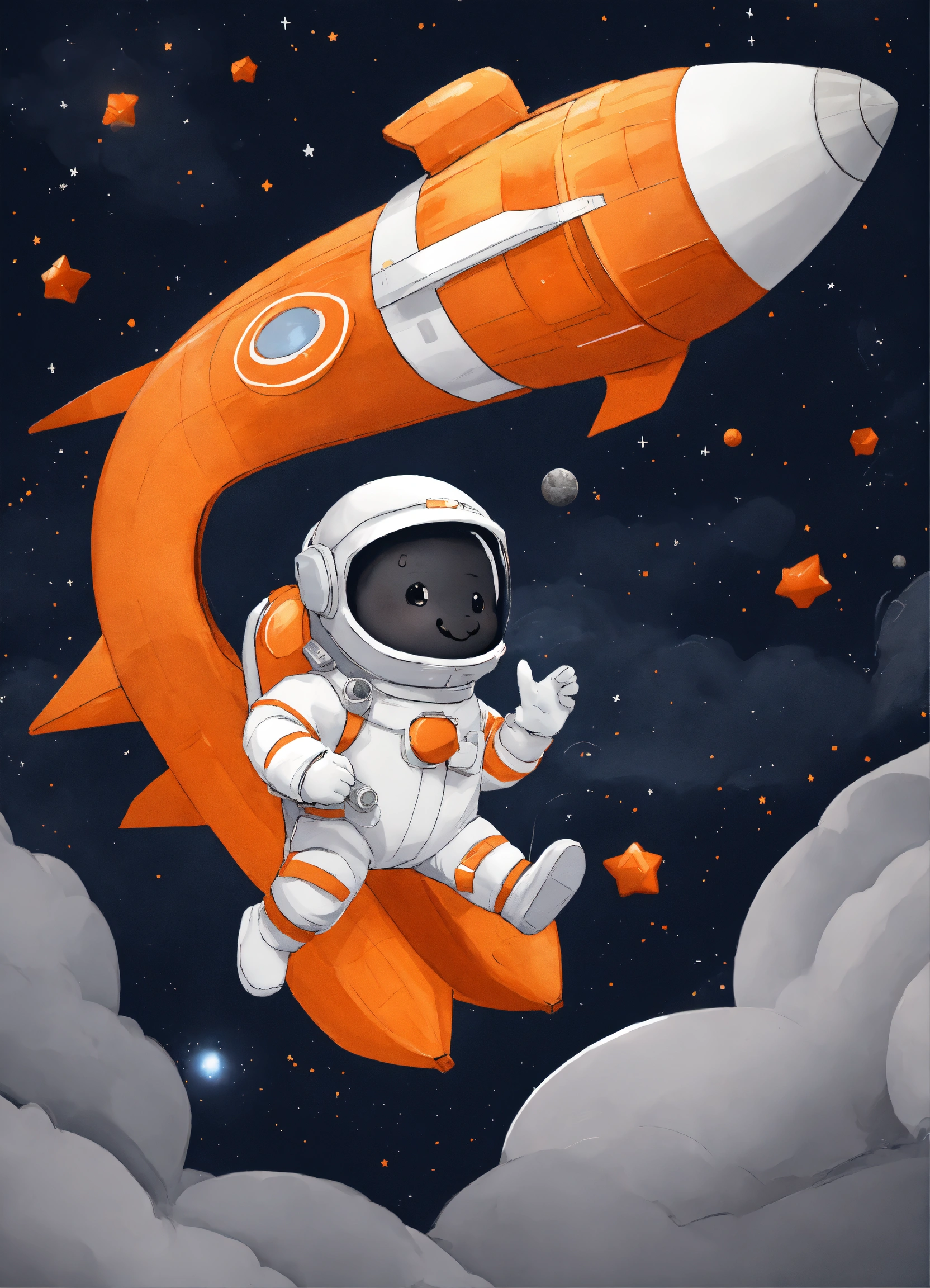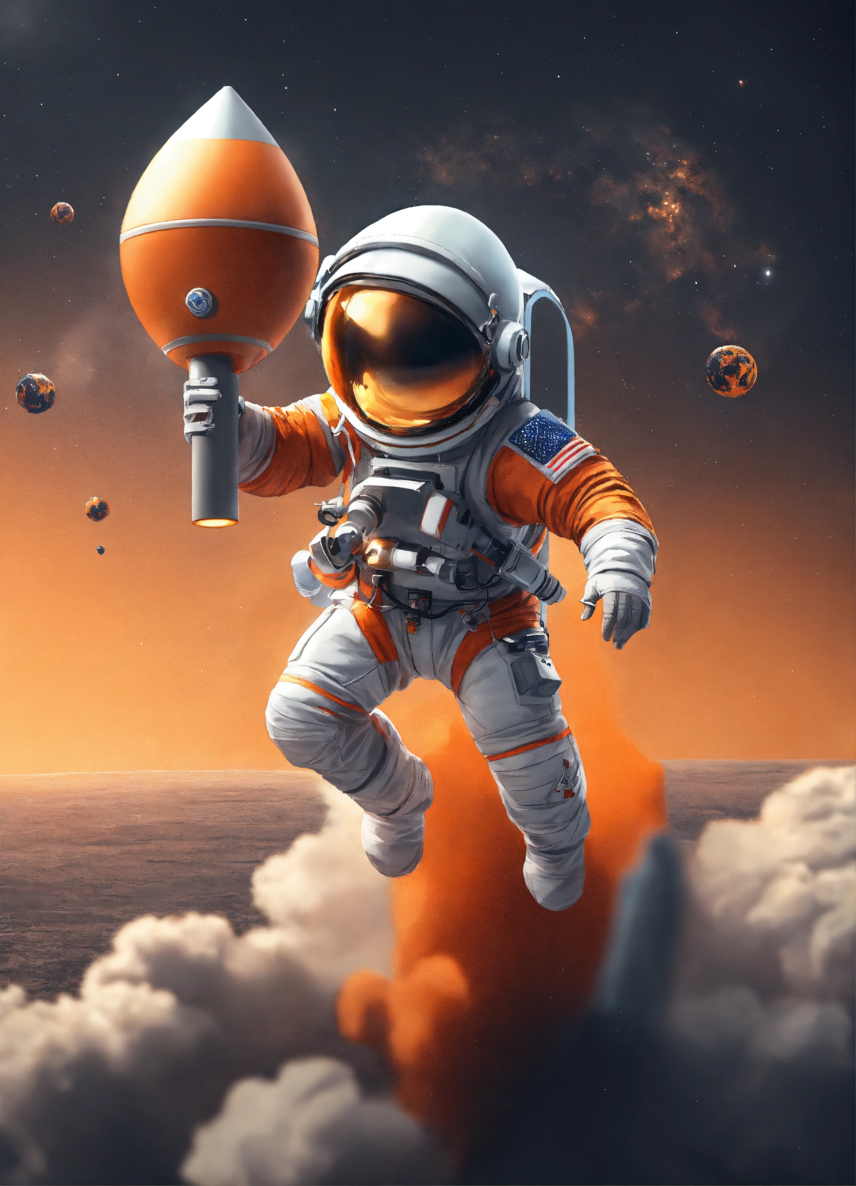 Cute astronaut flying upon rocket orange and gray 8k