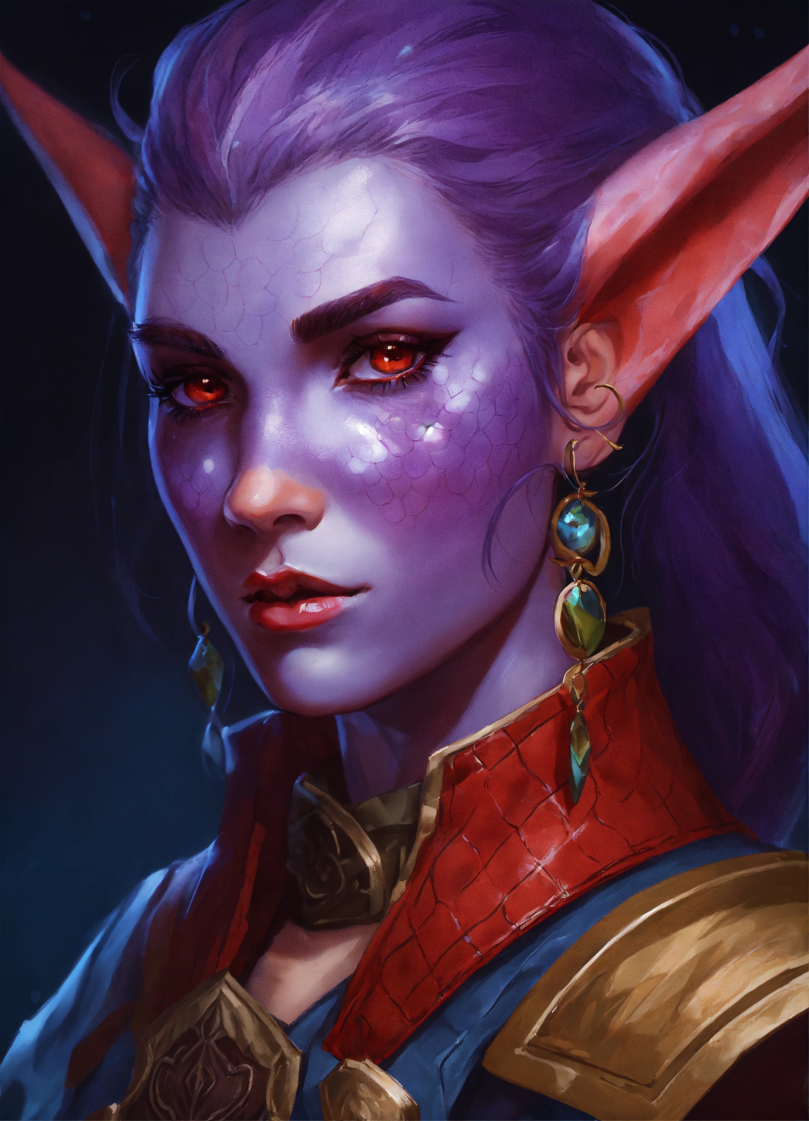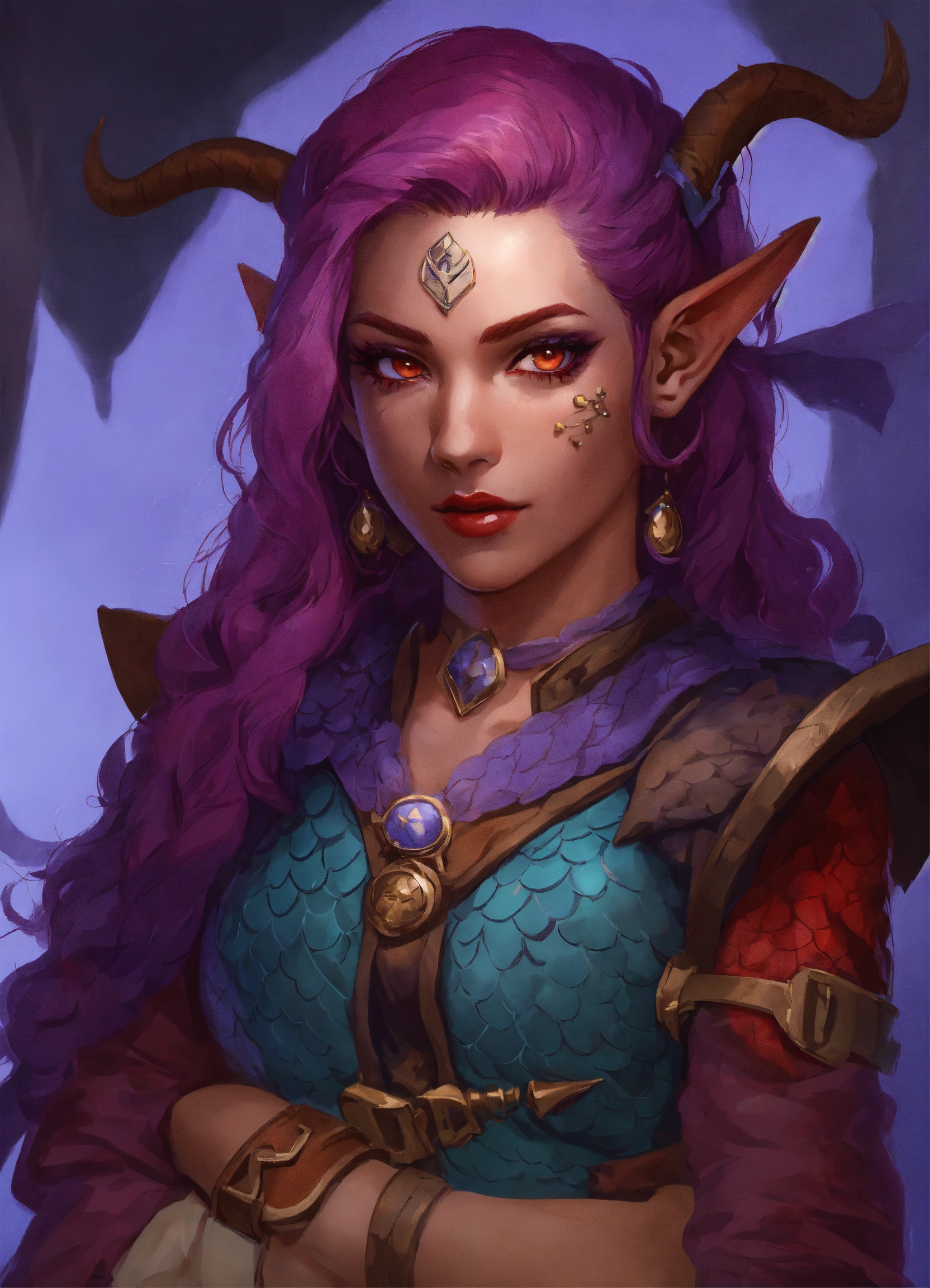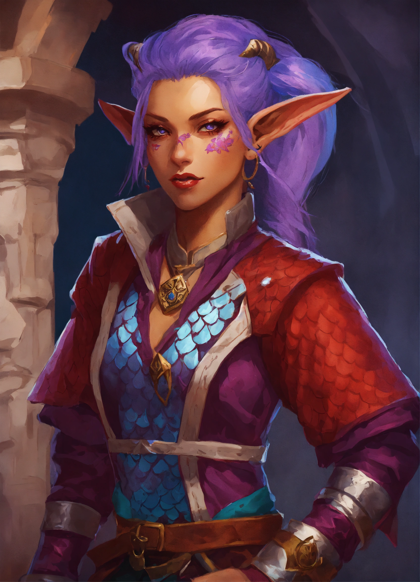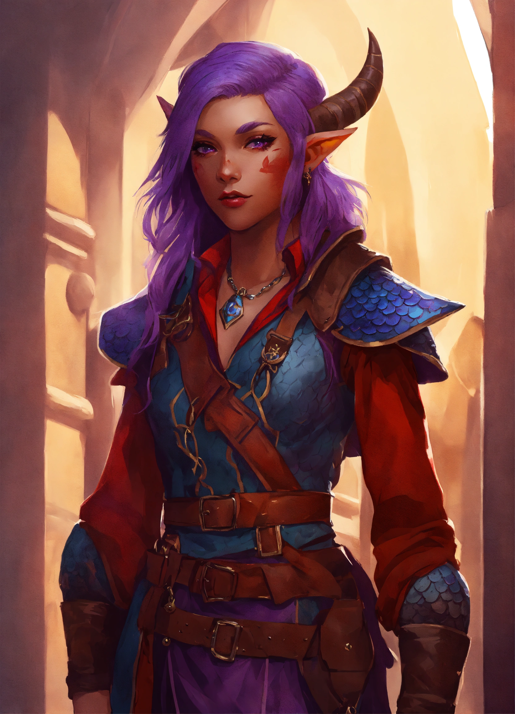 A teifling from dnd 5th edition, she has red skin with some patches of blueish purple dragon scales and purple hair