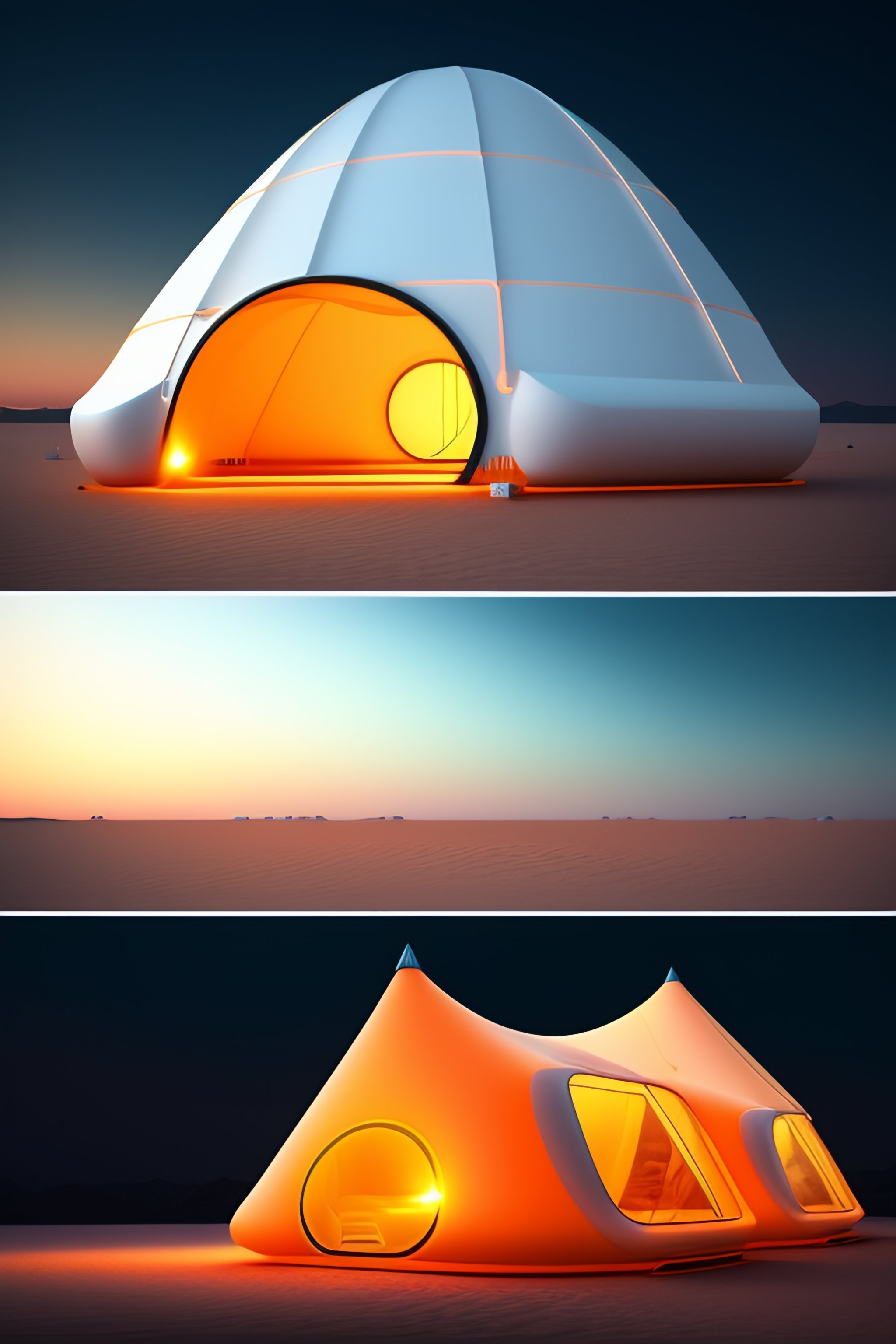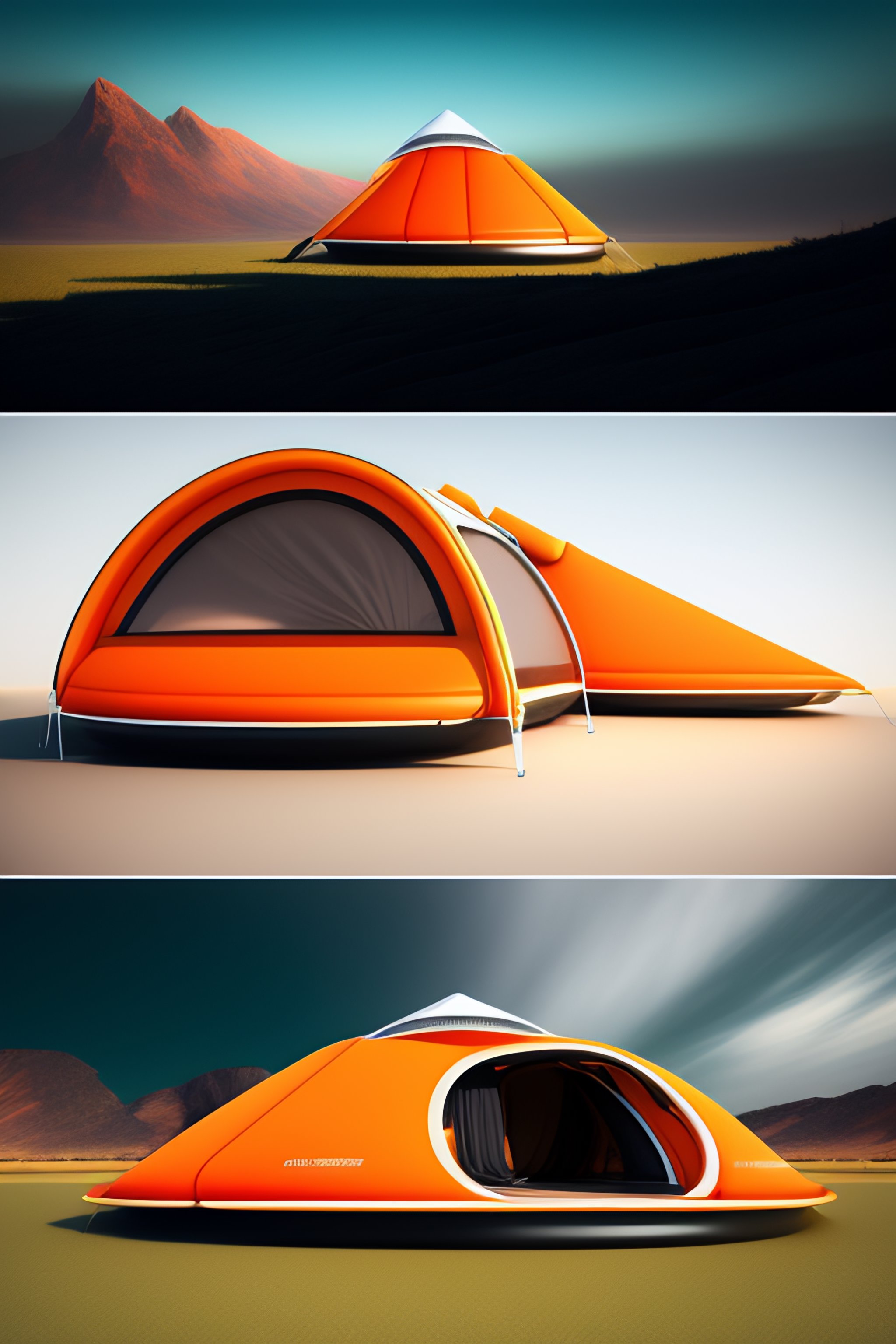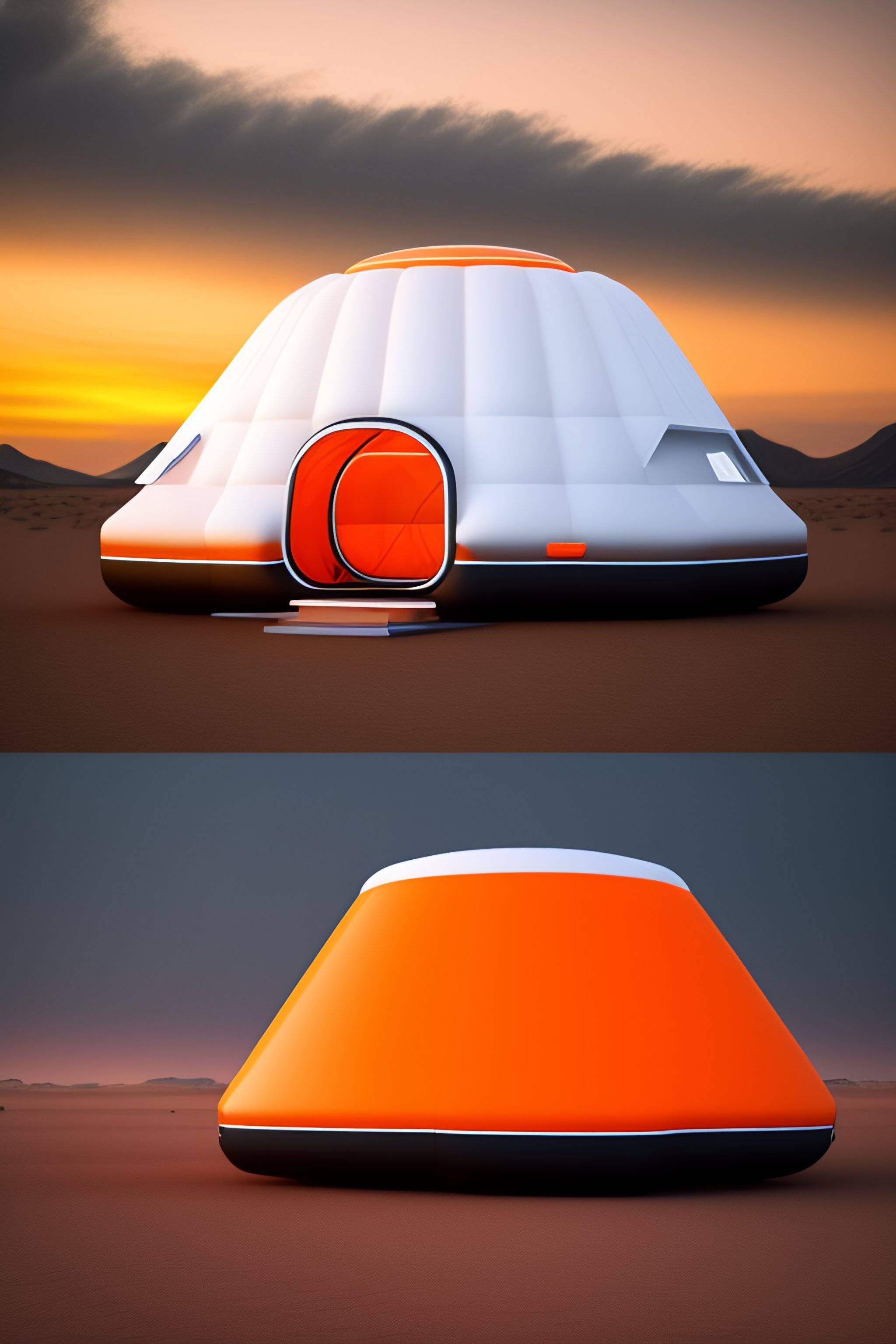 Modern design of inflatable tent camping, a futuristic tent that sets up immediately, 3d style, with elements of future technology, white and orange colors