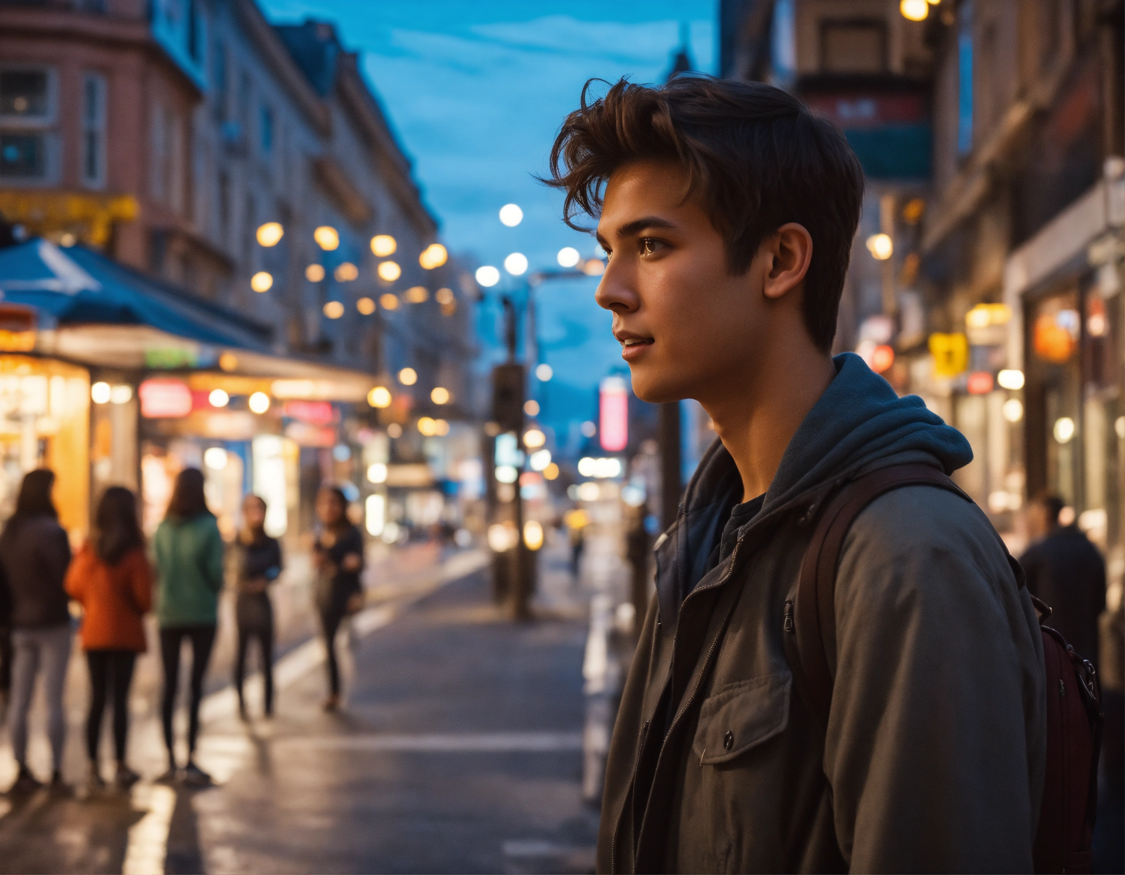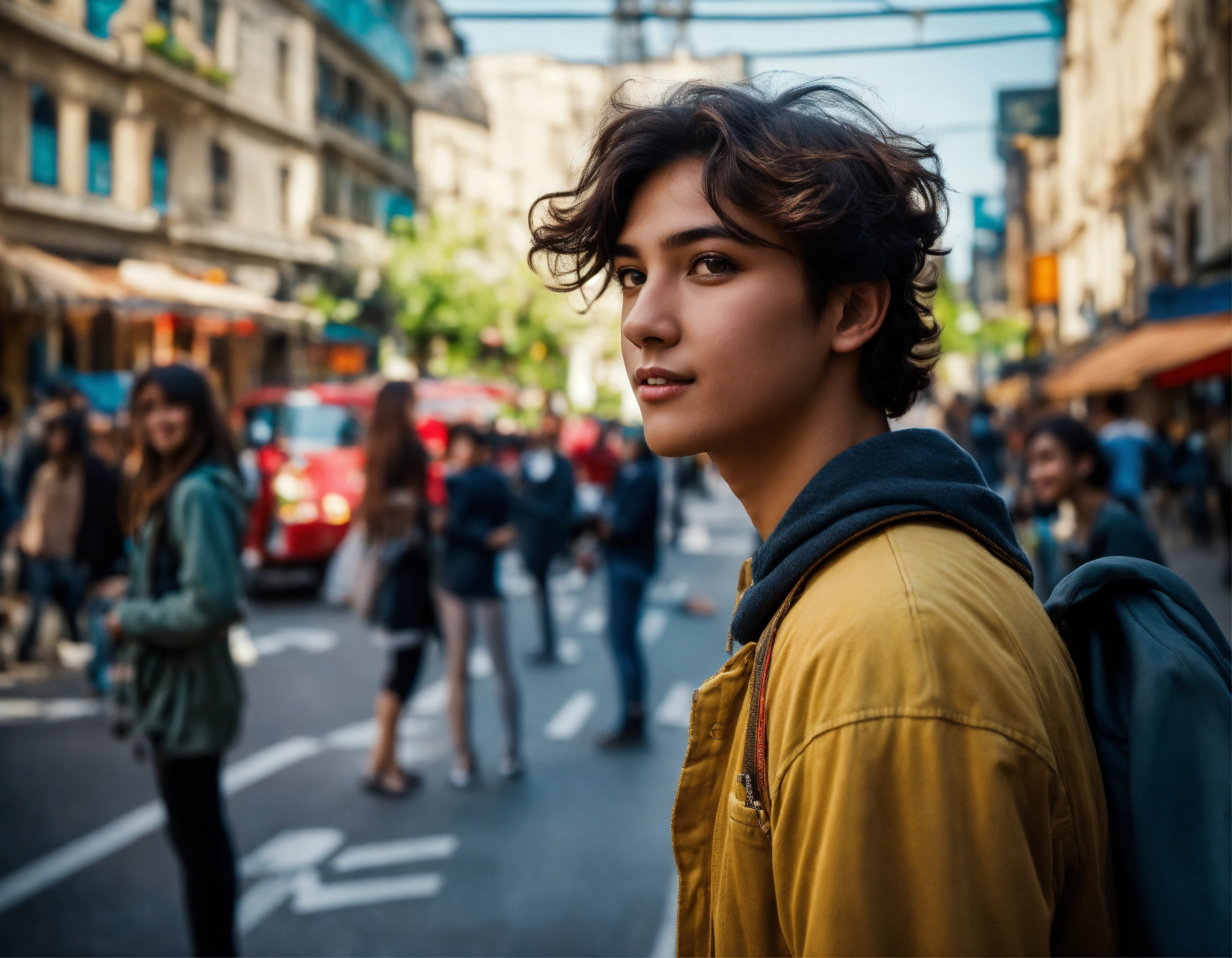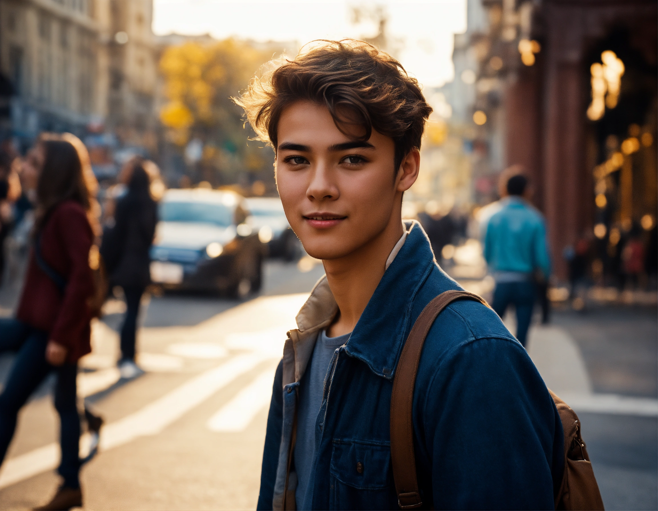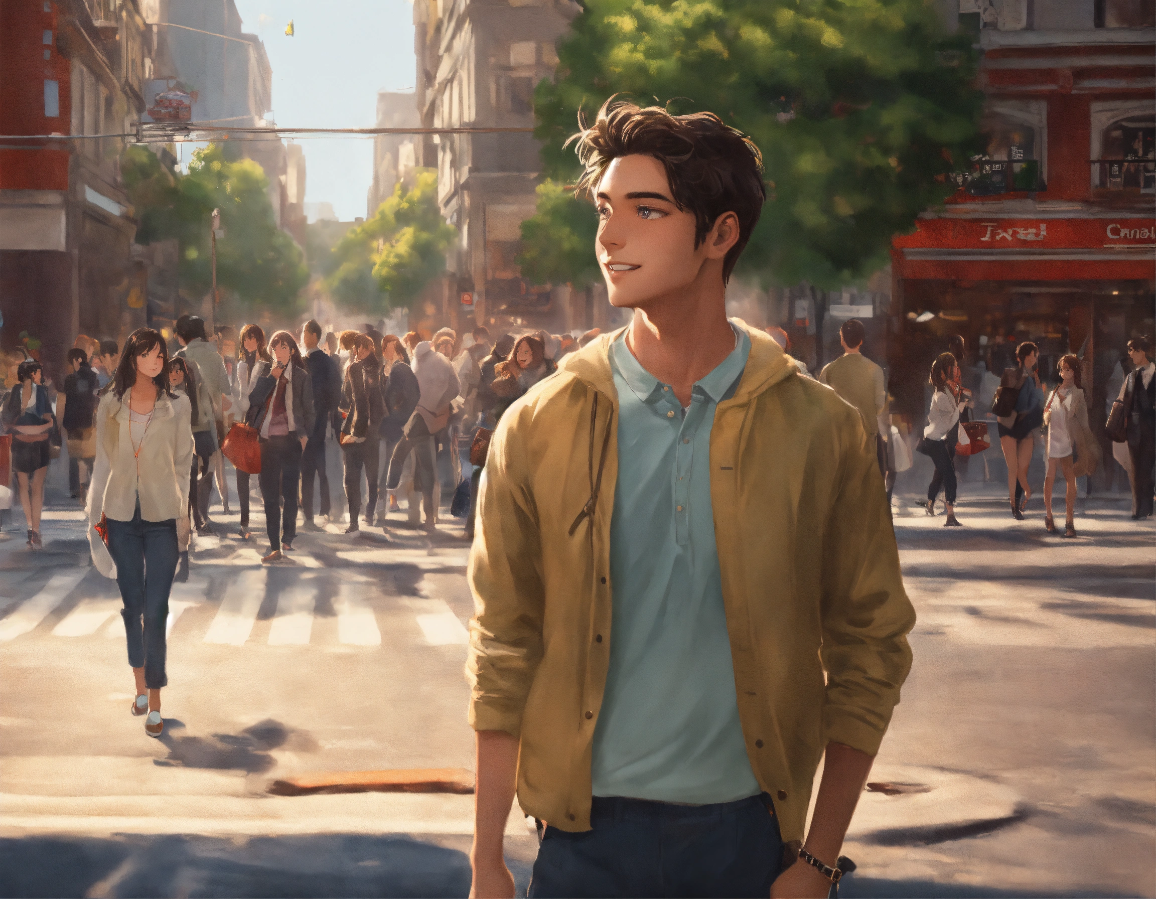 A young guy standing on a bustling street corner, looking at a girl with shining eyes who's passing by with excitement in her expression.