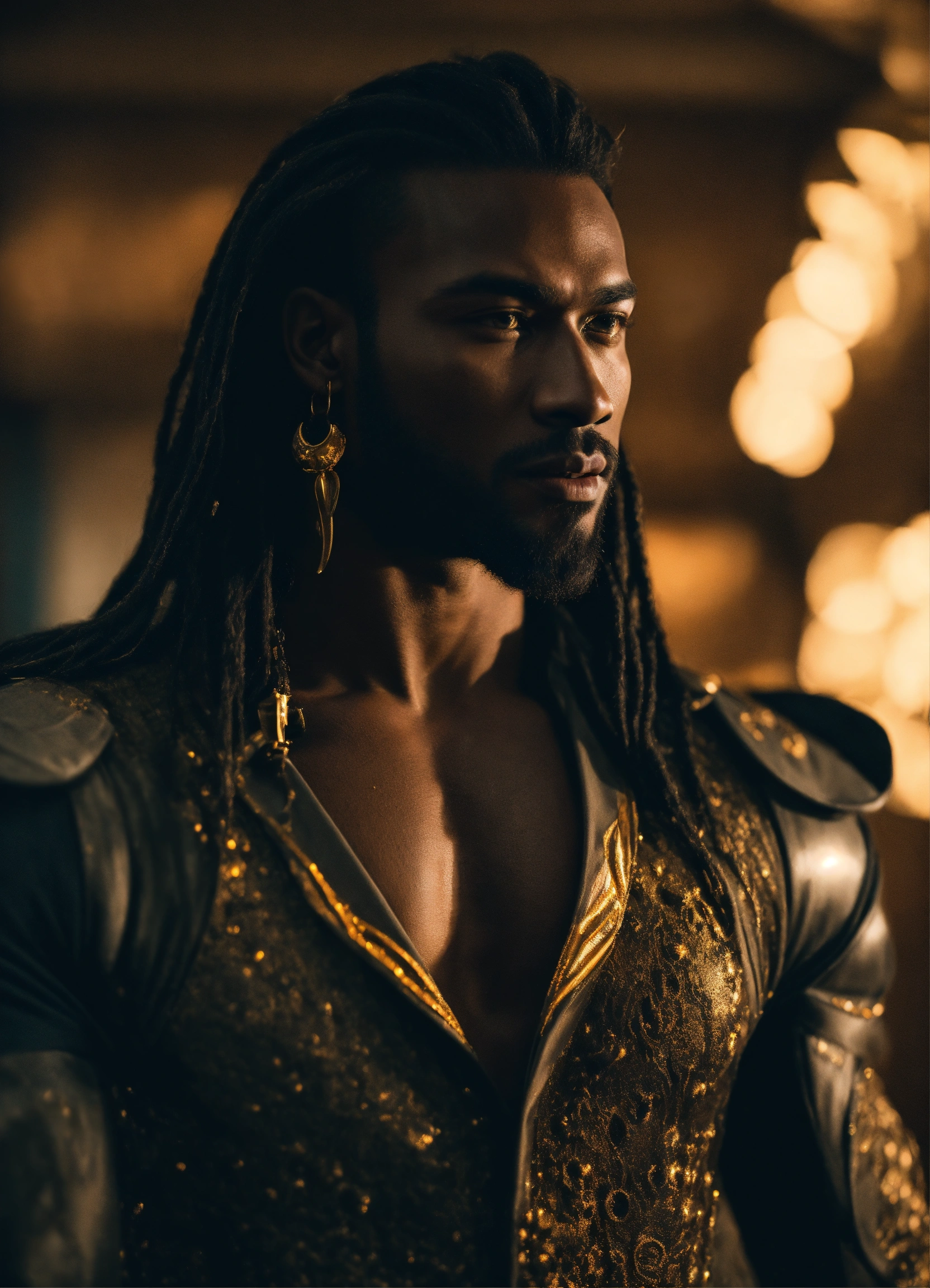 Handsome human-looking alien male, with black skin, arab features, long black coily hair, muscular build, in haute coture suit, robust and confident demeanor