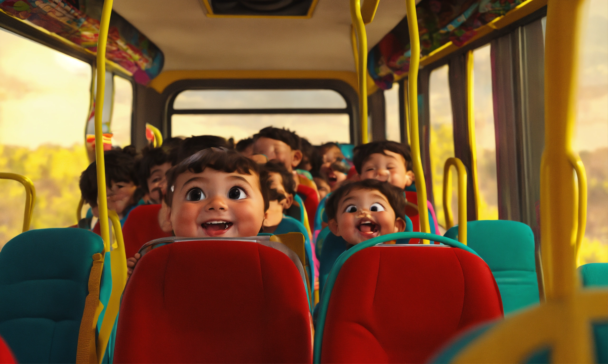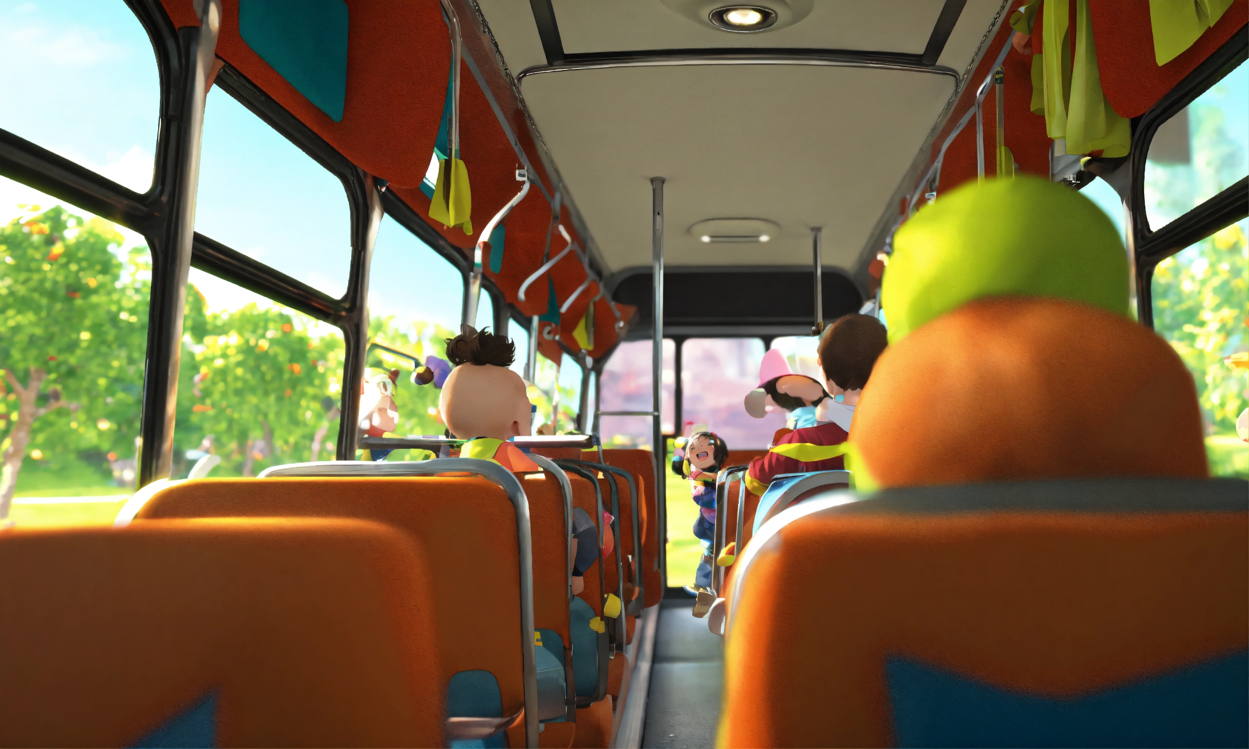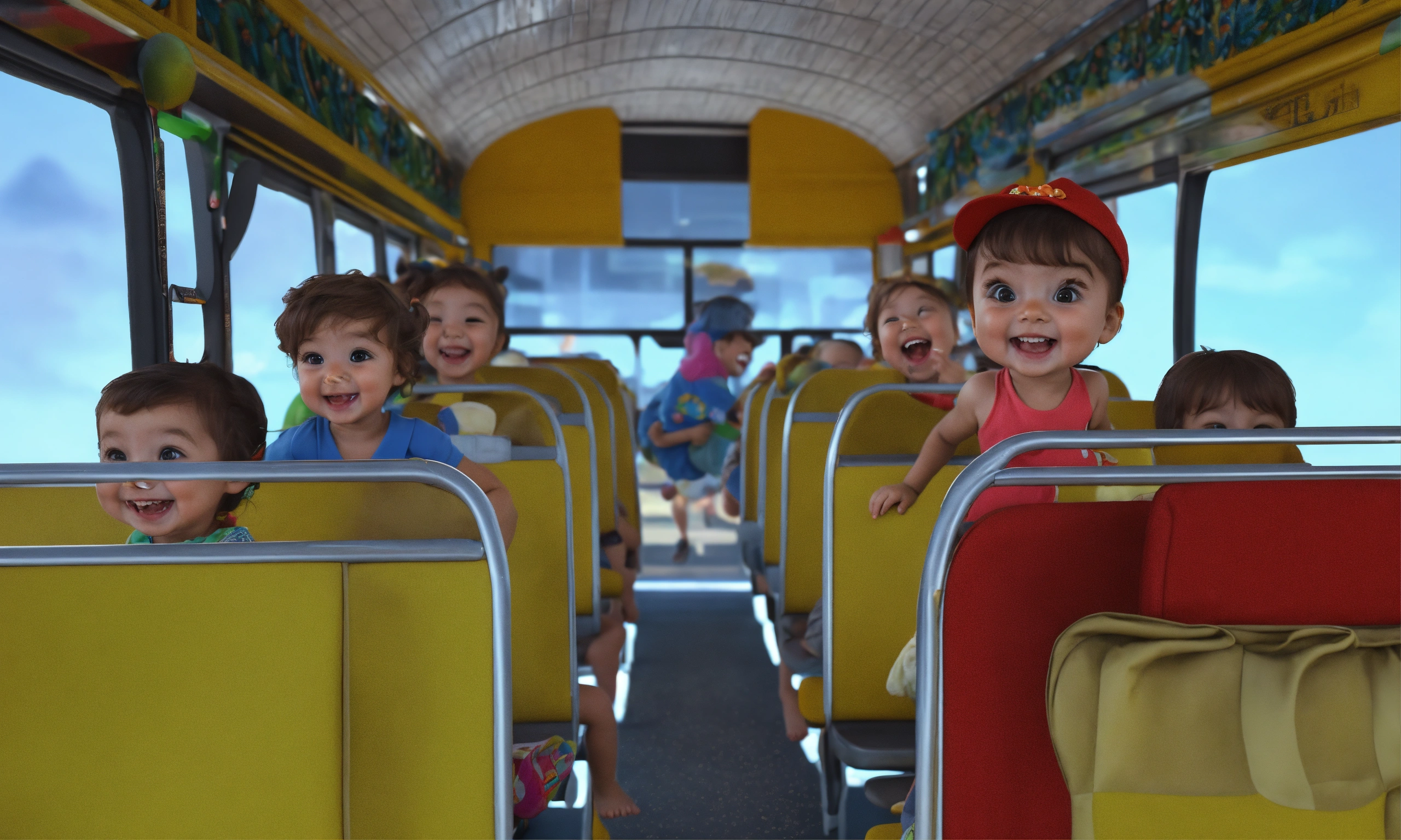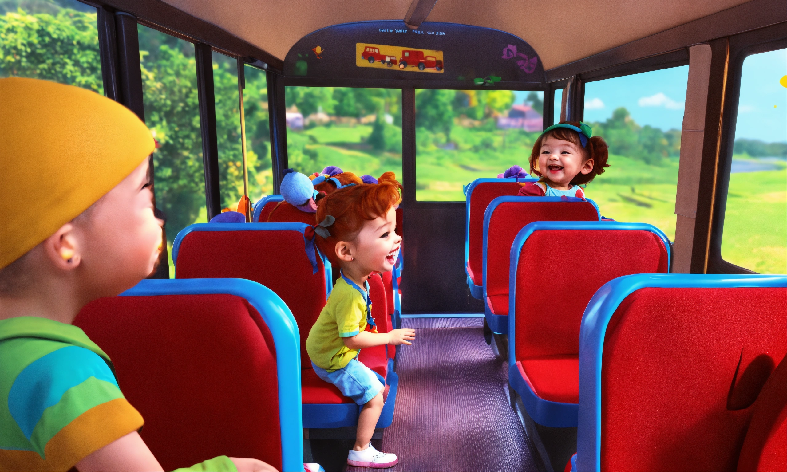 The sweet little baby and children sitting in the bus are laughing while jumping from the seat on the bus, 3d cartoon animation