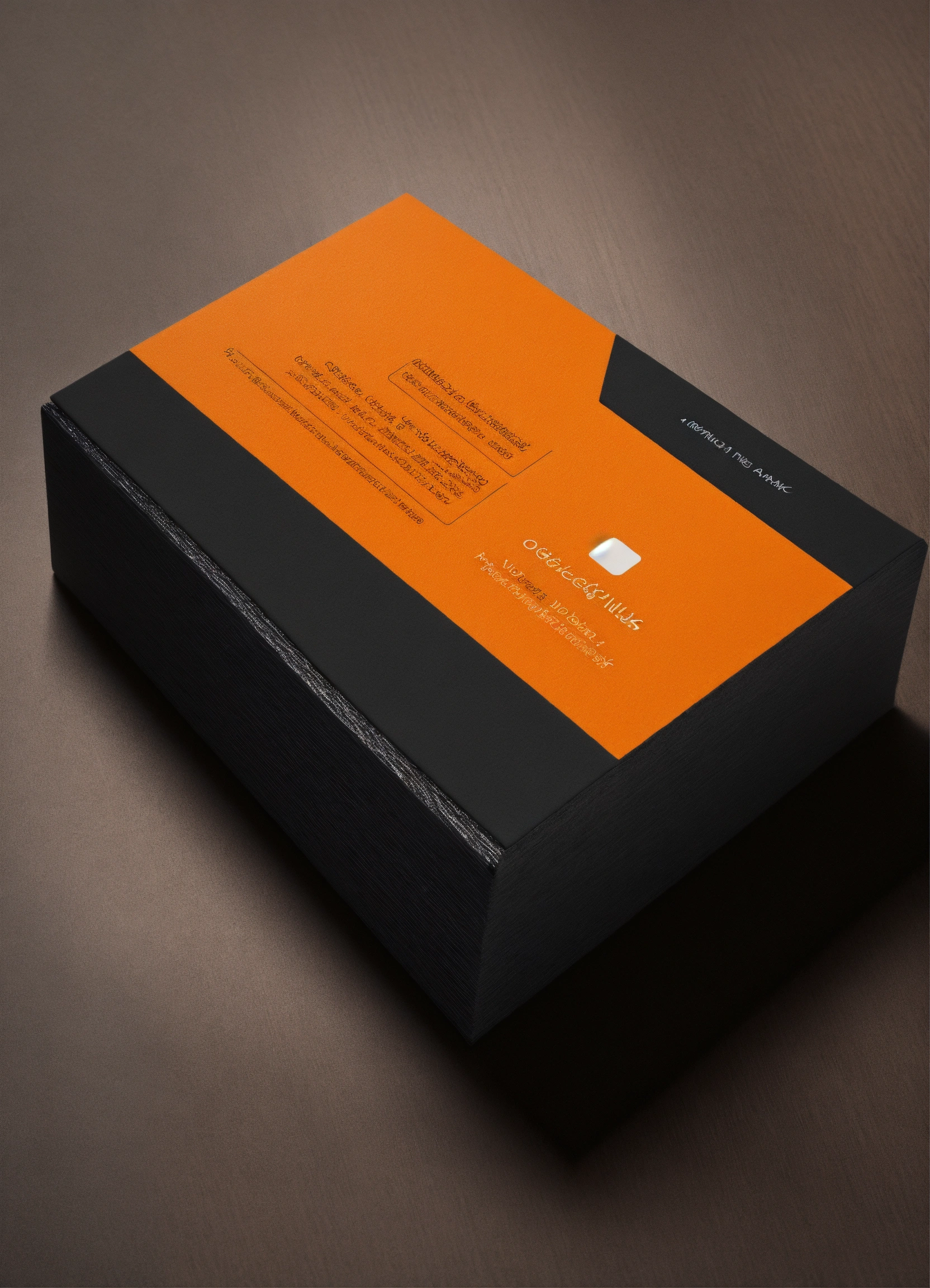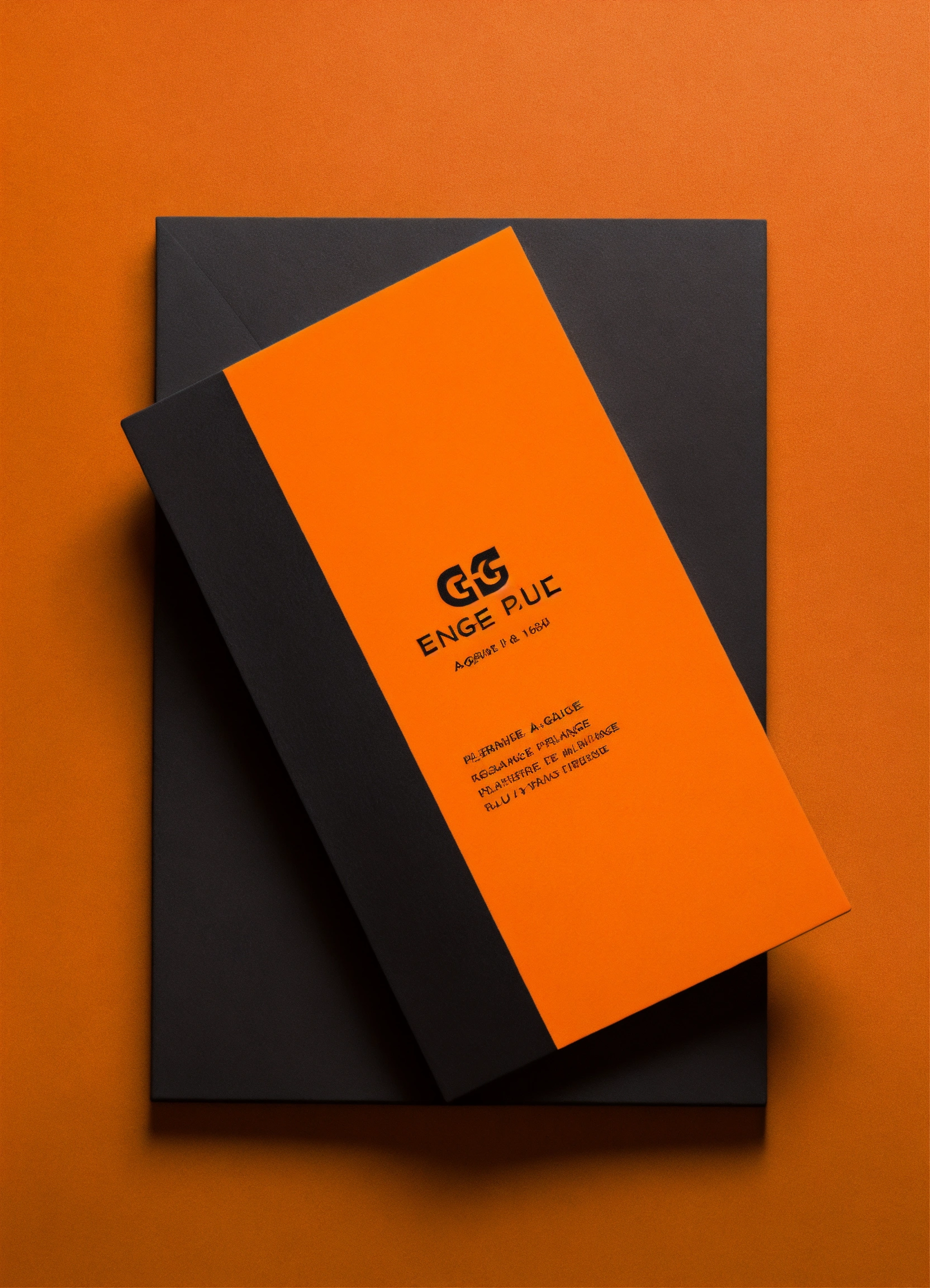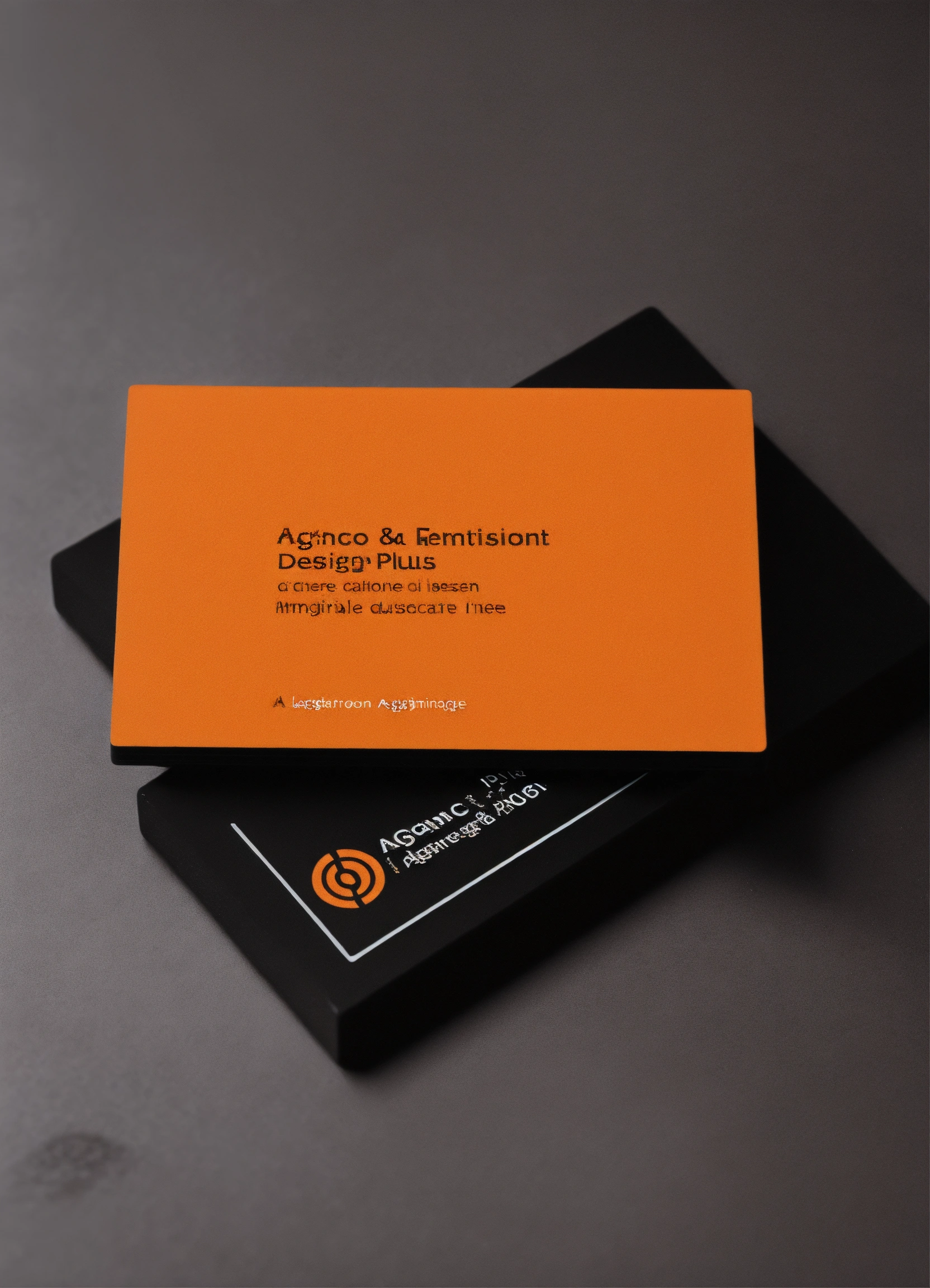 Photo carte de visite entière à plat 16k, text "agence design plus" avec logo, orange et noir minimaliste