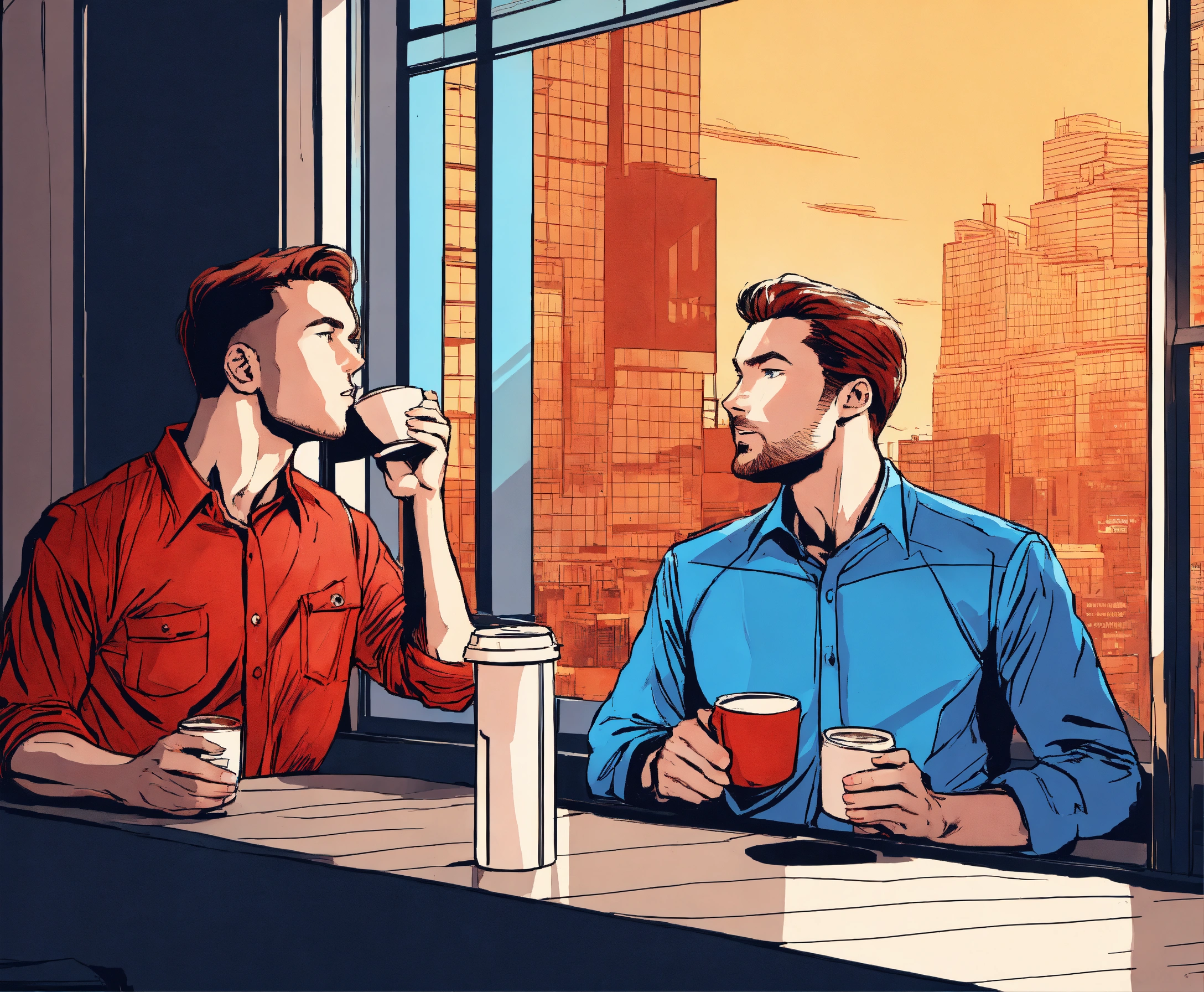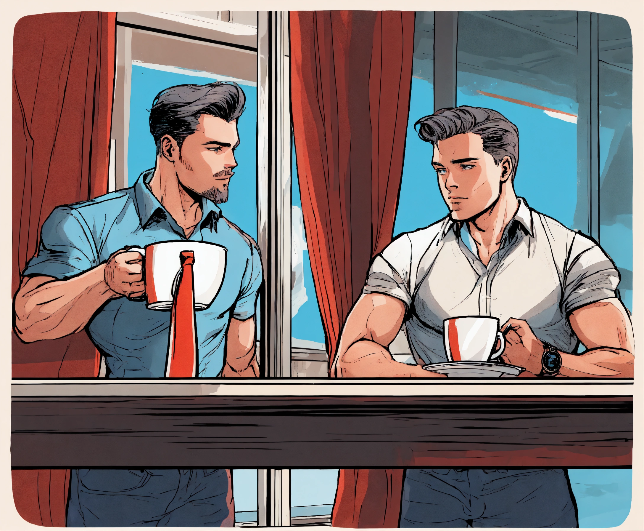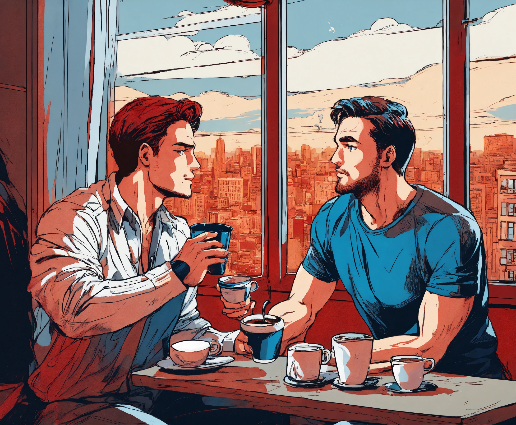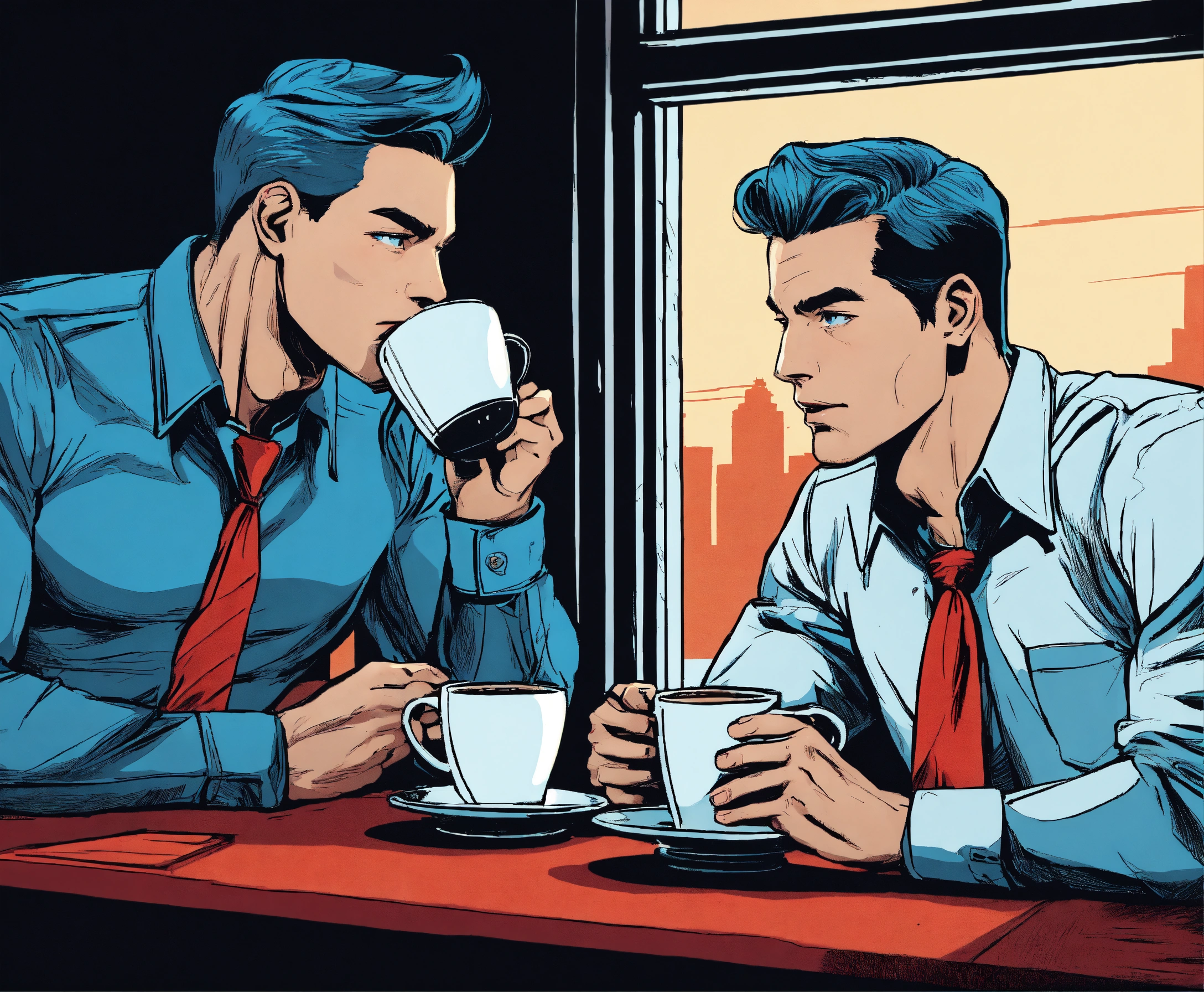 Two guys in shirts are drinking coffee and looking out the window. comic book style, color white blue and red