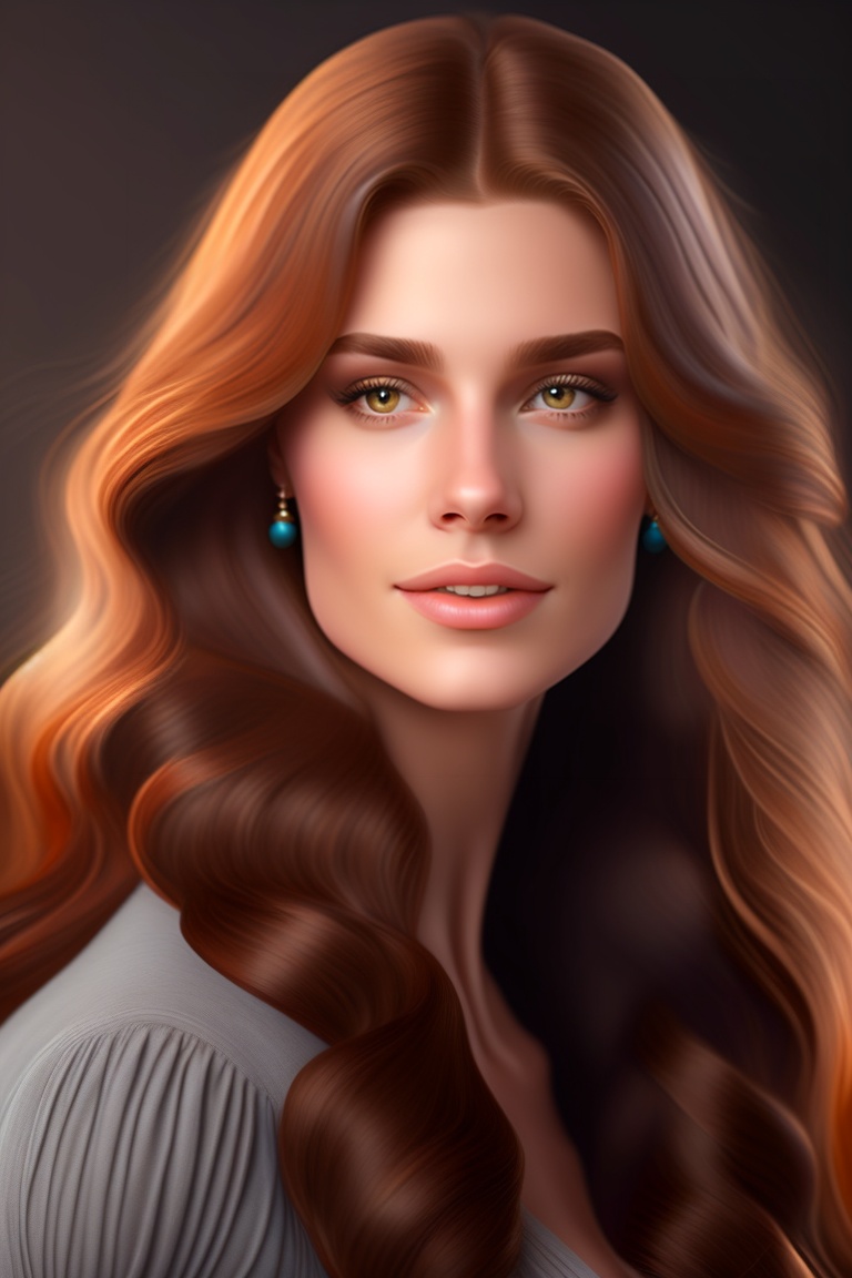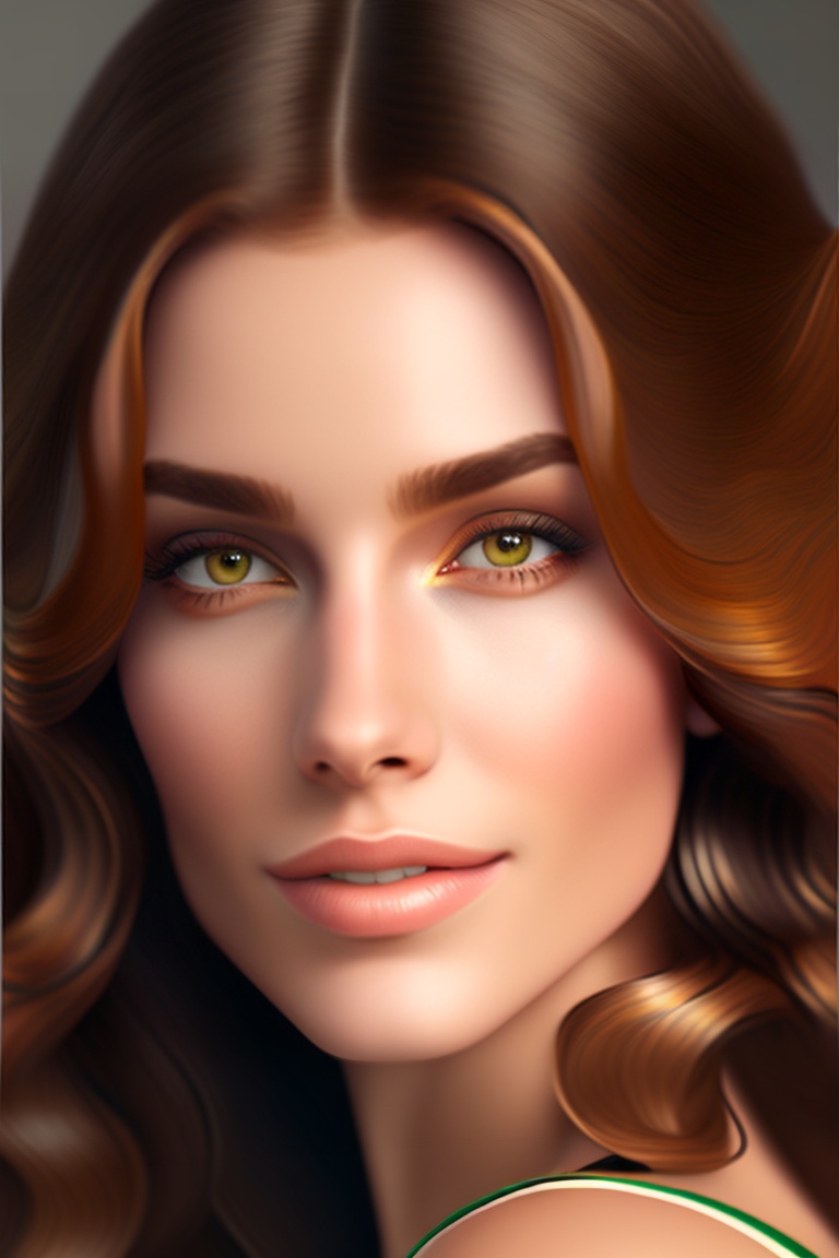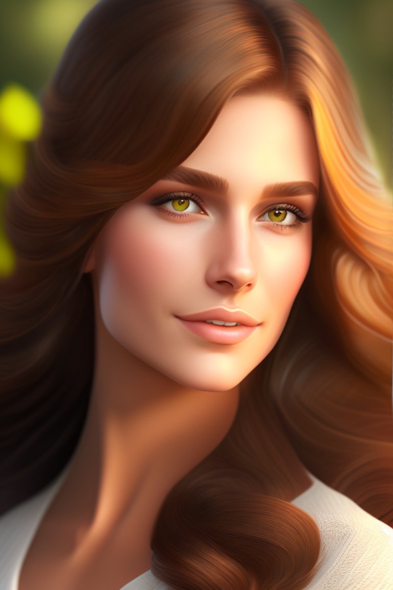 An advanced realistic beautiful woman with hazel eyes, soft, flowing chestnut hair with a natural shine, a gentle smile, and petite and graceful, delicate features that express empathy and compassion