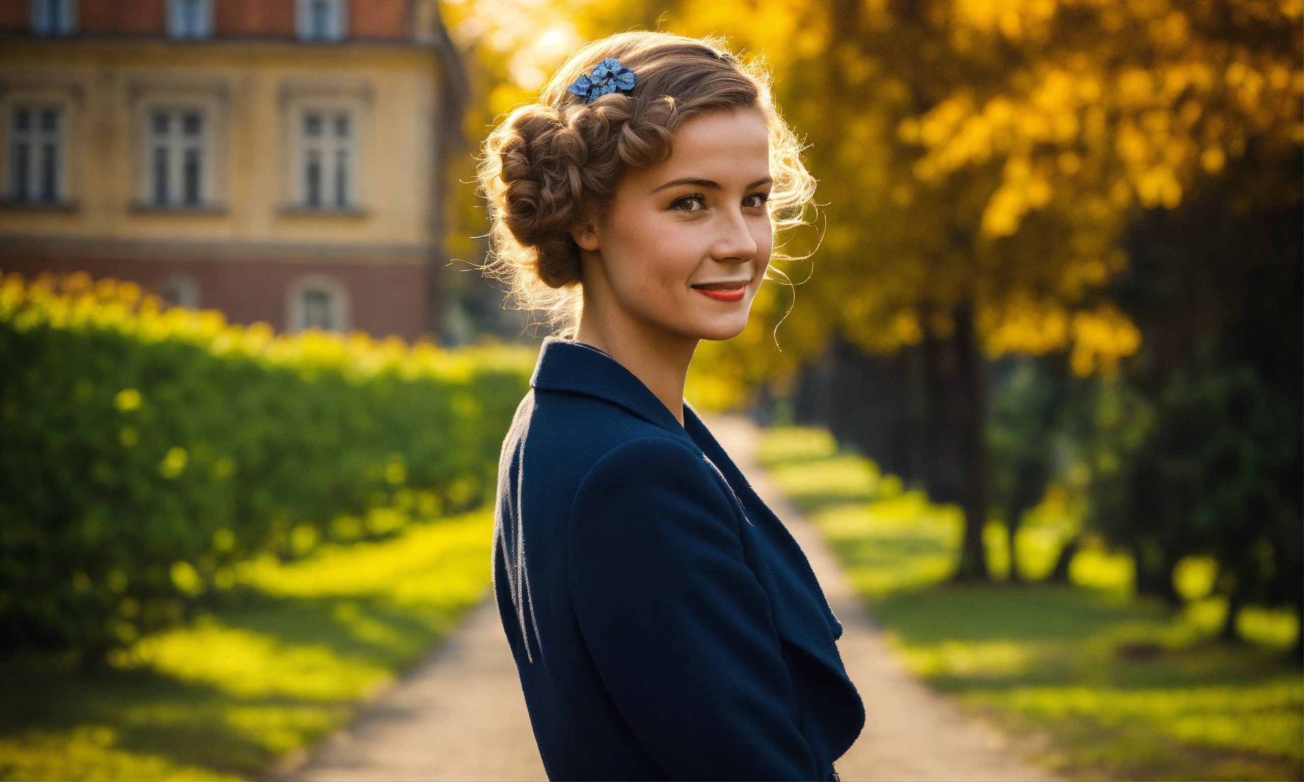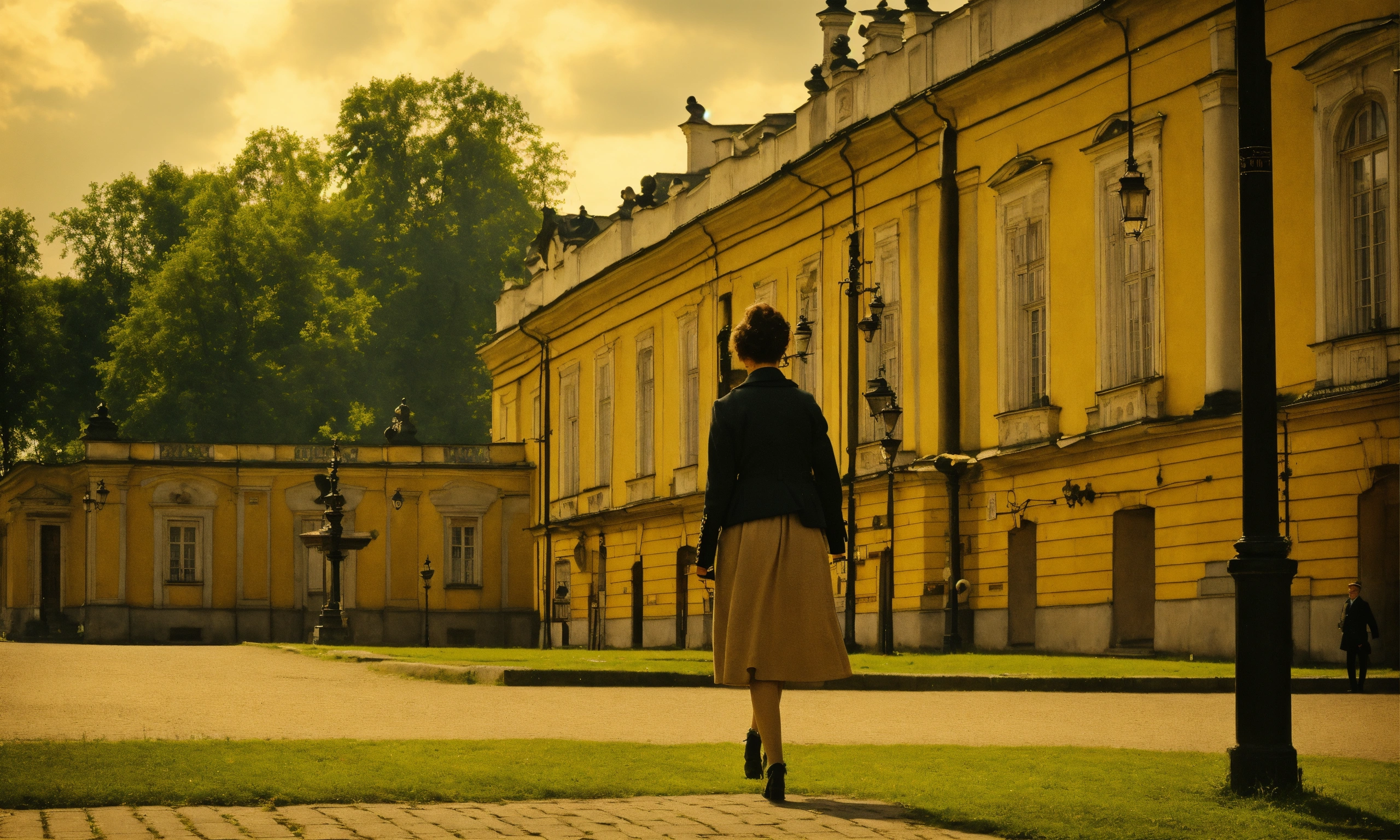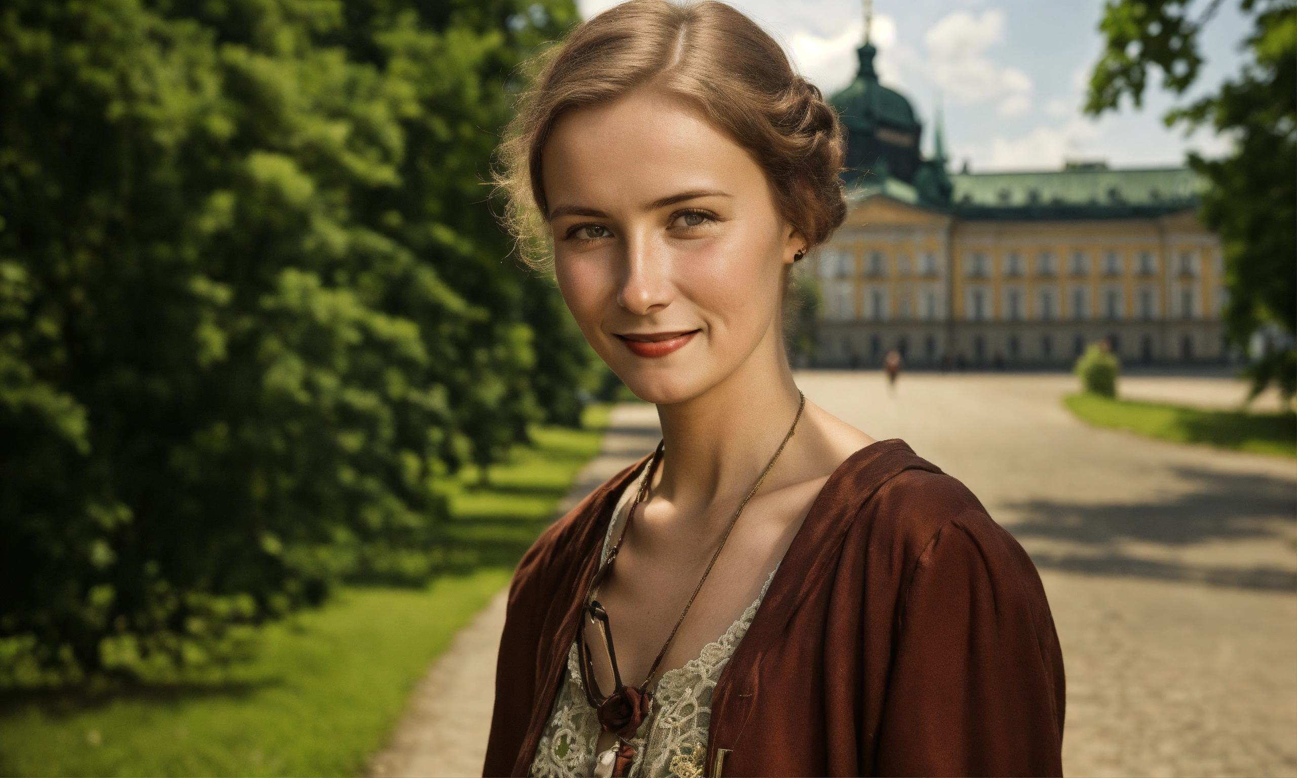 Poland think poor woman age 20, 1920-1930 on in warshaw. retro style photo. without people. focus camera on face woman . season summer, keep in mind that the street must be without people, retro style photo. without people. man full height. on street, smiling. man age 20 years old . wilanów palace warshaw