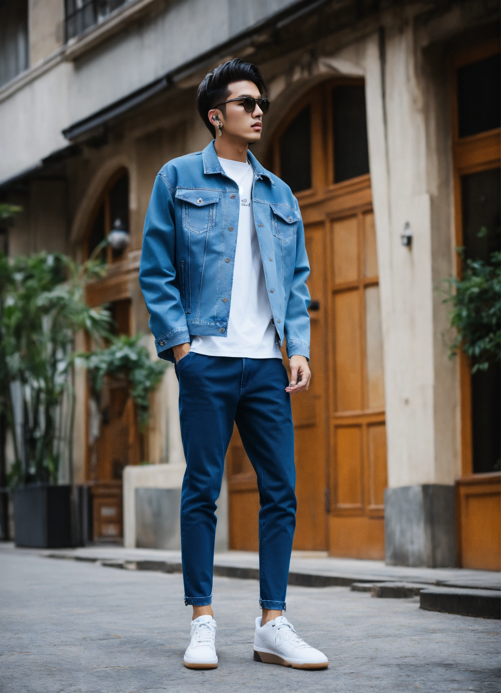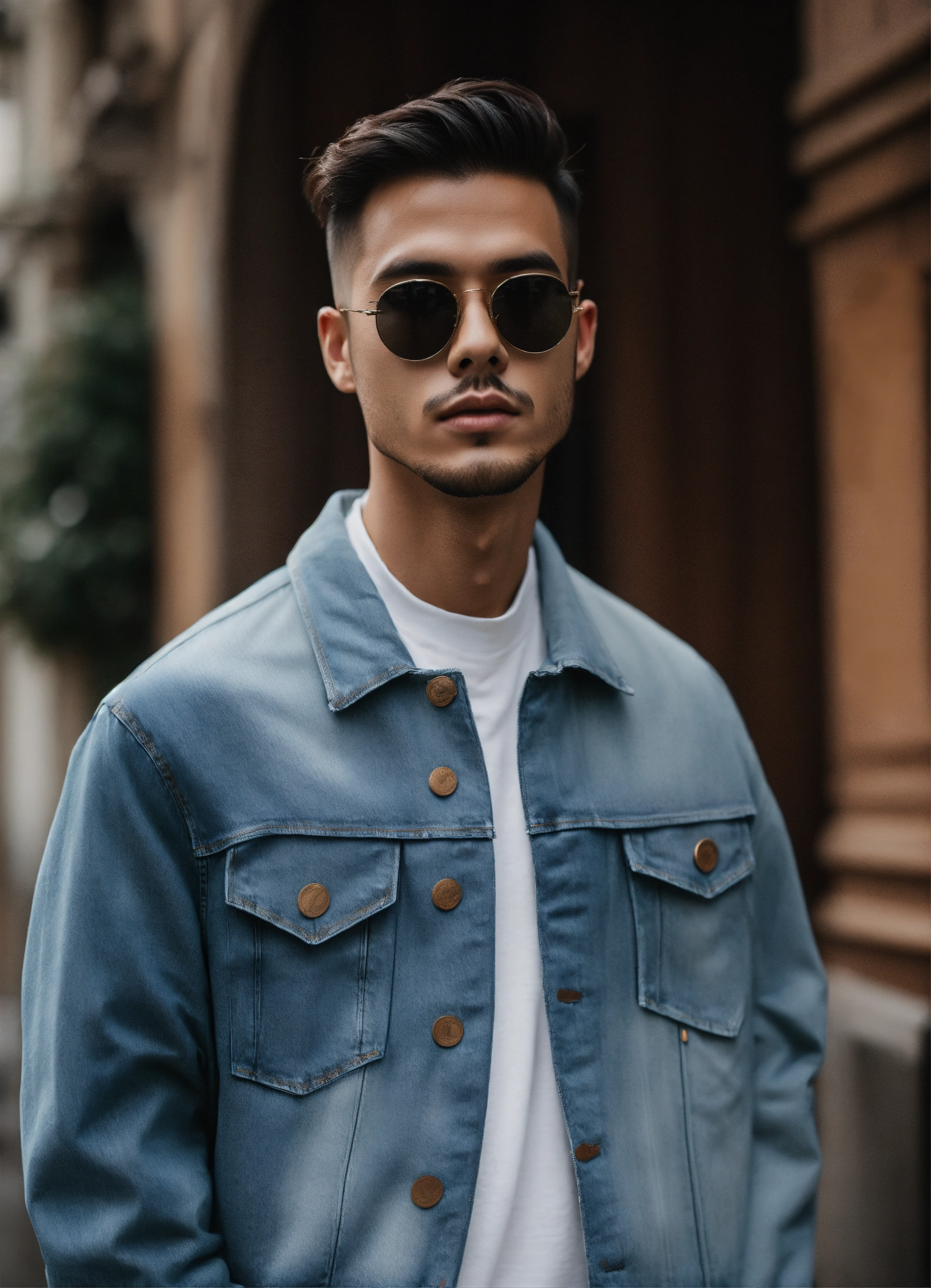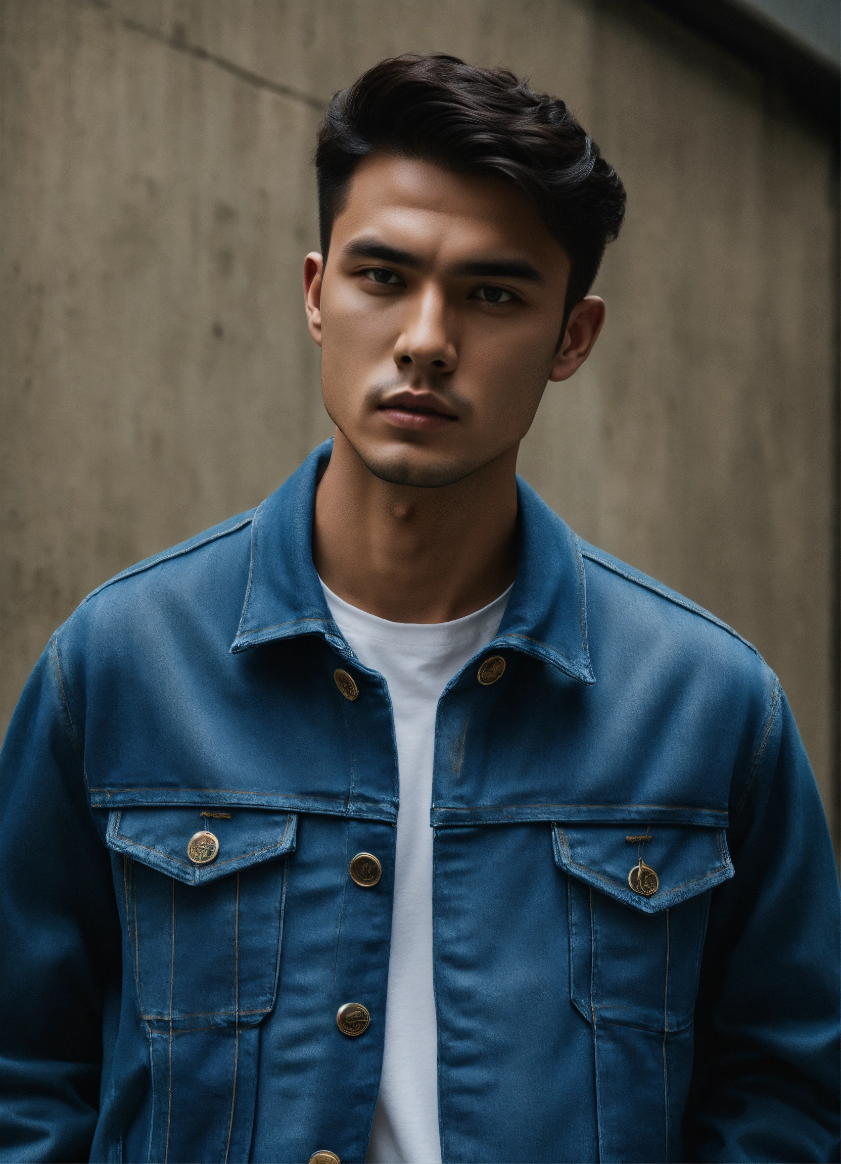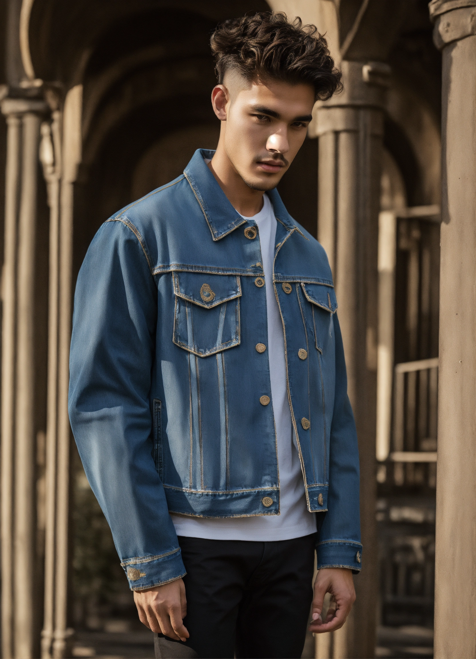 A modern and fancy denim jacket oversized with a new and comfort style, do gentleman concept, do rounded neck, with some crazy style
