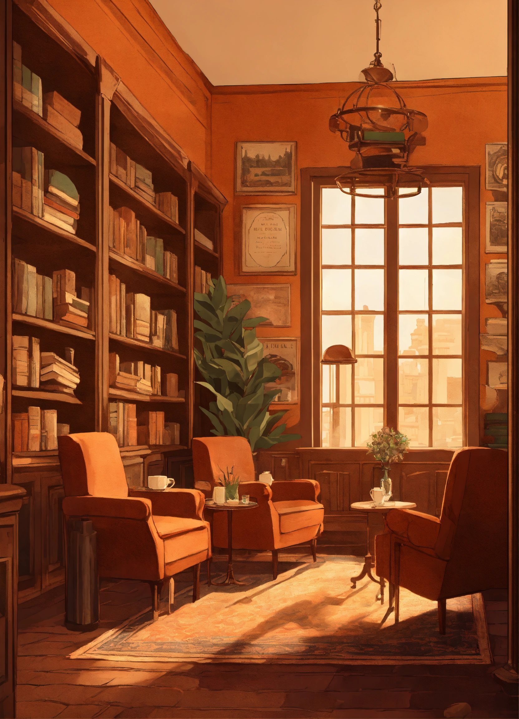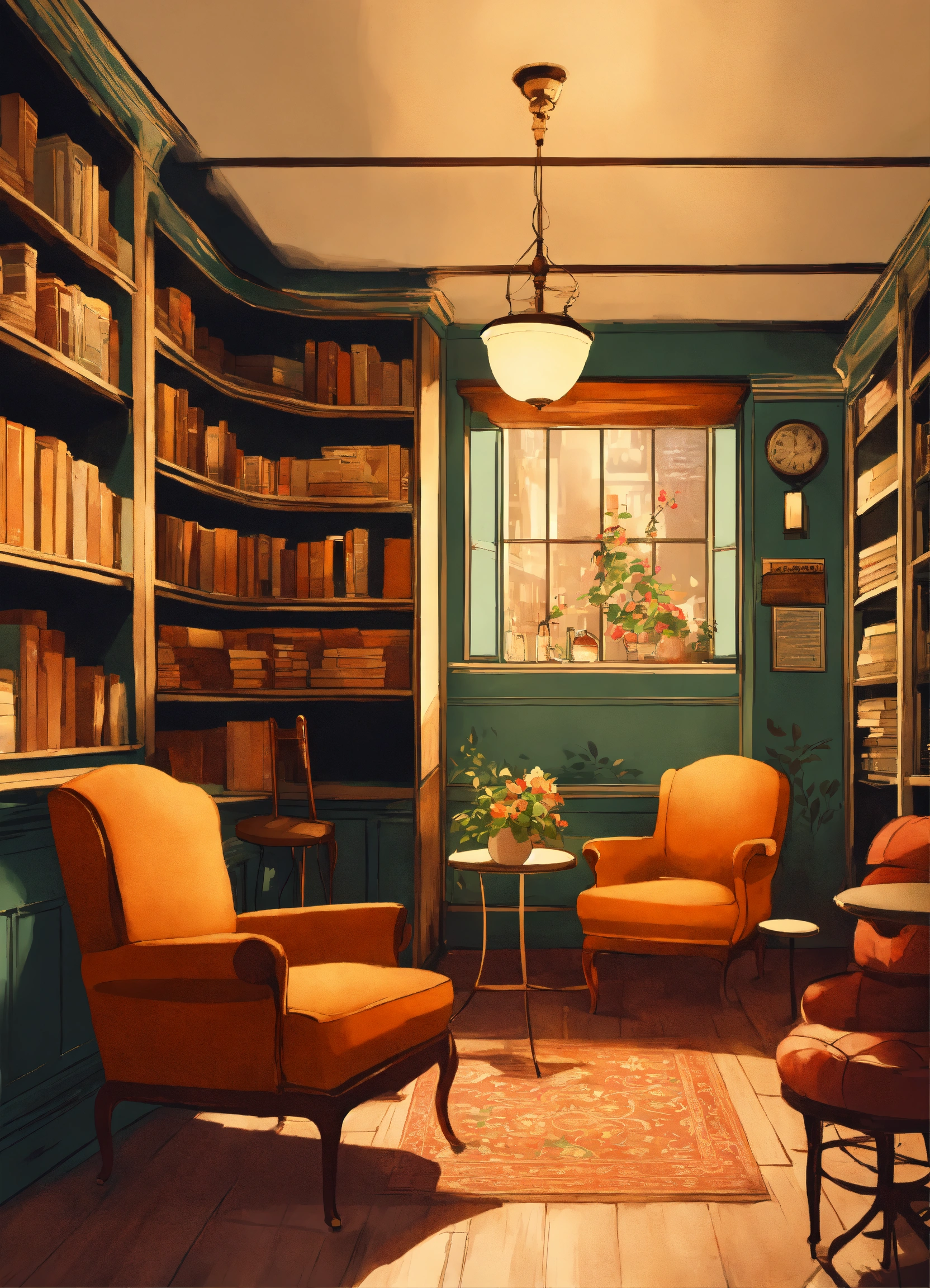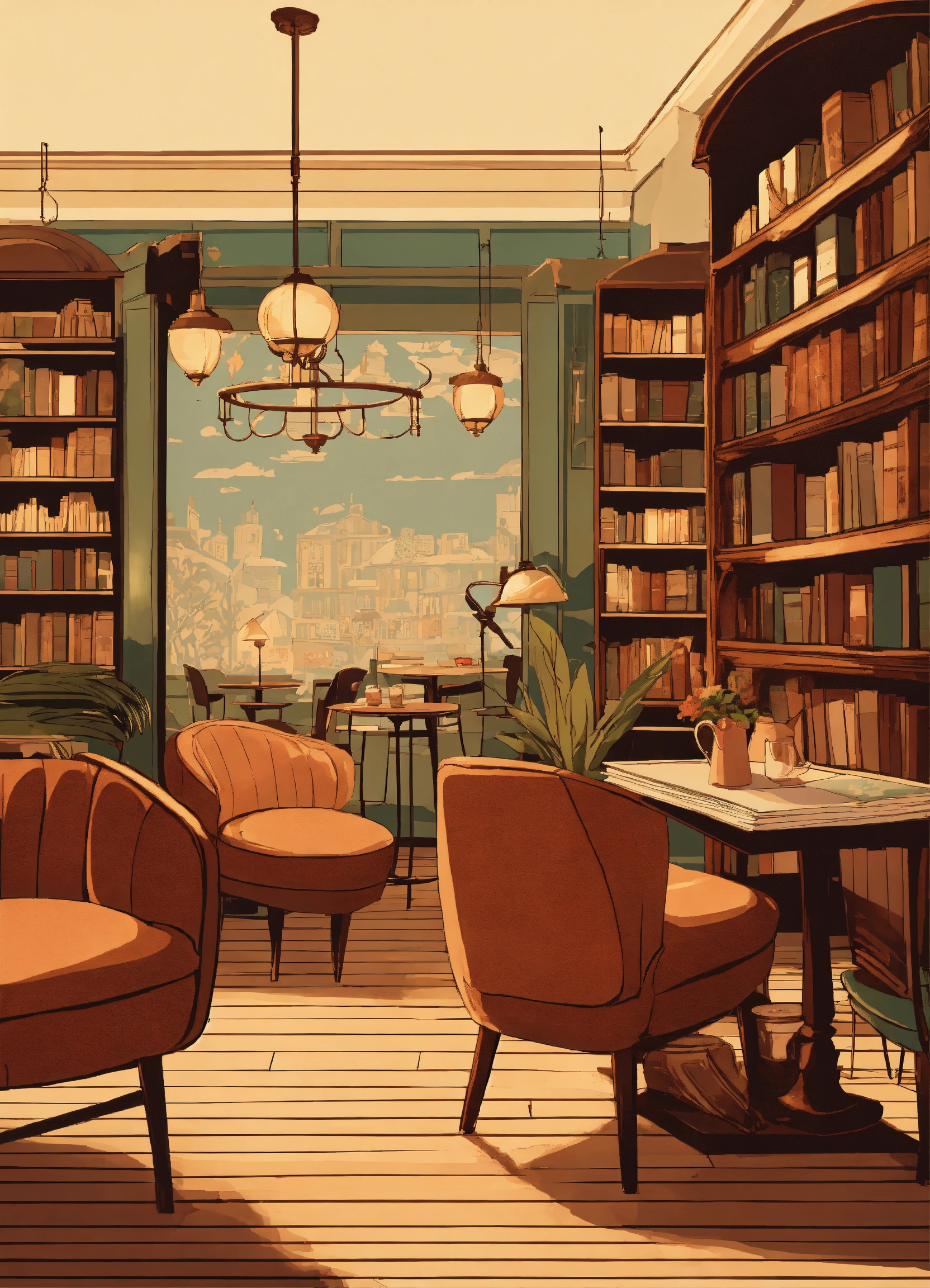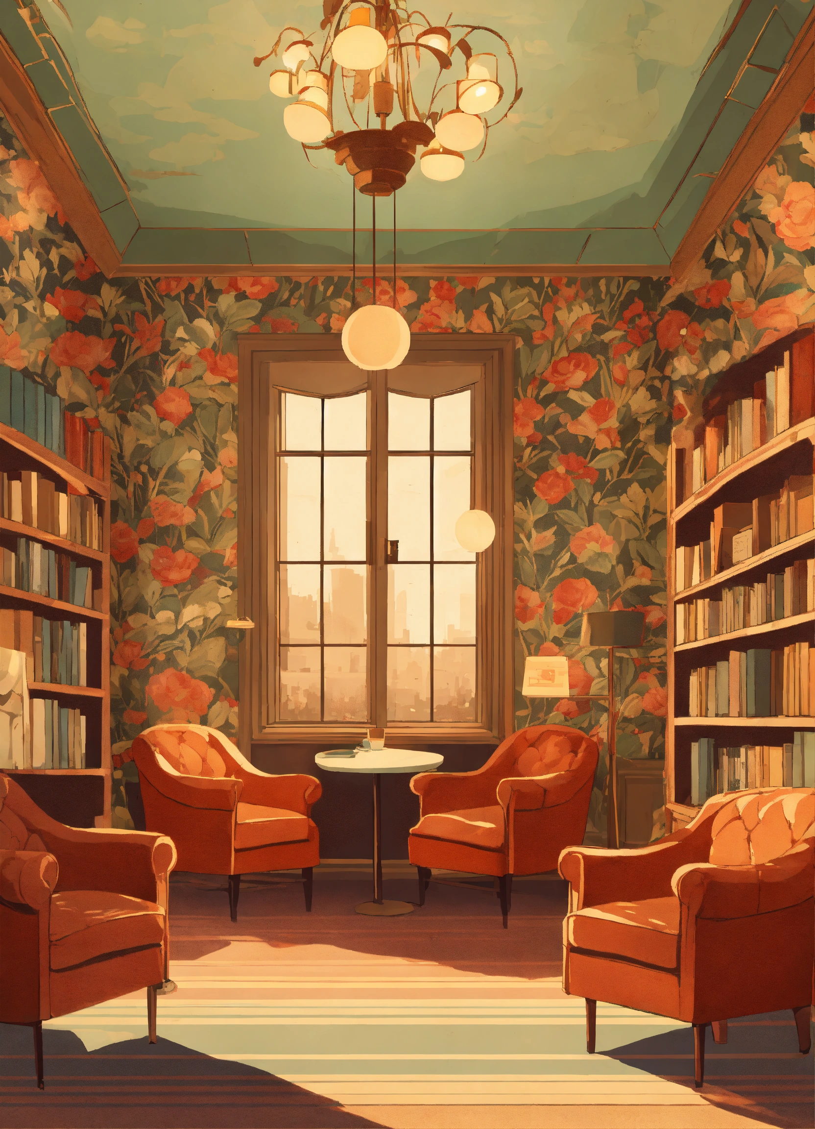 A retro-inspired cafe with cozy armchairs, vintage wallpaper, and shelves lined with old books nostalgic reading vintage aesthetics illustration.