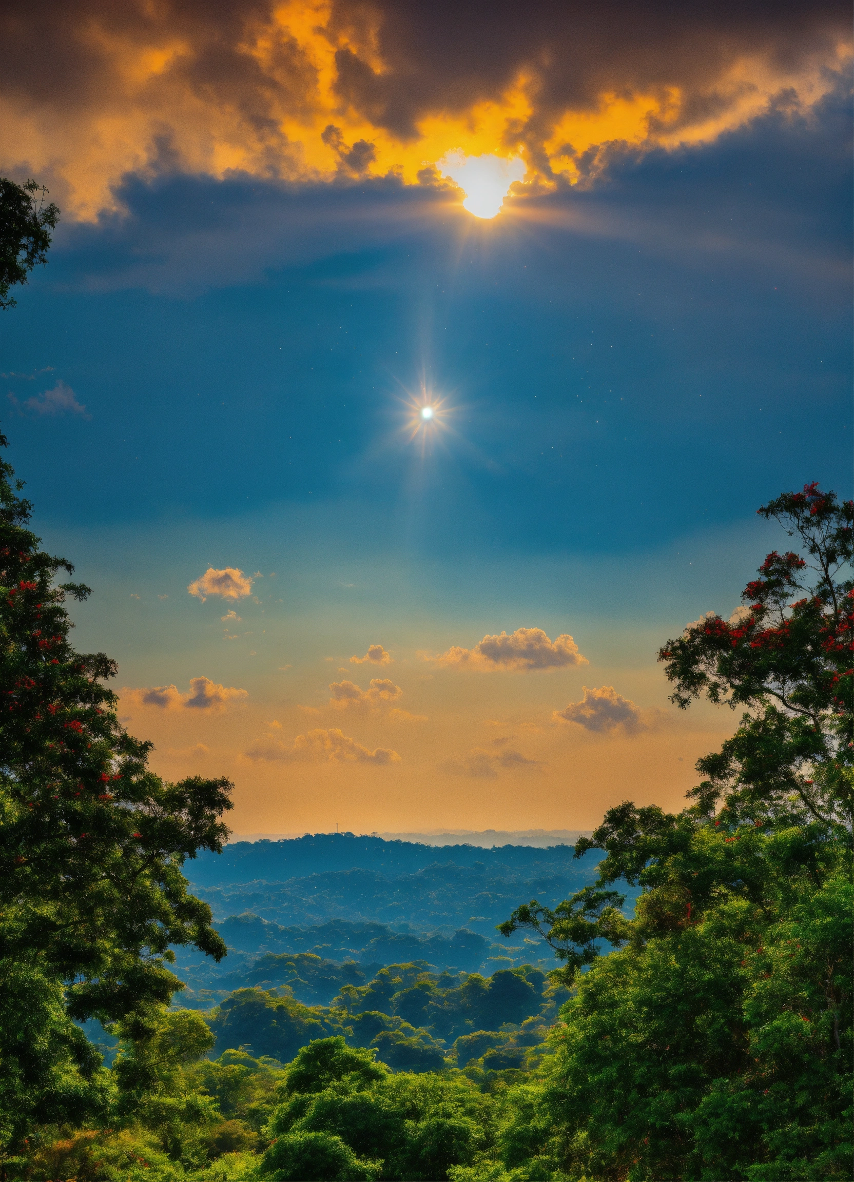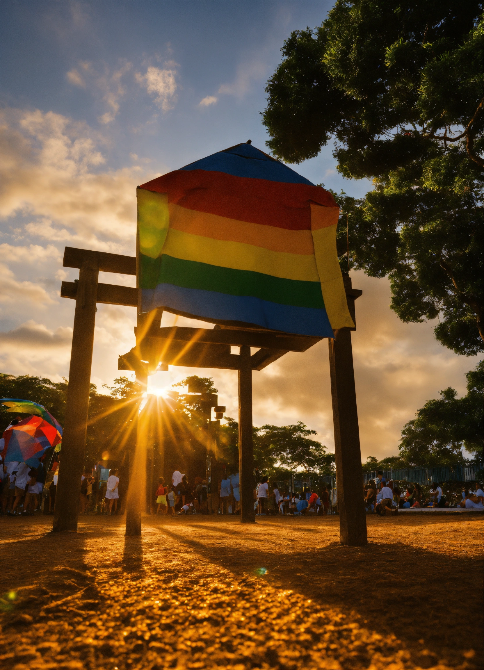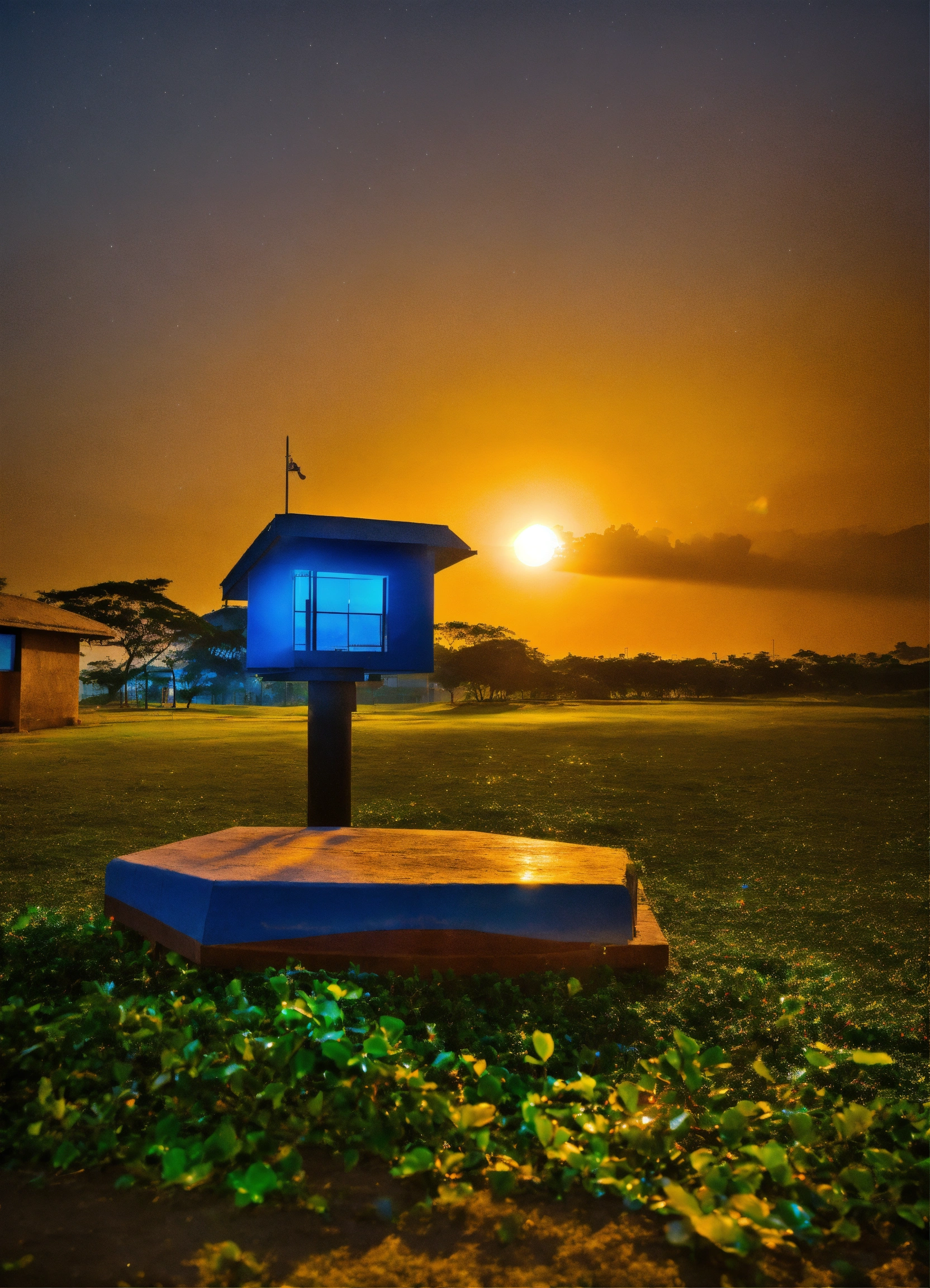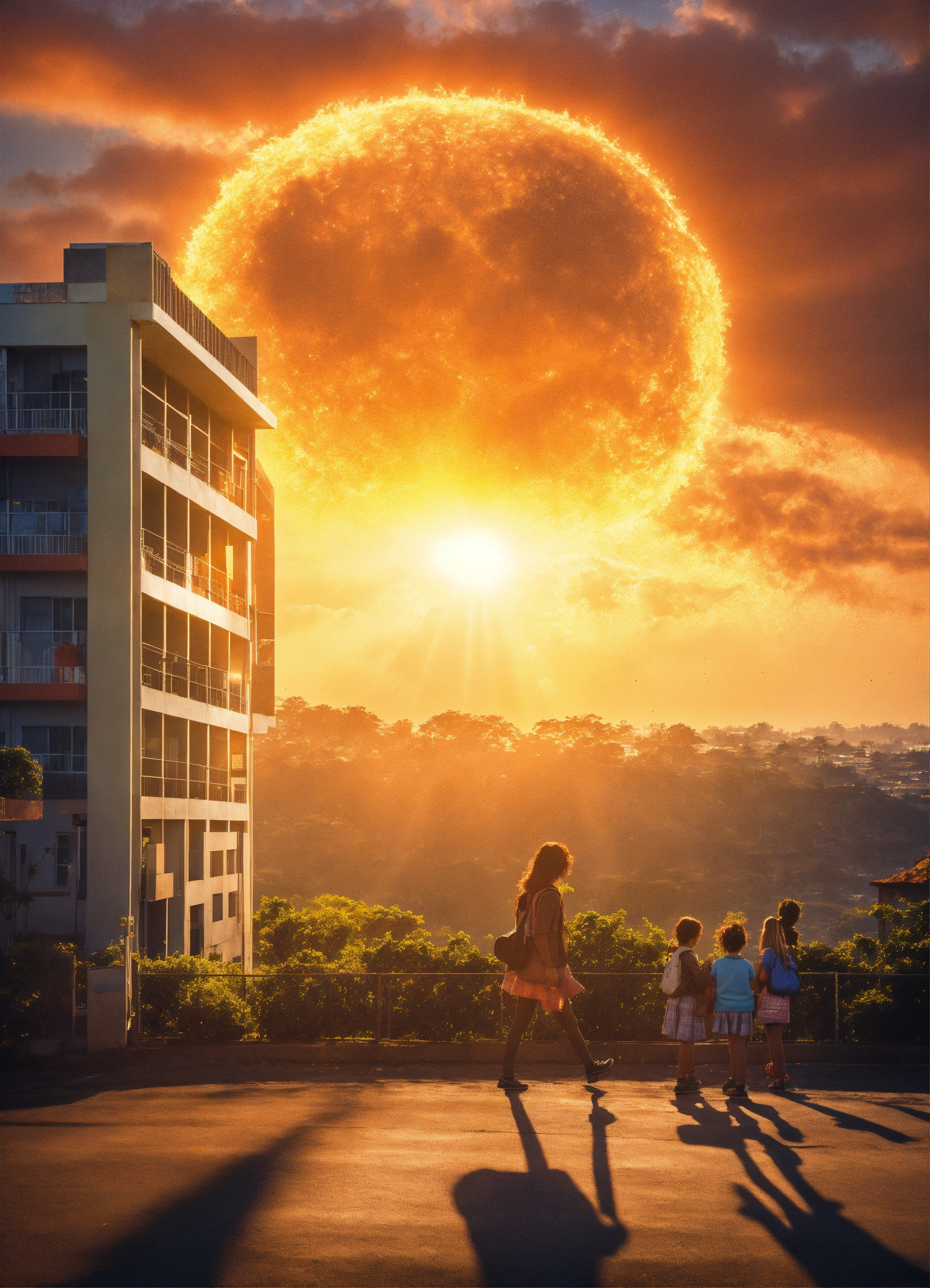 Imagem de fantasia o sol brilha no céu enquanto uma escola é mostrada com o título acima da porta "escola do alfabeto"