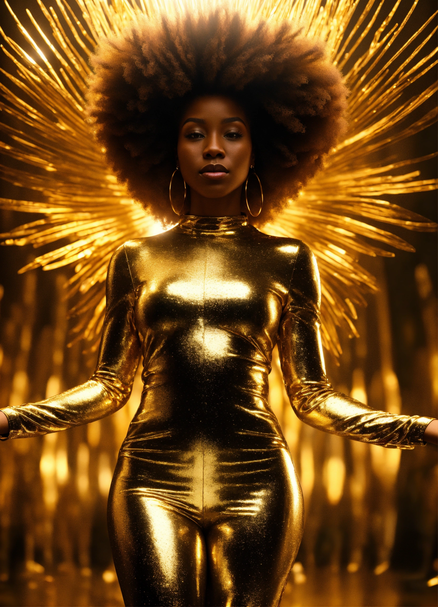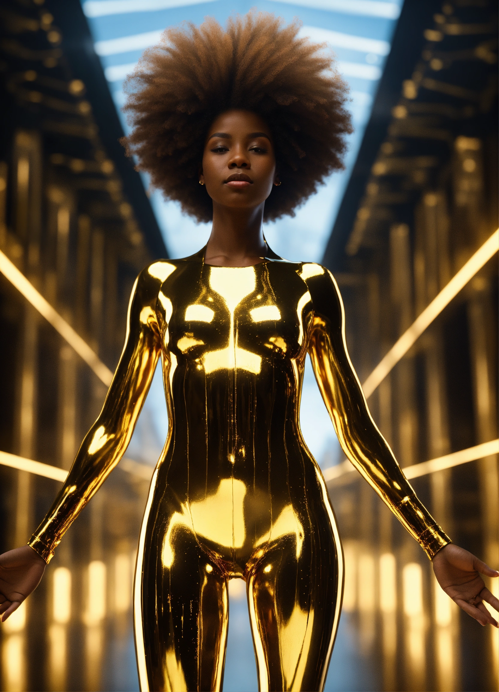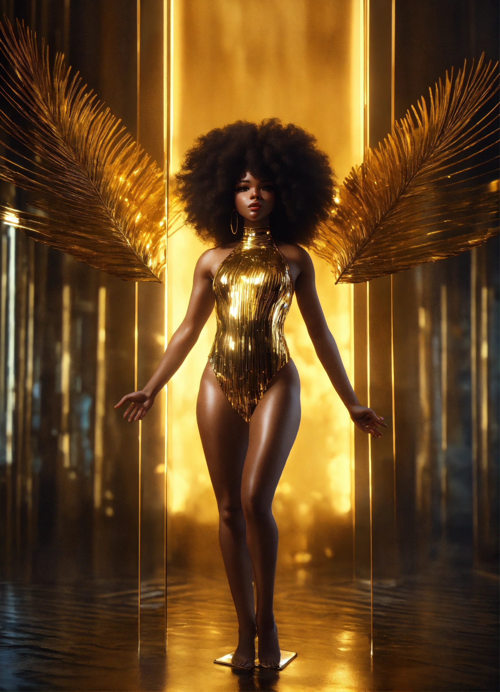 3d render of black woman with afro made entirely of glass, full body shot, standing, arms outstretched to sides in welcoming, palms up, eyes open looking directly into camera, liquid gold flows through her entire face and body, illuminating her form from within. taken on medium format camera, ambient lighting, zeiss distagon t* 50mm lens.