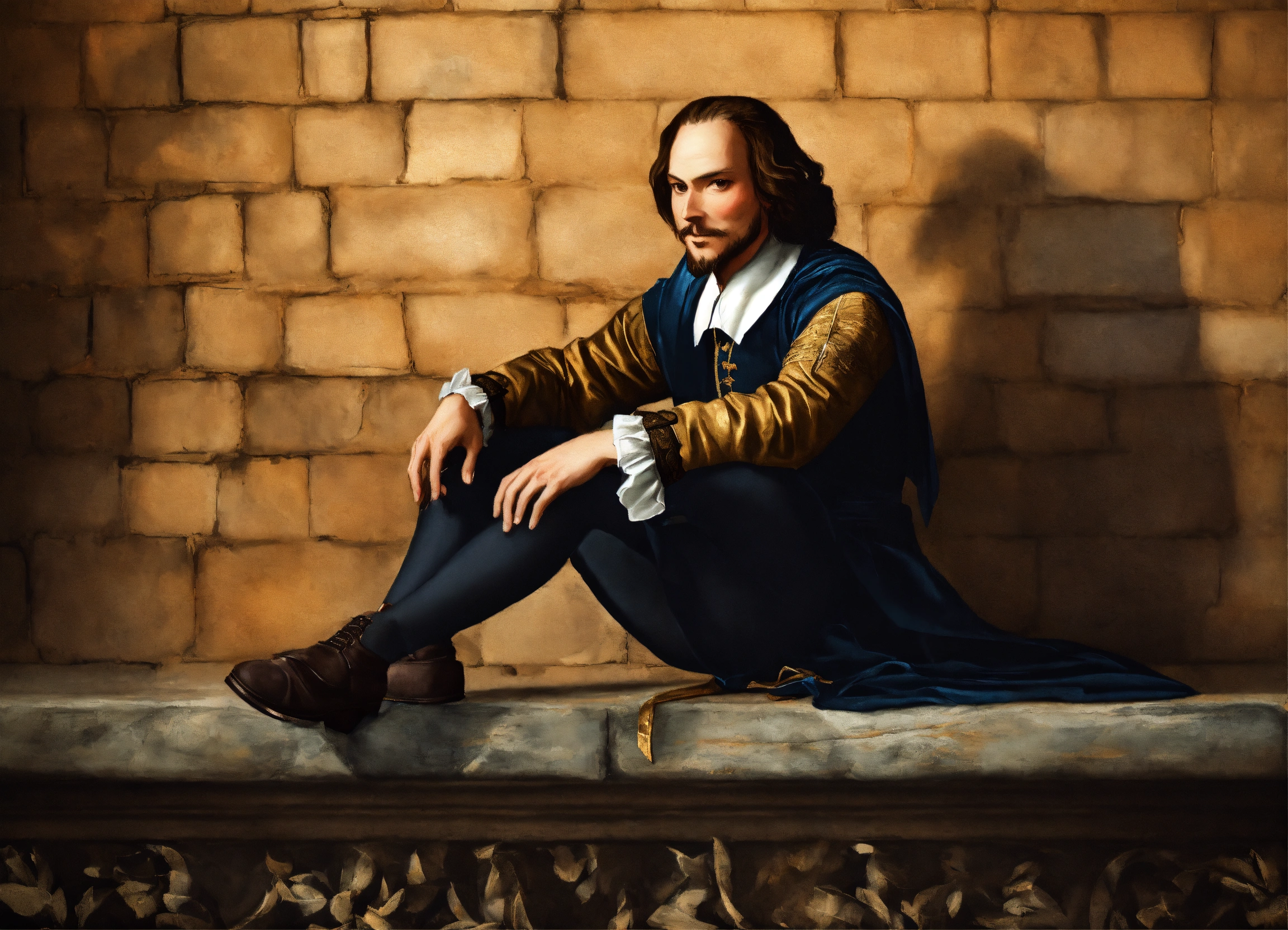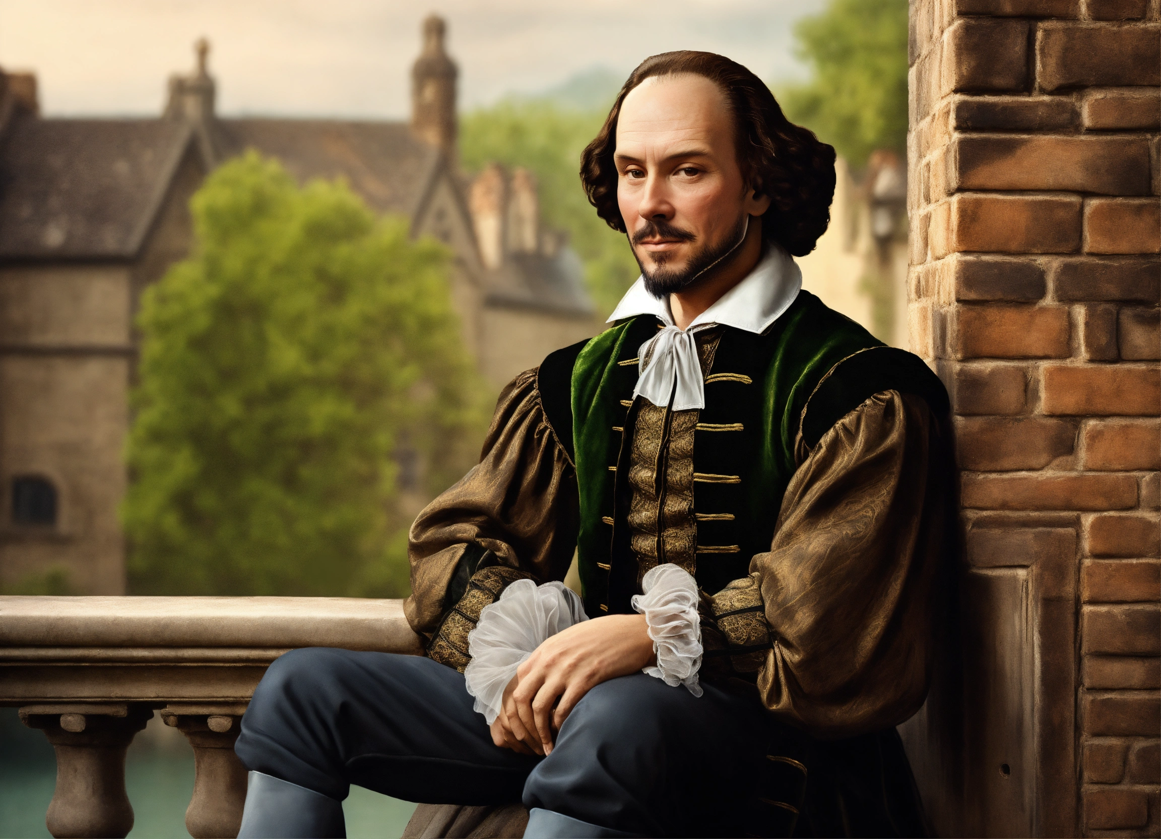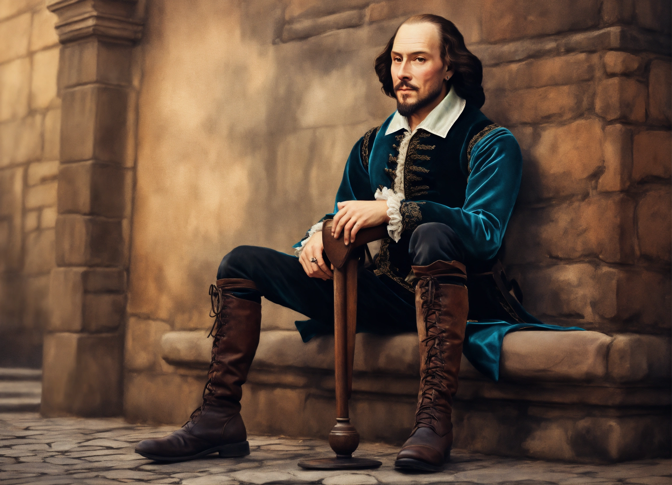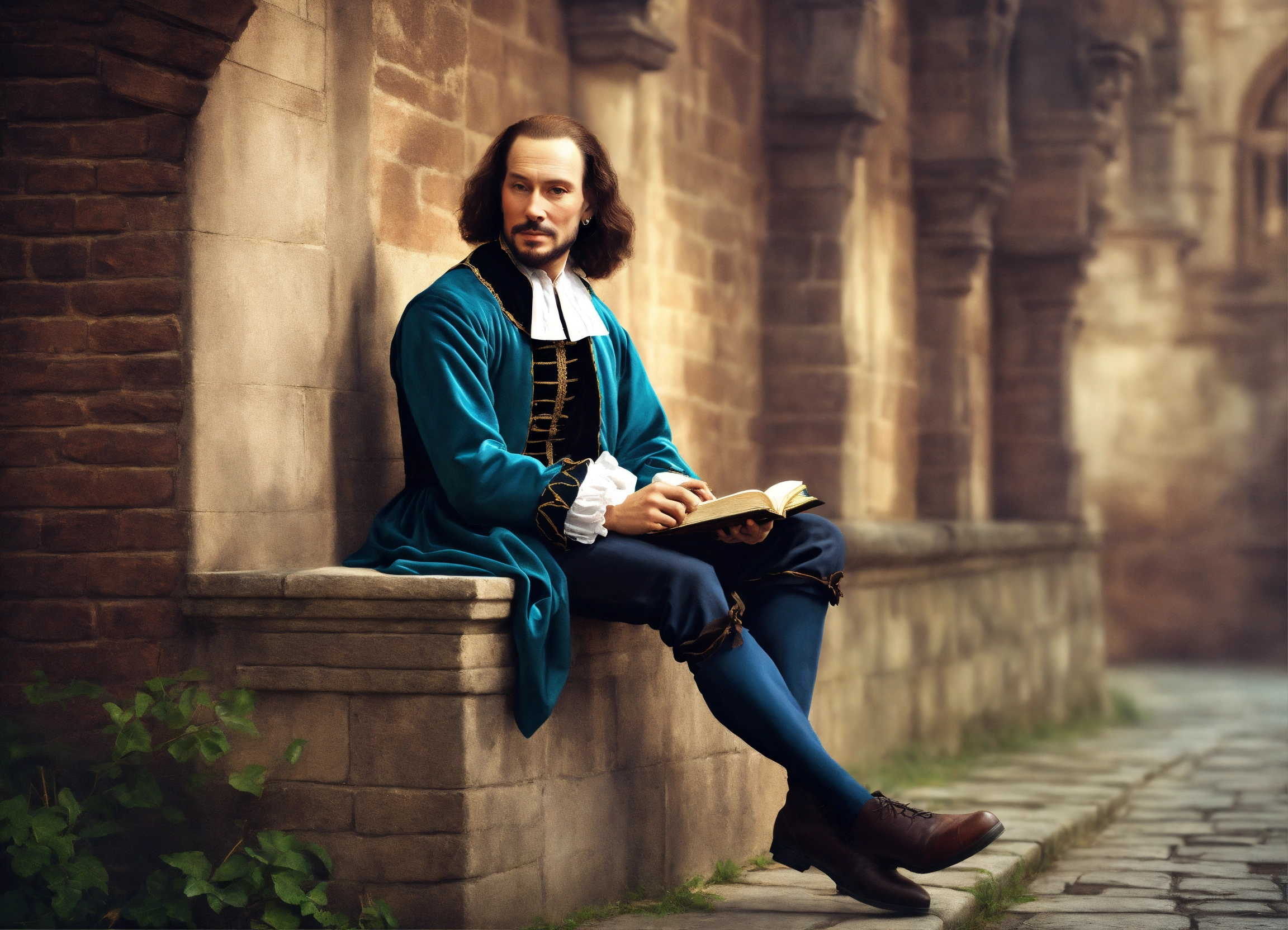 William shakespeare sitting on a wall in photo realistic art style