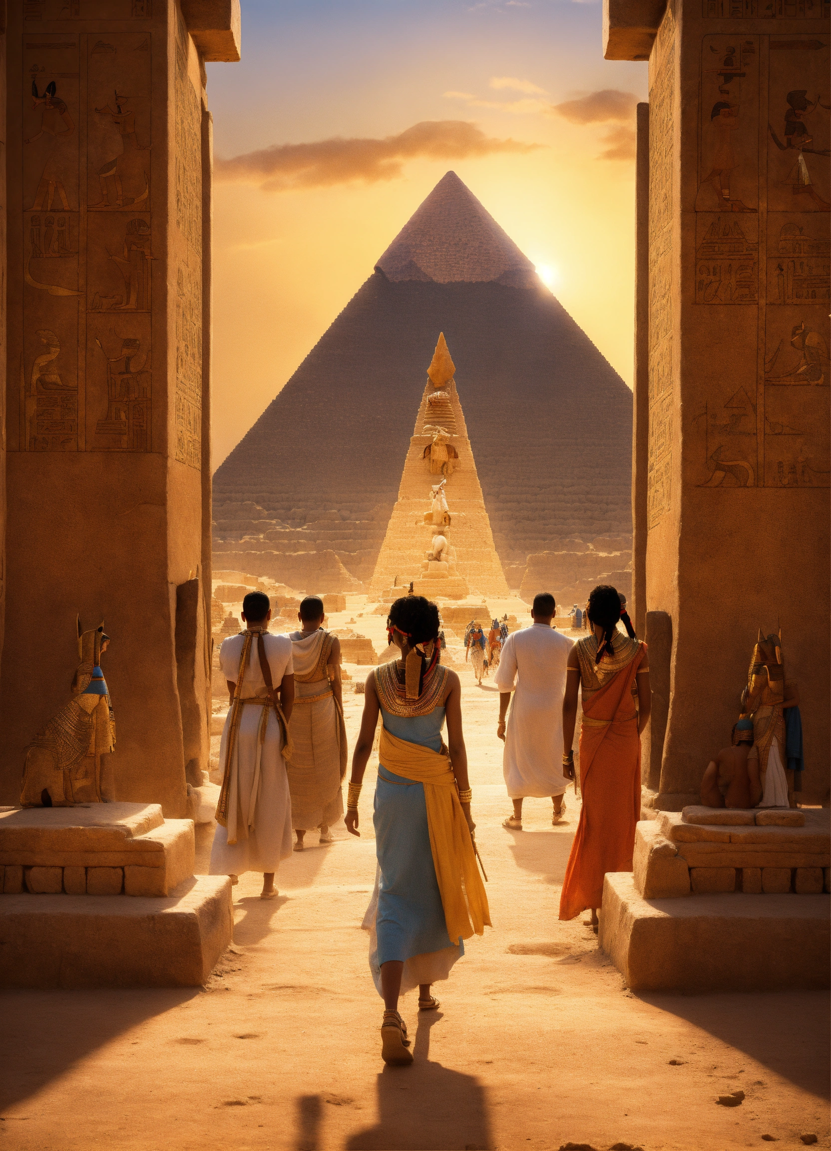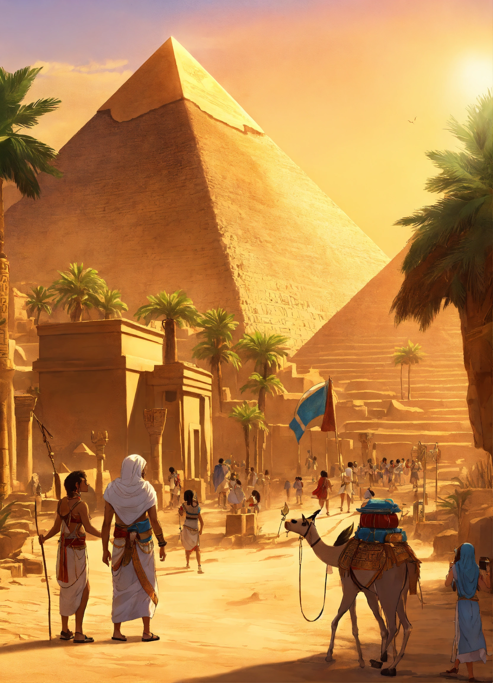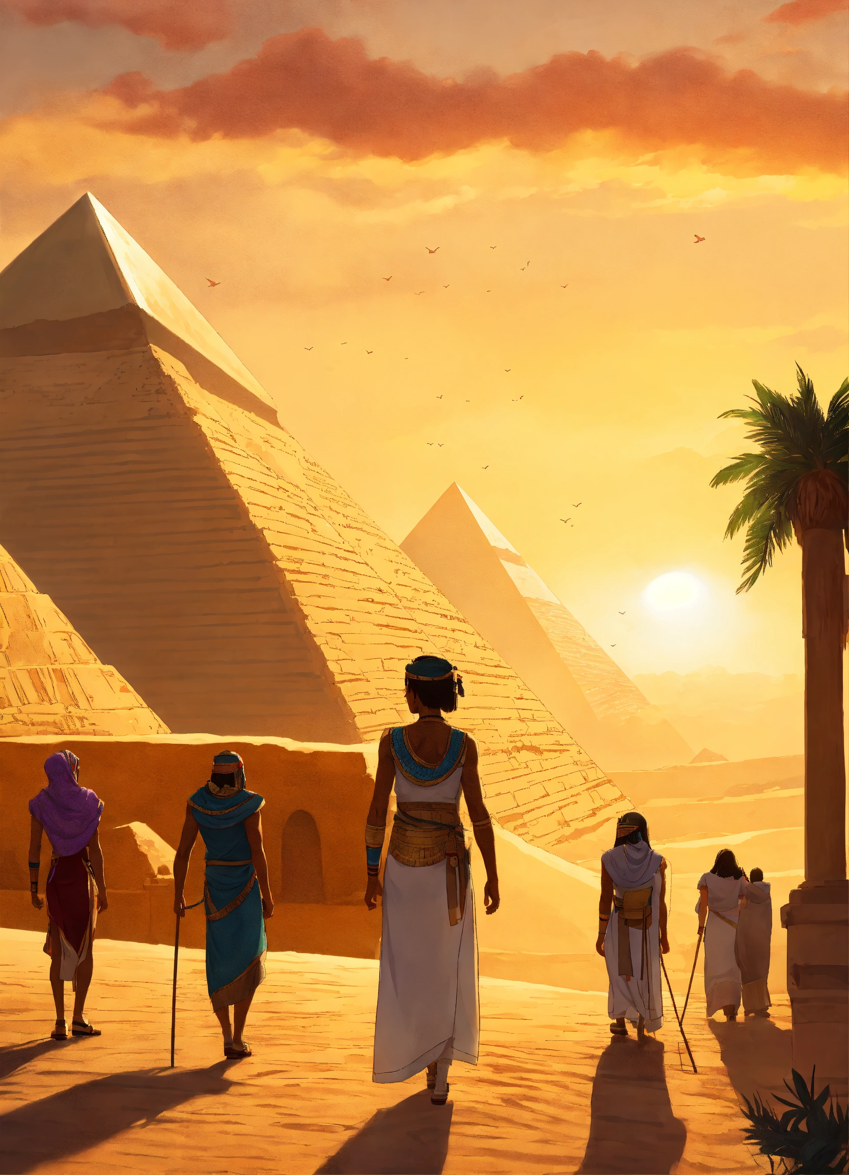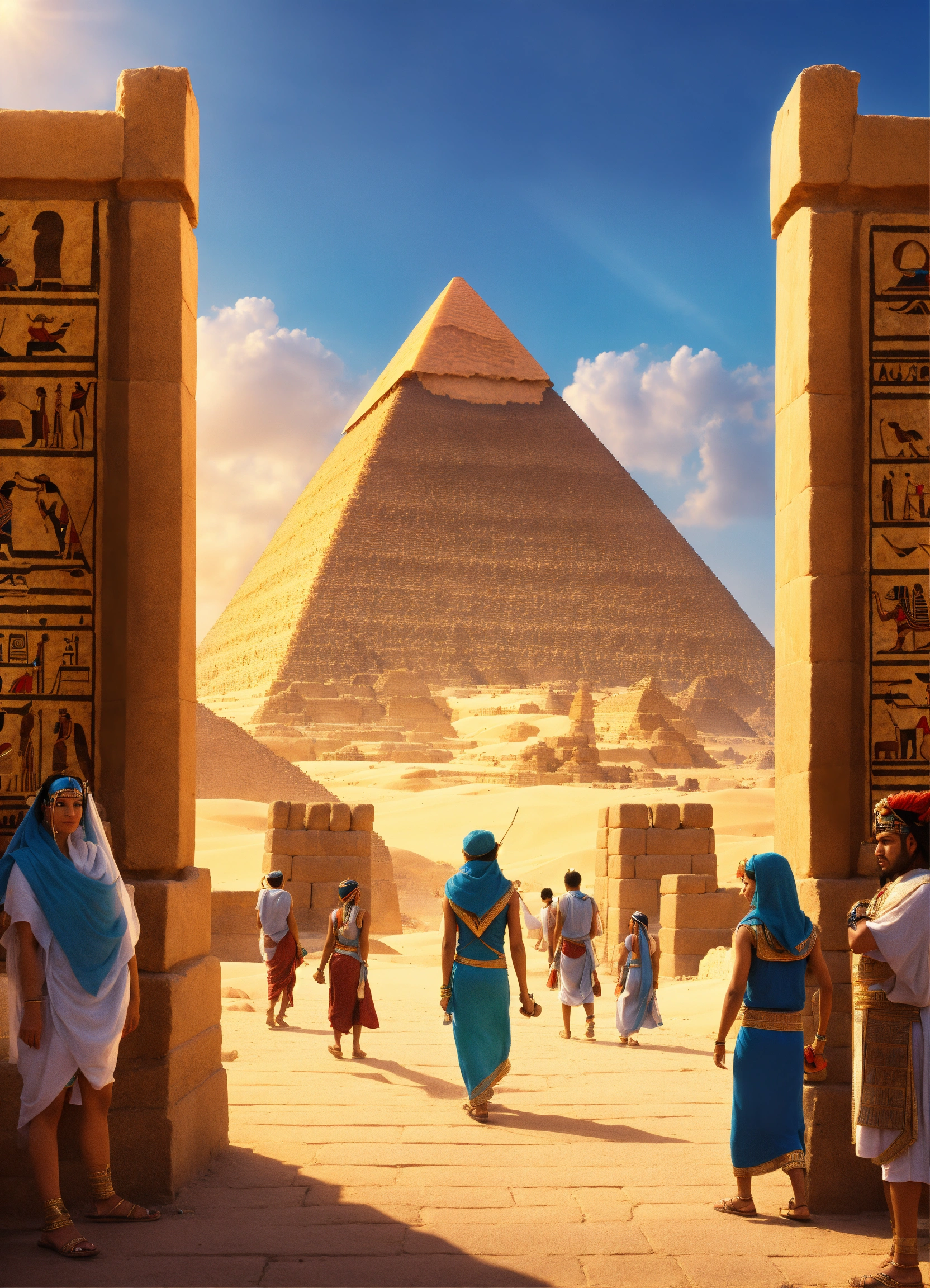 Leave the created character. the alex, maya, leo, and emma find themselves in the bustling streets of ancient egypt. people in traditional egyptian attire go about their daily activities. the great pyramids loom in the distance.