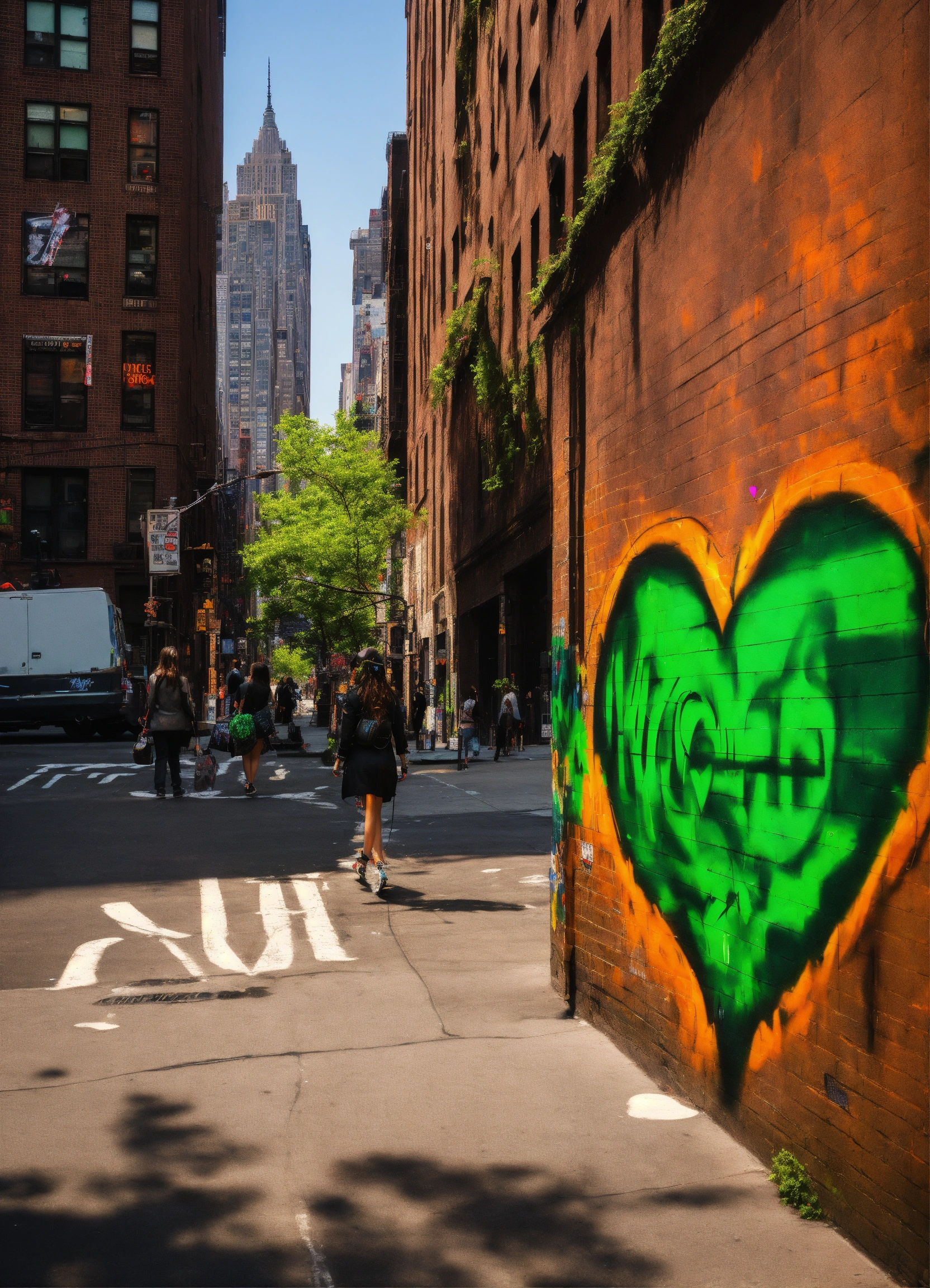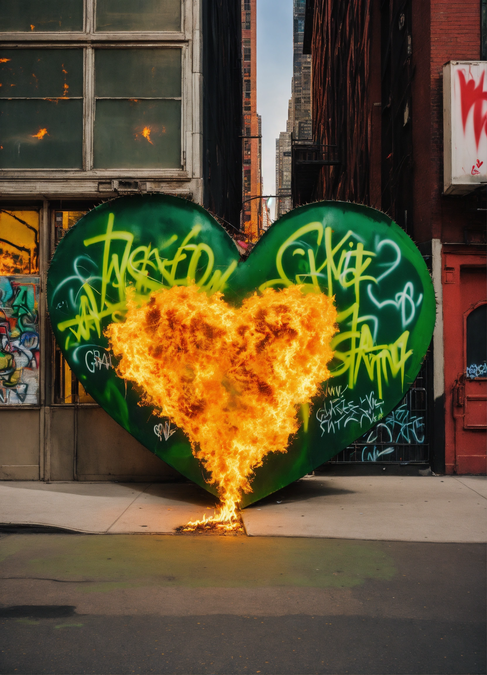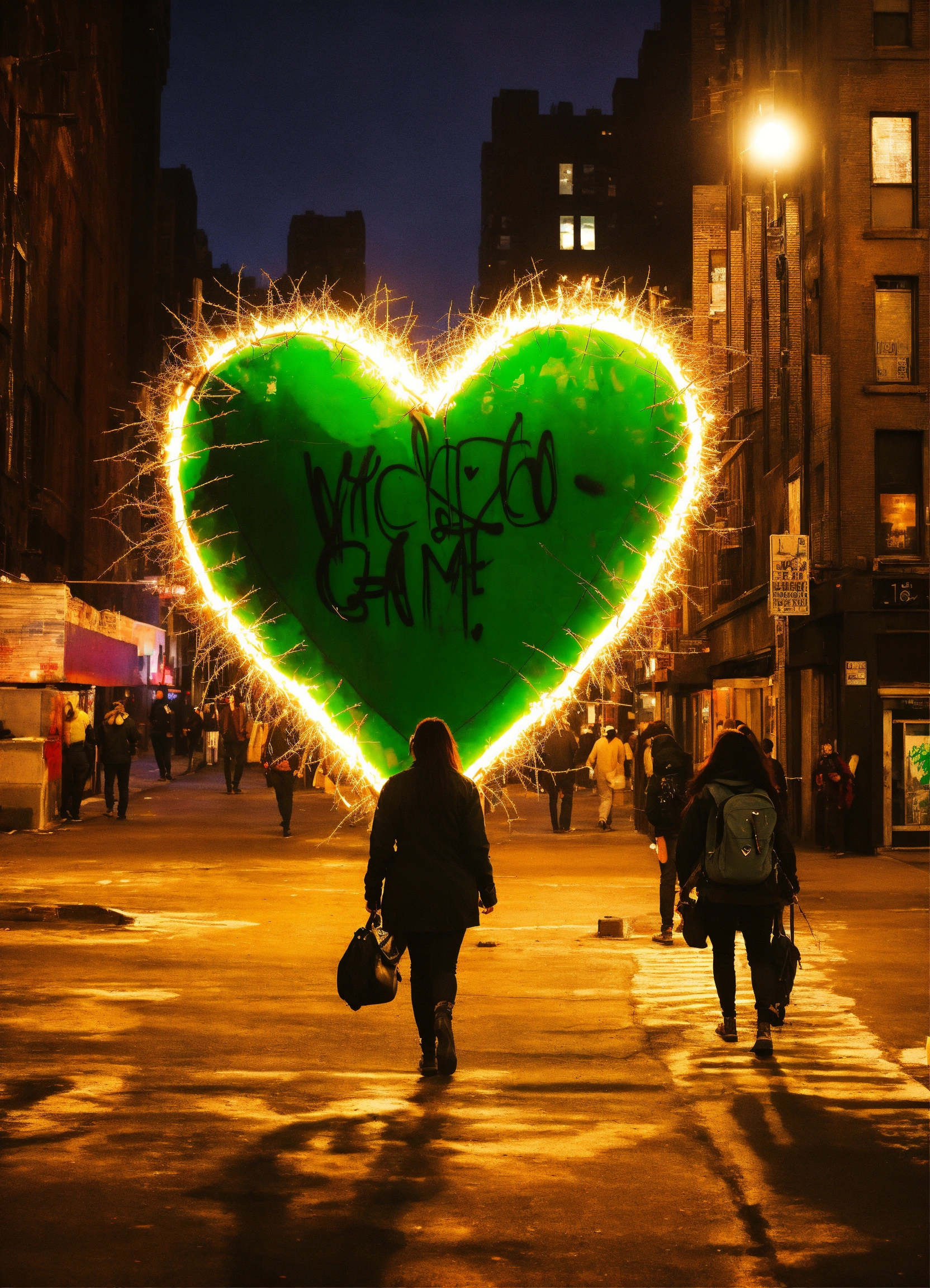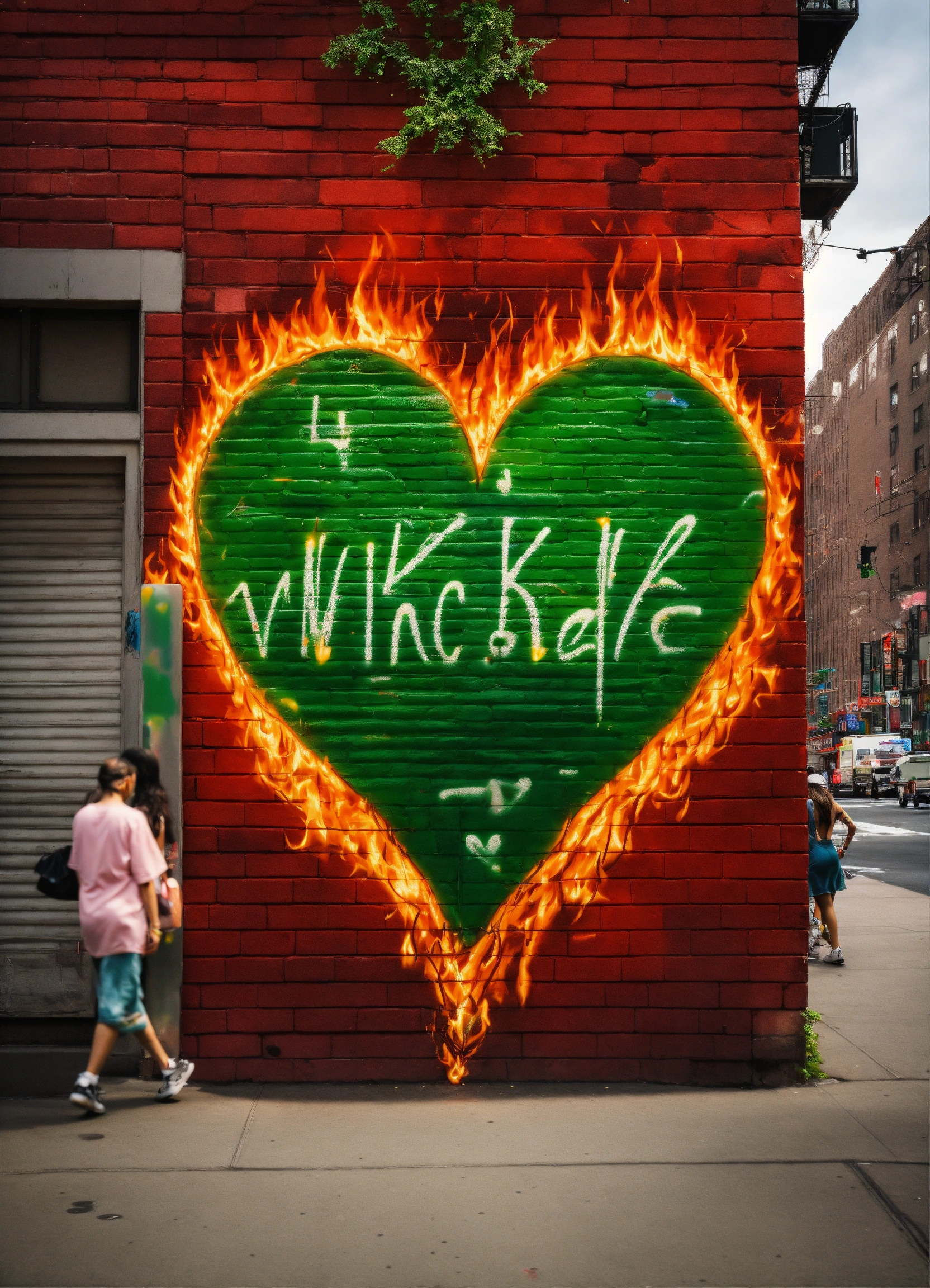A graffiti of a heart on fire with thorns saying wicked game in color green in the street of new york with womans walking