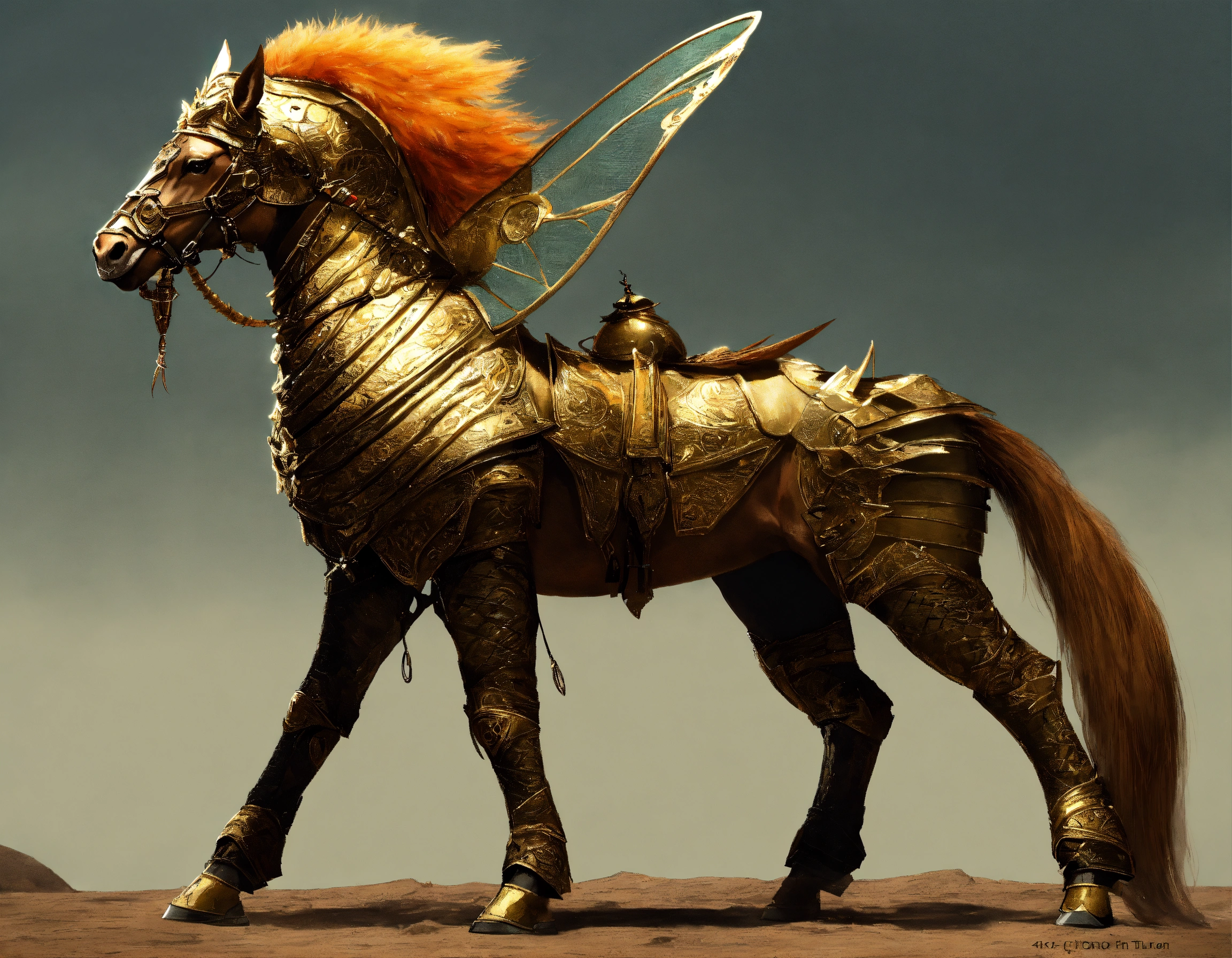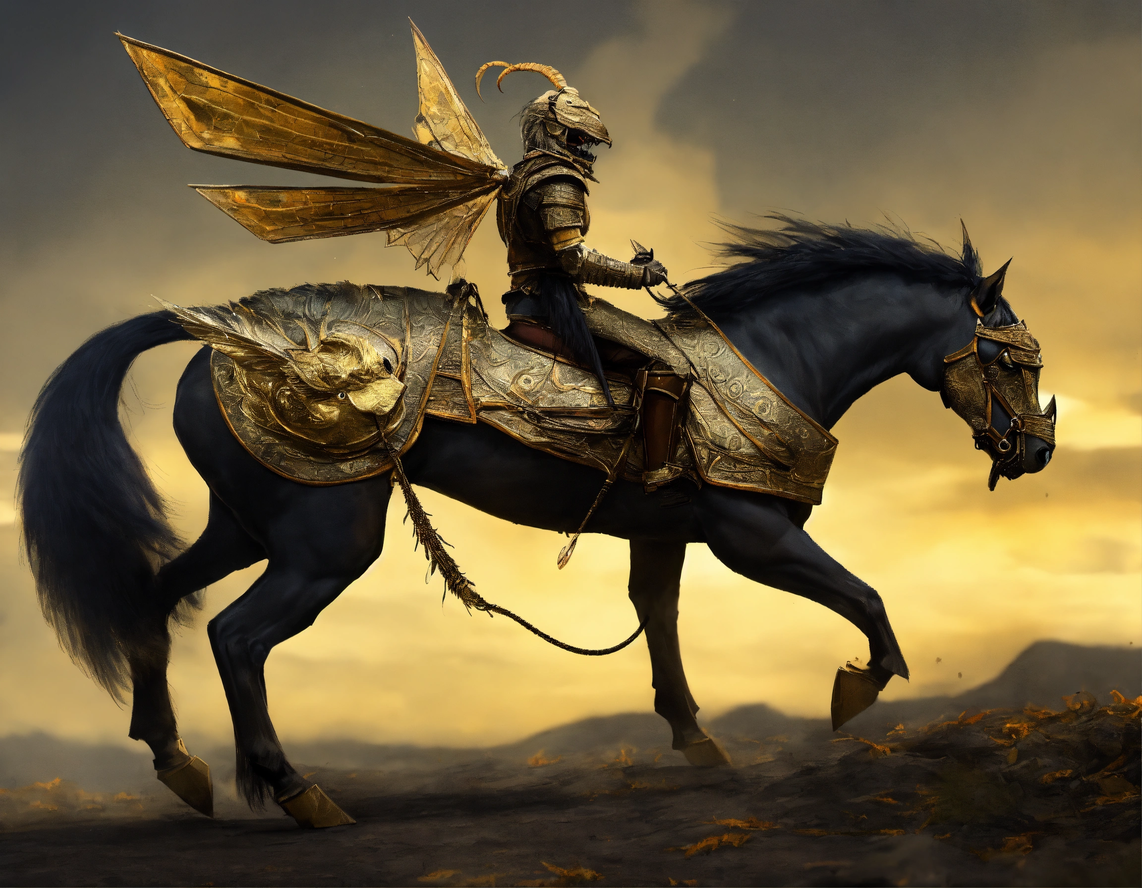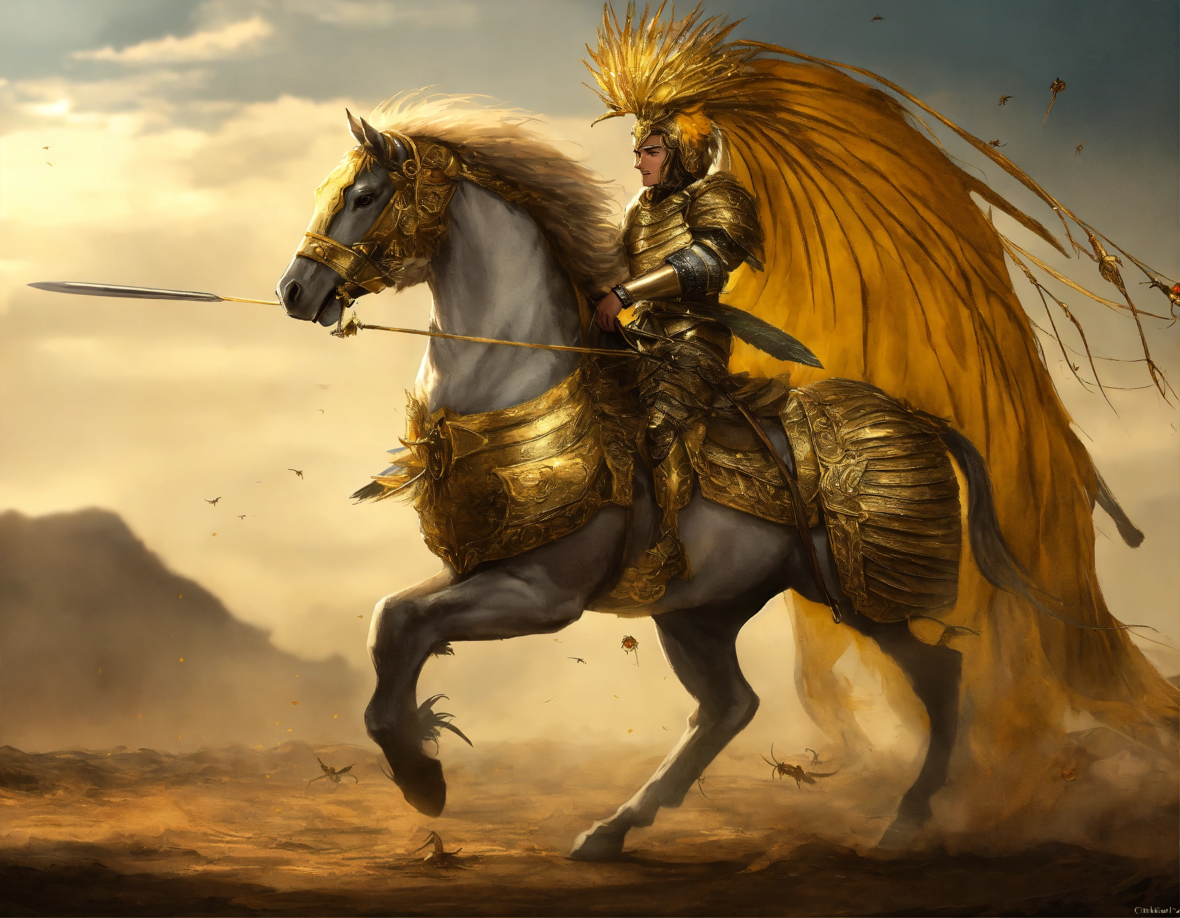 Draw a locust in the shape of a horse prepared for battle. on its head is a crown of gold, and its face resembles a human face. it has hair like a woman’s hair, and teeth like a lion’s teeth. it is wearing an iron breastplate and has wings that are capable of sounding like the thunder of many horses and chariots rushing into battle. its tail has a stinger like a scorpion’s tail.